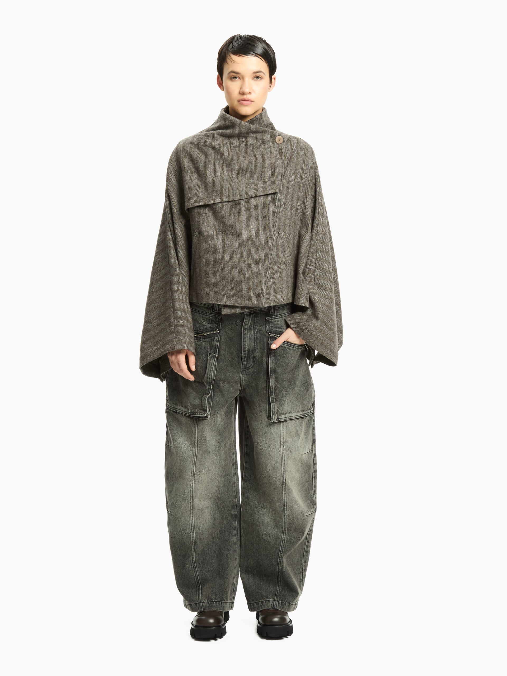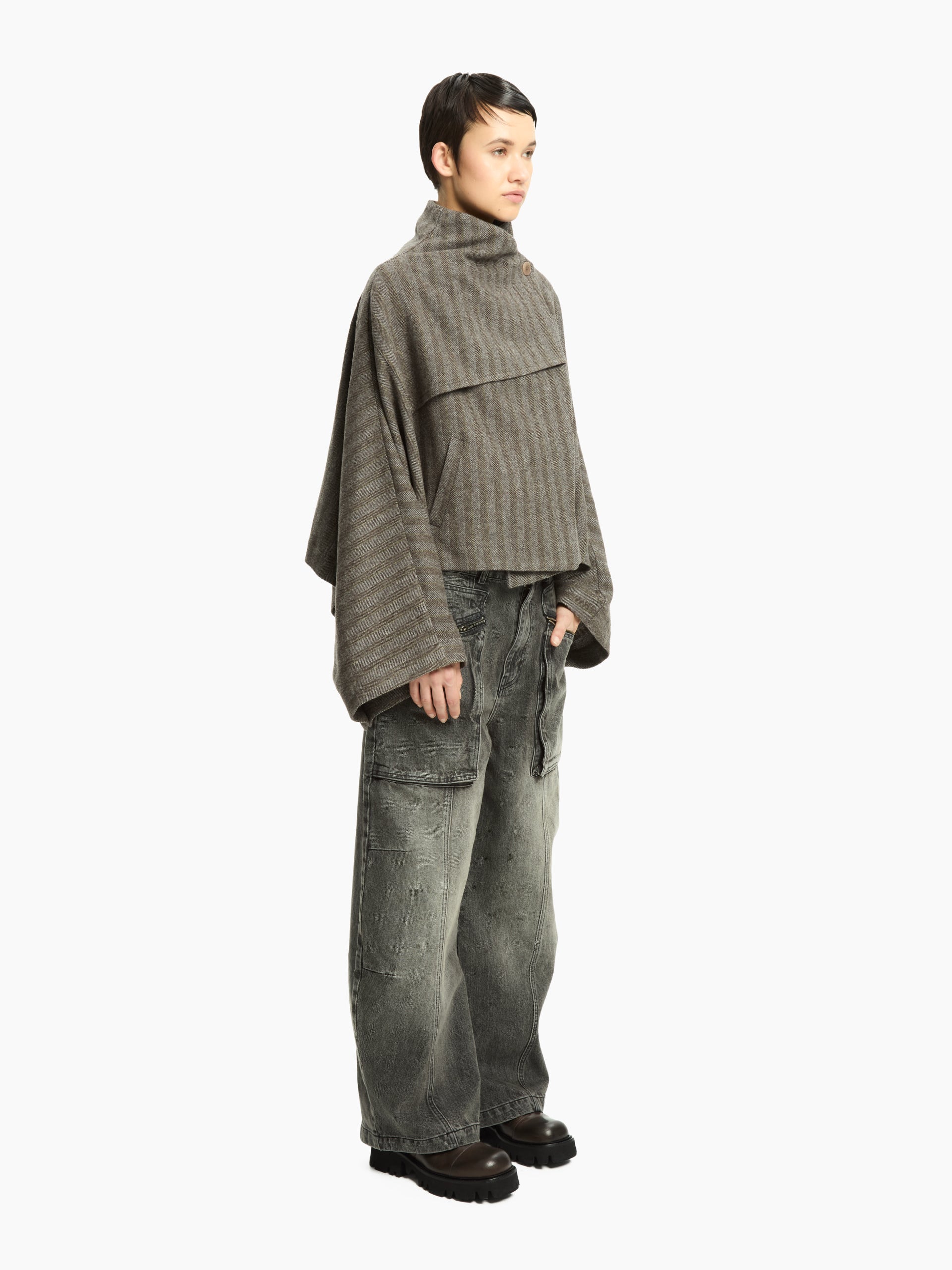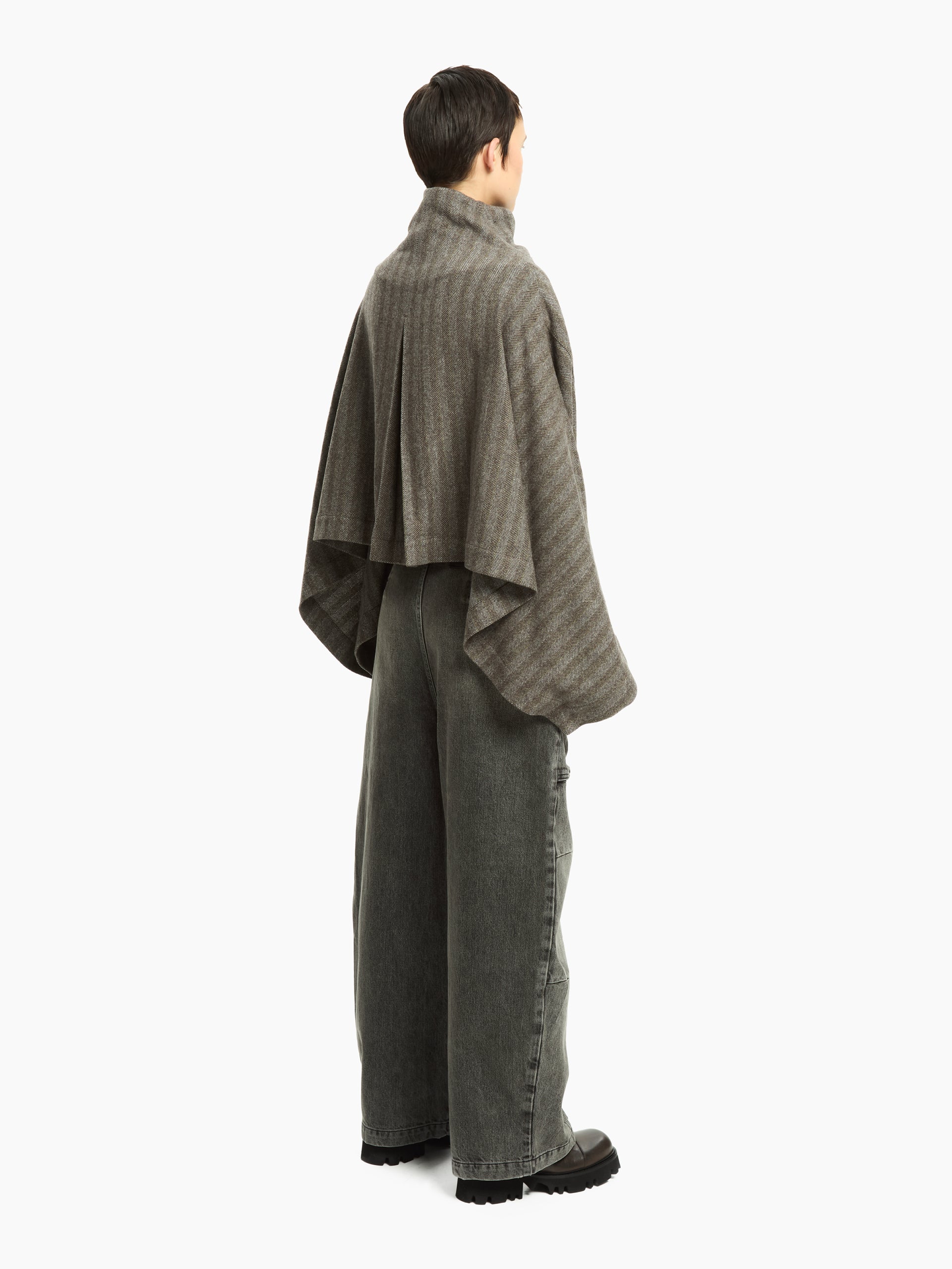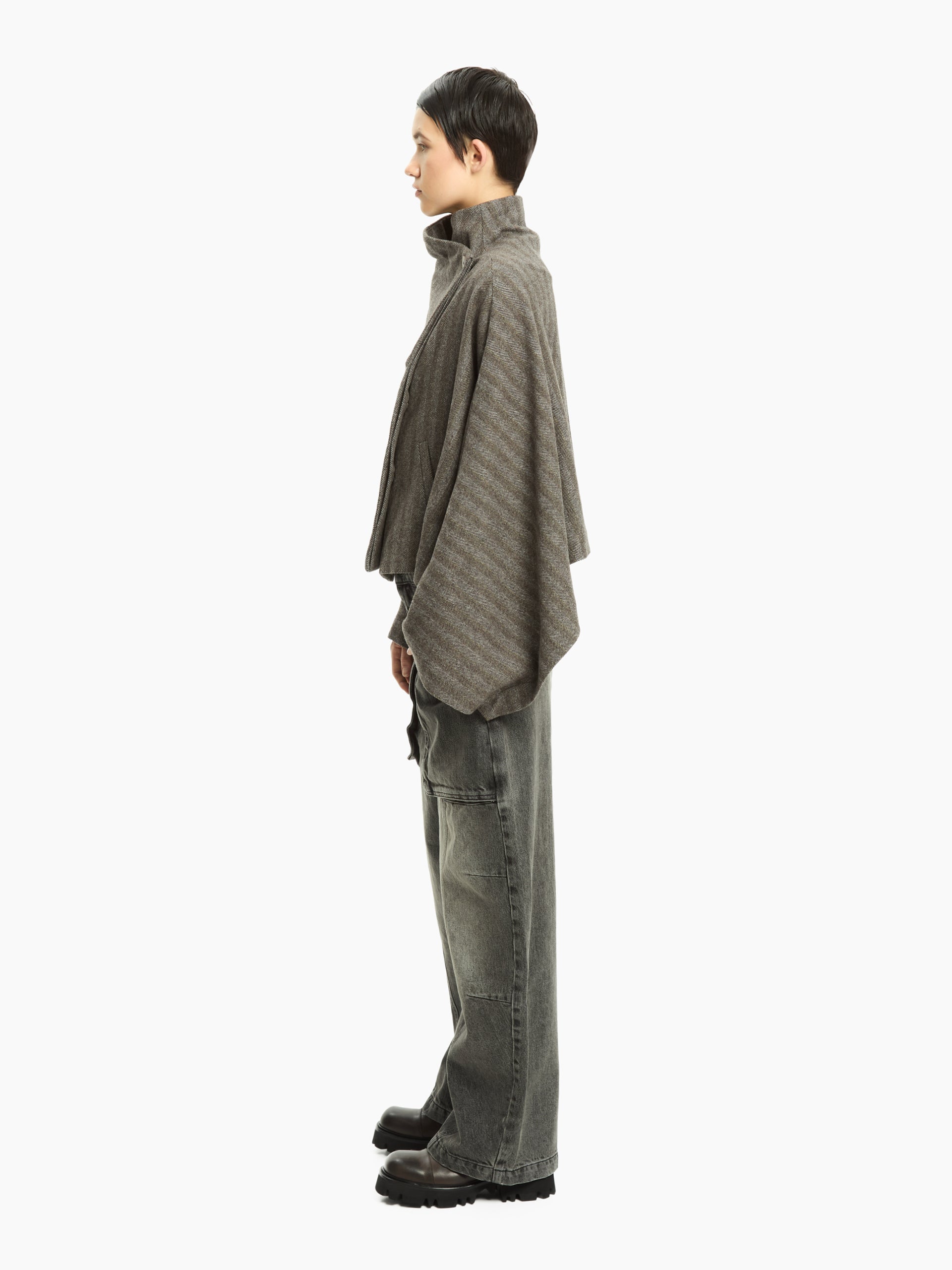 Wool fabric cape with a herringbone pattern, designed for relaxed, contemporary elegance. The loose, enveloping design features a high collar with button closure and an asymmetrical cut at the front, which adds movement and personality. The wide sleeves and flowing line offer comfort and freedom, making it perfect for layering in seasonal looks.