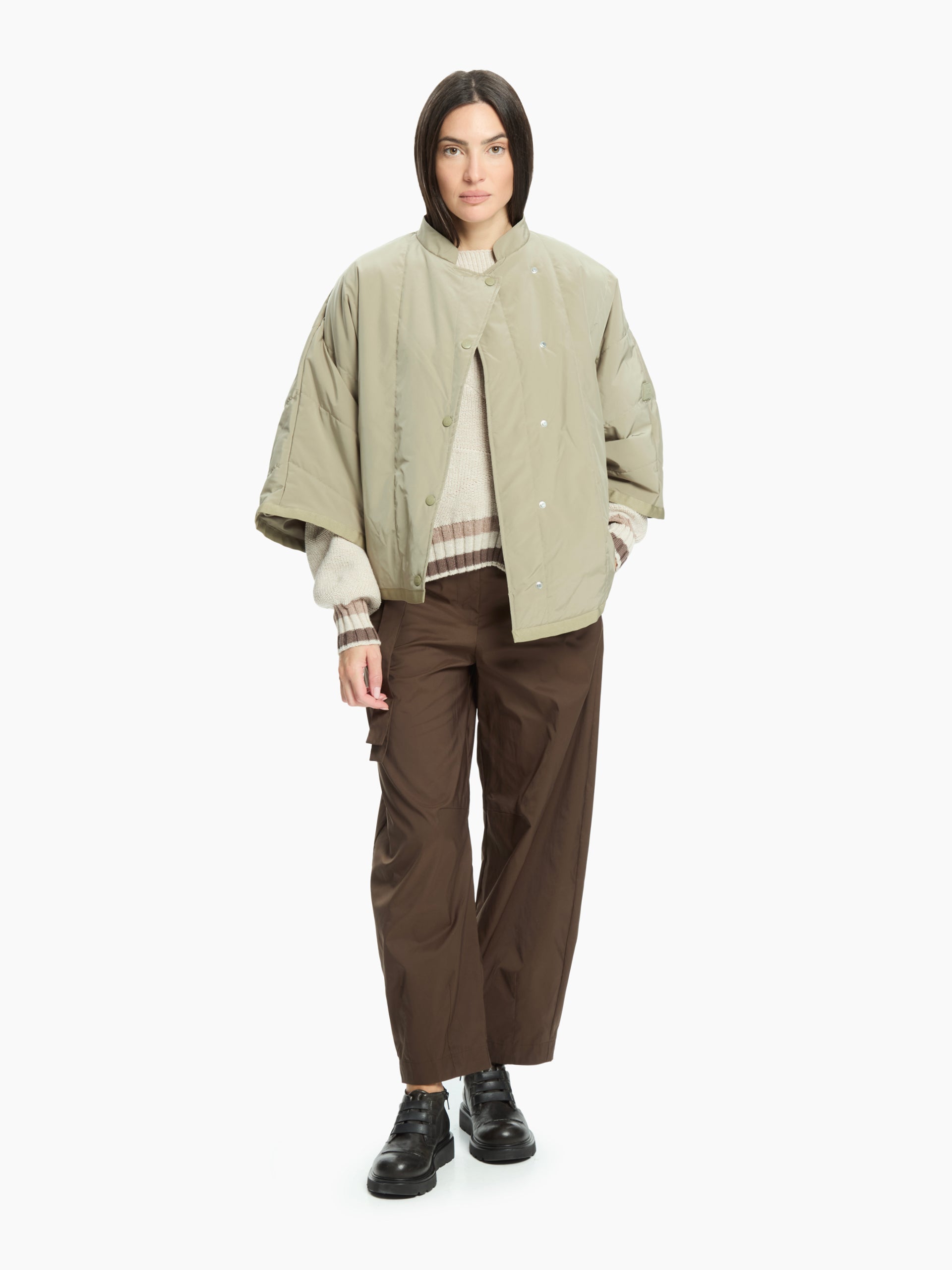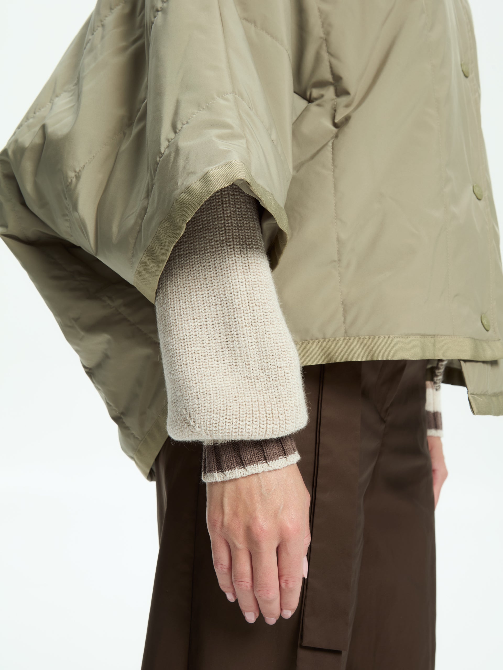 This quilted cape, with its soft volume and sculptural silhouette, combines lightness and comfort with a minimalist and sophisticated aesthetic. The high collar and asymmetrical closure add character and modernity to the garment.