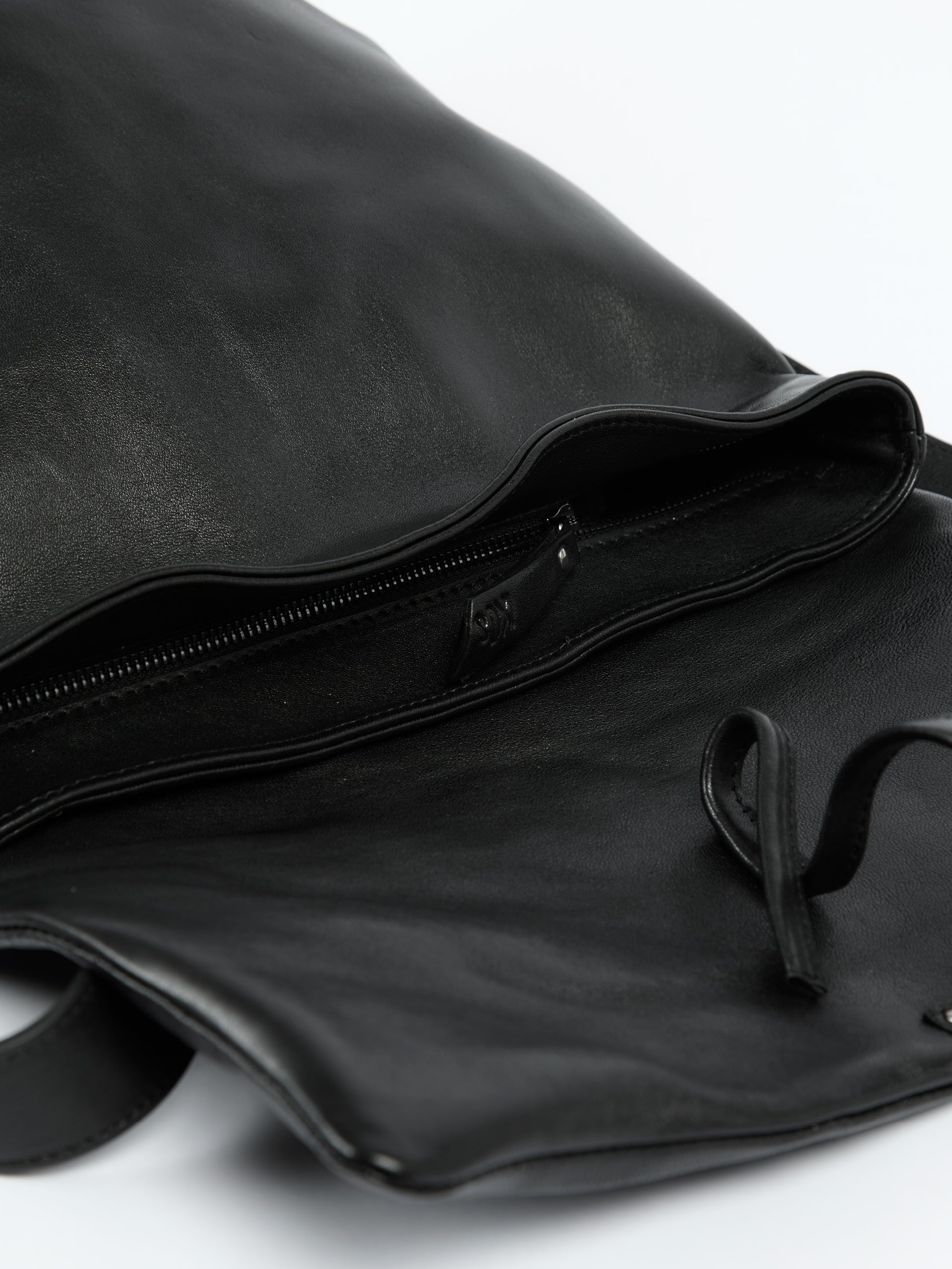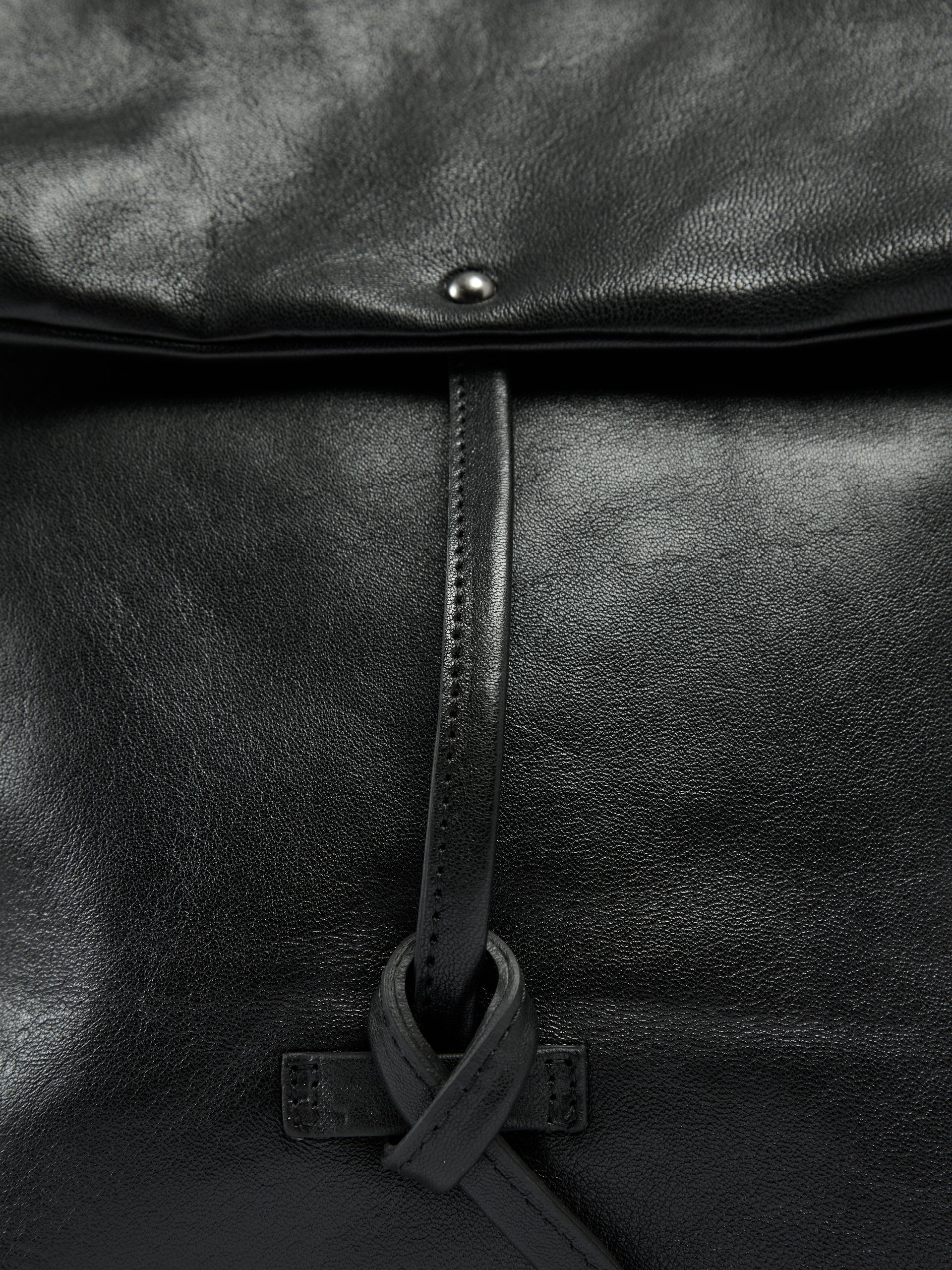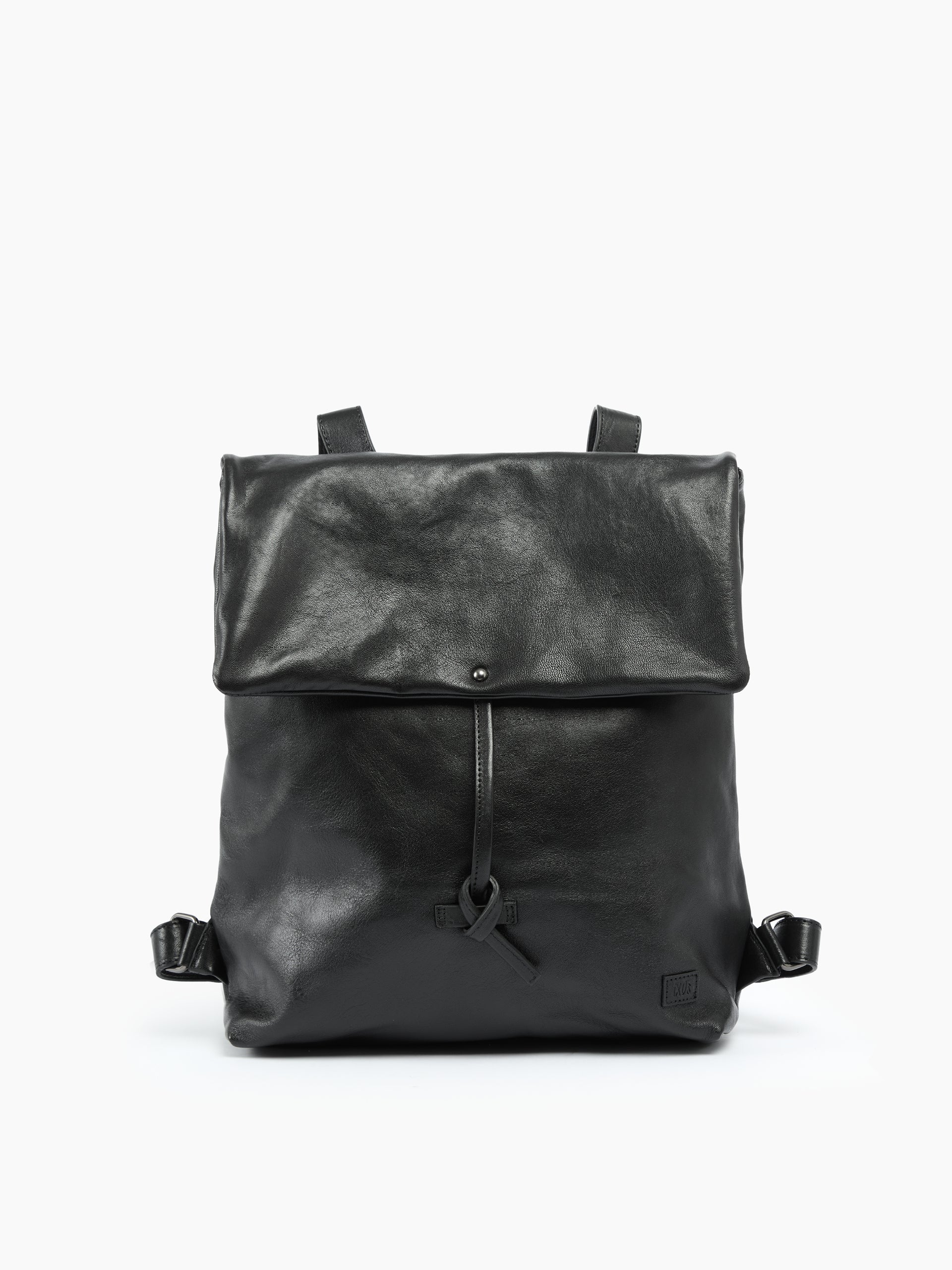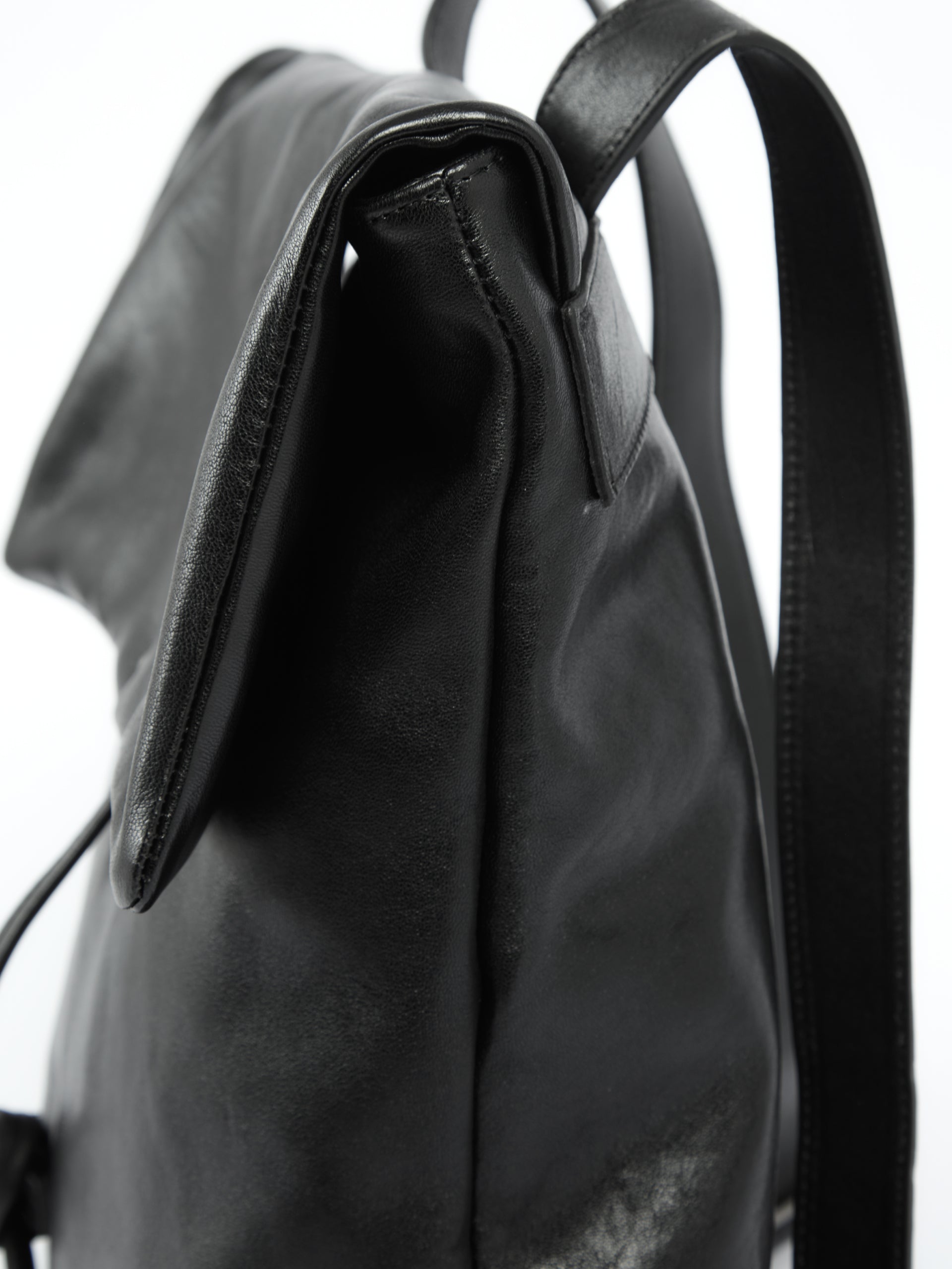 Zaino in morbida pelle dal design essenziale e contemporaneo, caratterizzato da una silhouette pulita e capiente. La chiusura con patta e laccetto frontale aggiunge un tocco minimal e funzionale, mantenendo uno stile ricercato.