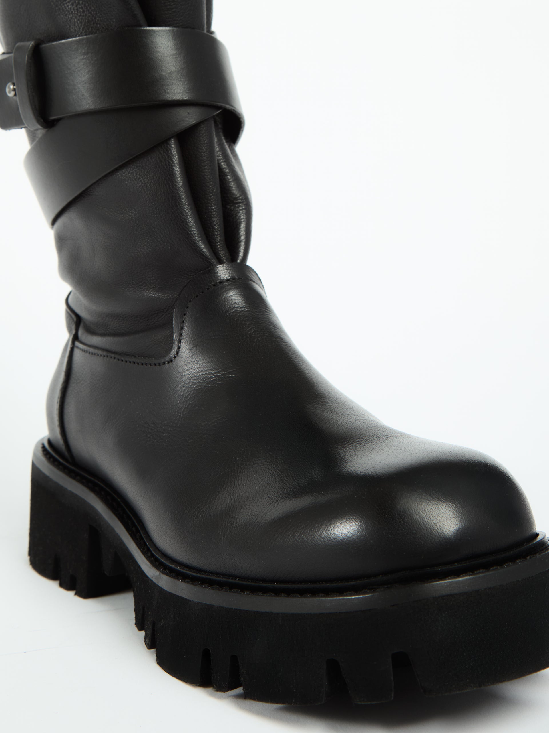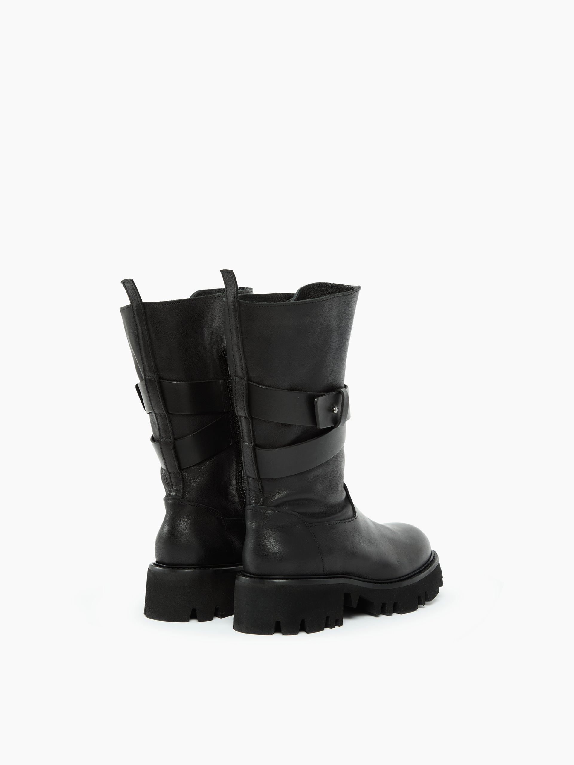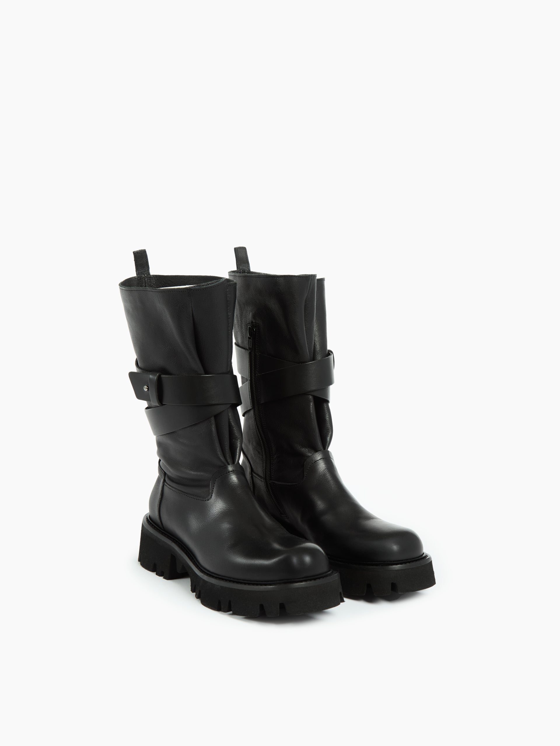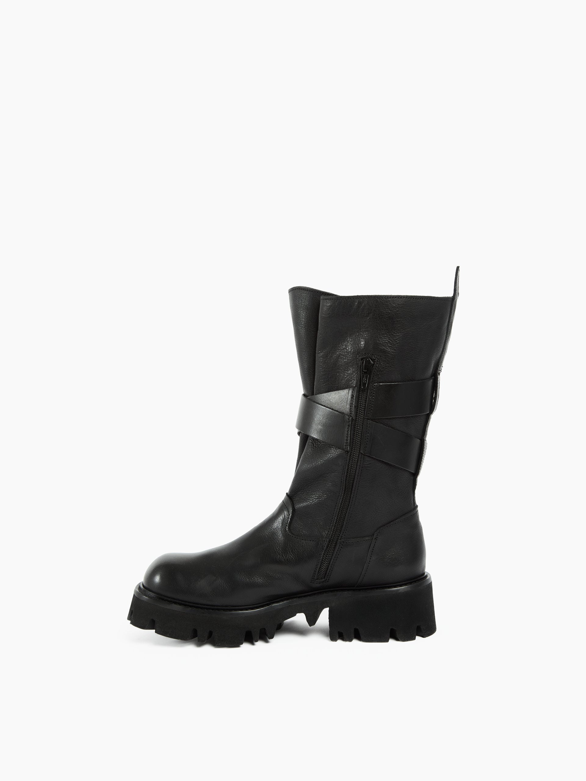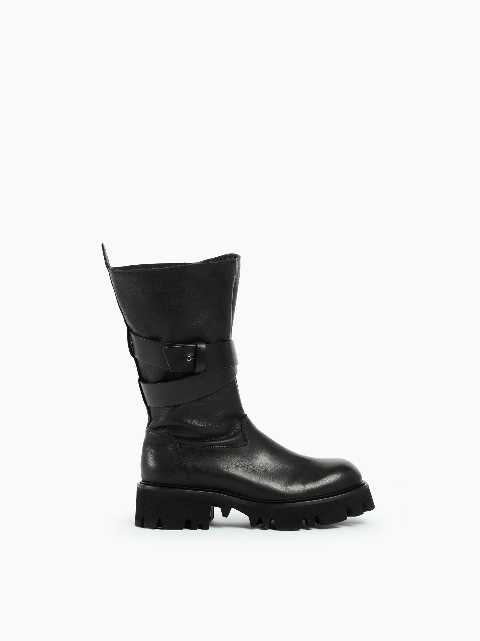 Leather boot with a bold, contemporary character. The minimalist design is enhanced by the decorative strap with side buckle, adding a bold and sophisticated detail. Made from soft leather with a matte finish, it features a rubber lug sole that guarantees comfort and stability.