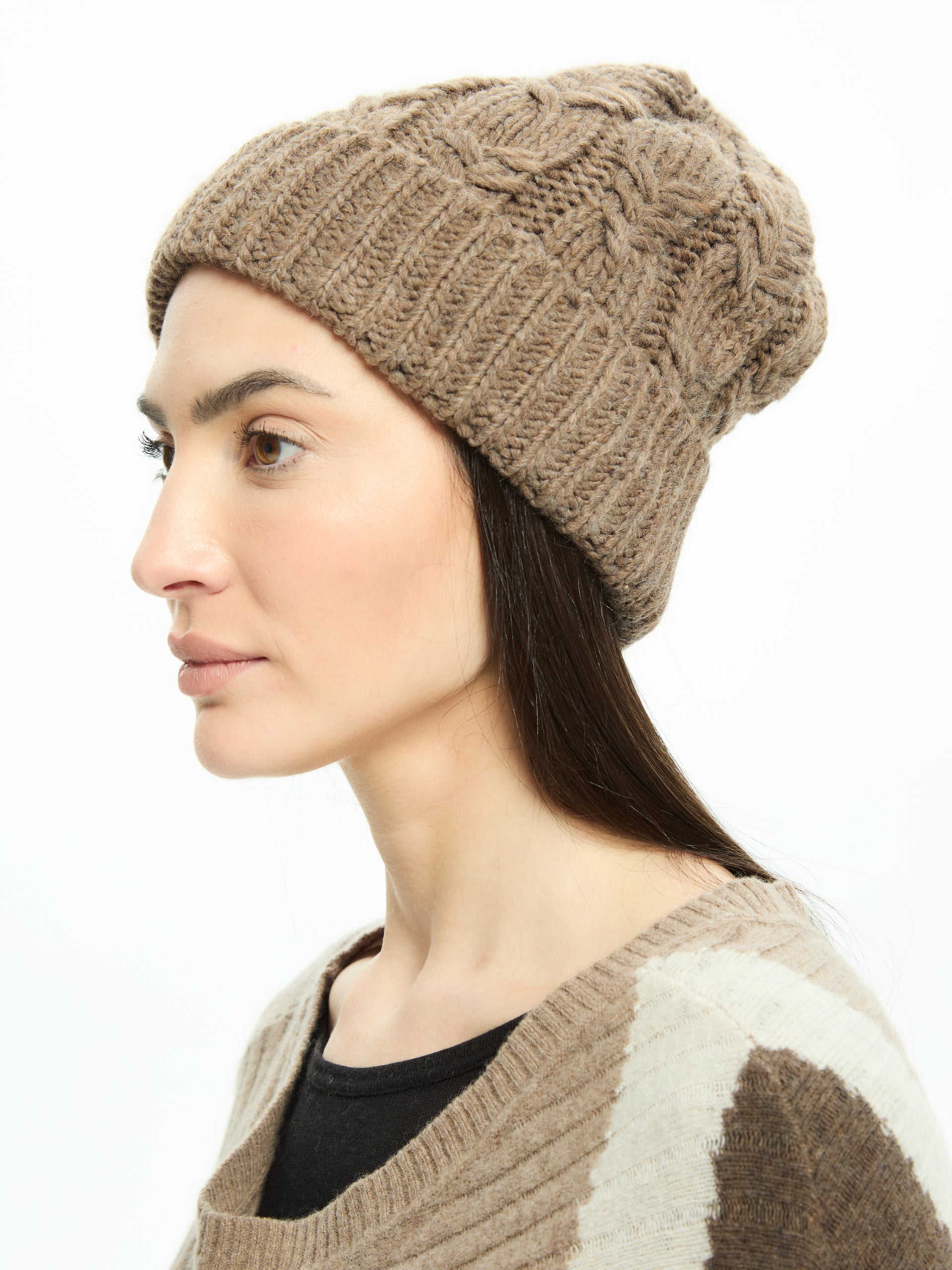 Cable-knit beanie. The ribbed texture and cable pattern add tactile depth, while the soft shape offers a balance of comfort and character.