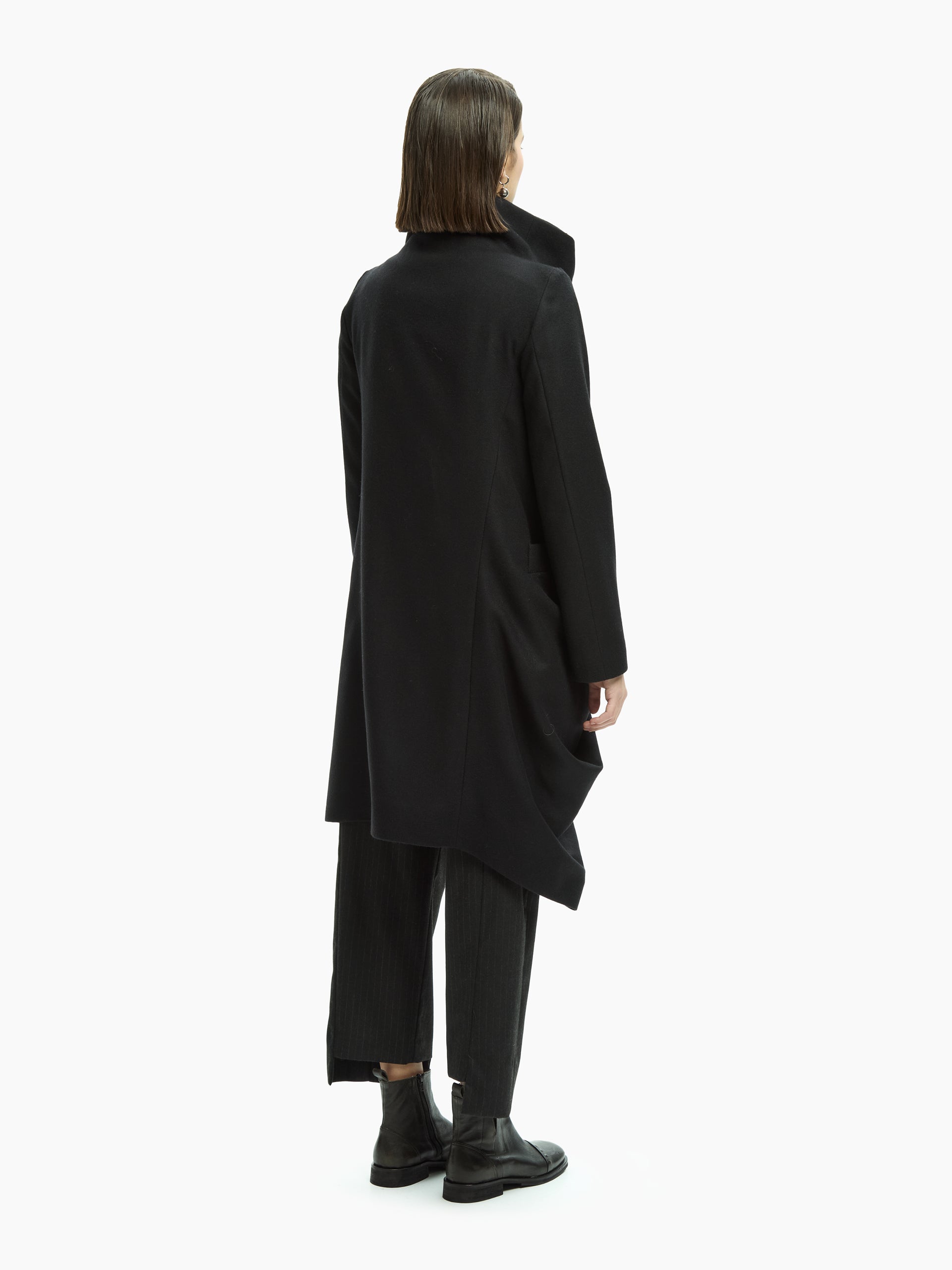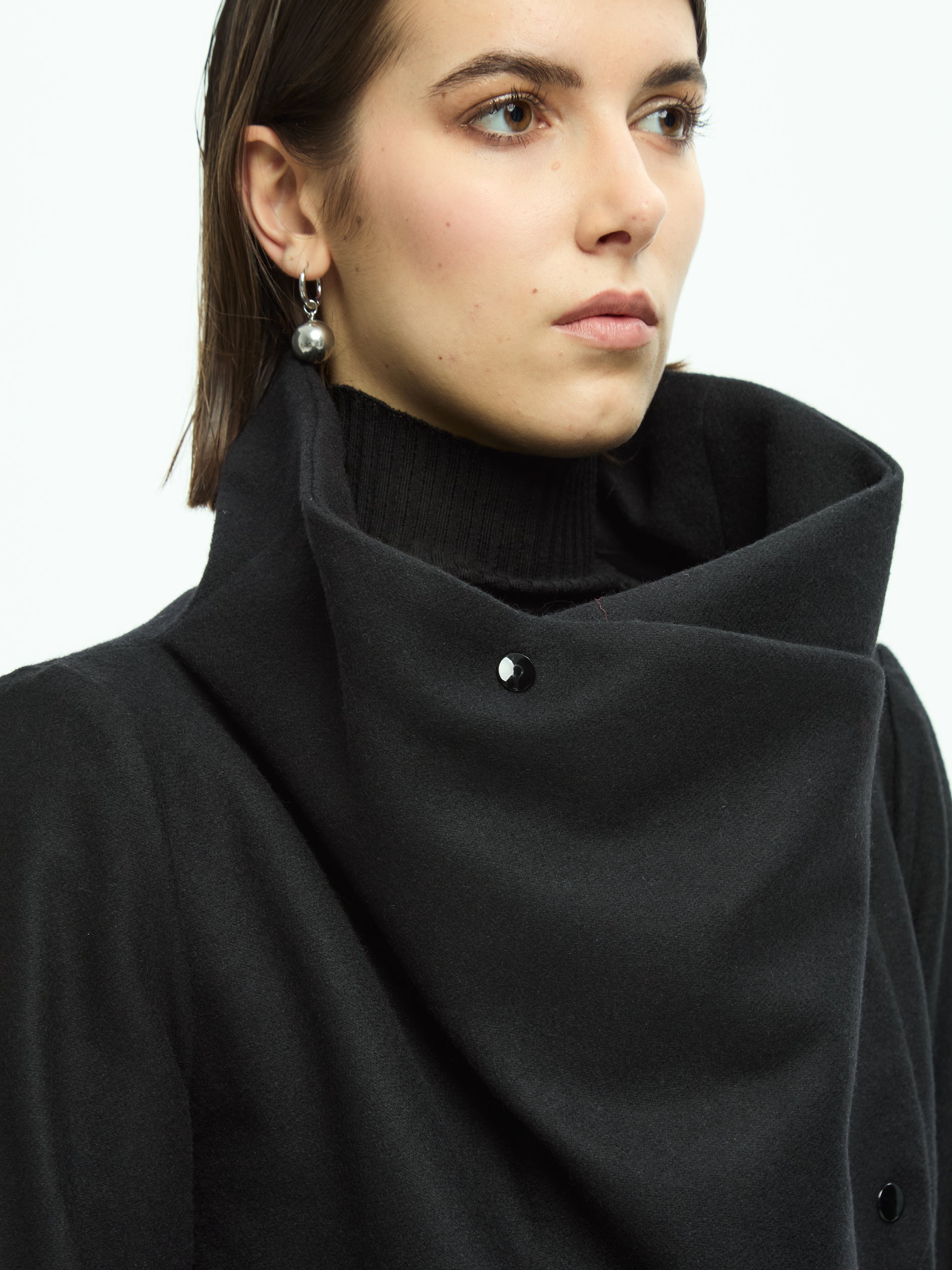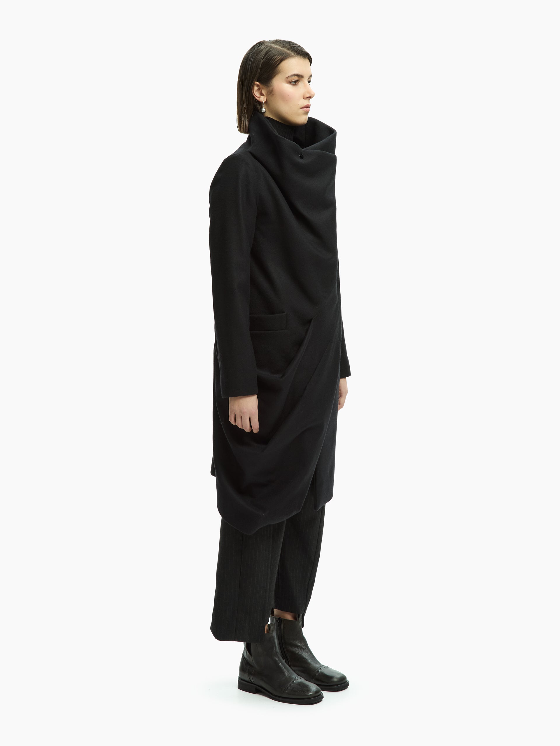 A perfect balance between structure and softness defines this coat with its contemporary design. The irregular construction and side draping create an elegant yet informal silhouette, suitable for a variety of occasions. An iconic piece for those who like to stand out discreetly.