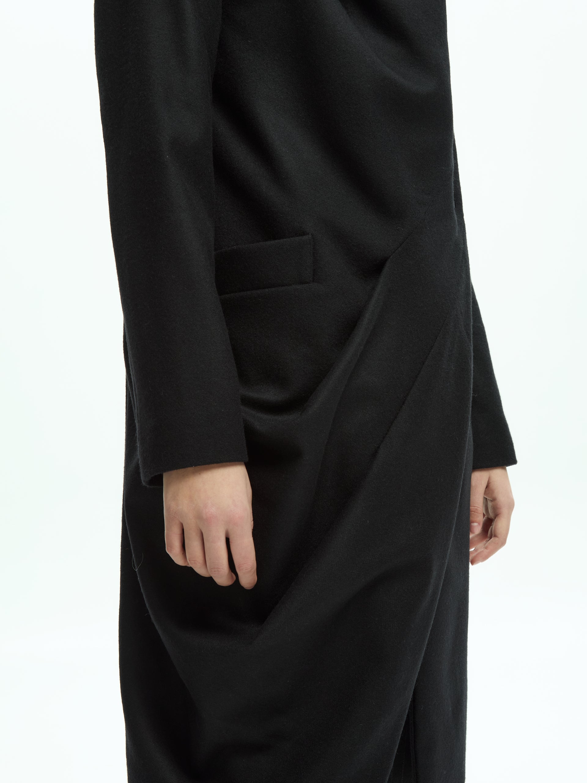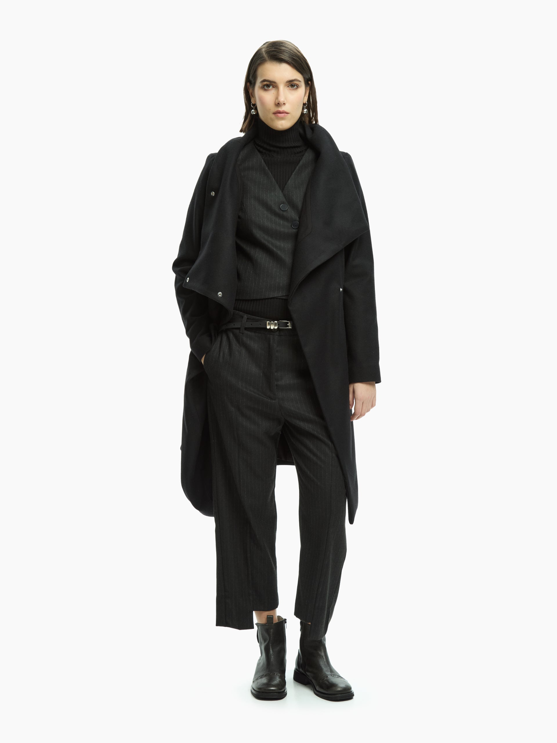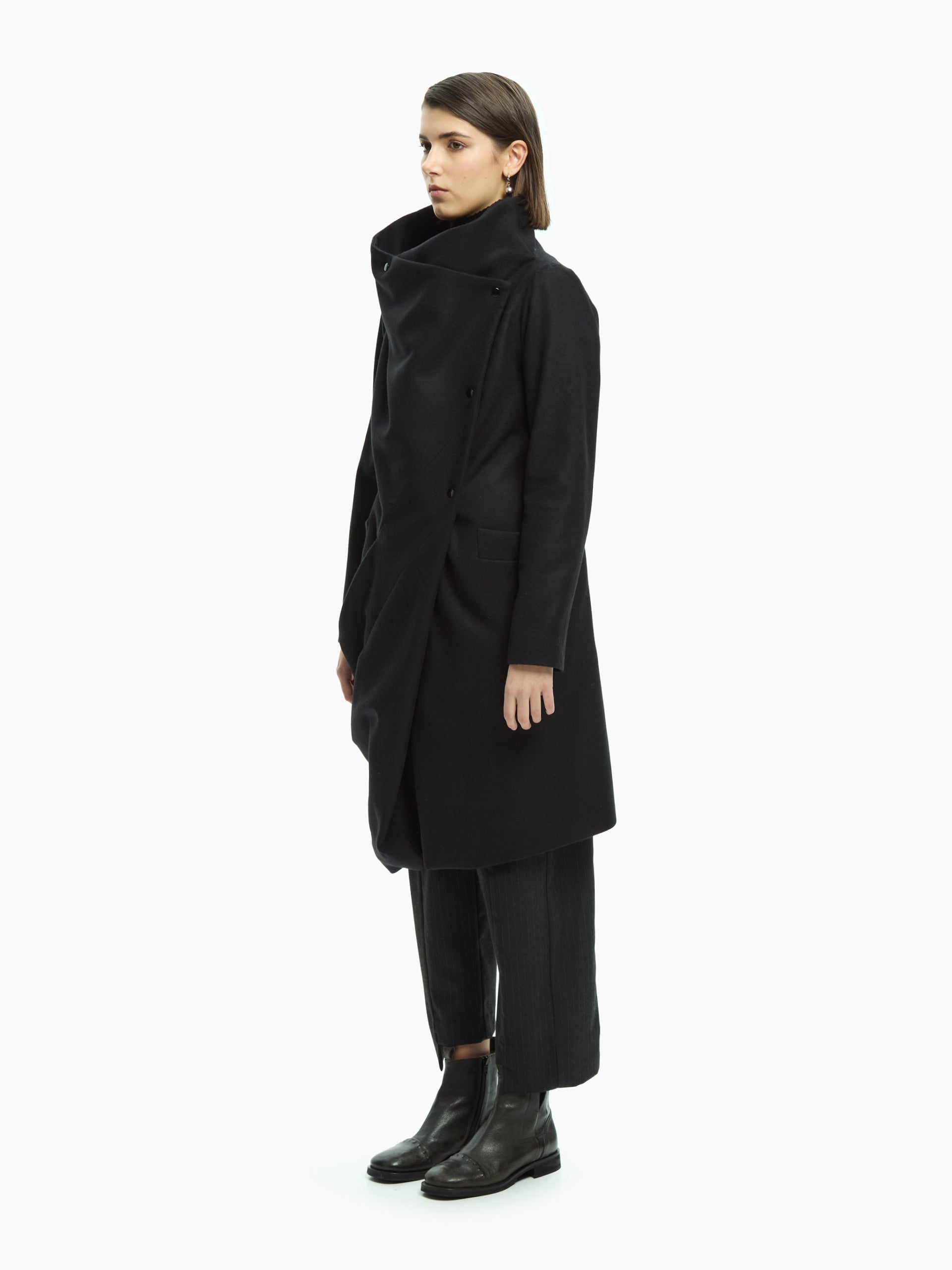 A perfect balance between structure and softness defines this coat with its contemporary design. The irregular construction and side draping create an elegant yet informal silhouette, suitable for a variety of occasions. An iconic piece for those who like to stand out discreetly.