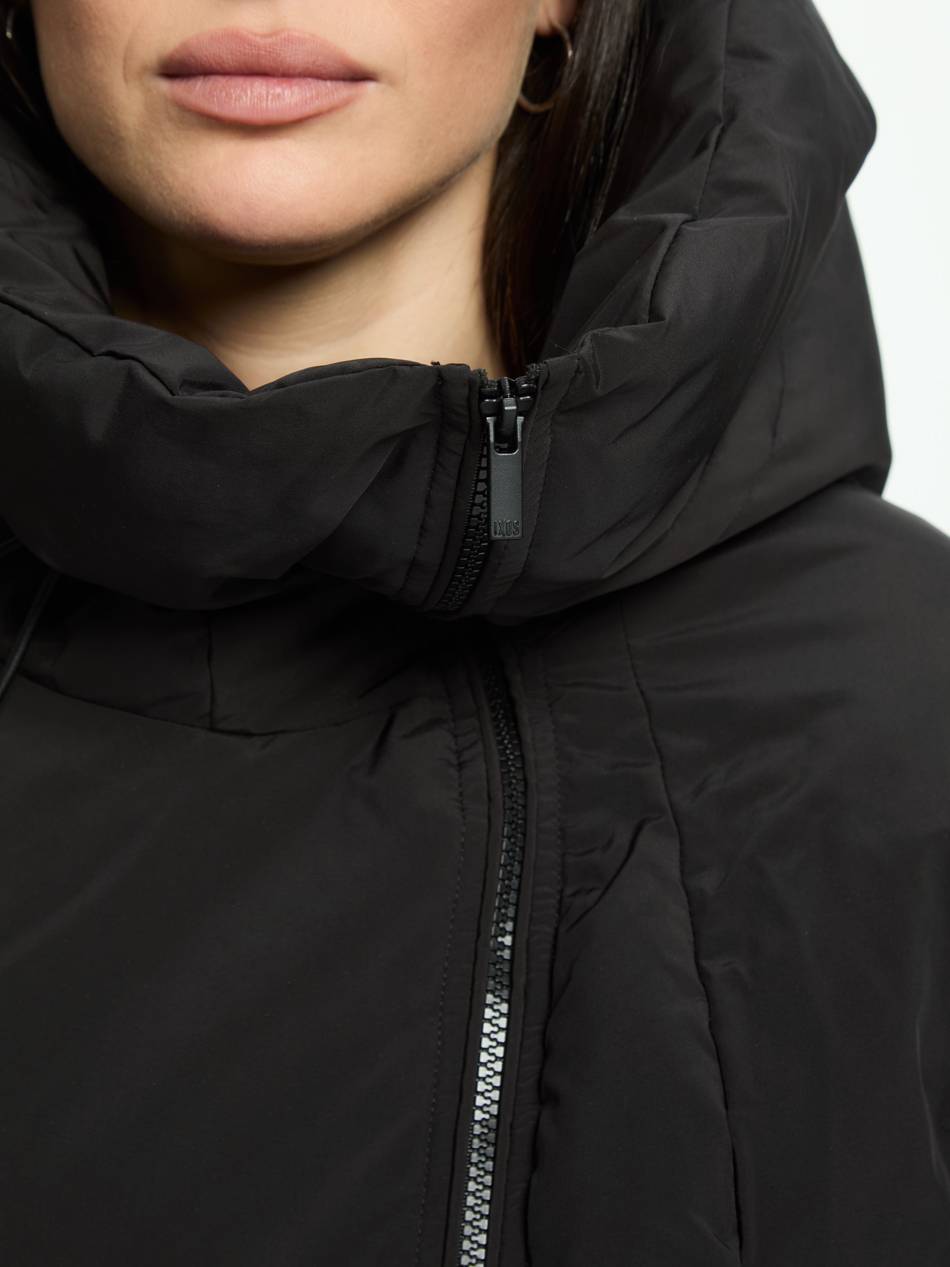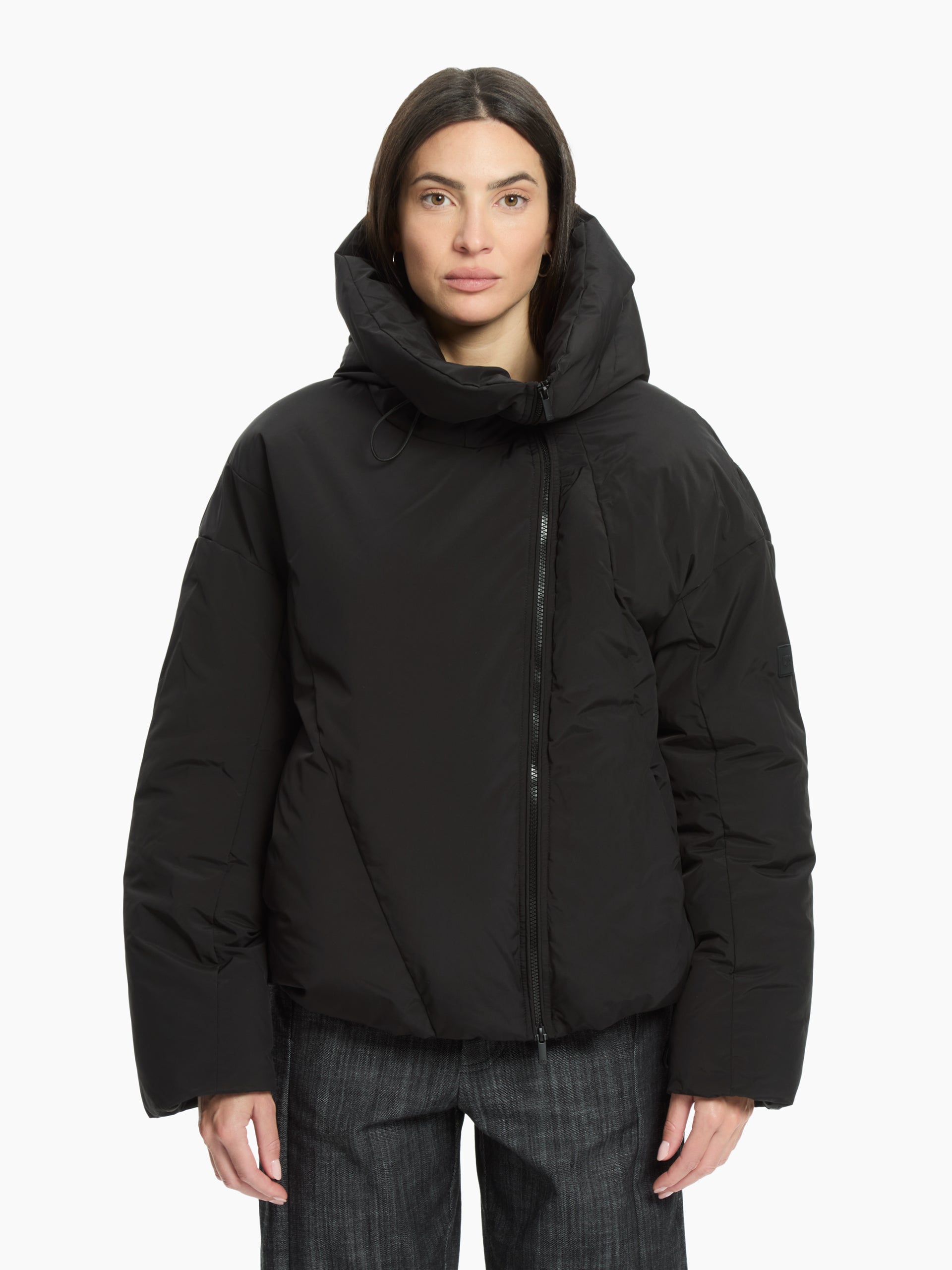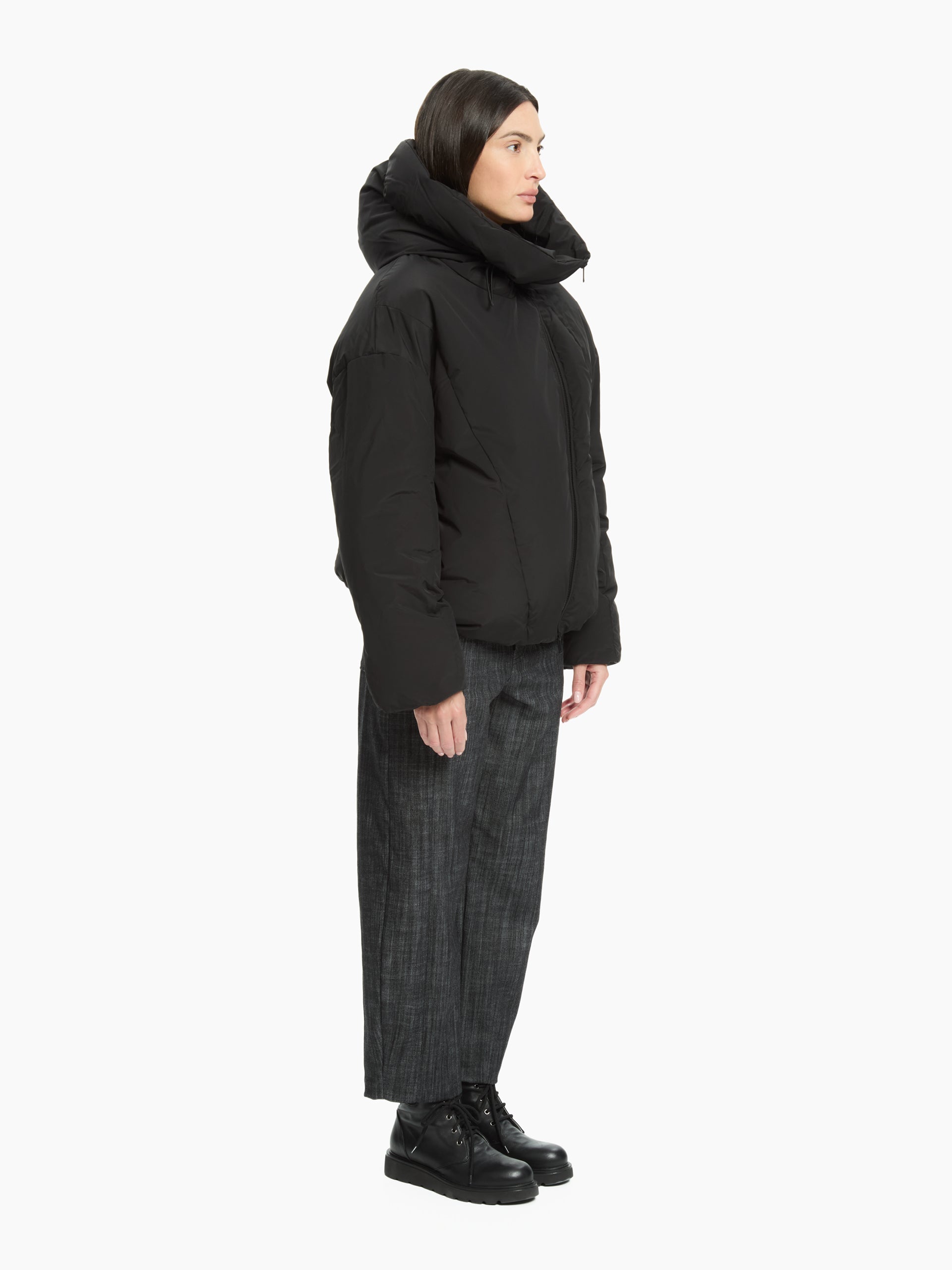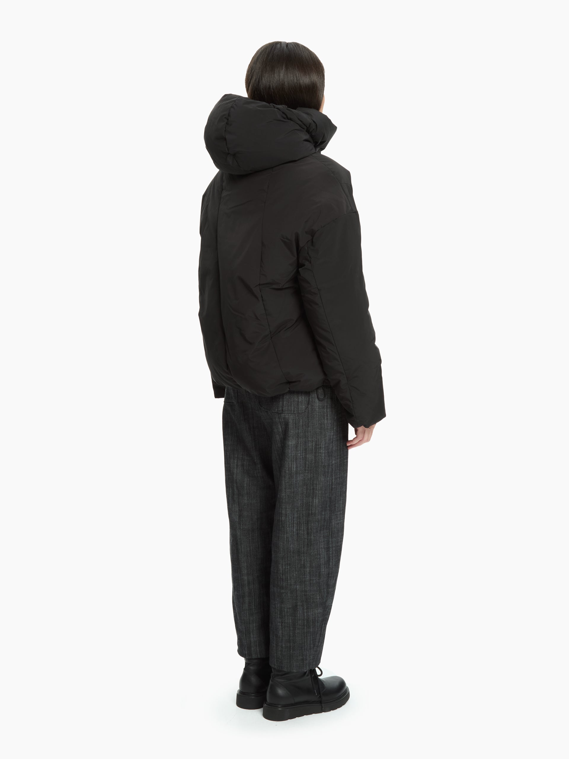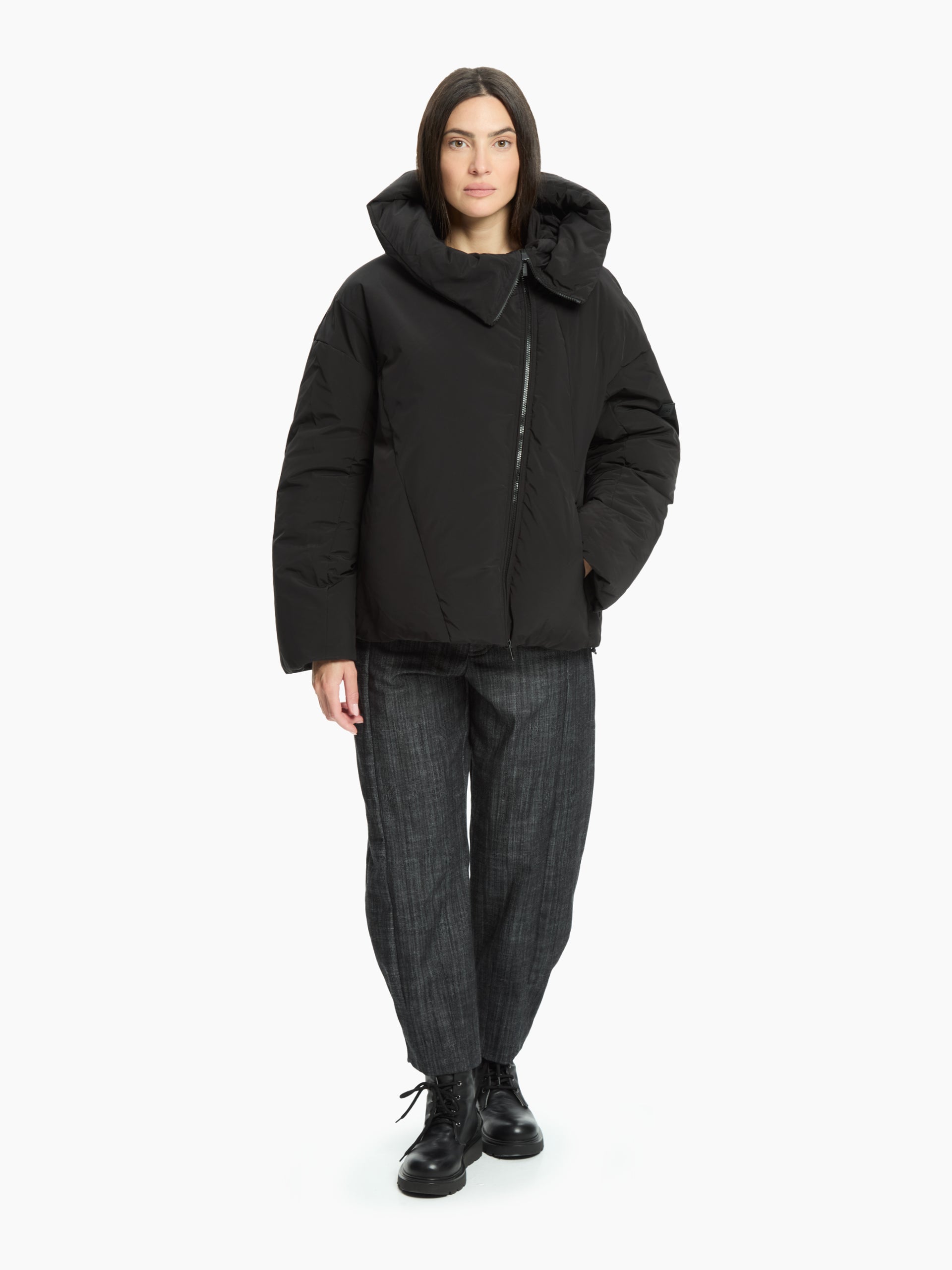 Made from a technical fabric with a matte, sophisticated look, it offers warmth and lightness in a design with clean, contemporary lines. The high, enveloping collar defines the silhouette with a sculptural and distinctive effect.