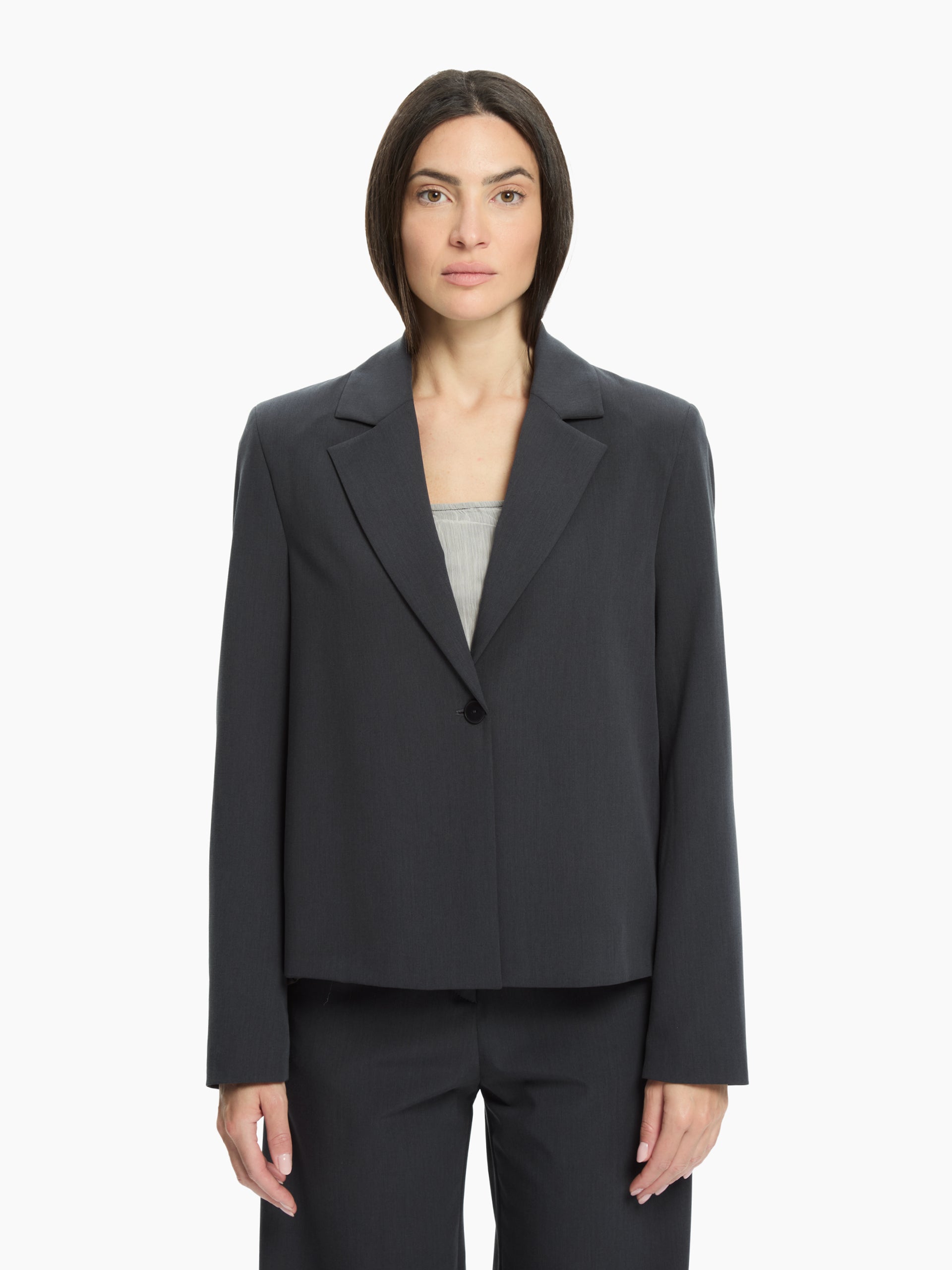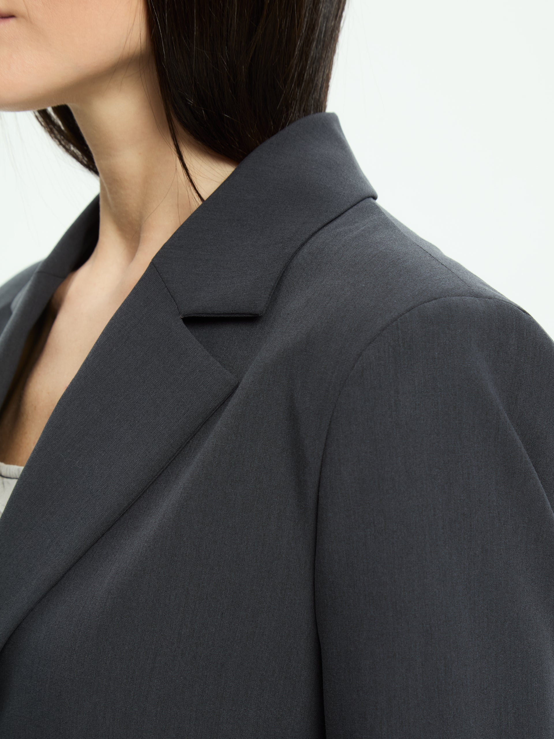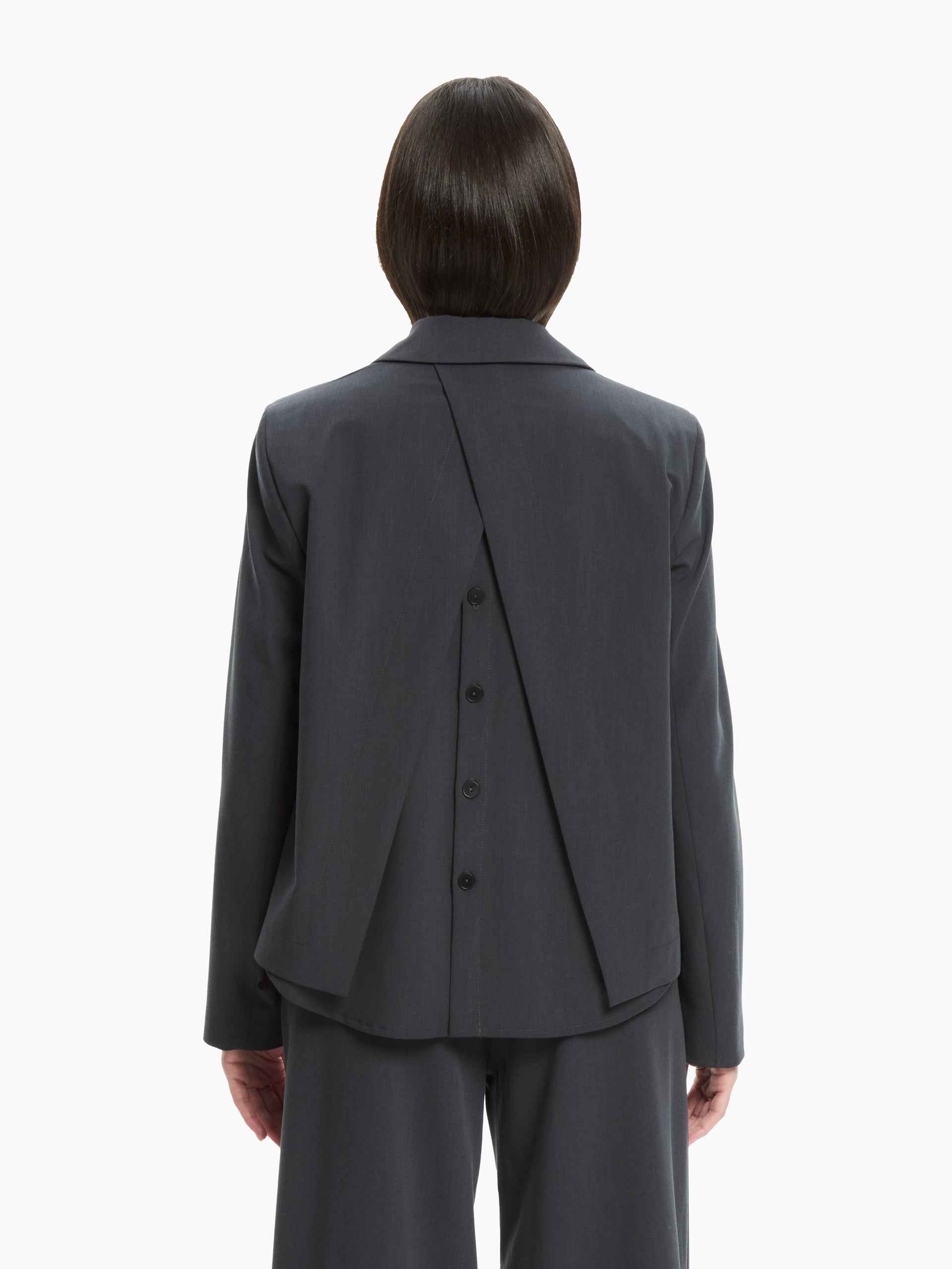 Contemporary cut jacket. The line is simple but enriched with sartorial details that enhance its personality. The design features a clean front with a single button closure, while the back stands out for its overlapping panel with vertical buttoning, which adds movement and character. Versatile and sophisticated, it is a perfect garment for formal looks or to add a refined touch to more casual outfits.
