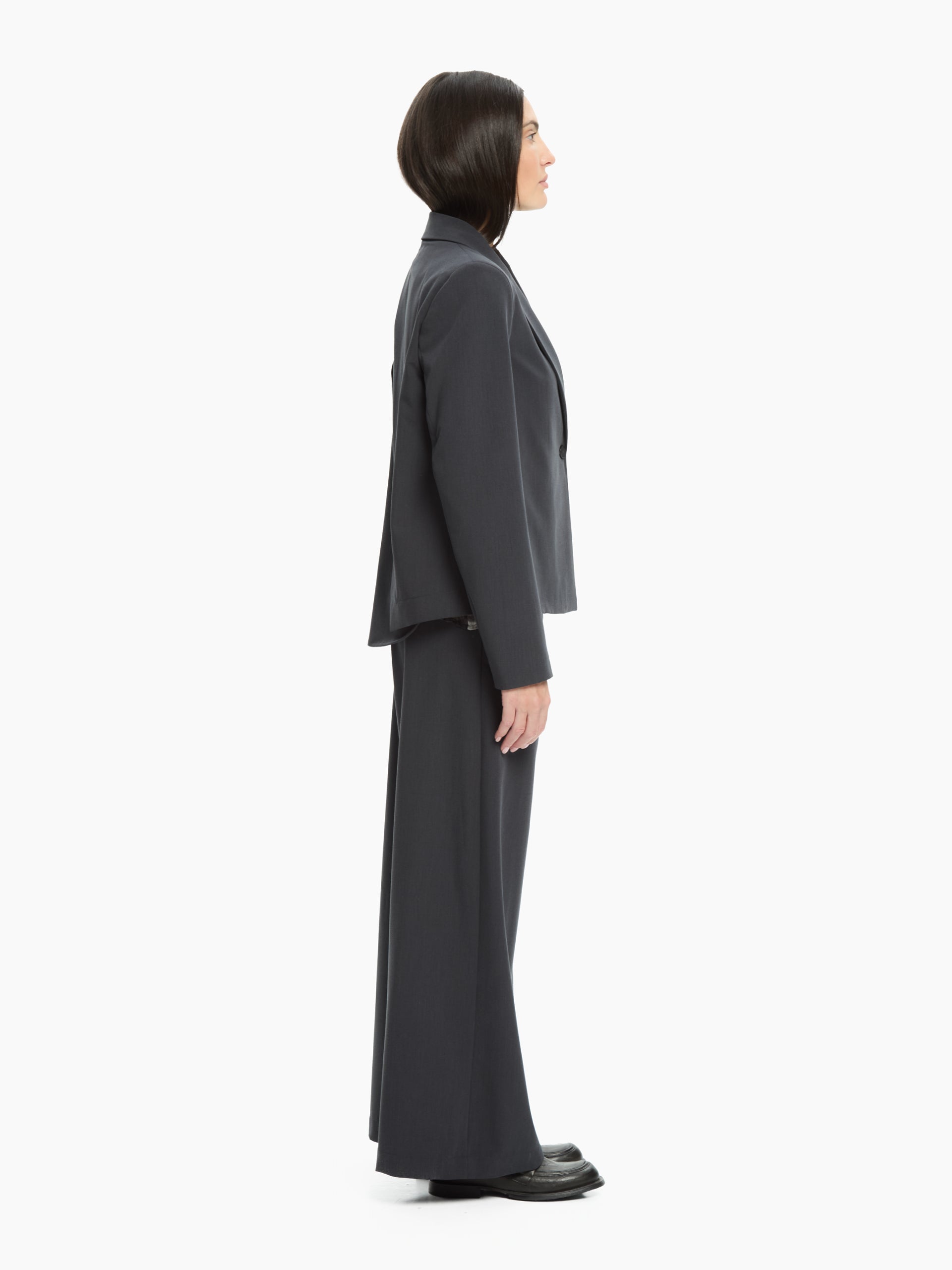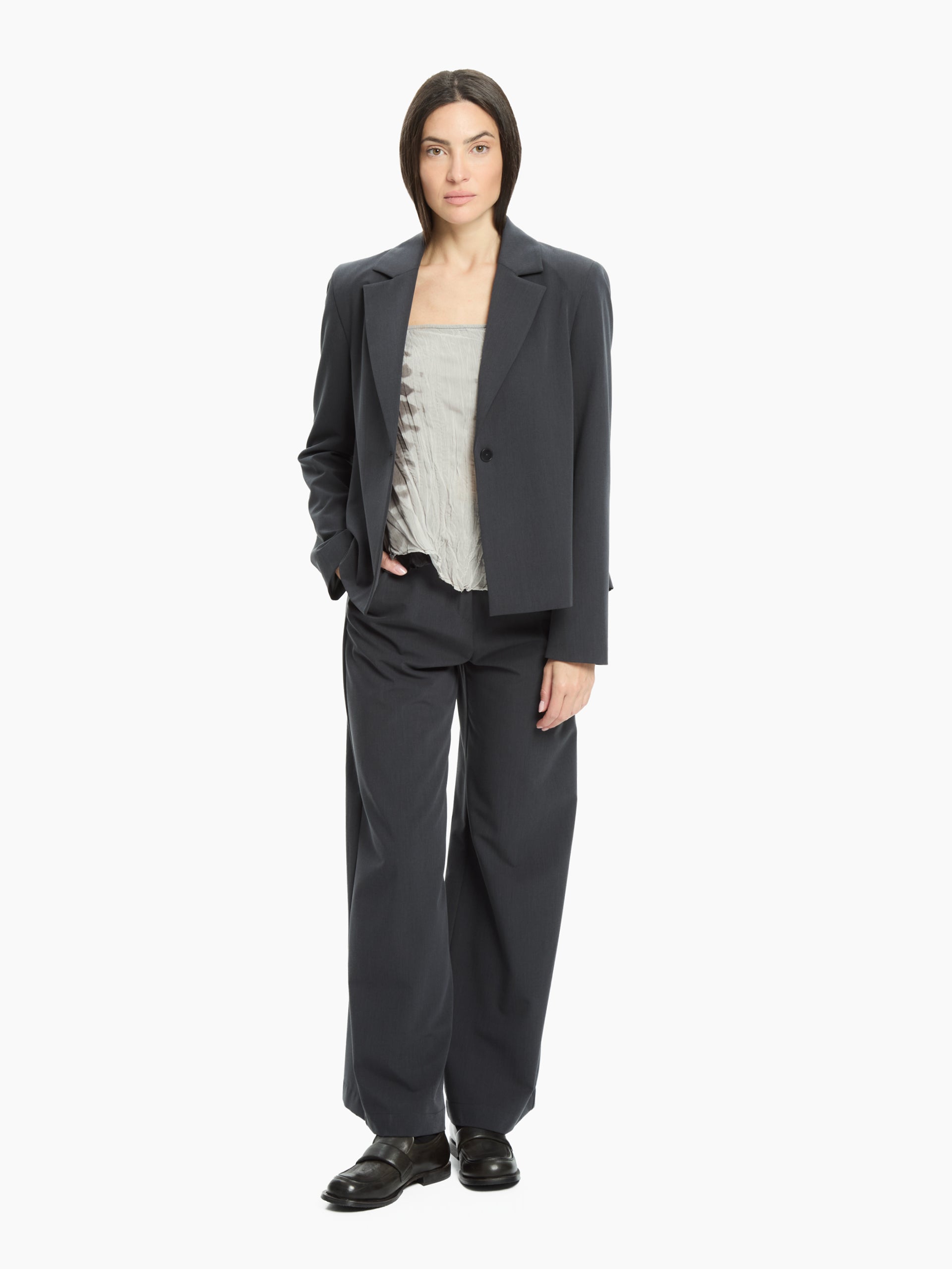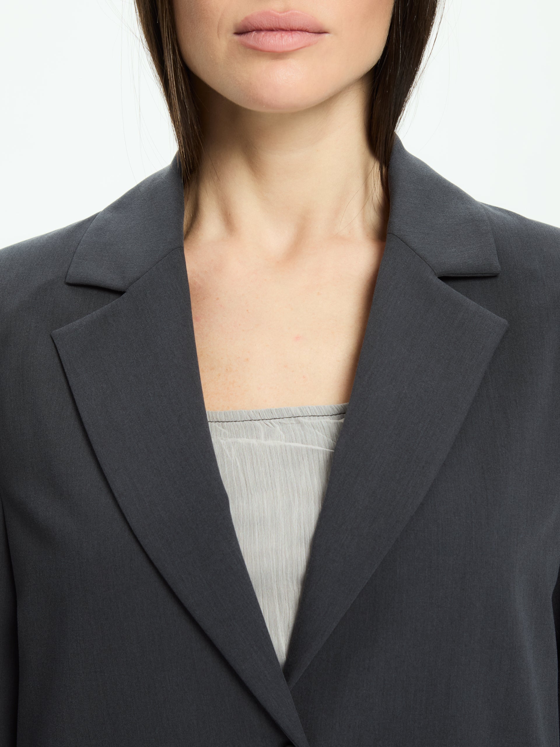 Contemporary cut jacket. The line is simple but enriched with sartorial details that enhance its personality. The design features a clean front with a single button closure, while the back stands out for its overlapping panel with vertical buttoning, which adds movement and character. Versatile and sophisticated, it is a perfect garment for formal looks or to add a refined touch to more casual outfits.