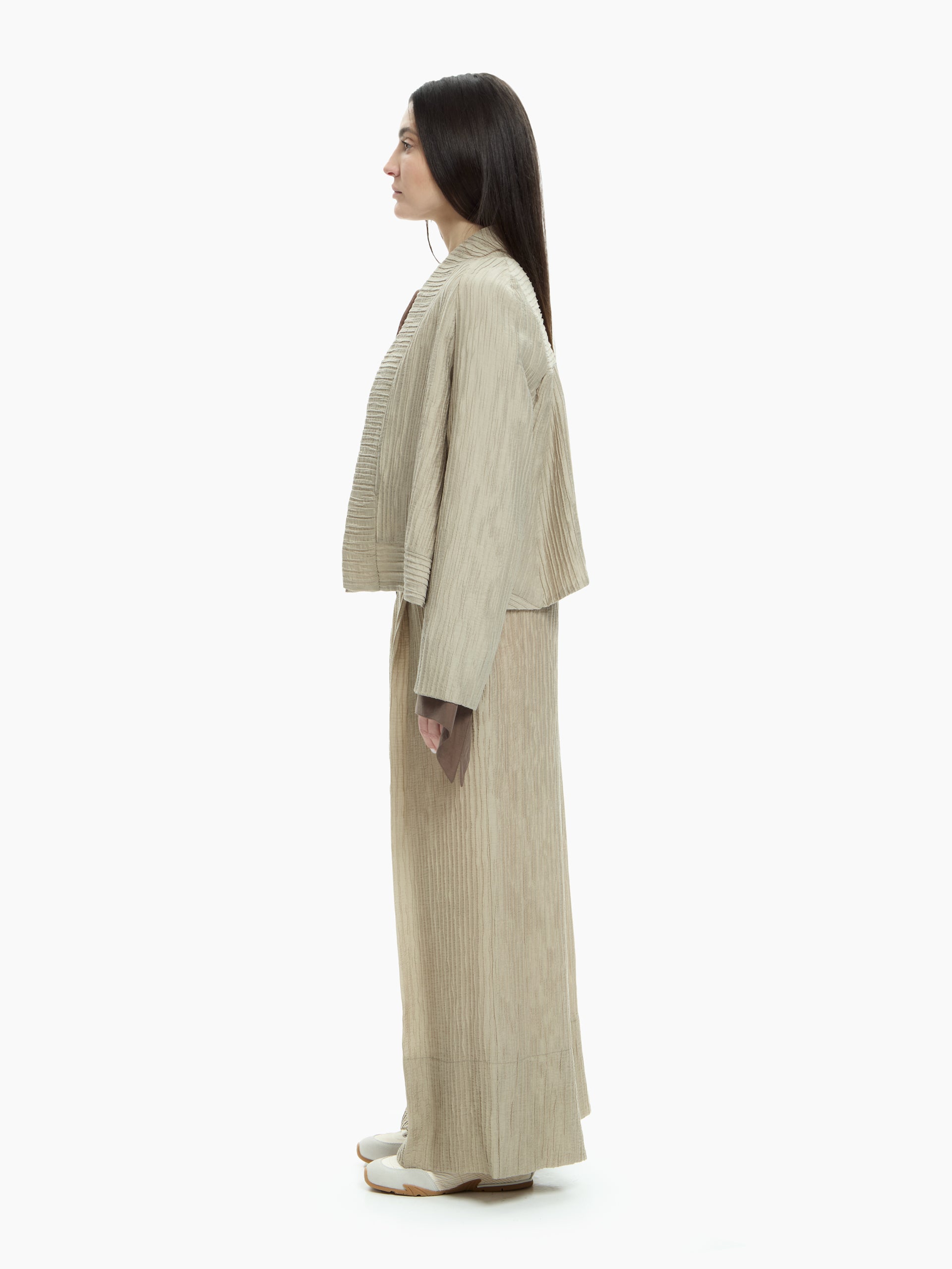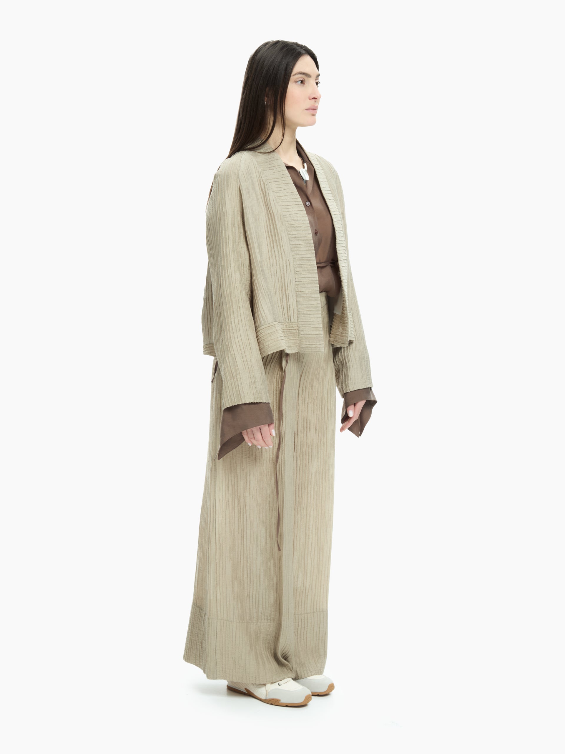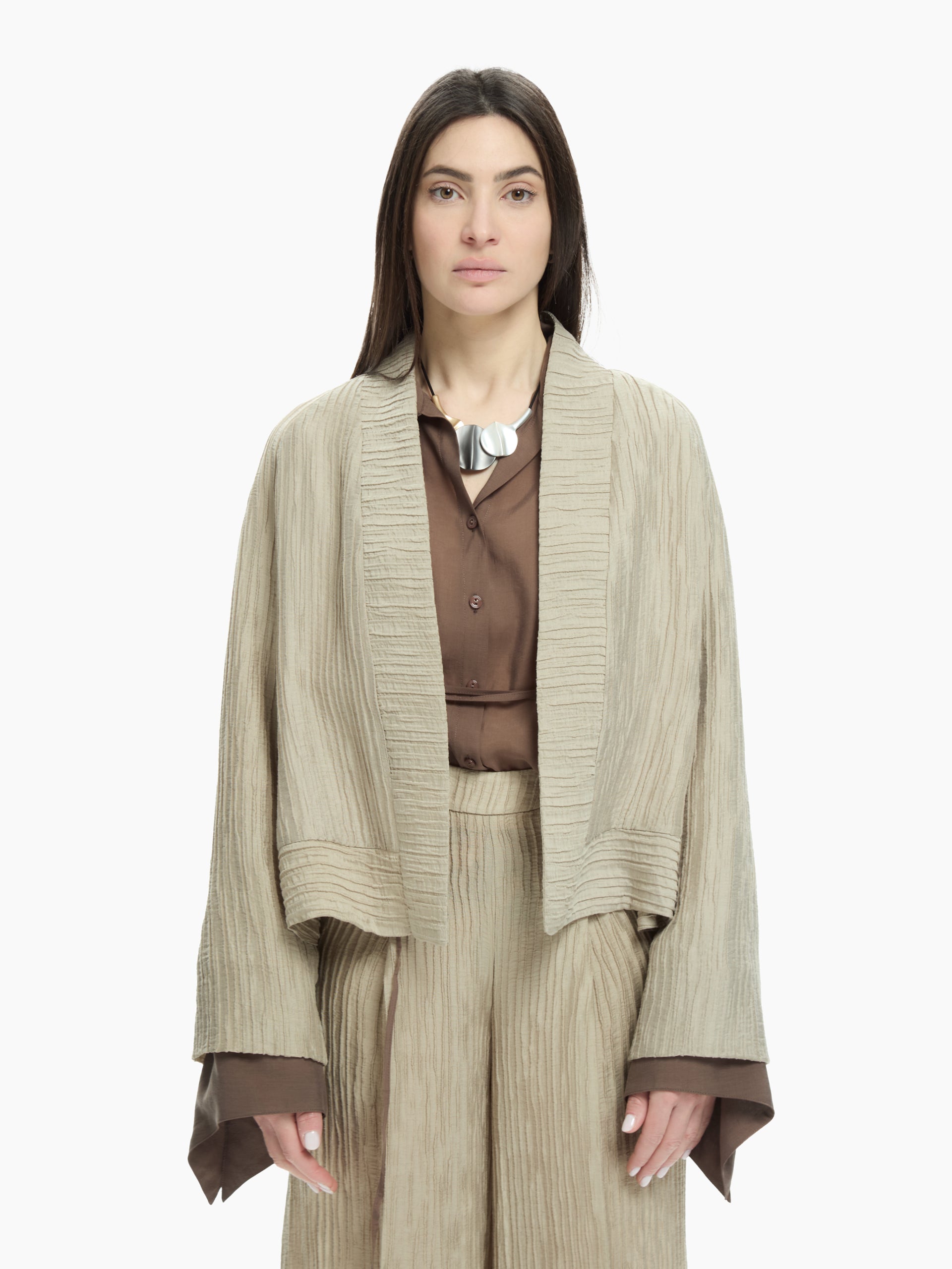 Giacca dal design fluido e sofisticato, caratterizzata da un tessuto plissé che dona movimento e leggerezza alla silhouette. La linea morbida e aperta sul davanti valorizza il layering, mentre il collo ampio aggiunge un tocco contemporaneo ed elegante. Un capo versatile, ideale per completare look ricercati con naturale armonia.