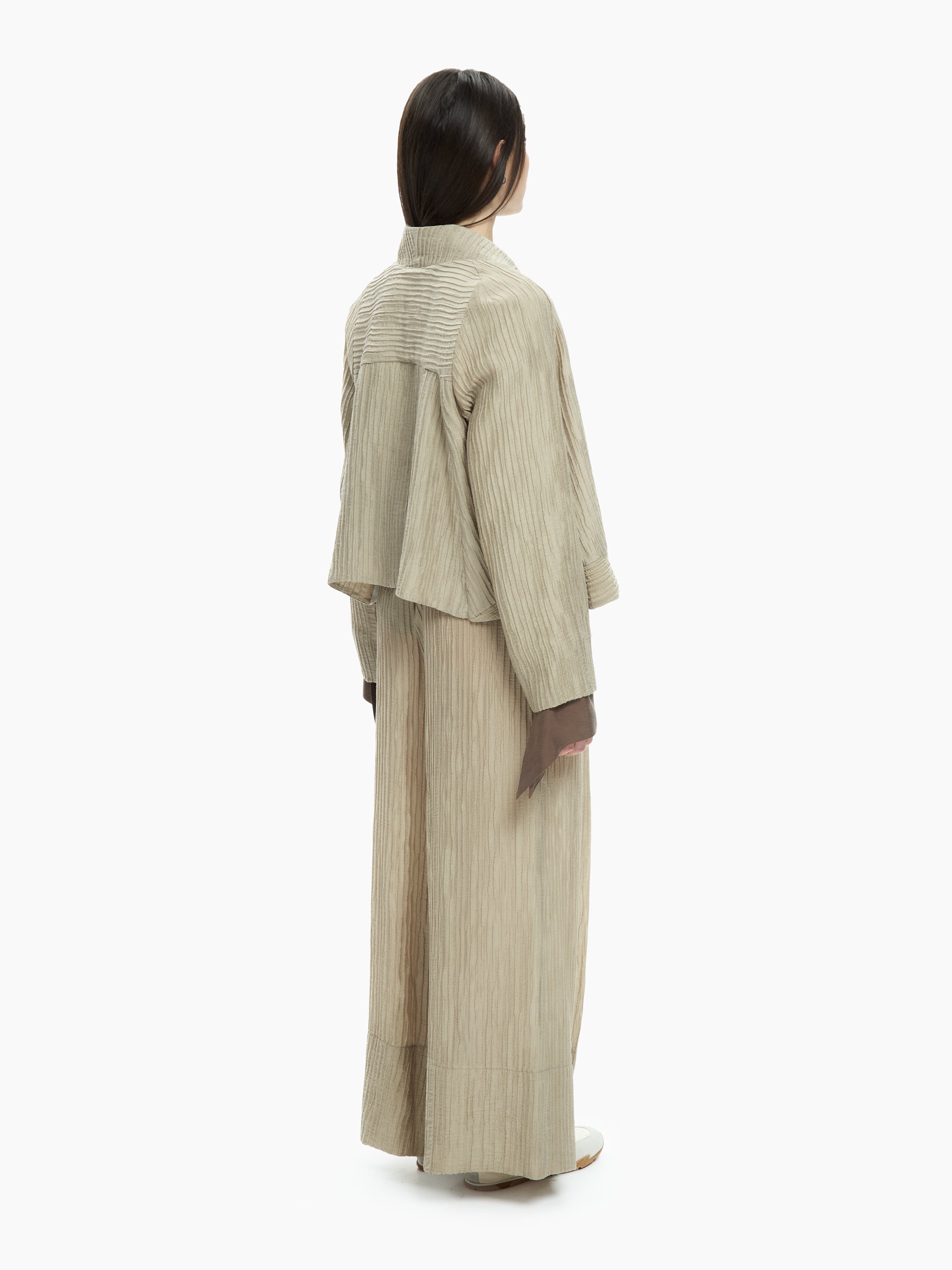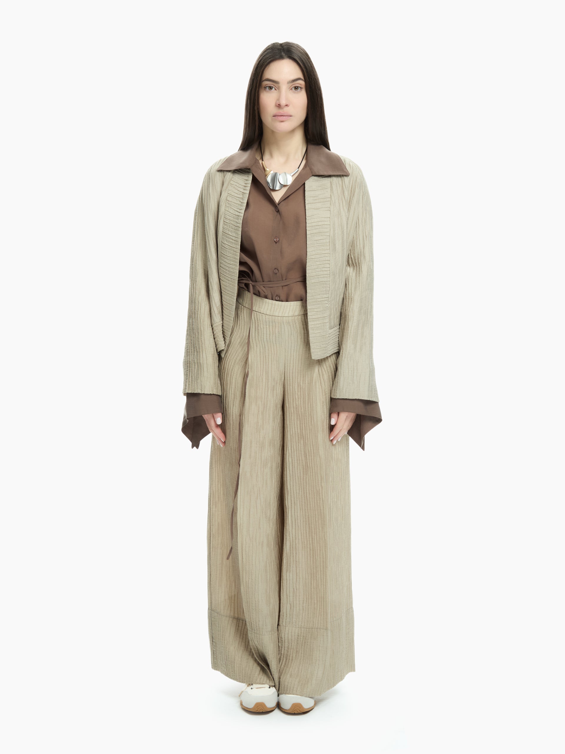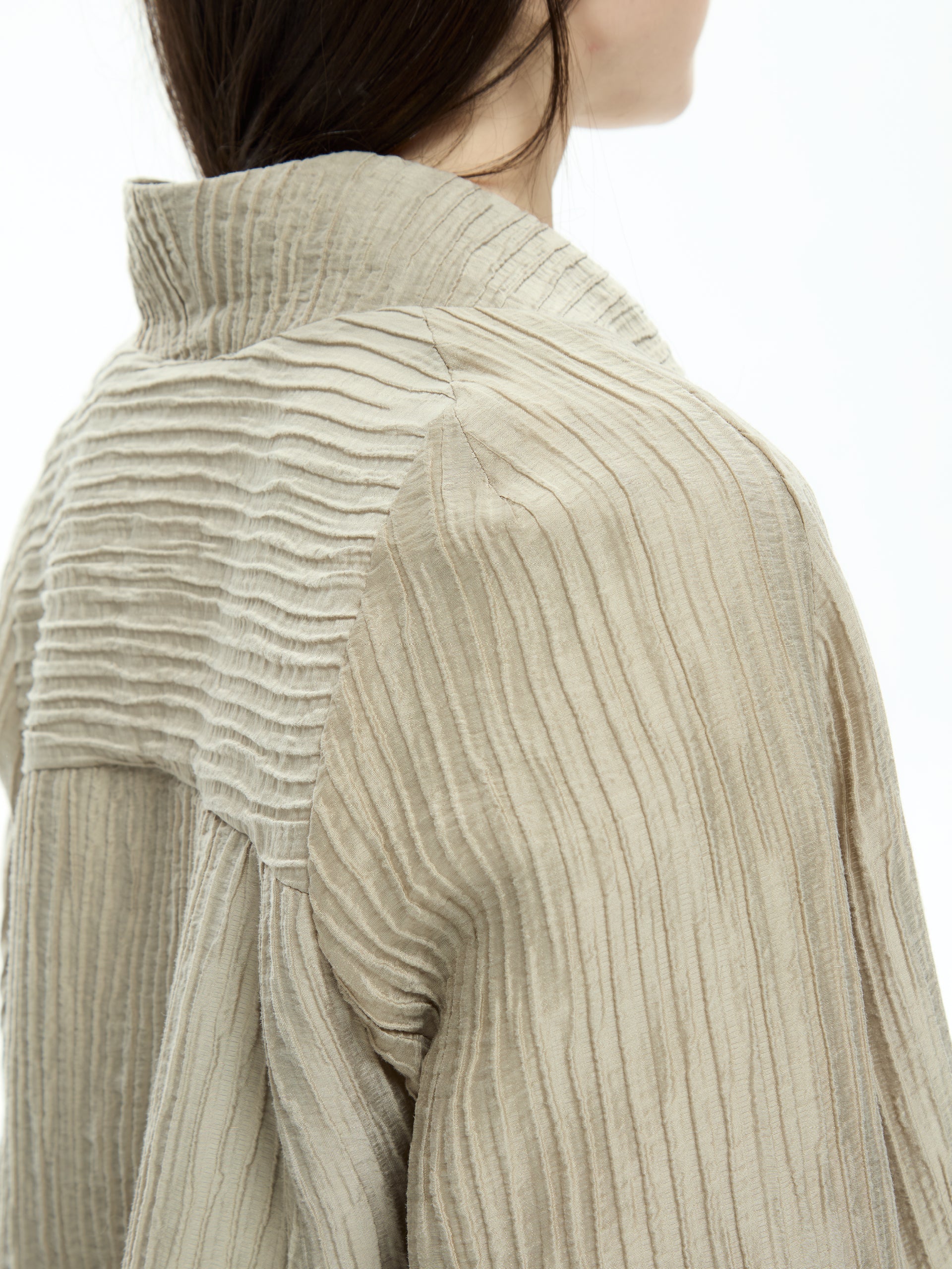 Giacca dal design fluido e sofisticato, caratterizzata da un tessuto plissé che dona movimento e leggerezza alla silhouette. La linea morbida e aperta sul davanti valorizza il layering, mentre il collo ampio aggiunge un tocco contemporaneo ed elegante. Un capo versatile, ideale per completare look ricercati con naturale armonia.