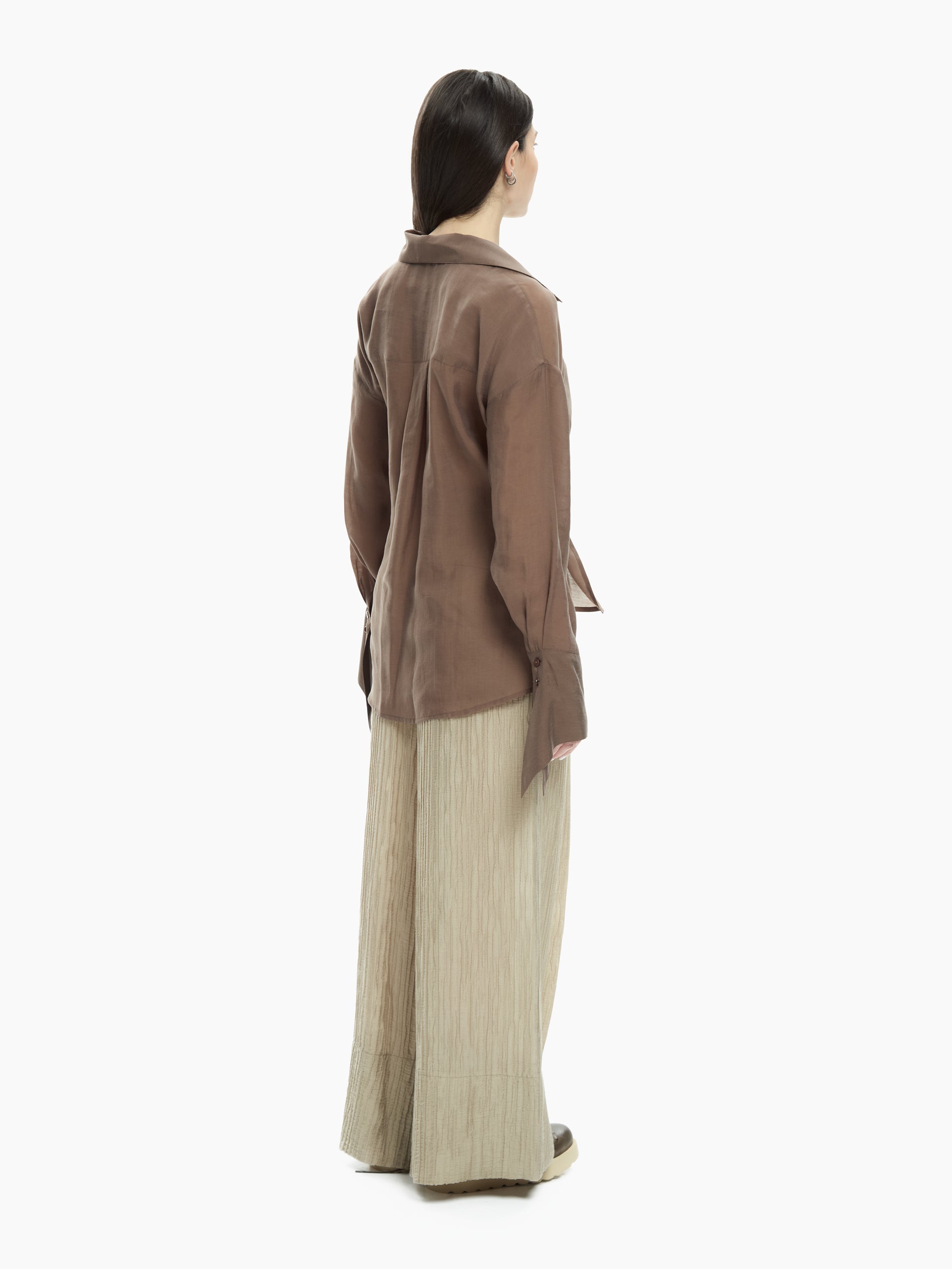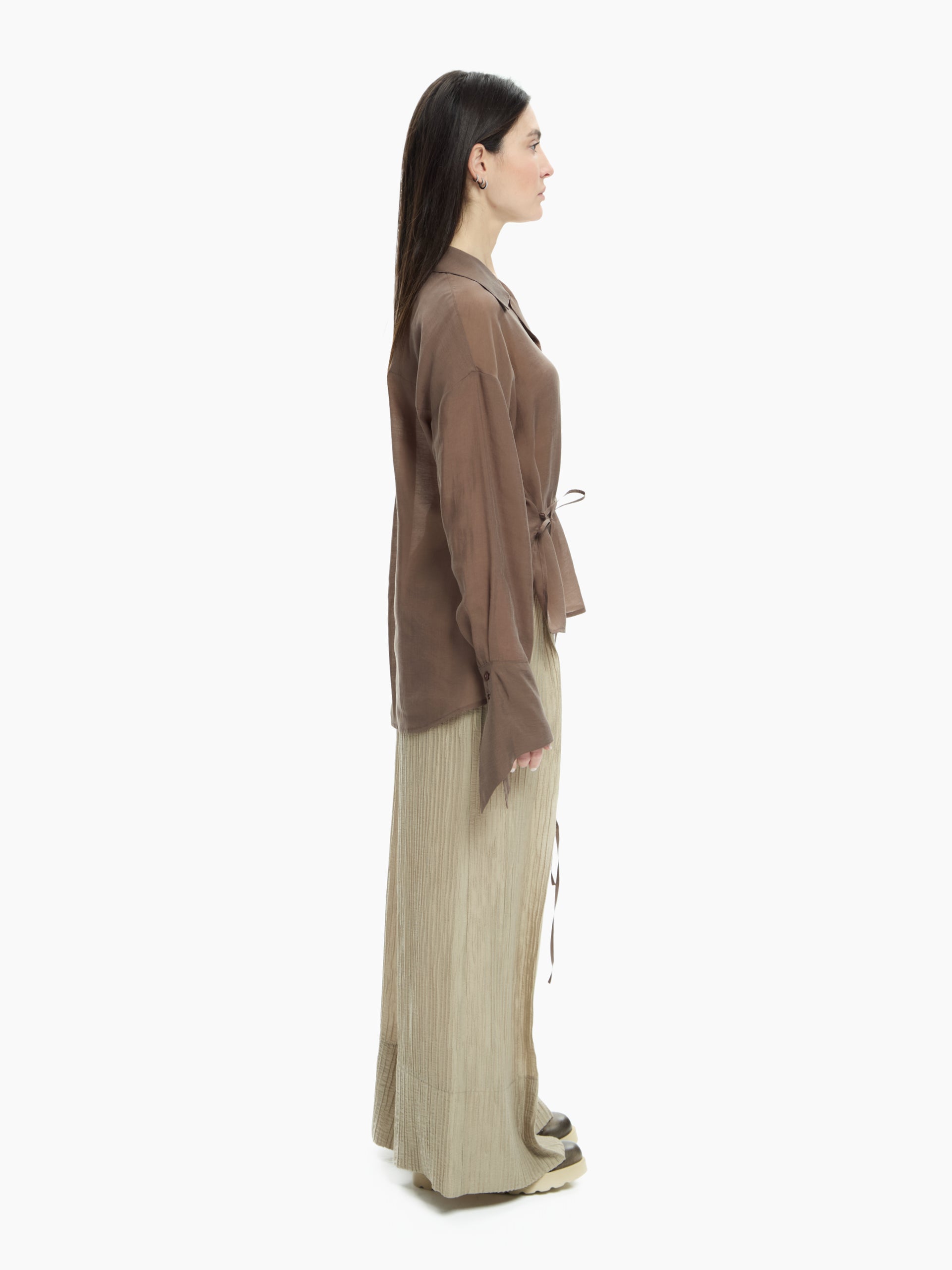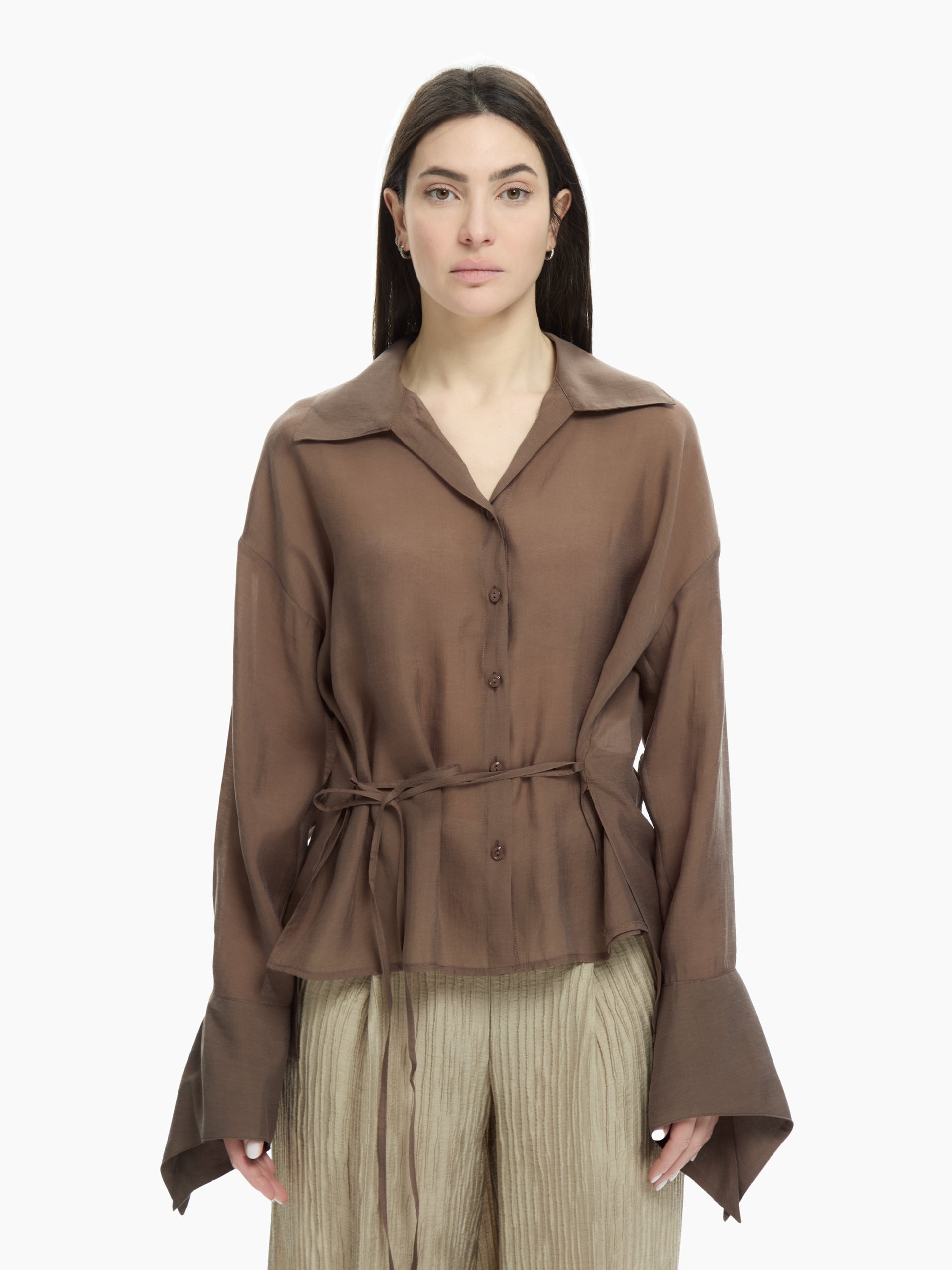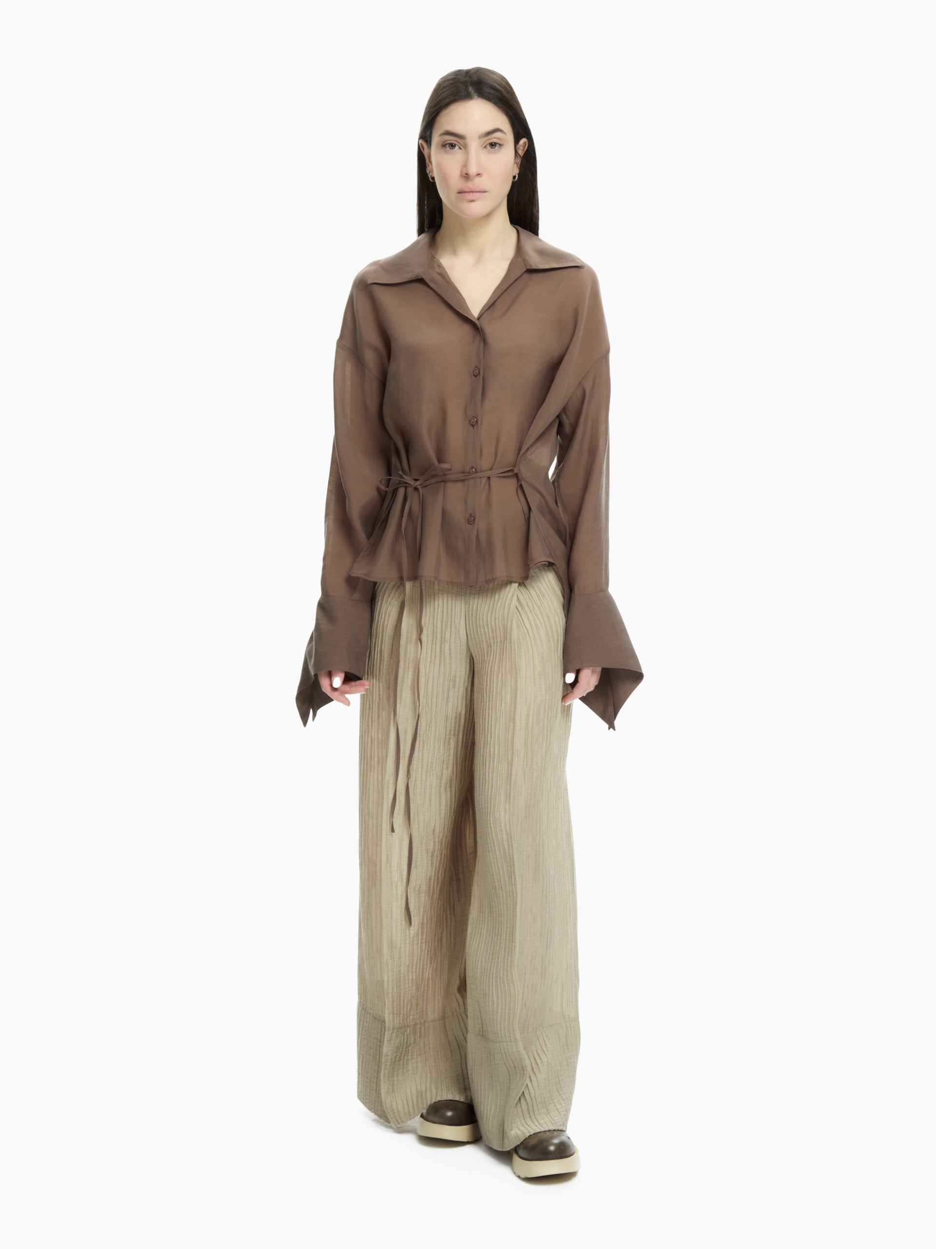 Un’eleganza leggera e raffinata definisce questa camicia dal design fluido, caratterizzata da una linea morbida e da dettagli femminili che ne valorizzano la silhouette. La cintura sottile in vita crea un effetto delicatamente sagomato, mantenendo un’allure contemporanea.