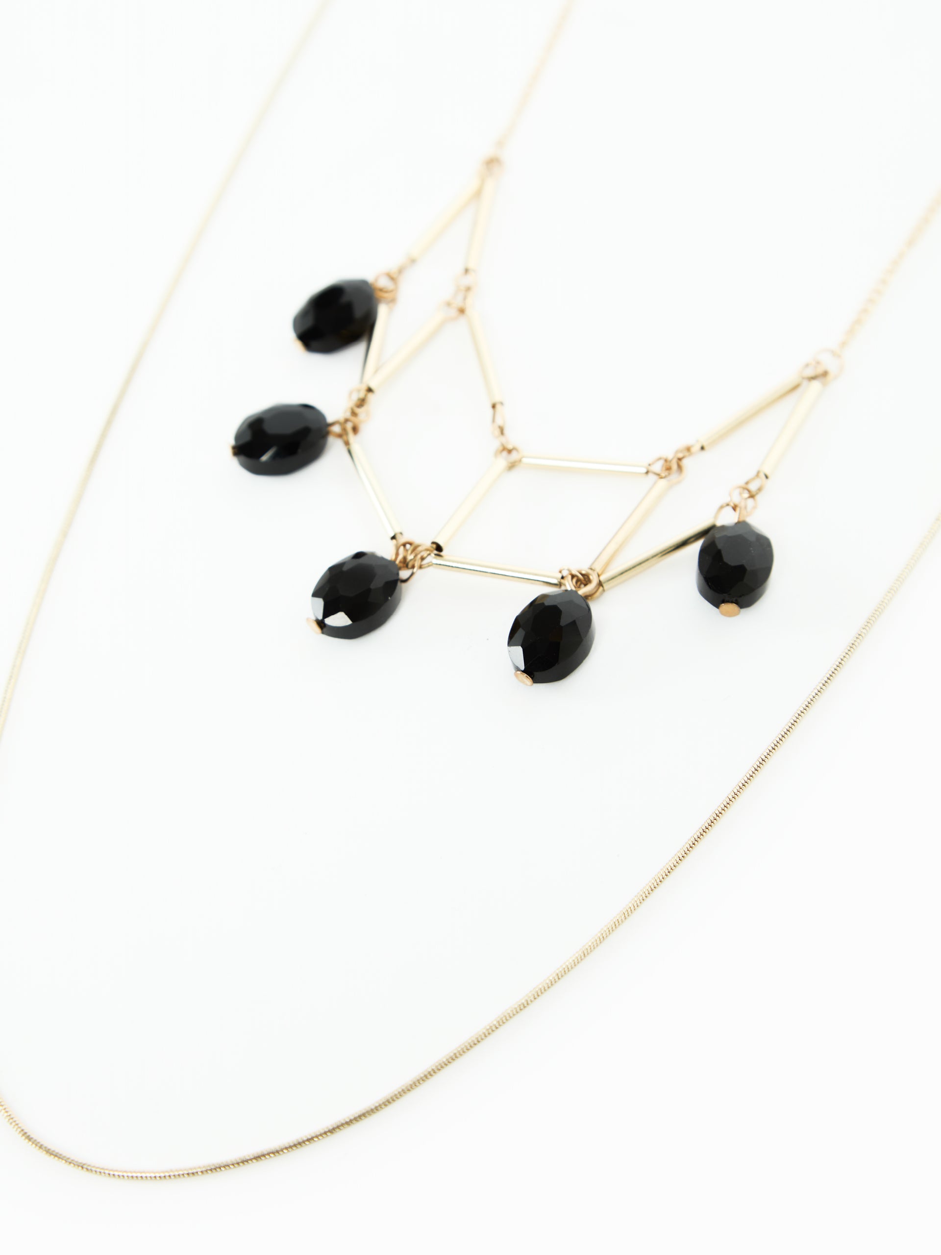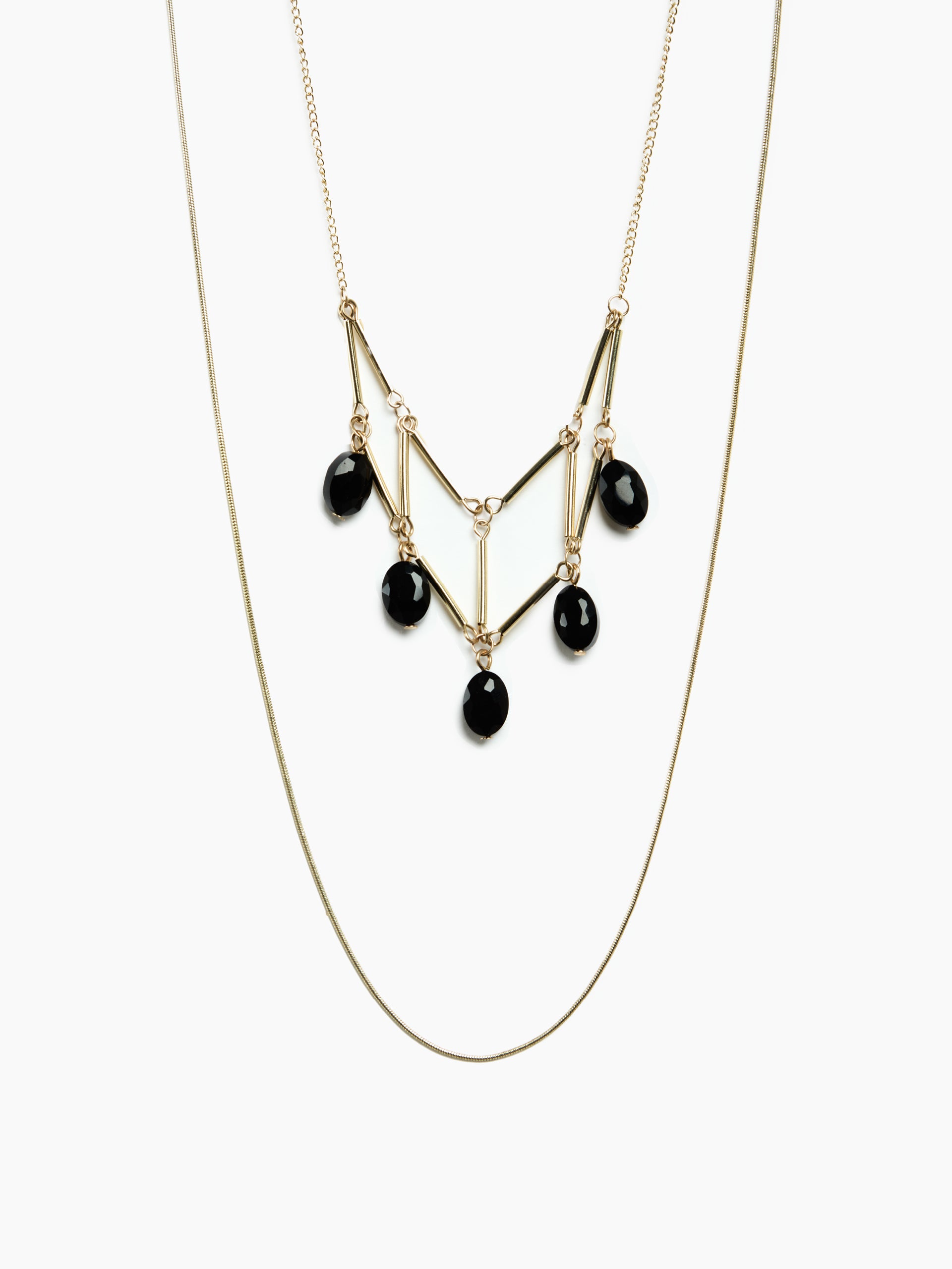 Long two-strand necklace made with a thin chain and a central element with a geometric design. The metal tubes and pendants add light and originality.