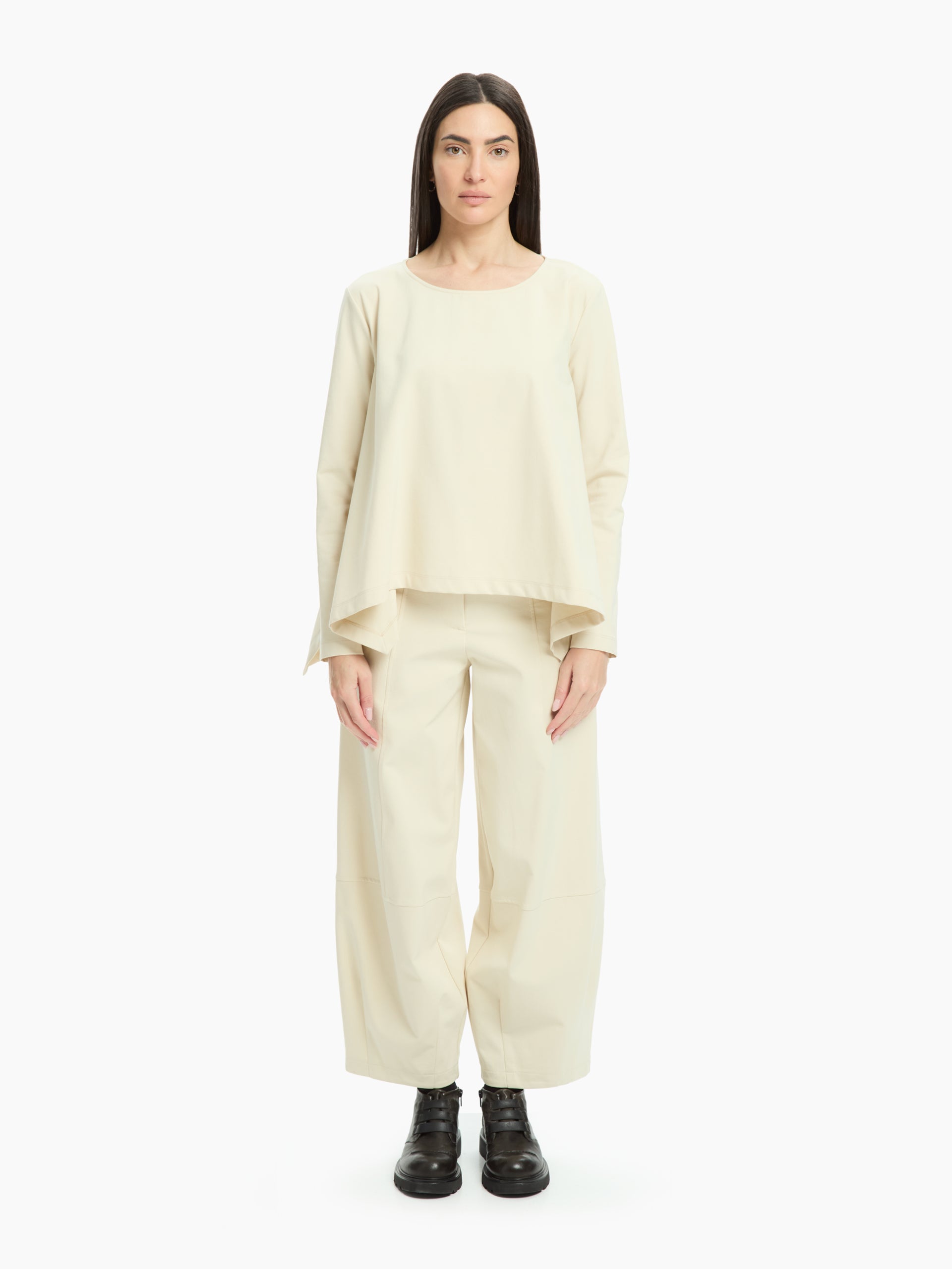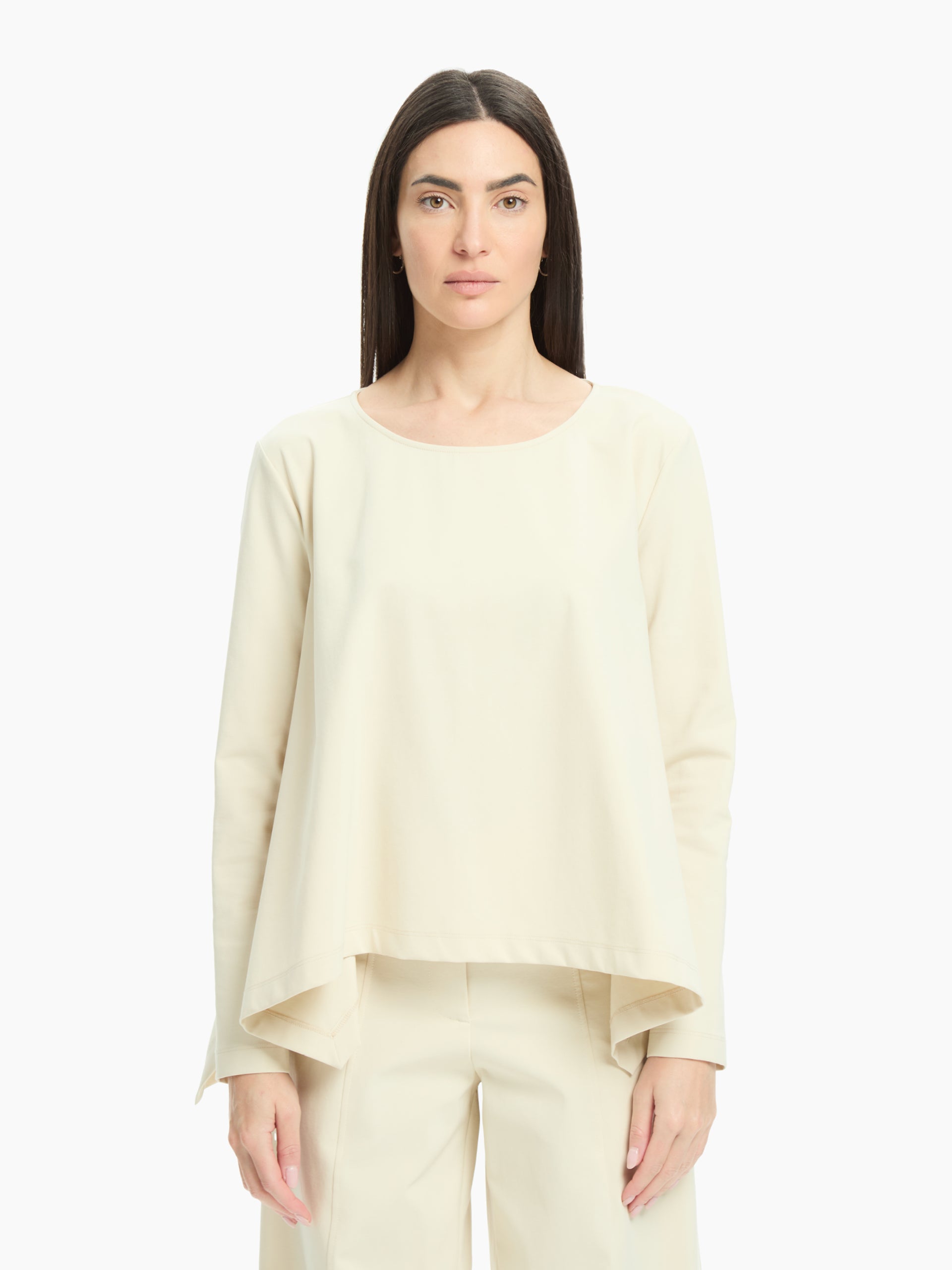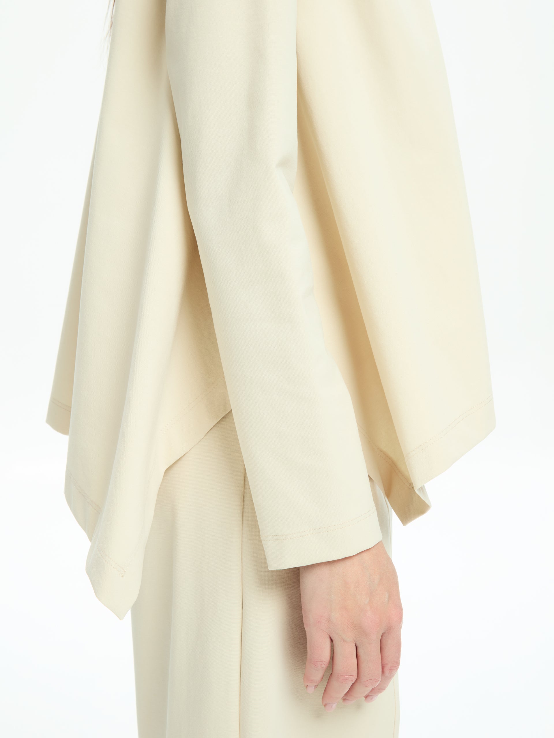 Flared cotton jersey knit. The wide neckline and long sleeves combine with an asymmetrical hem to give movement to the silhouette. An essential piece with soft proportions, perfect to wear on its own or as a base for more structured layers.