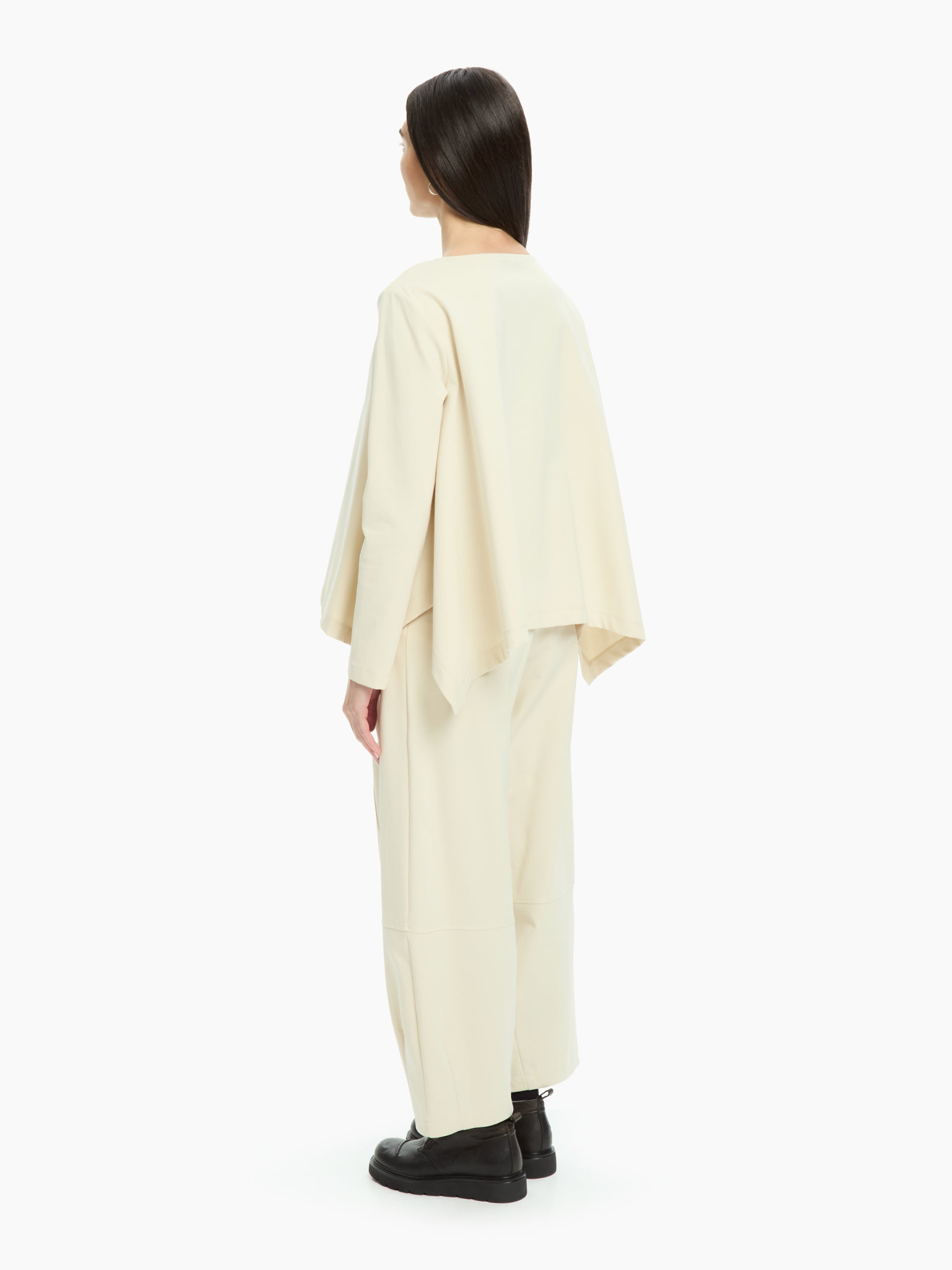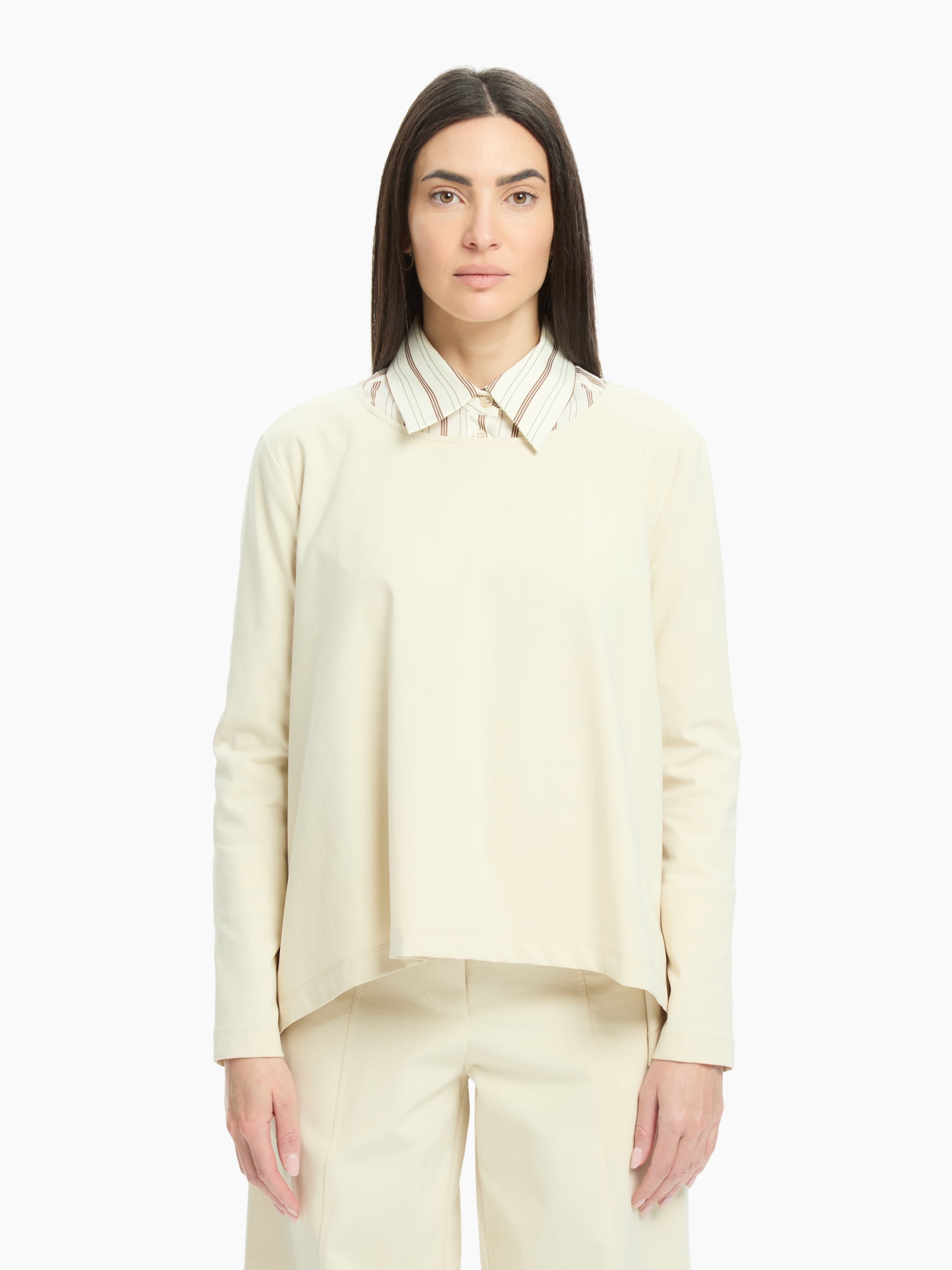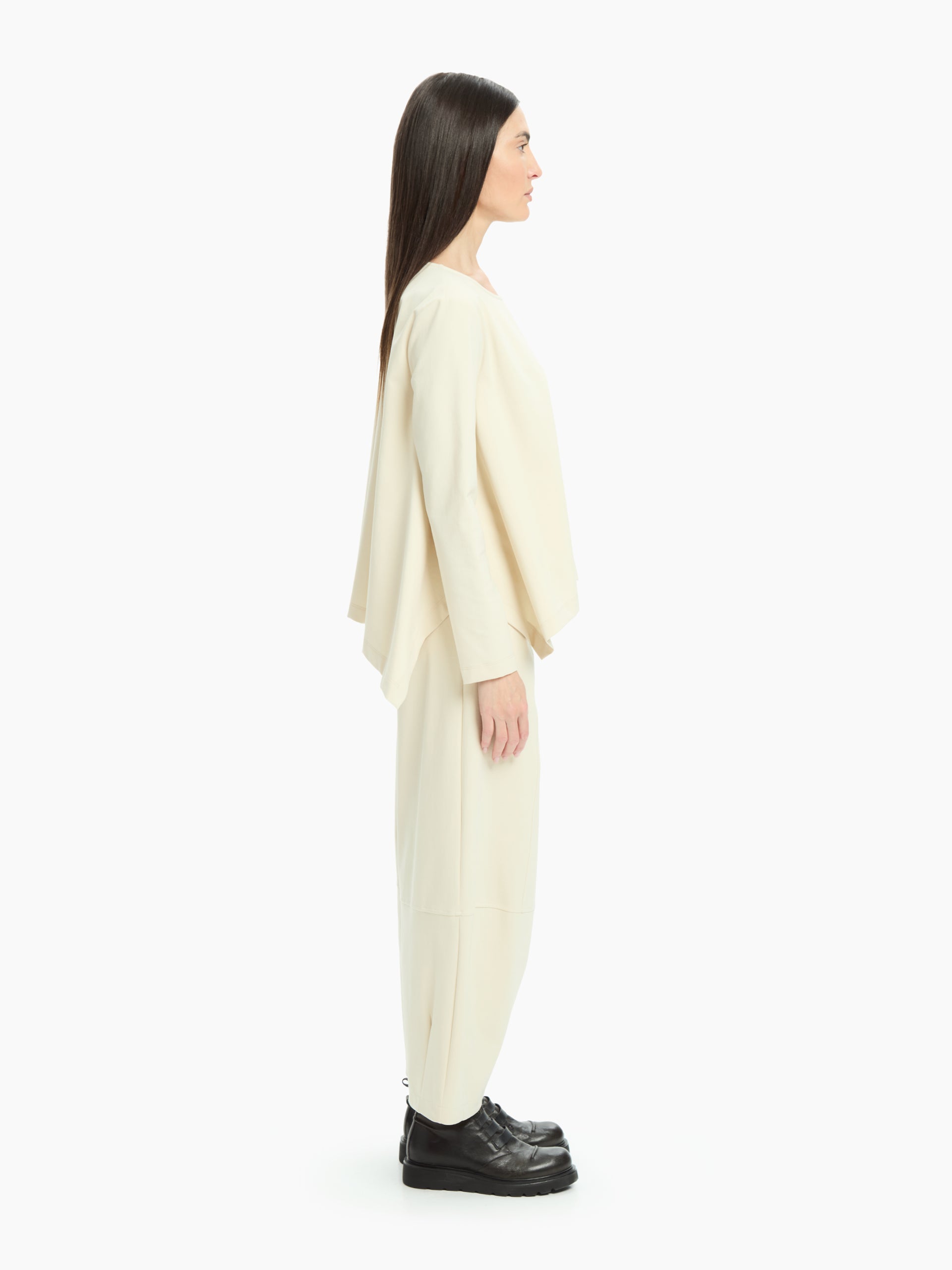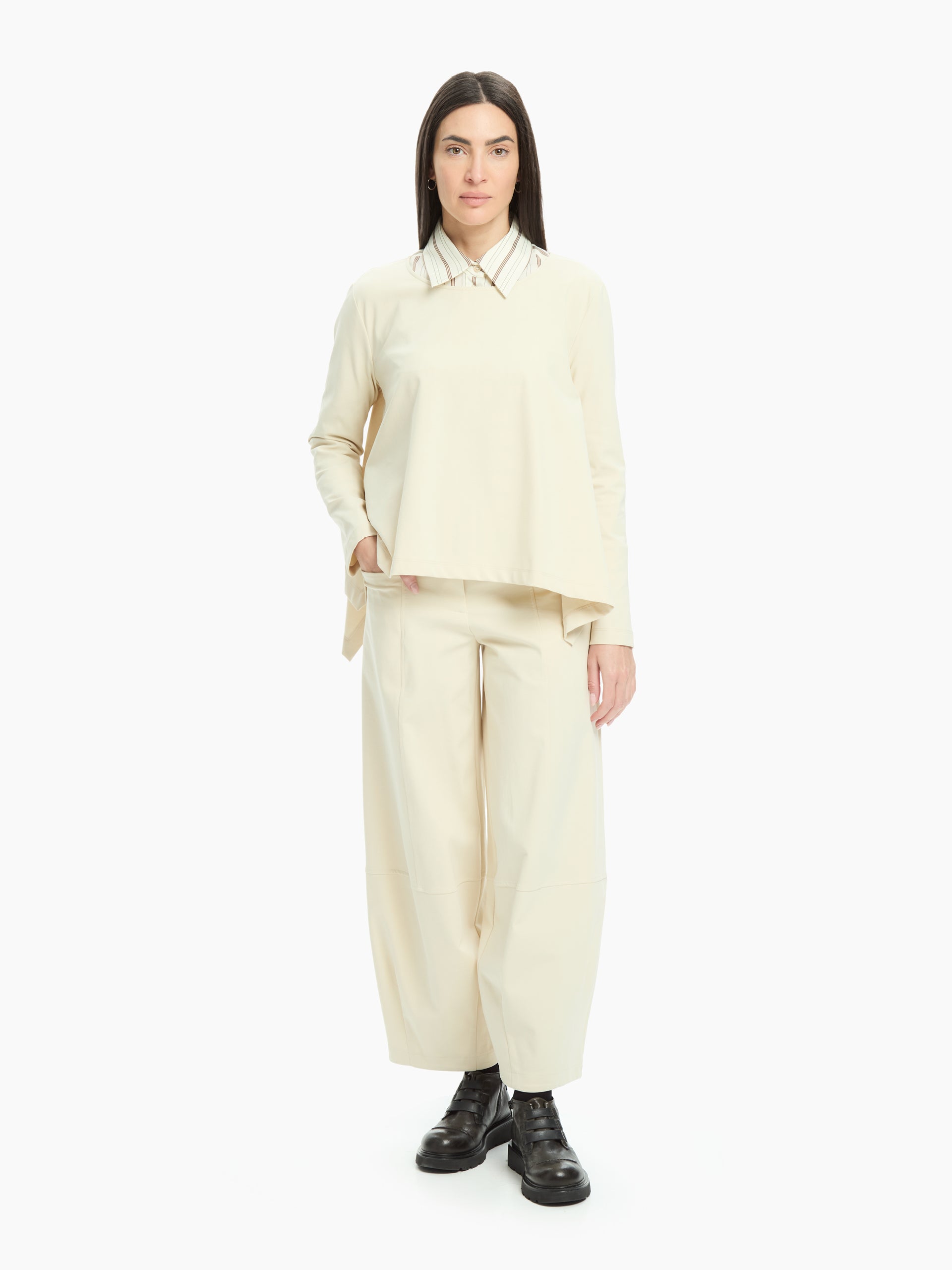 Flared cotton jersey knit. The wide neckline and long sleeves combine with an asymmetrical hem to give movement to the silhouette. An essential piece with soft proportions, perfect to wear on its own or as a base for more structured layers.