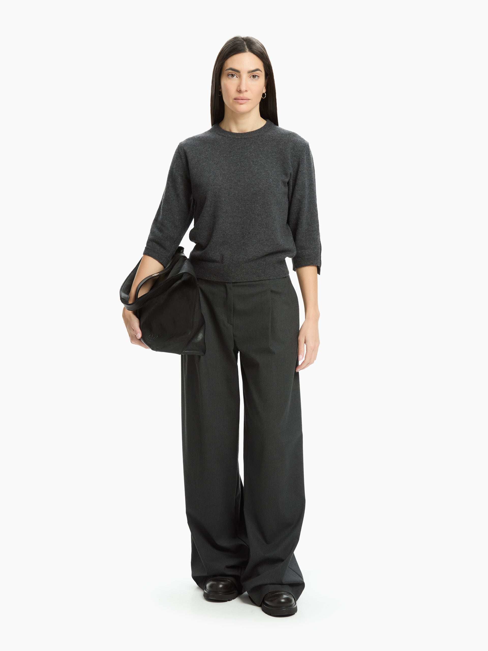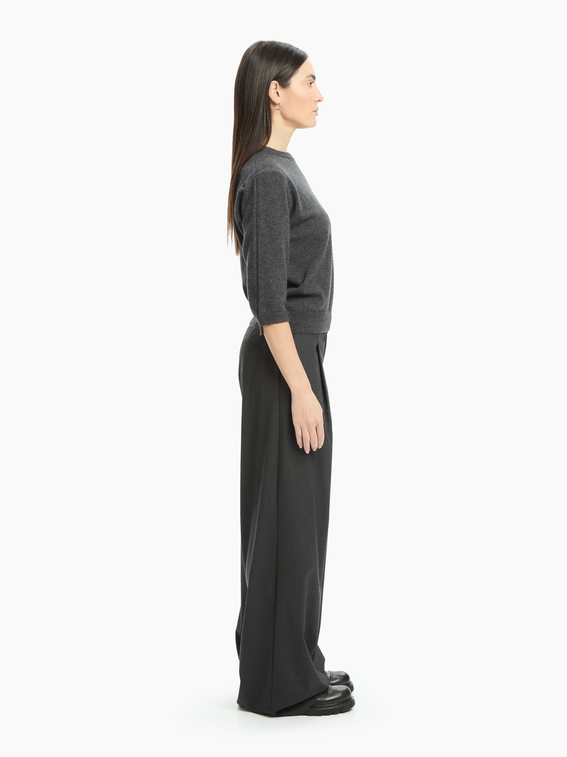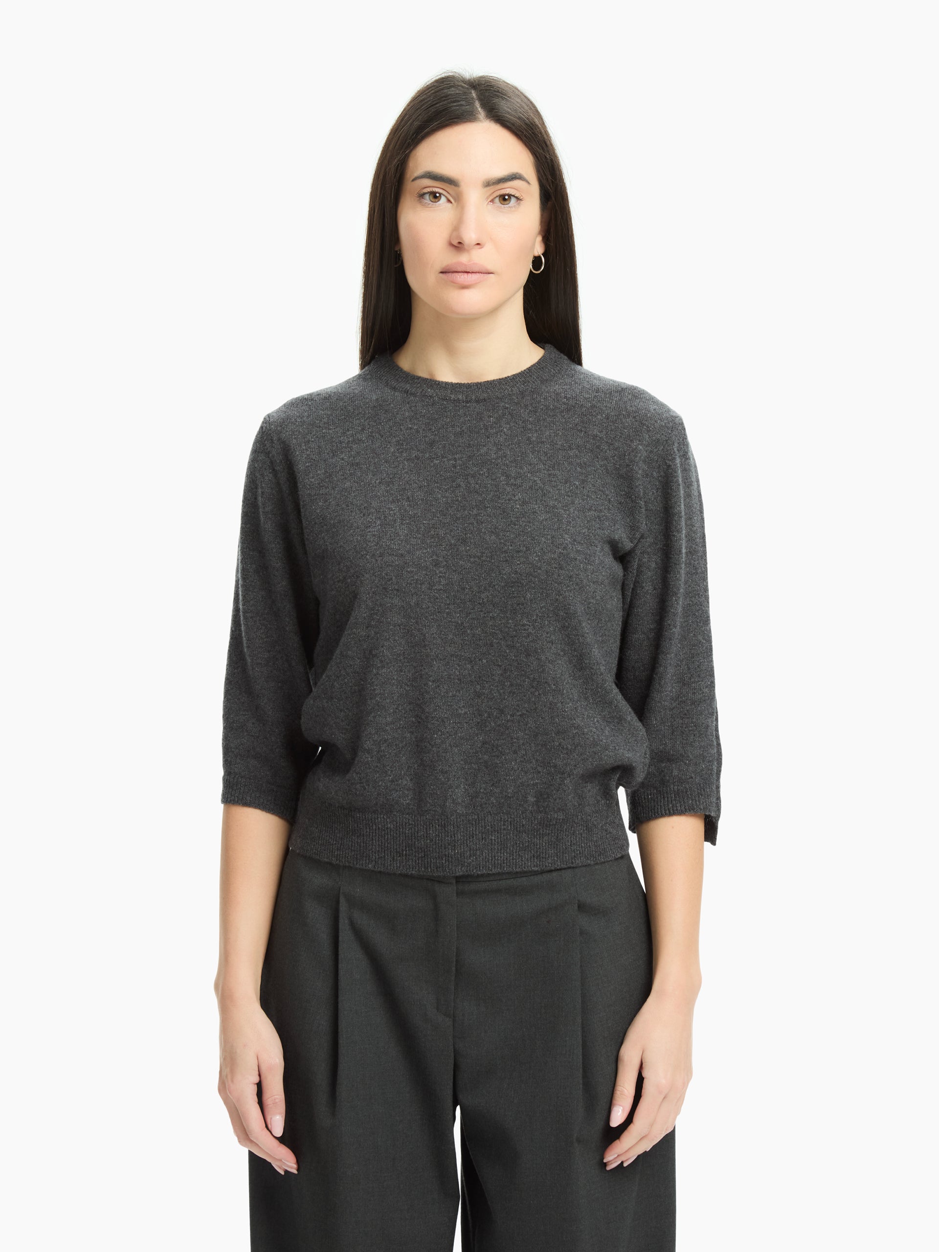 A simple yet sophisticated jumper, made from fine yarn for softness and comfort. The three-quarter sleeves and clean lines give it a relaxed elegance, ideal for creating contemporary and versatile looks. The ribbed hem, collar and cuffs define the design with understated precision.