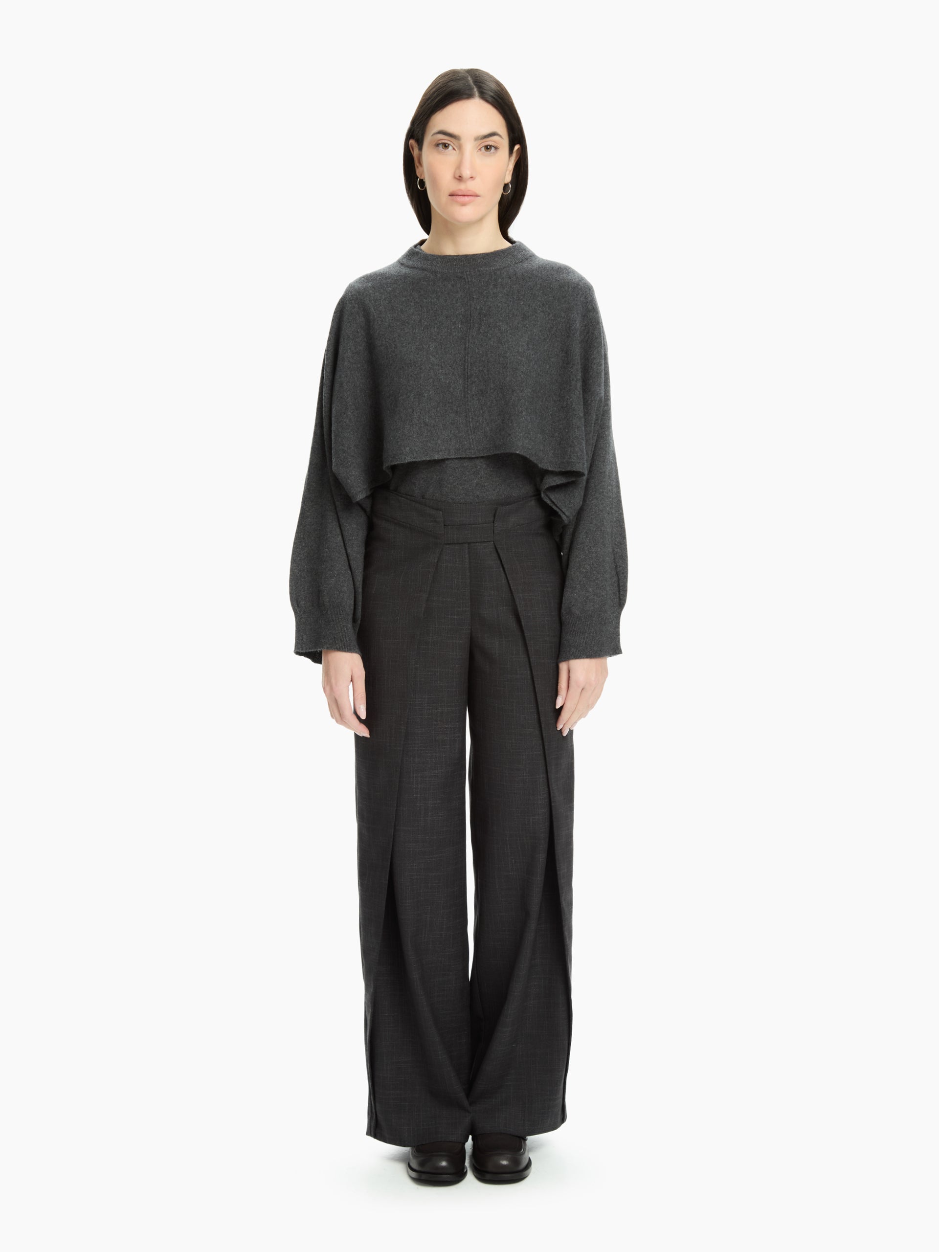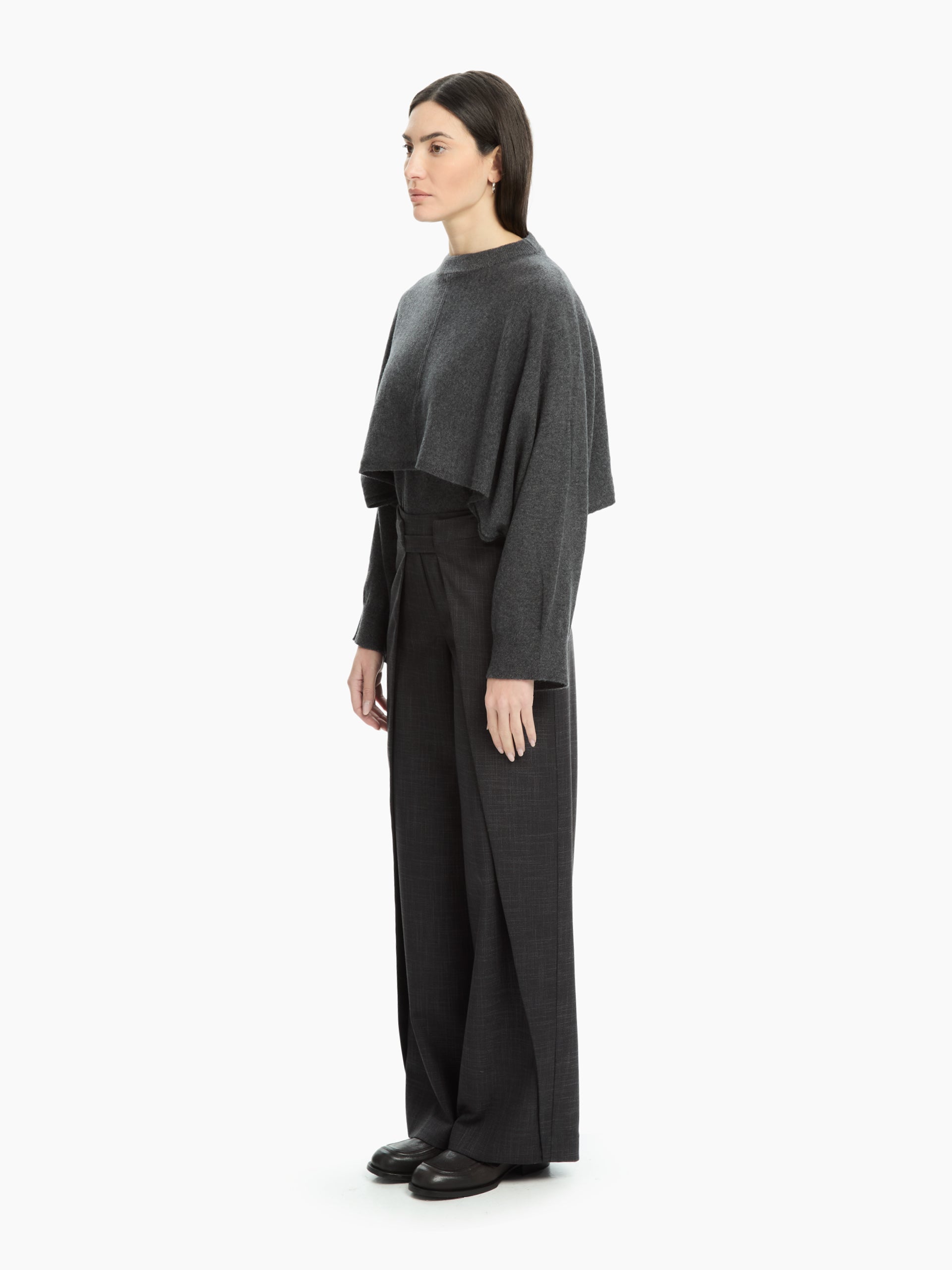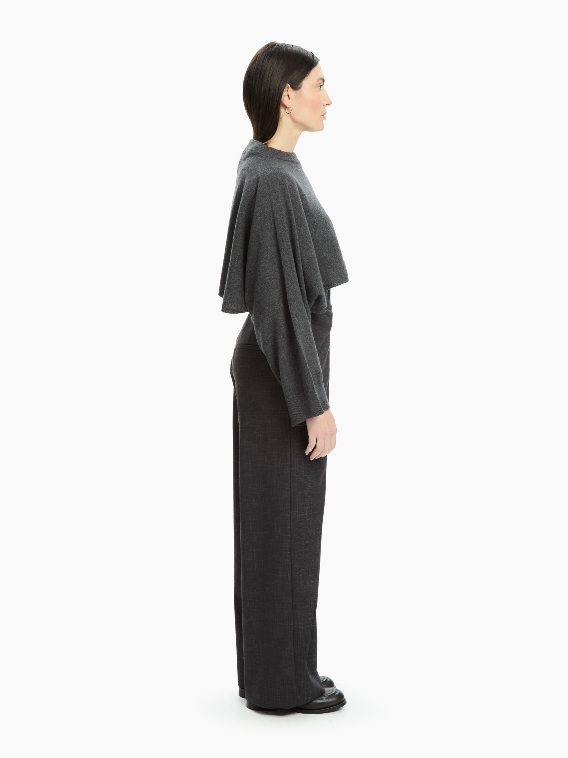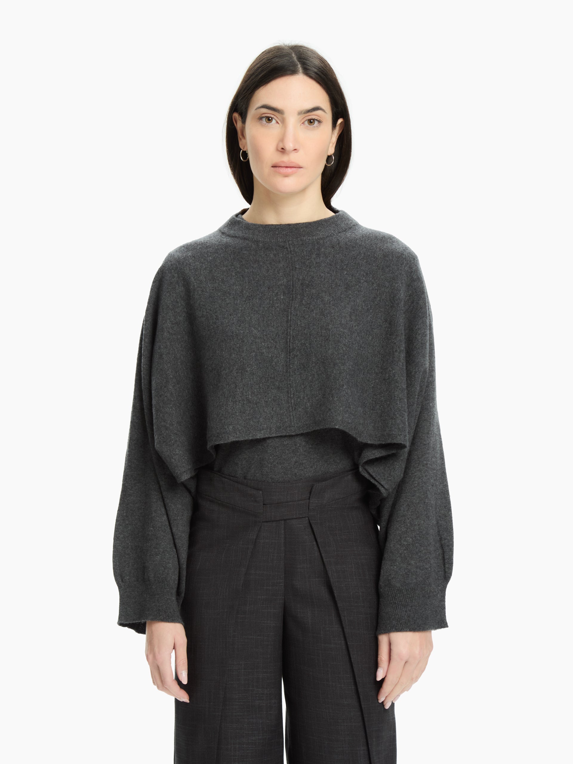 - Cape structure with sleeves, featuring a wide upper panel that falls naturally over the bust.