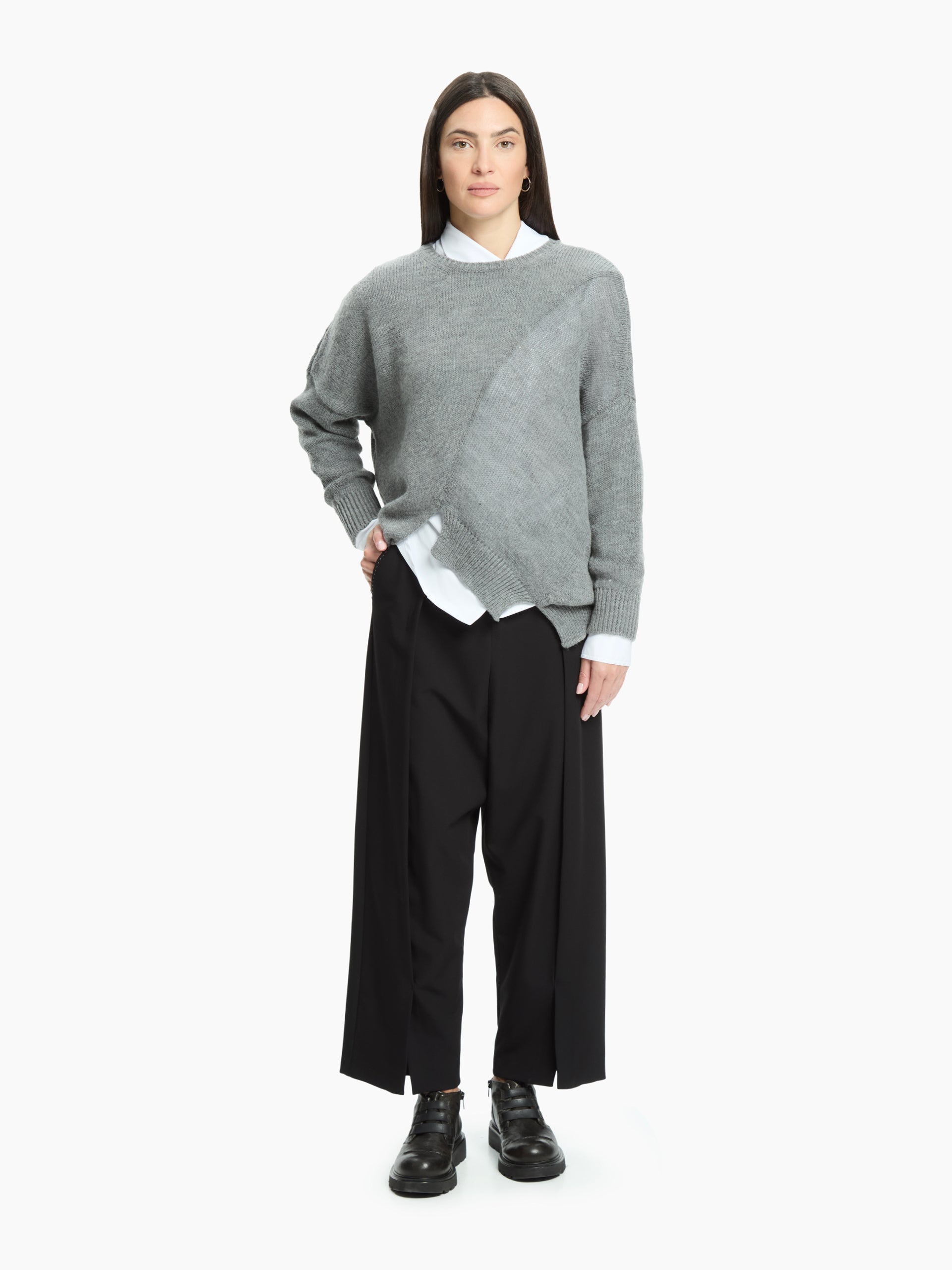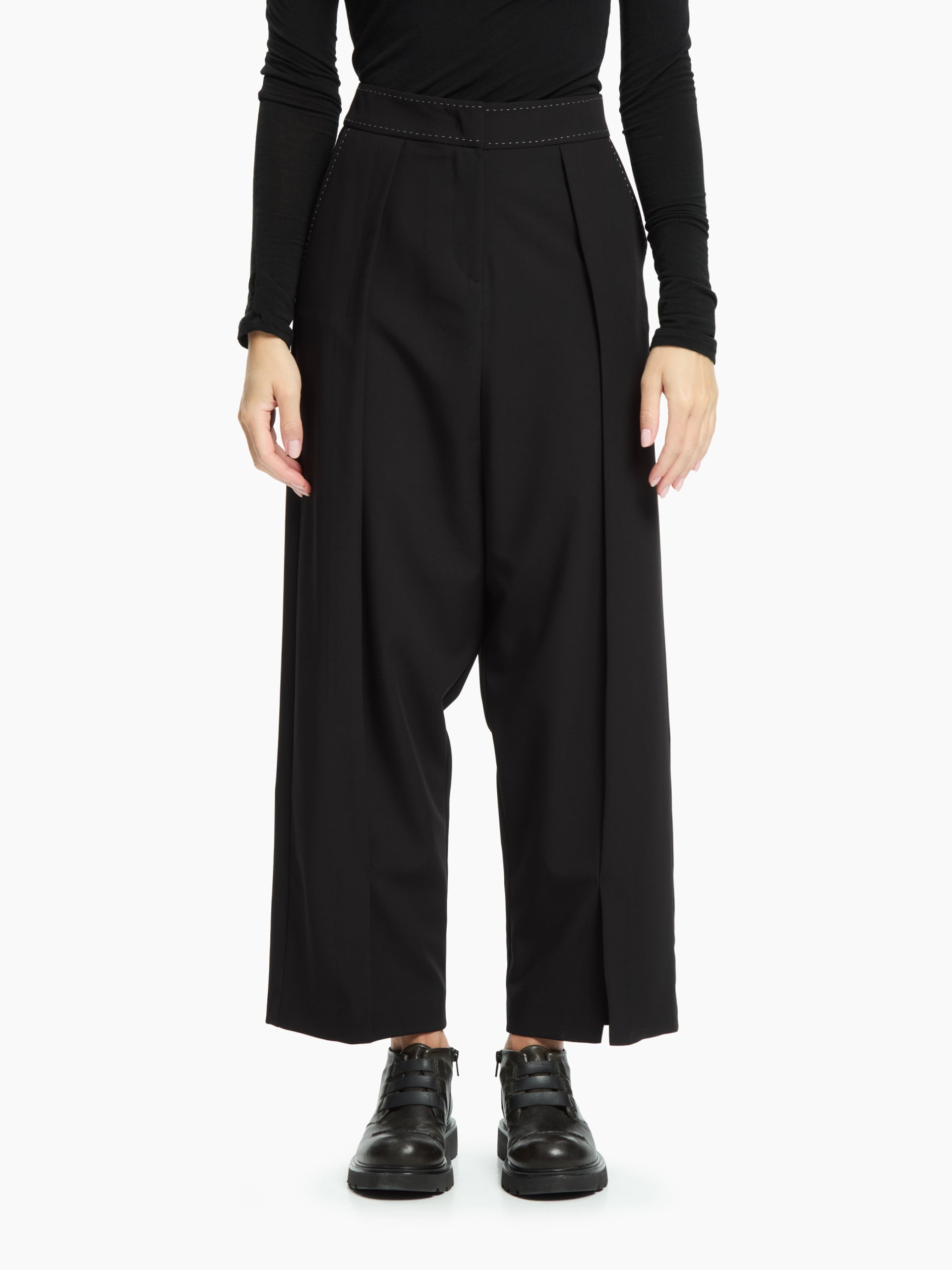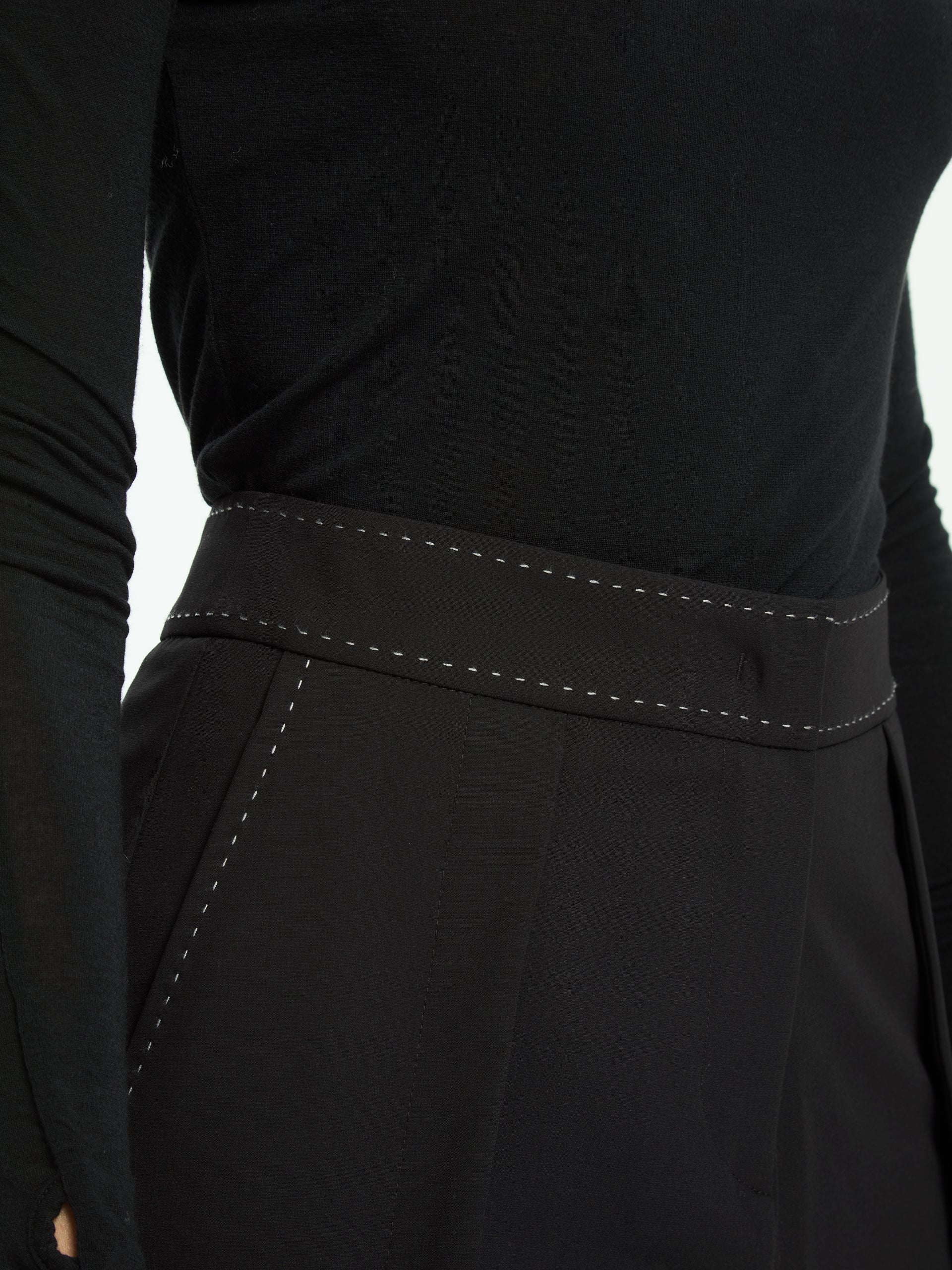 The high waist emphasises the figure, while the wide leg and soft cut give movement and freedom. Contrast stitching adds a discreet but distinctive graphic detail, perfectly in line with the urban and sophisticated aesthetic of the garment.