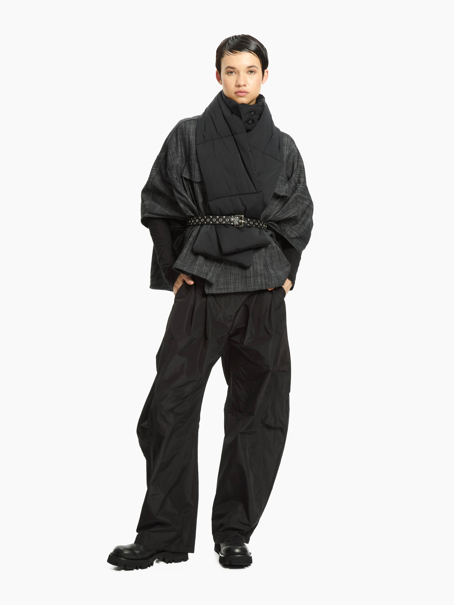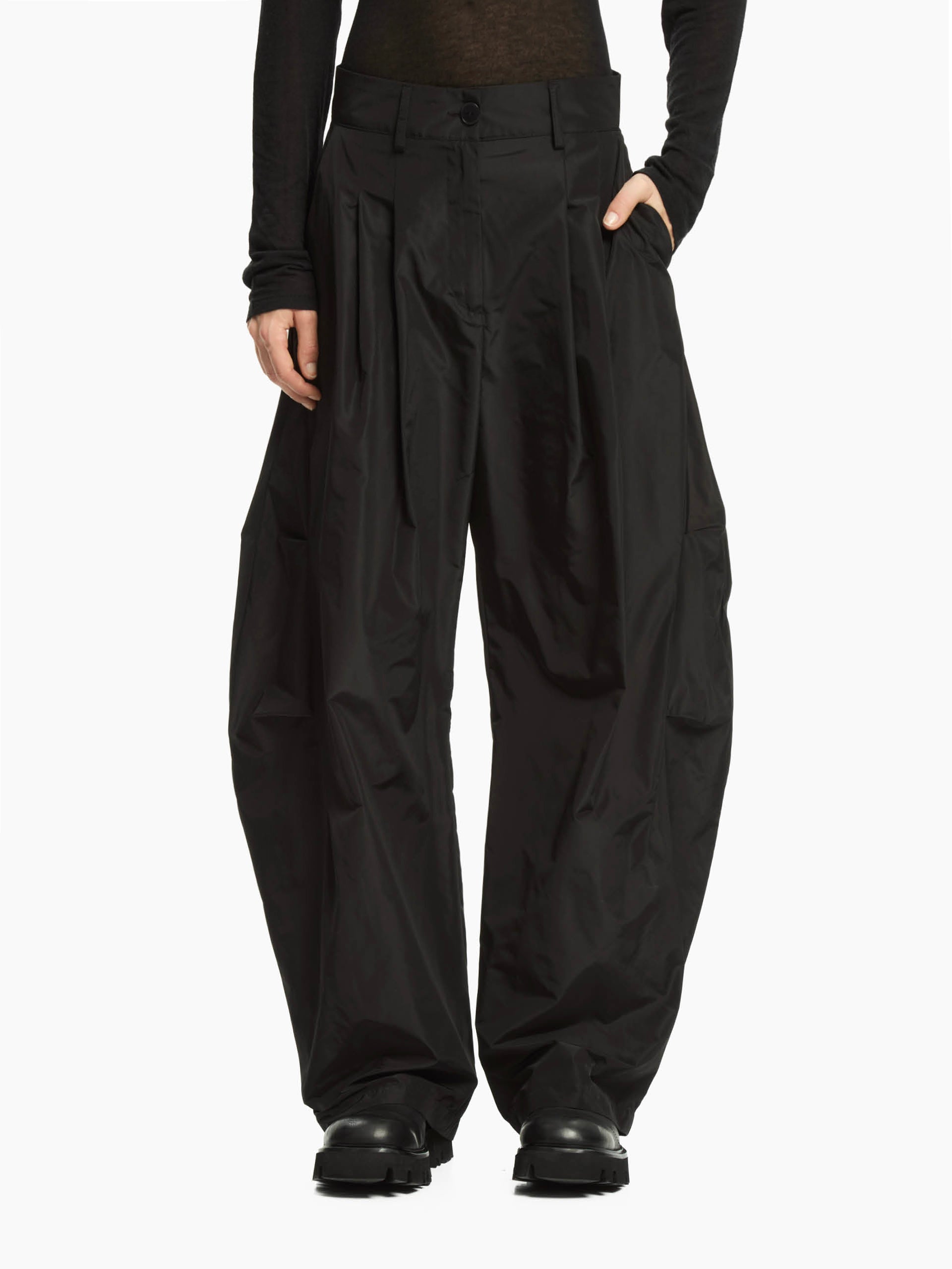 The Marzo trousers are a bold piece that combines volume and lightness. Made from technical fabric with a fluid effect, they feature soft pleats that add movement and a loose, comfortable fit. The regular waist with structured belt and front button recalls traditional tailoring, while the wide, flowing leg adds a contemporary touch.