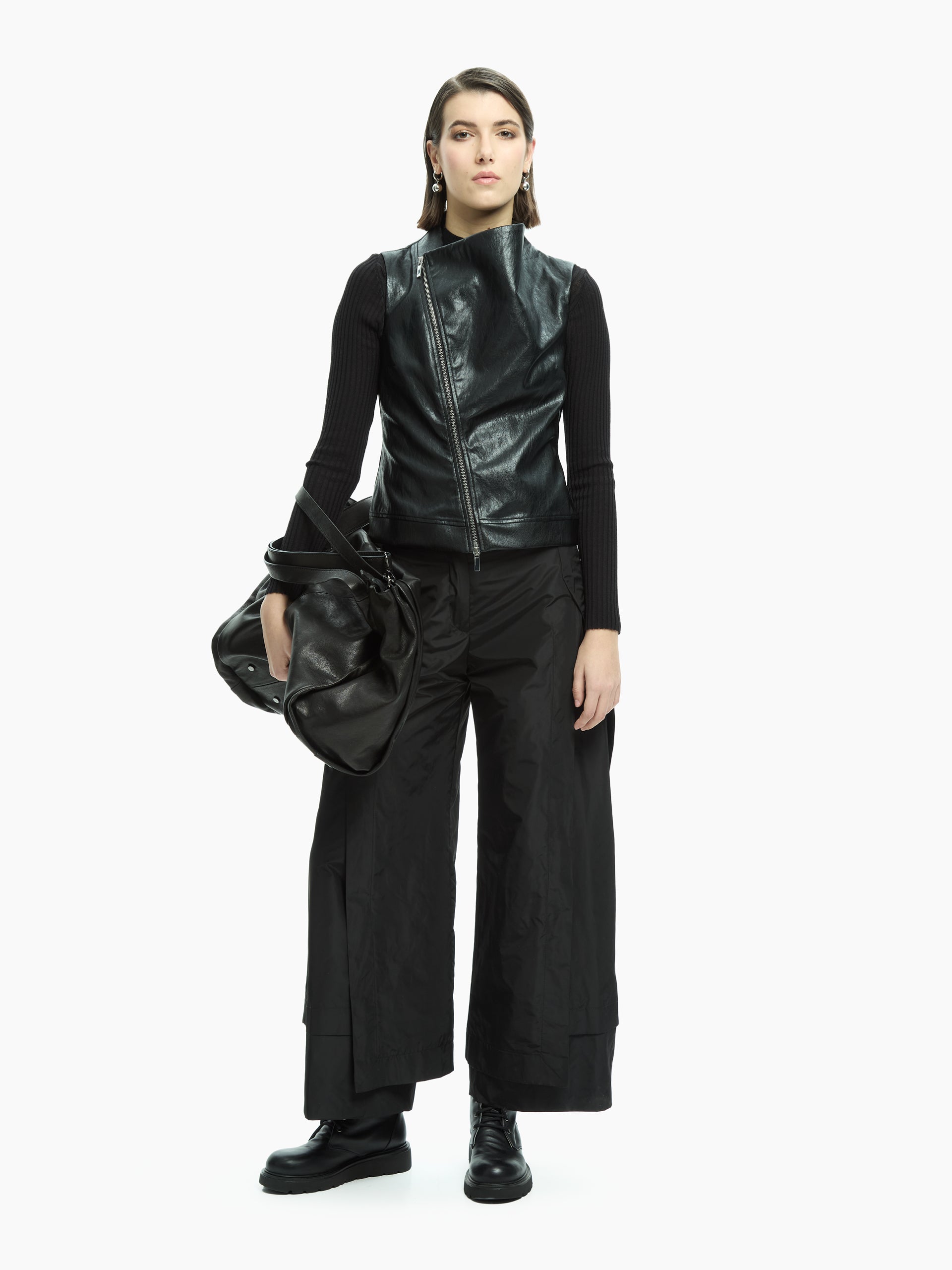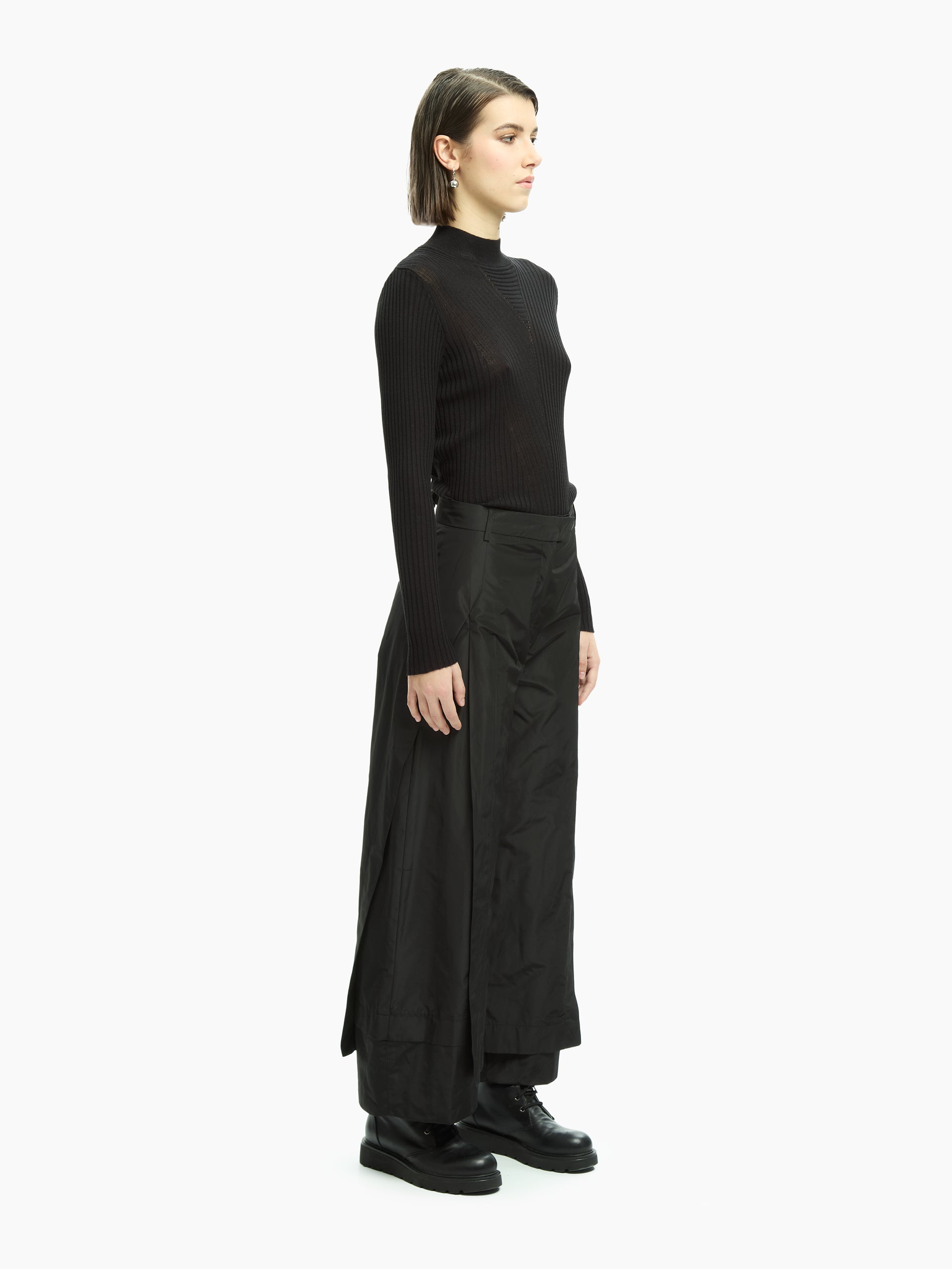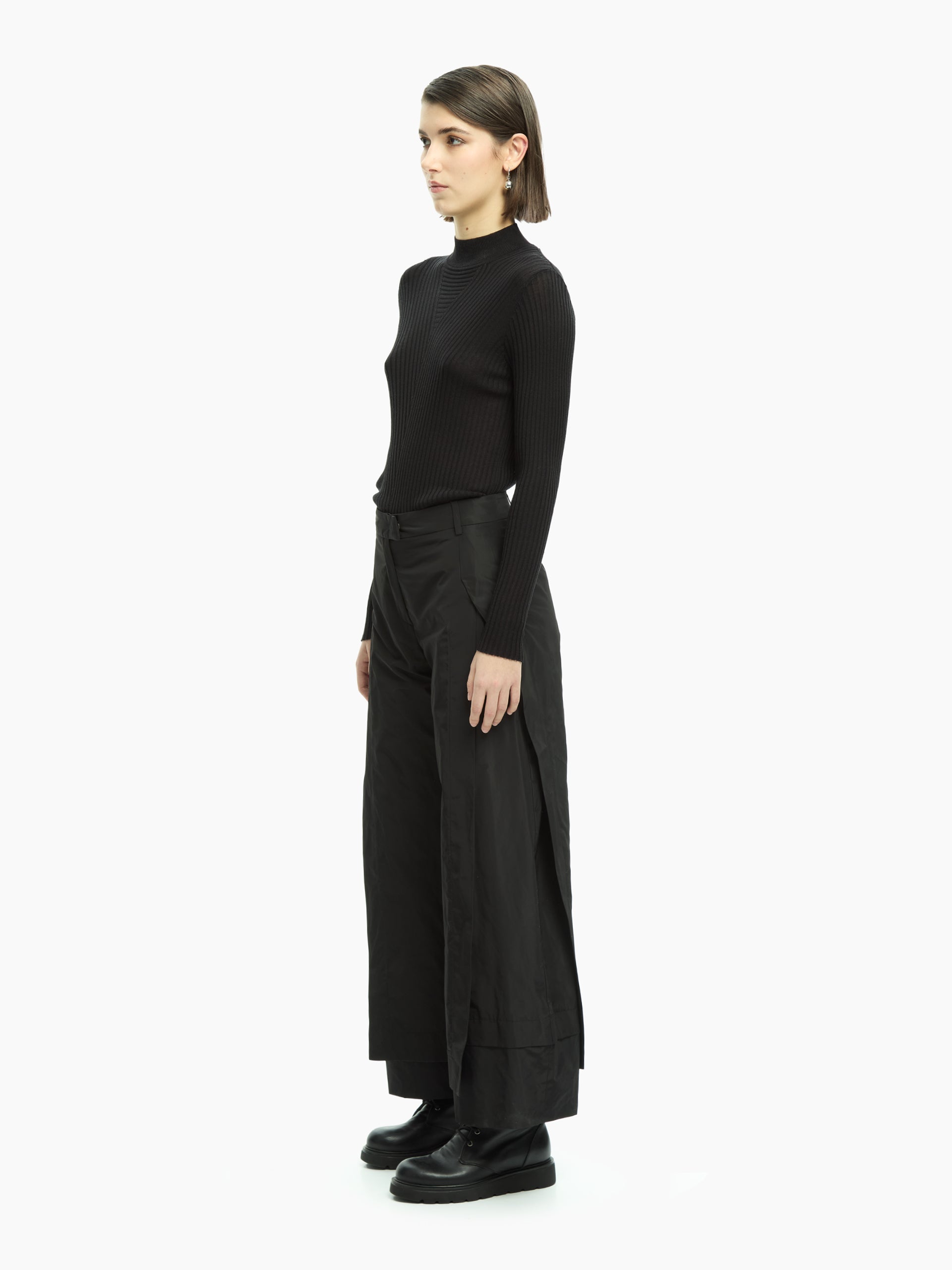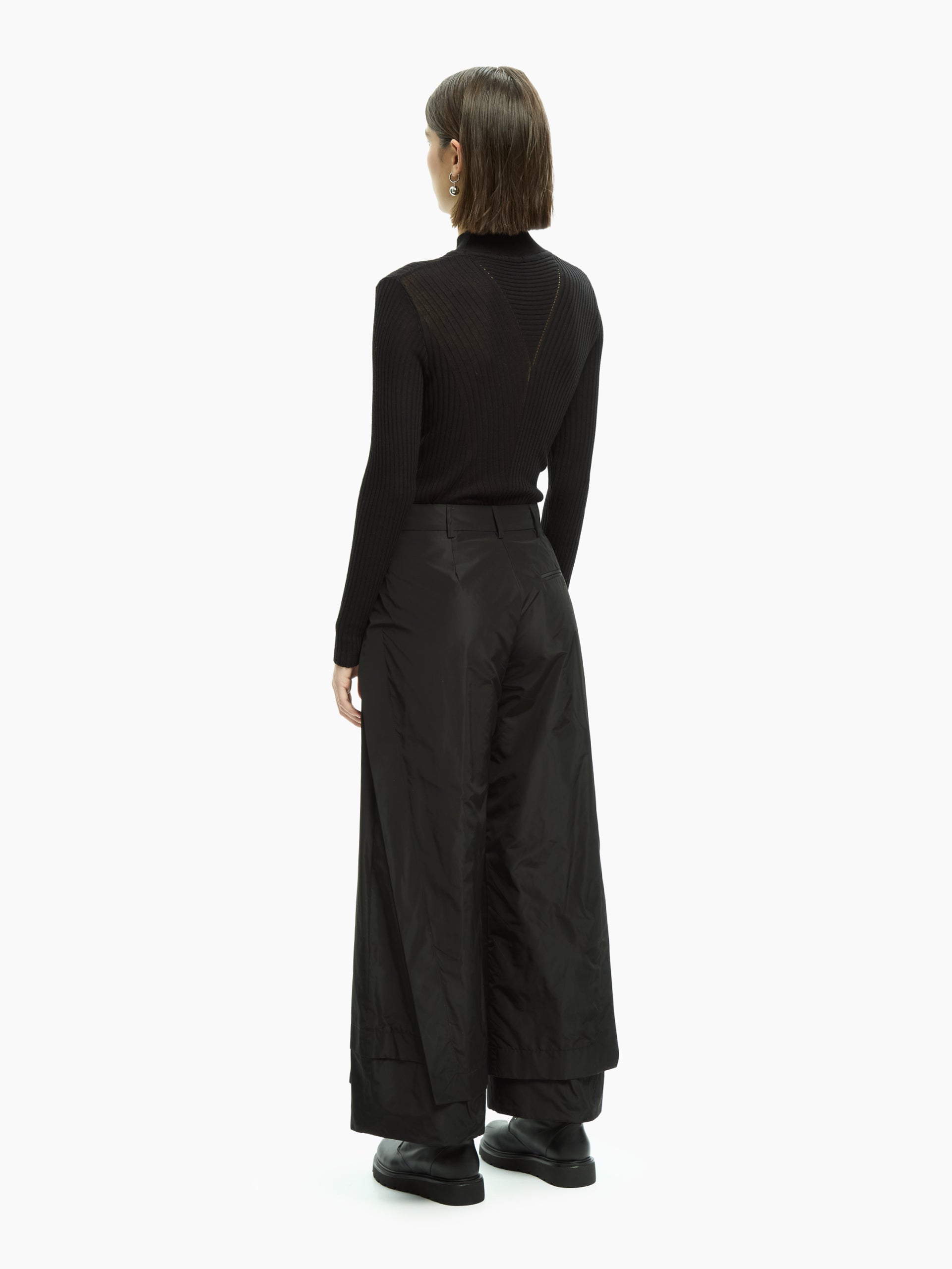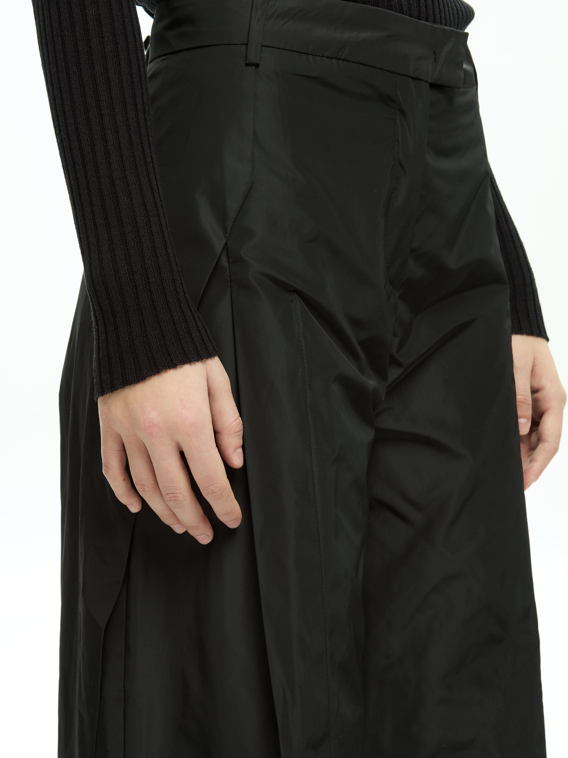 - Wide-leg silhouette with overlapping panels that create movement and volume.
