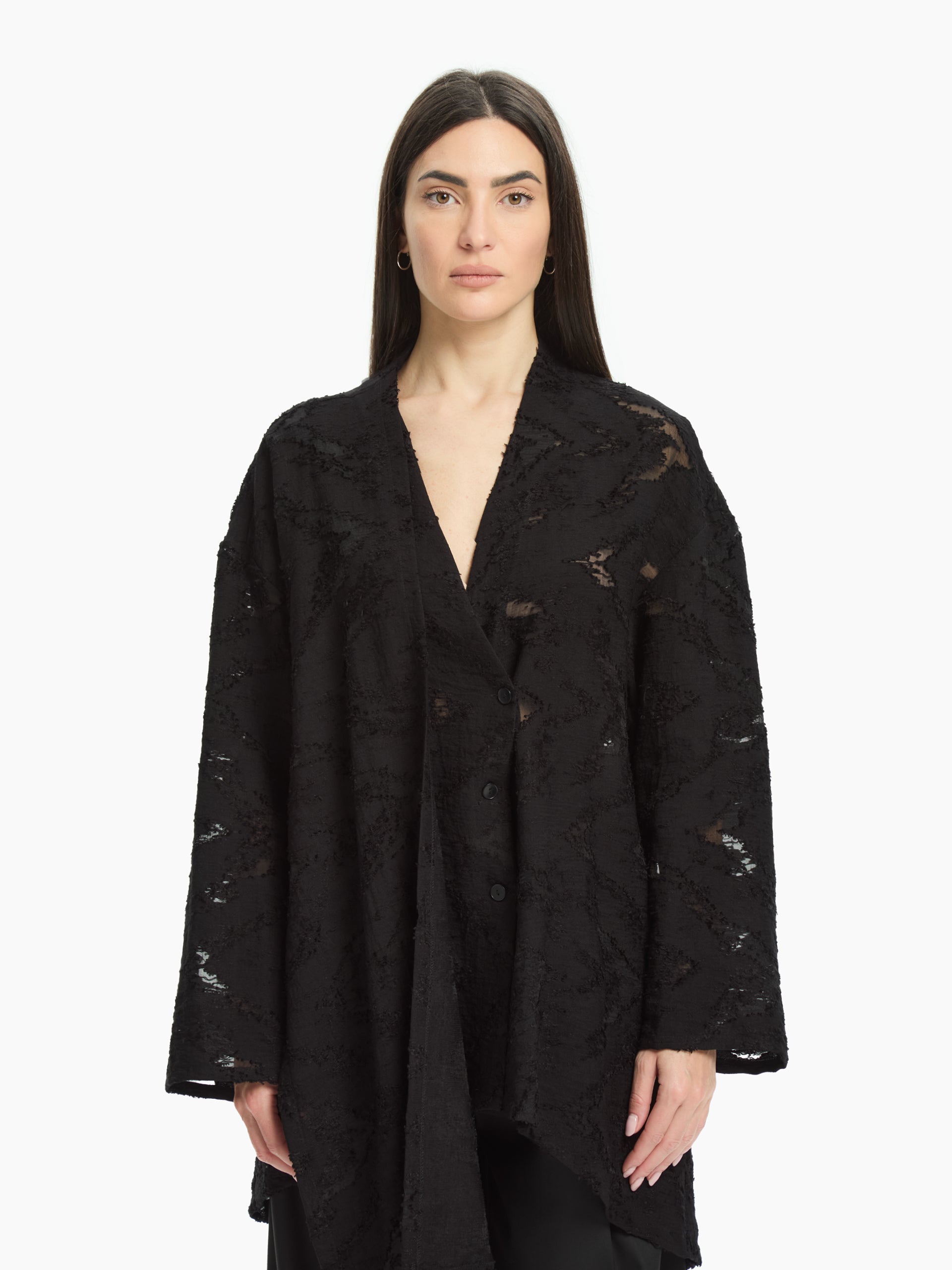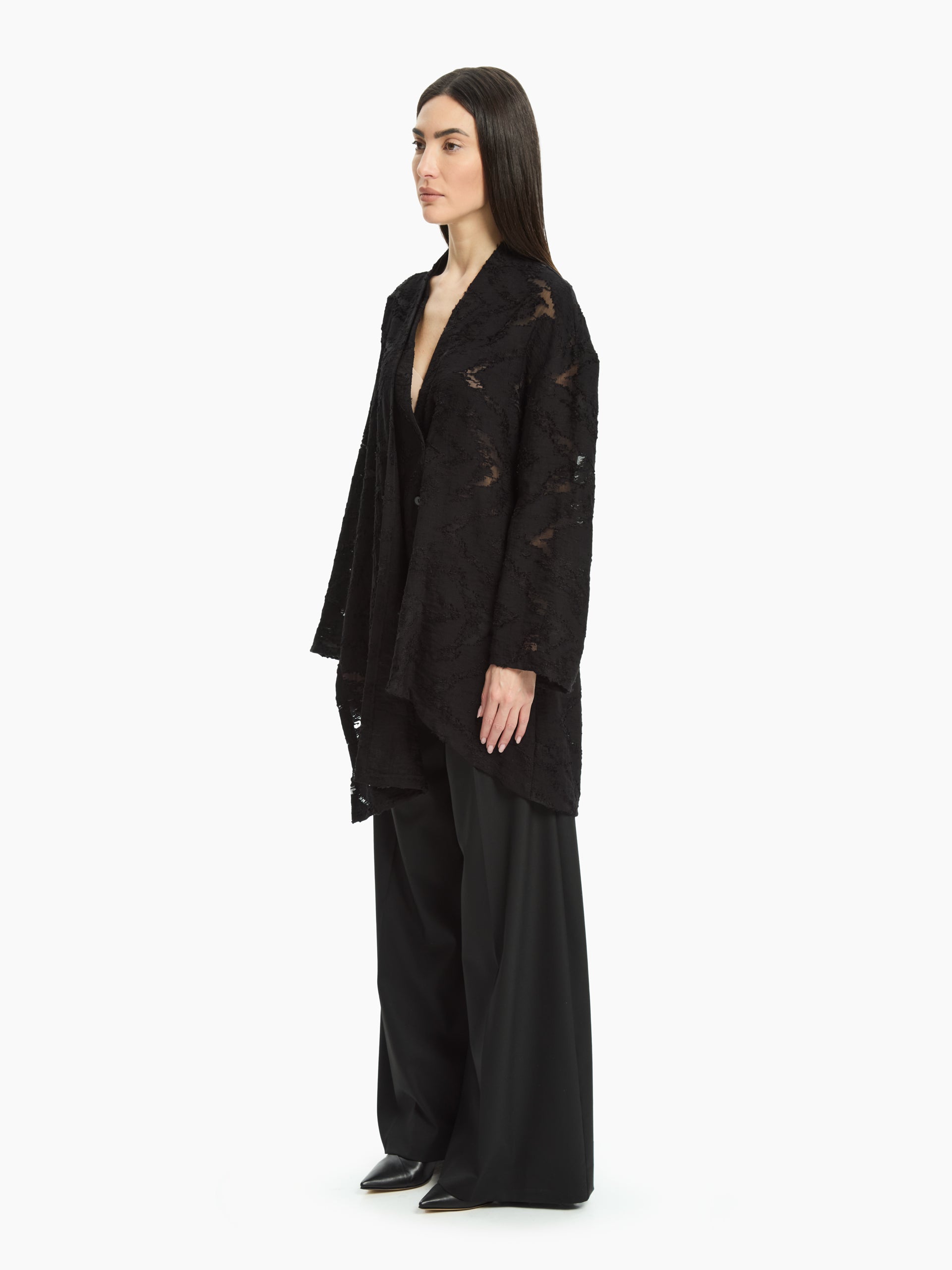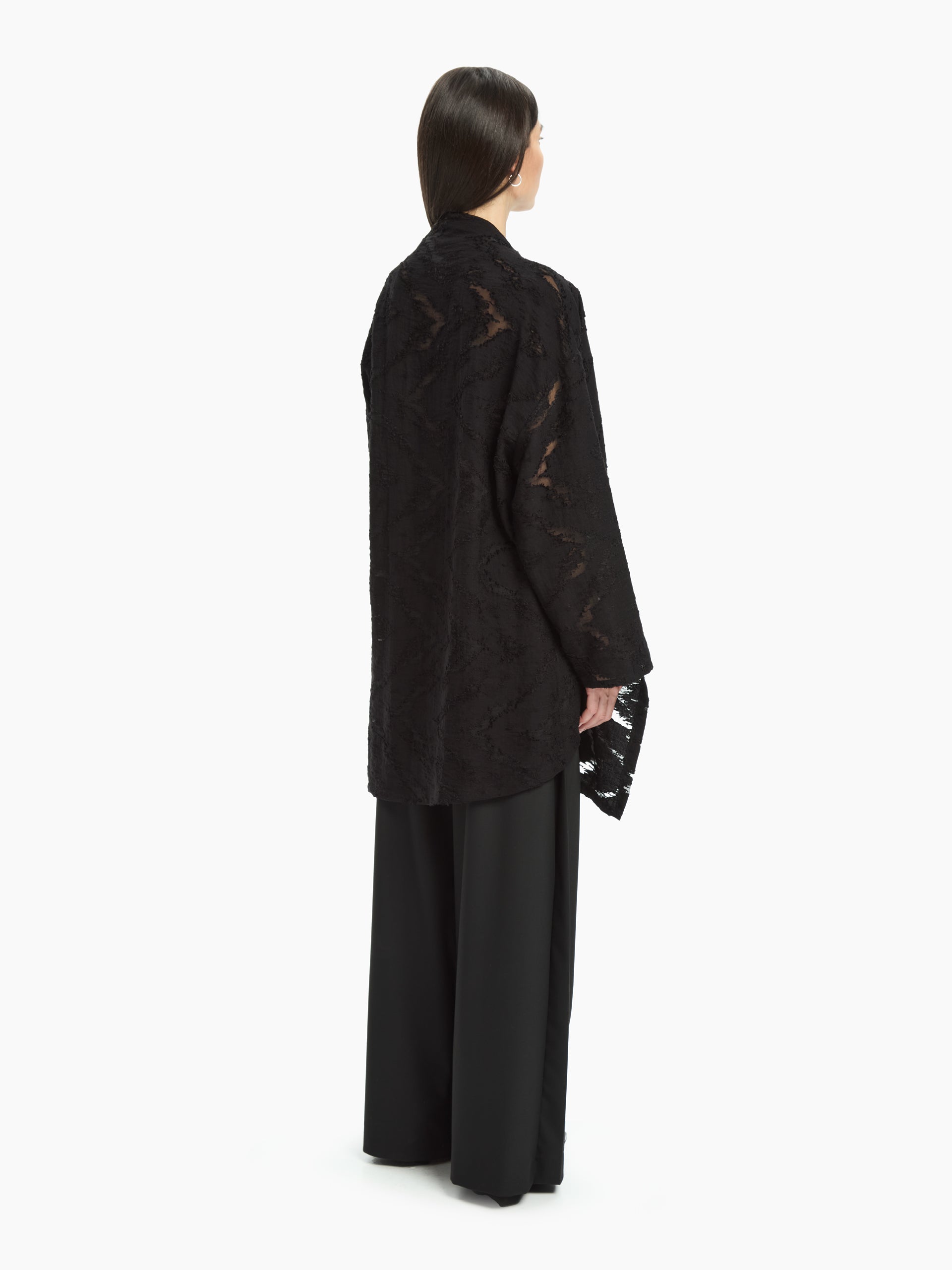 The Polpo jacket is a garment with an ethereal and contemporary charm, characterised by a unique balance between transparency and structure. Made from lightweight devoré fabric, it has an irregular, textured surface that plays with light and texture.