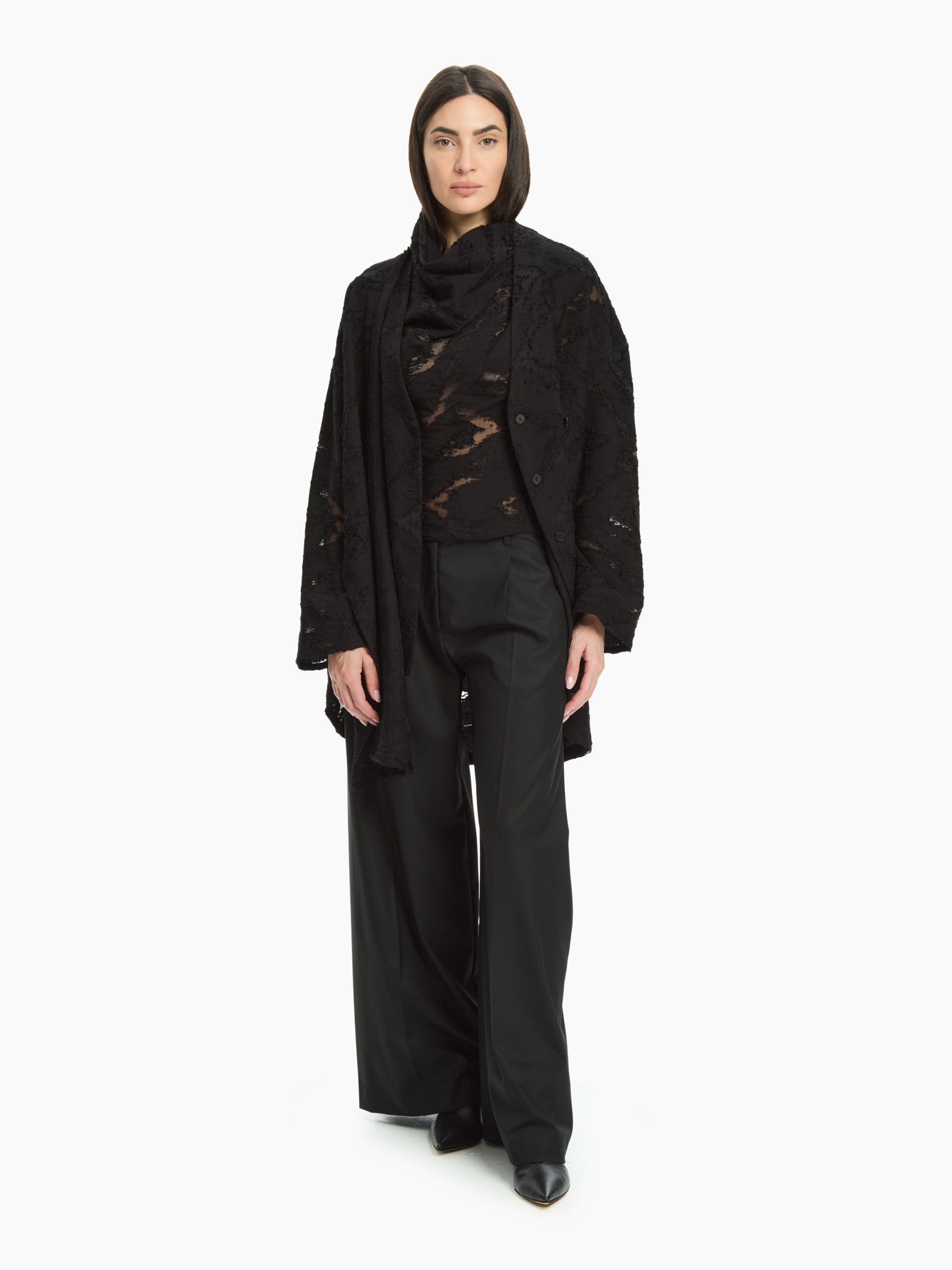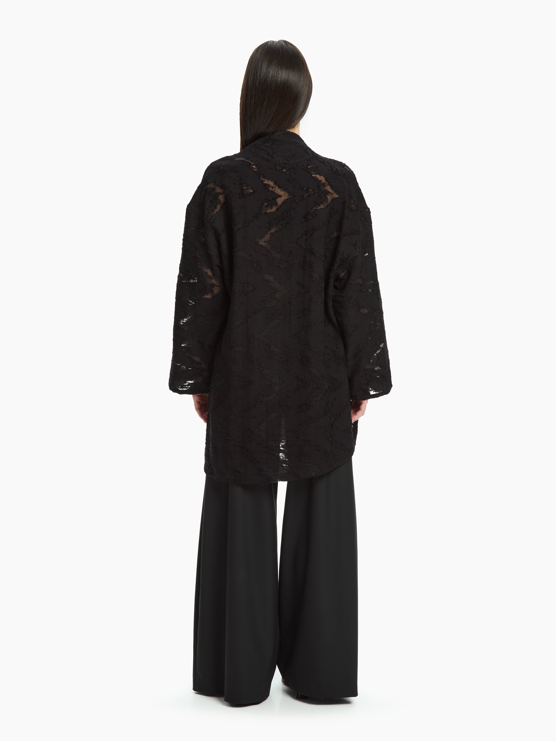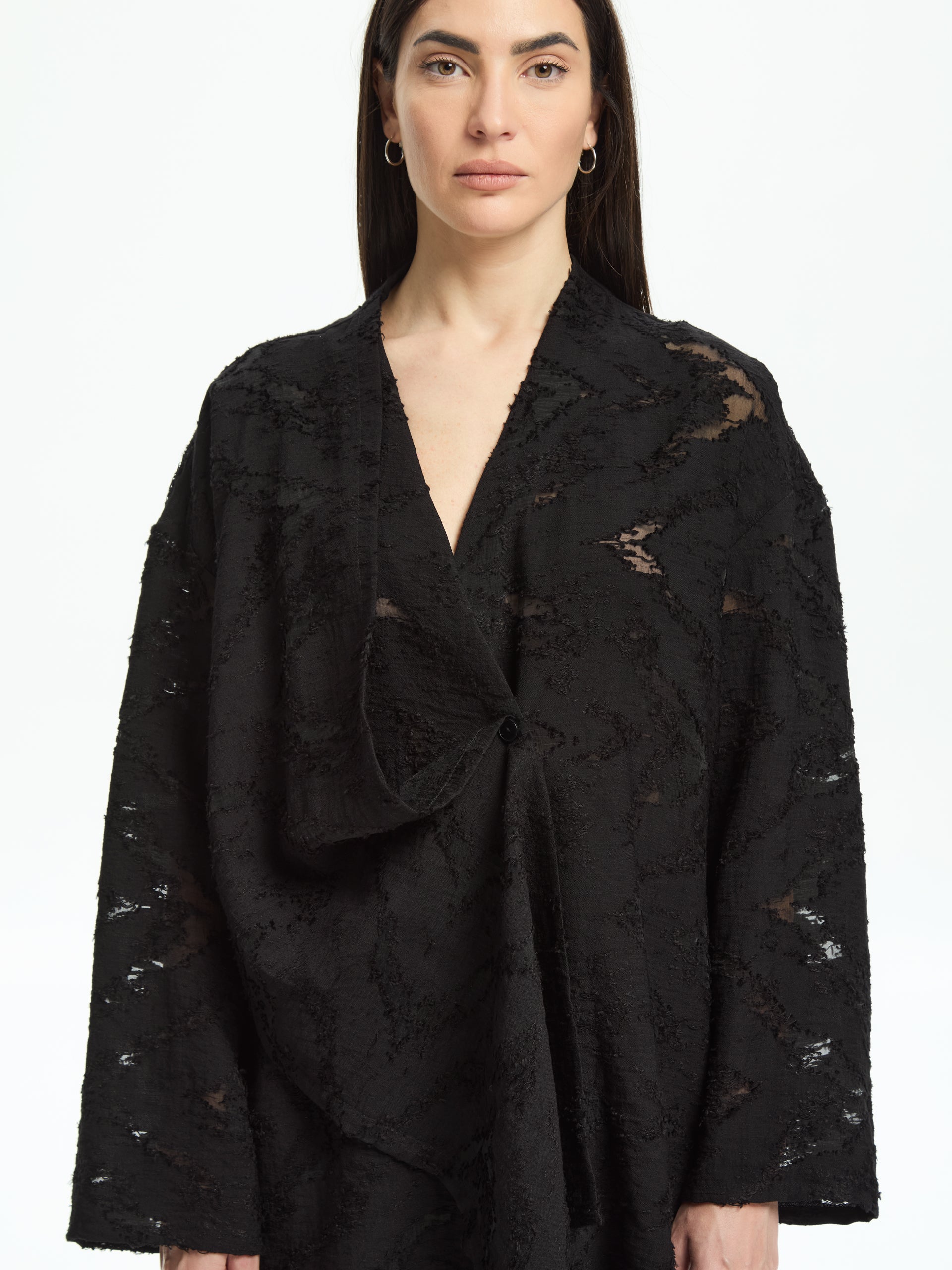 The Polpo jacket is a garment with an ethereal and contemporary charm, characterised by a unique balance between transparency and structure. Made from lightweight devoré fabric, it has an irregular, textured surface that plays with light and texture.