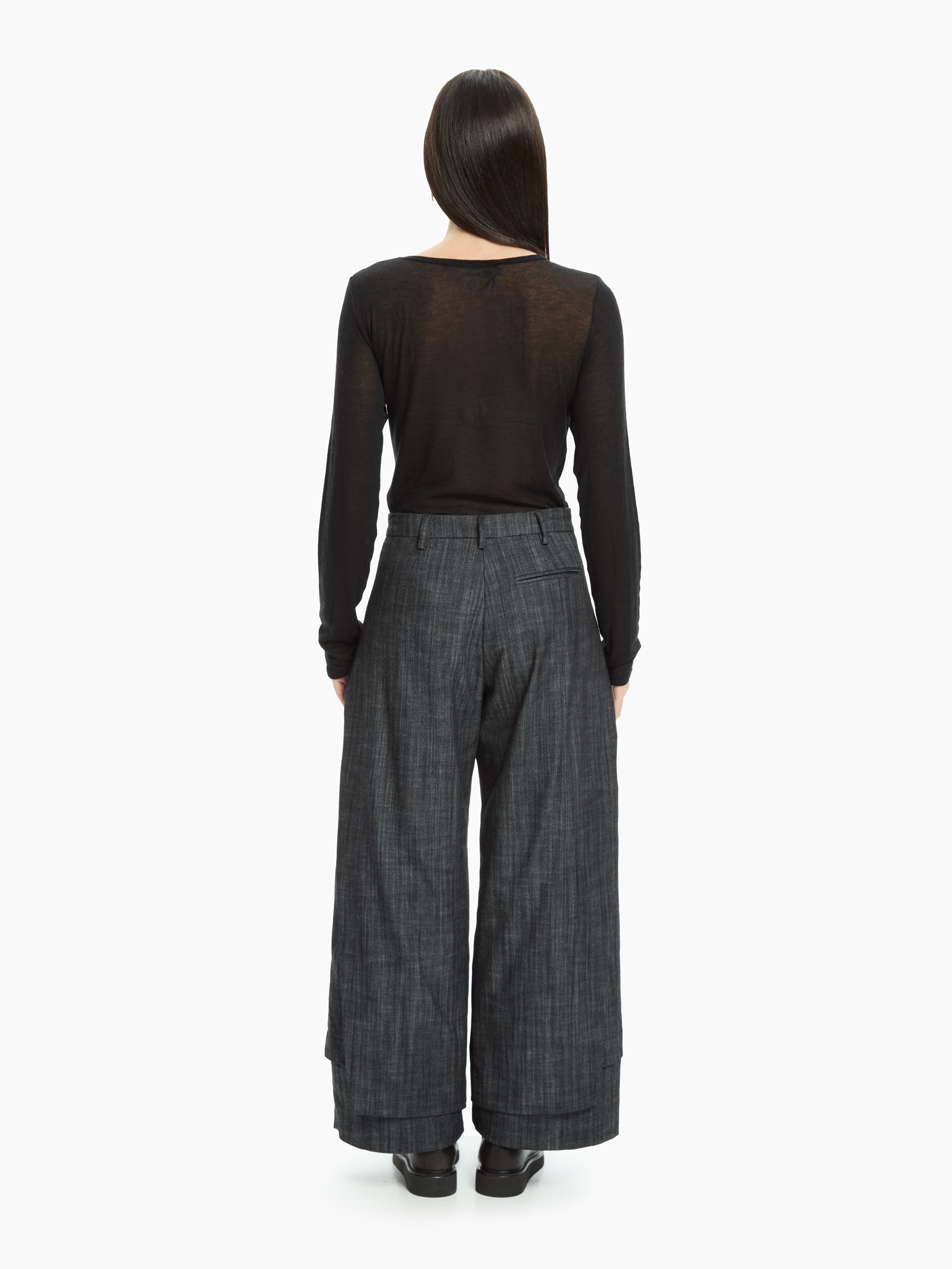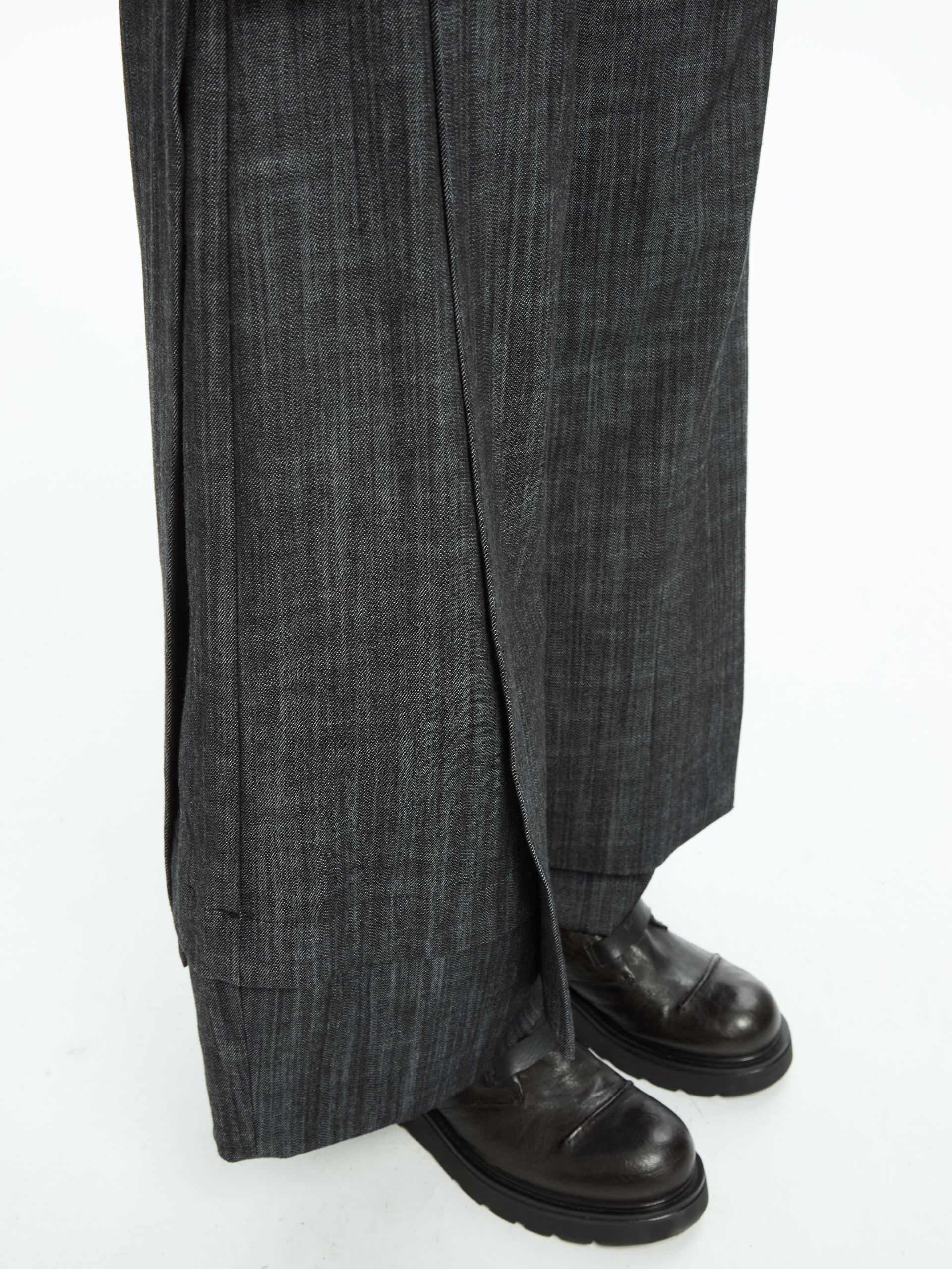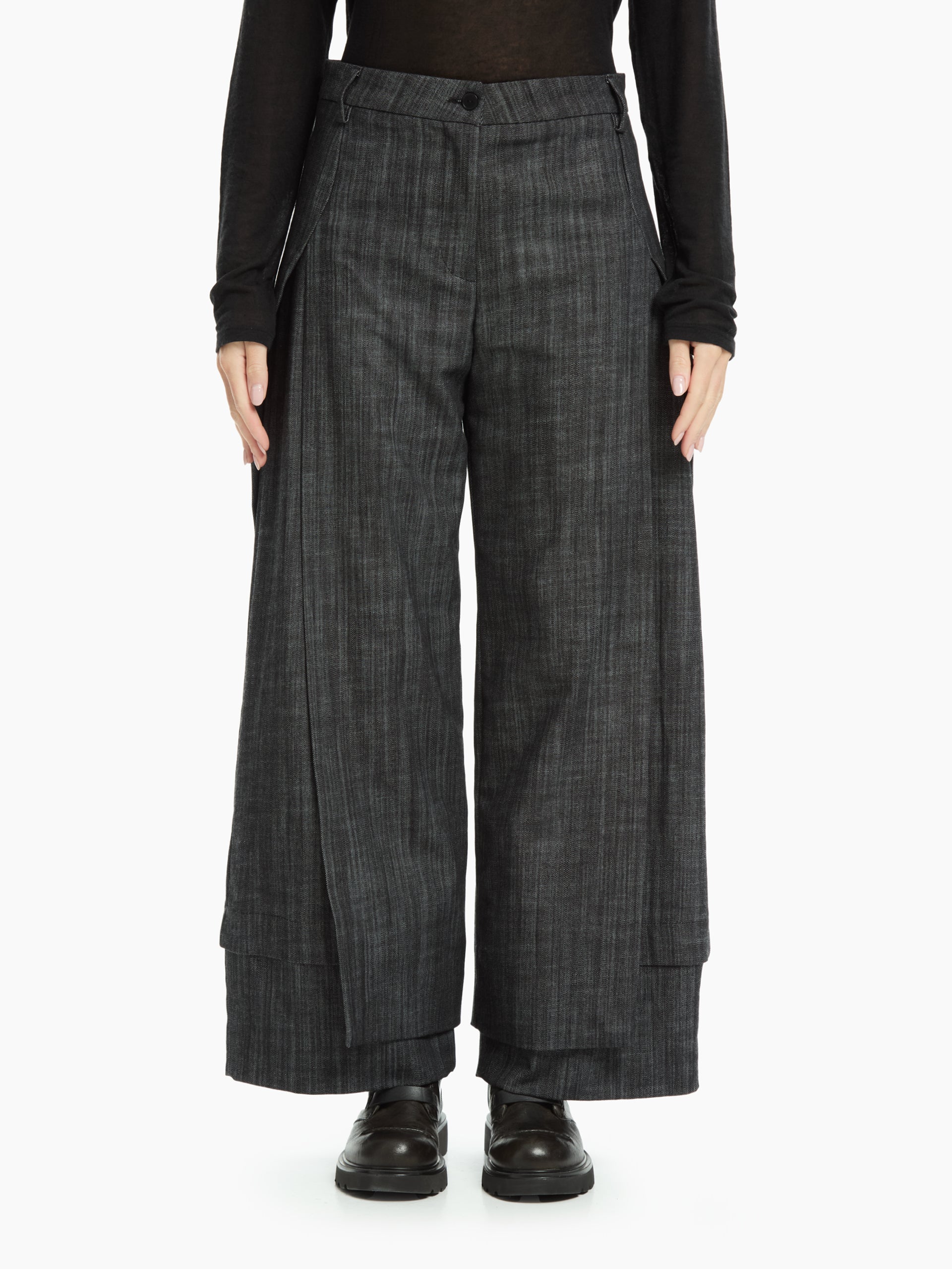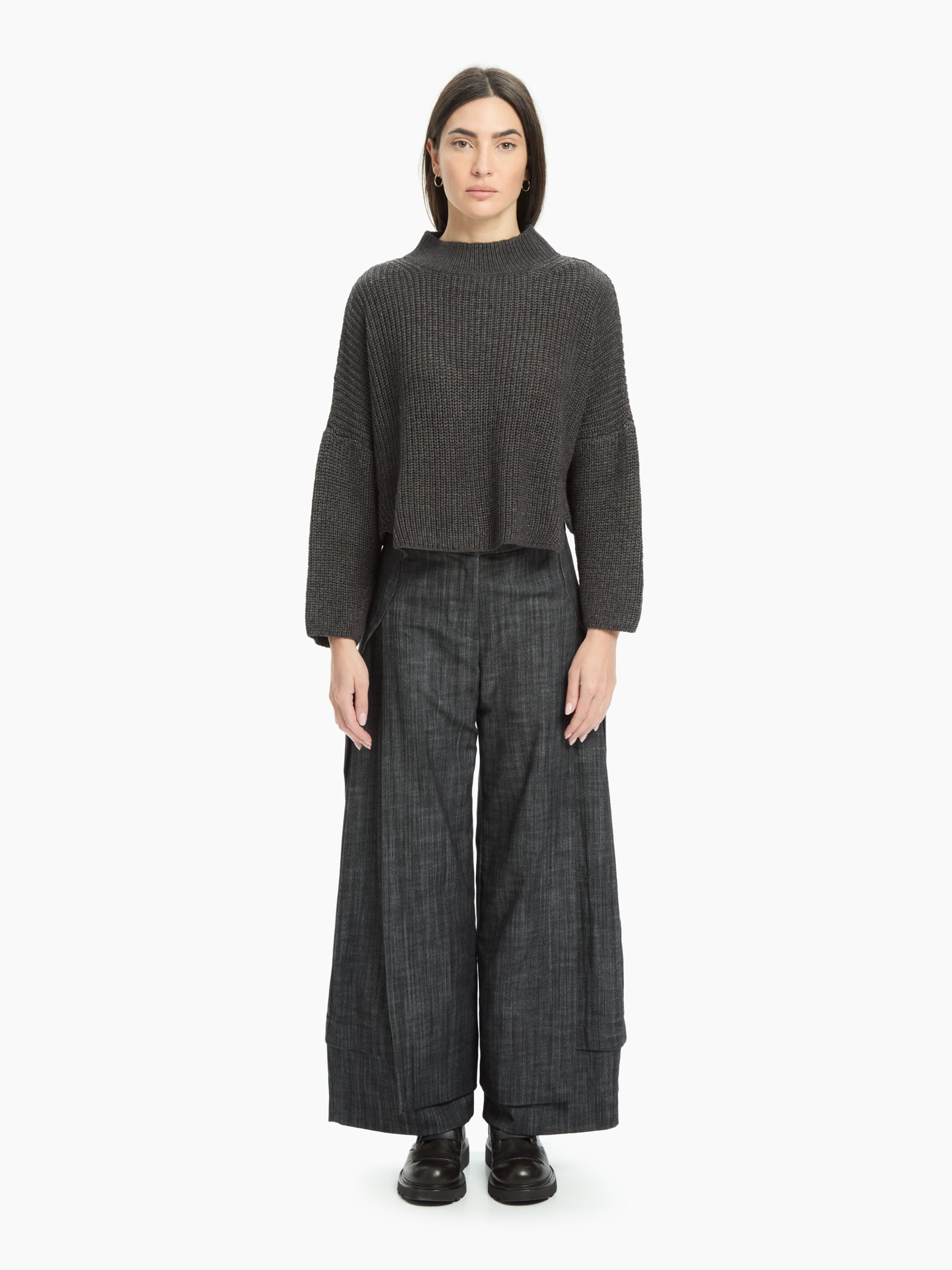 The Colbrix trousers are a garment with a bold volume and sophisticated texture. They combine structure and fluidity for a contemporary and distinctive look. The regular waist with structured belt and deep front pleats define a wide and sculptural silhouette, while the straight hem adds balance to the design.
