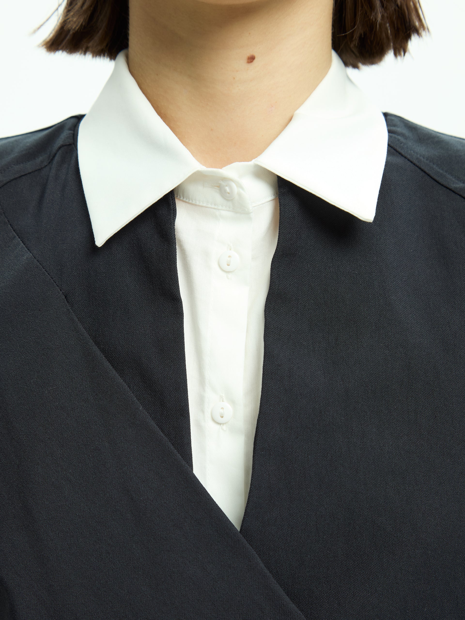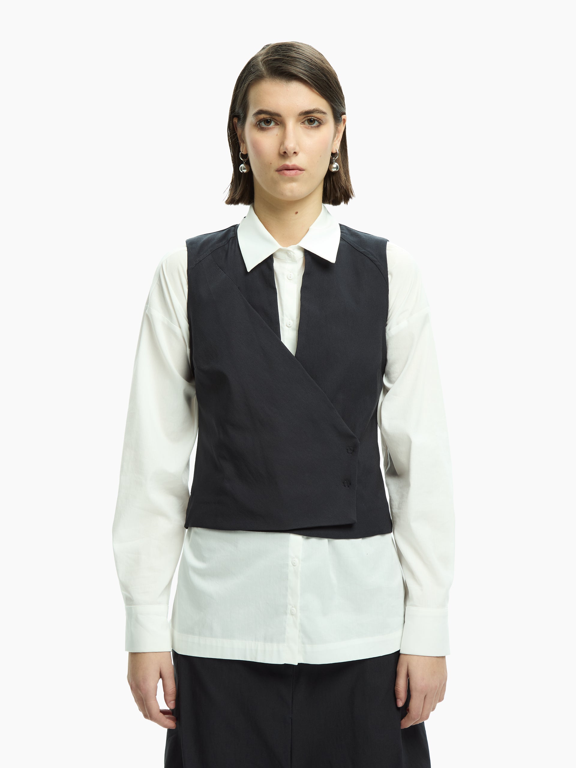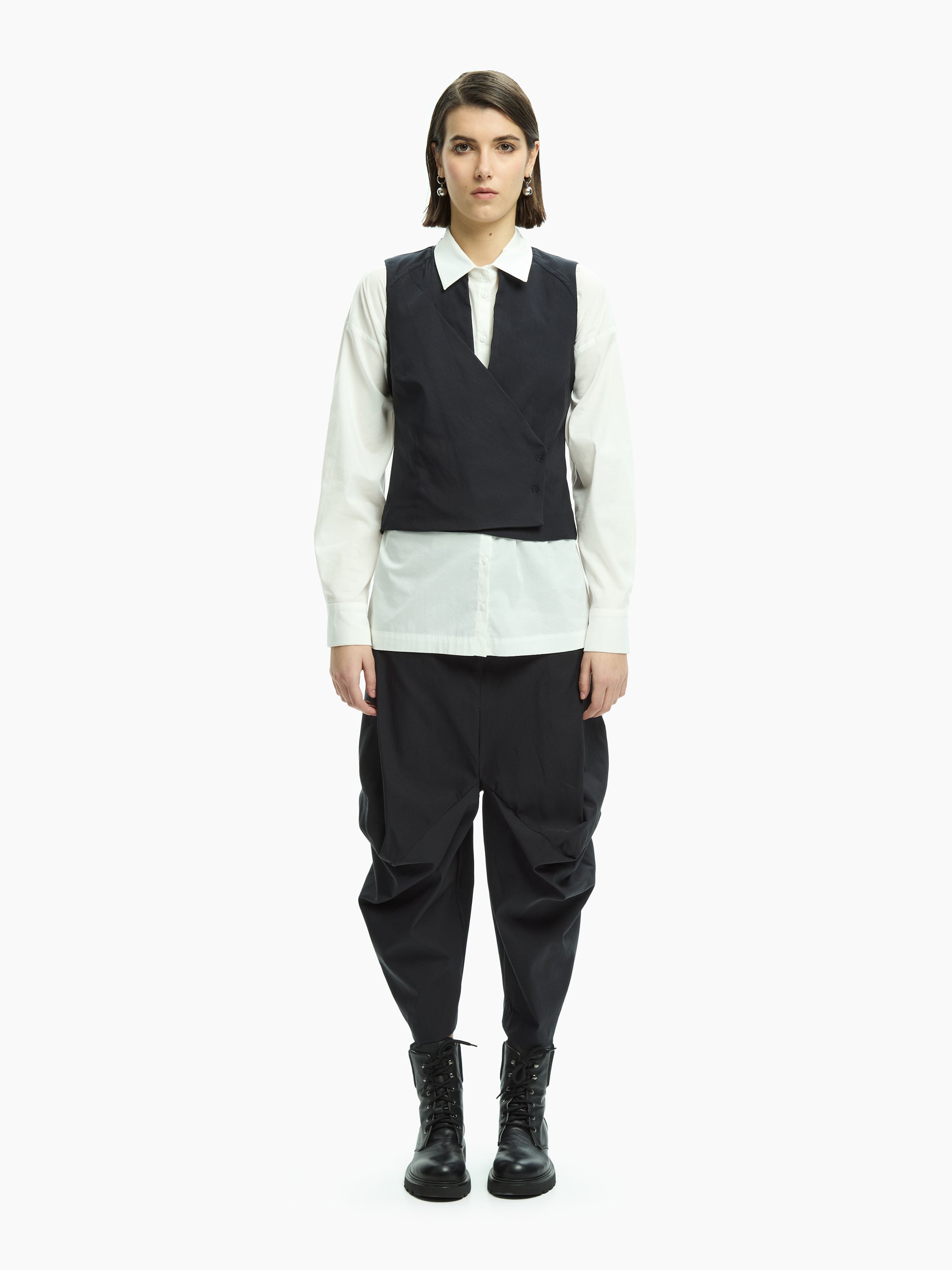 A garment that reinterprets classic elegance with a minimalist, contemporary approach. The front crossover creates a play of clean lines that discreetly defines the silhouette, maintaining a refined balance between sartorial rigour and visual lightness.
