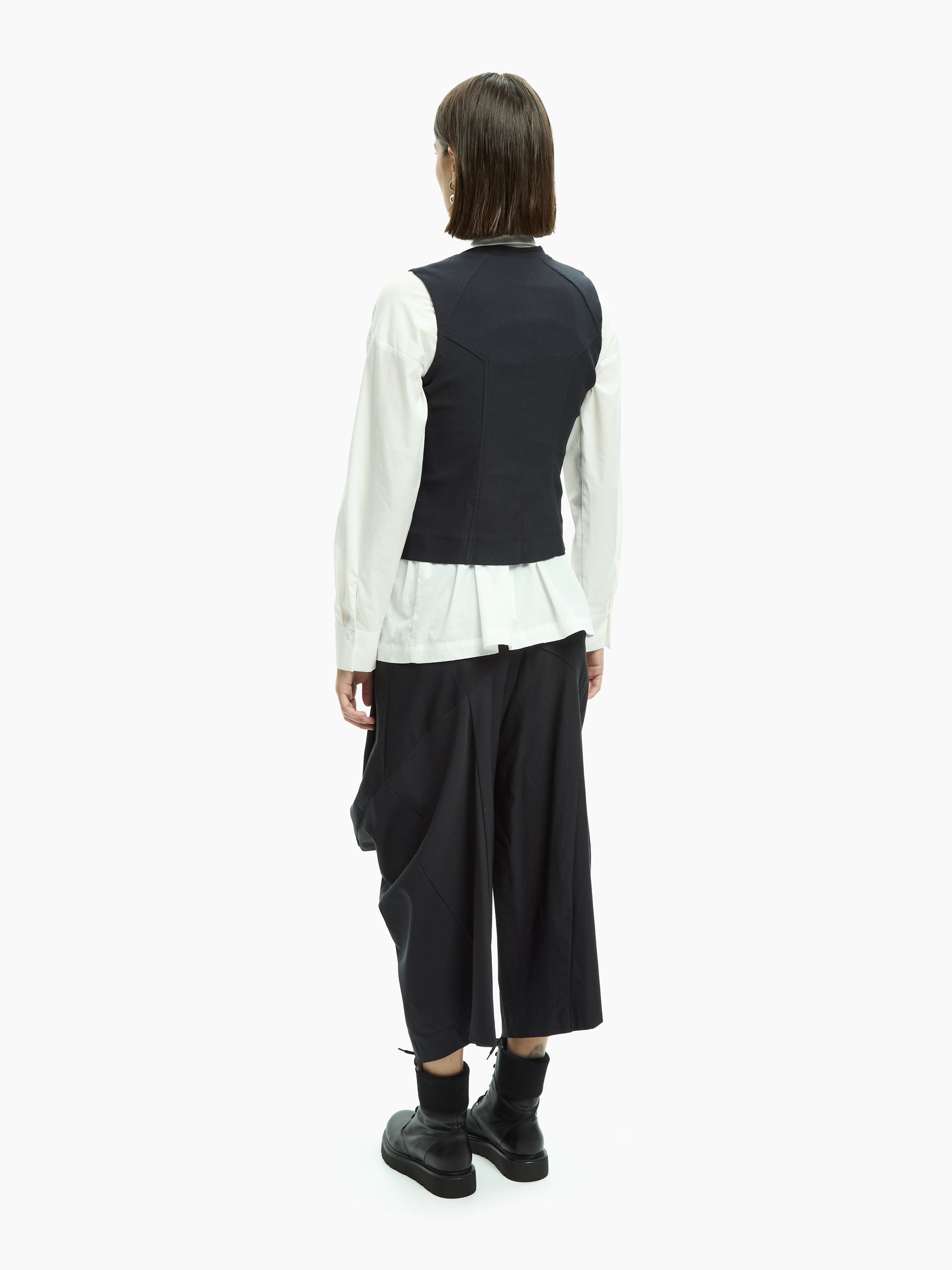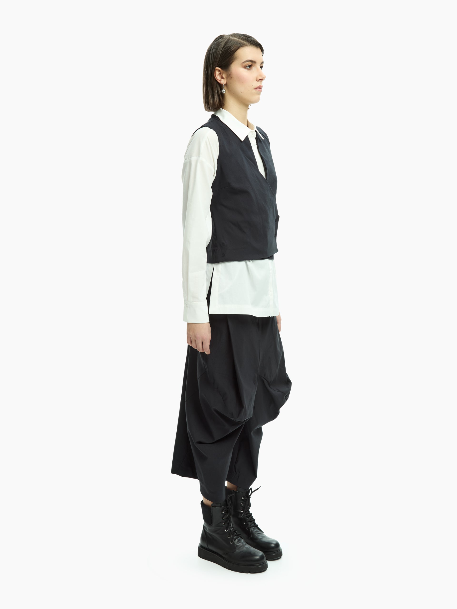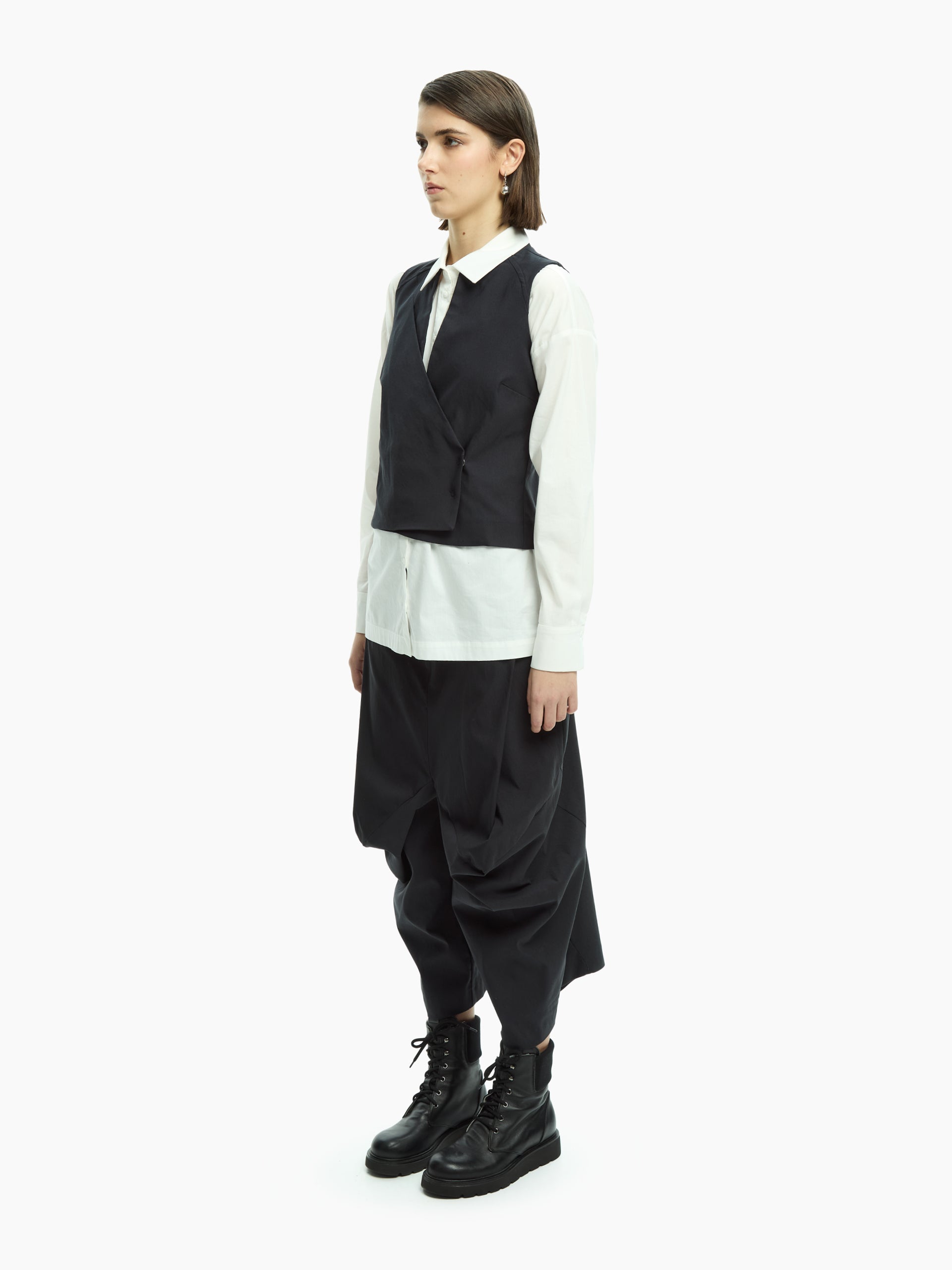 A garment that reinterprets classic elegance with a minimalist, contemporary approach. The front crossover creates a play of clean lines that discreetly defines the silhouette, maintaining a refined balance between sartorial rigour and visual lightness.