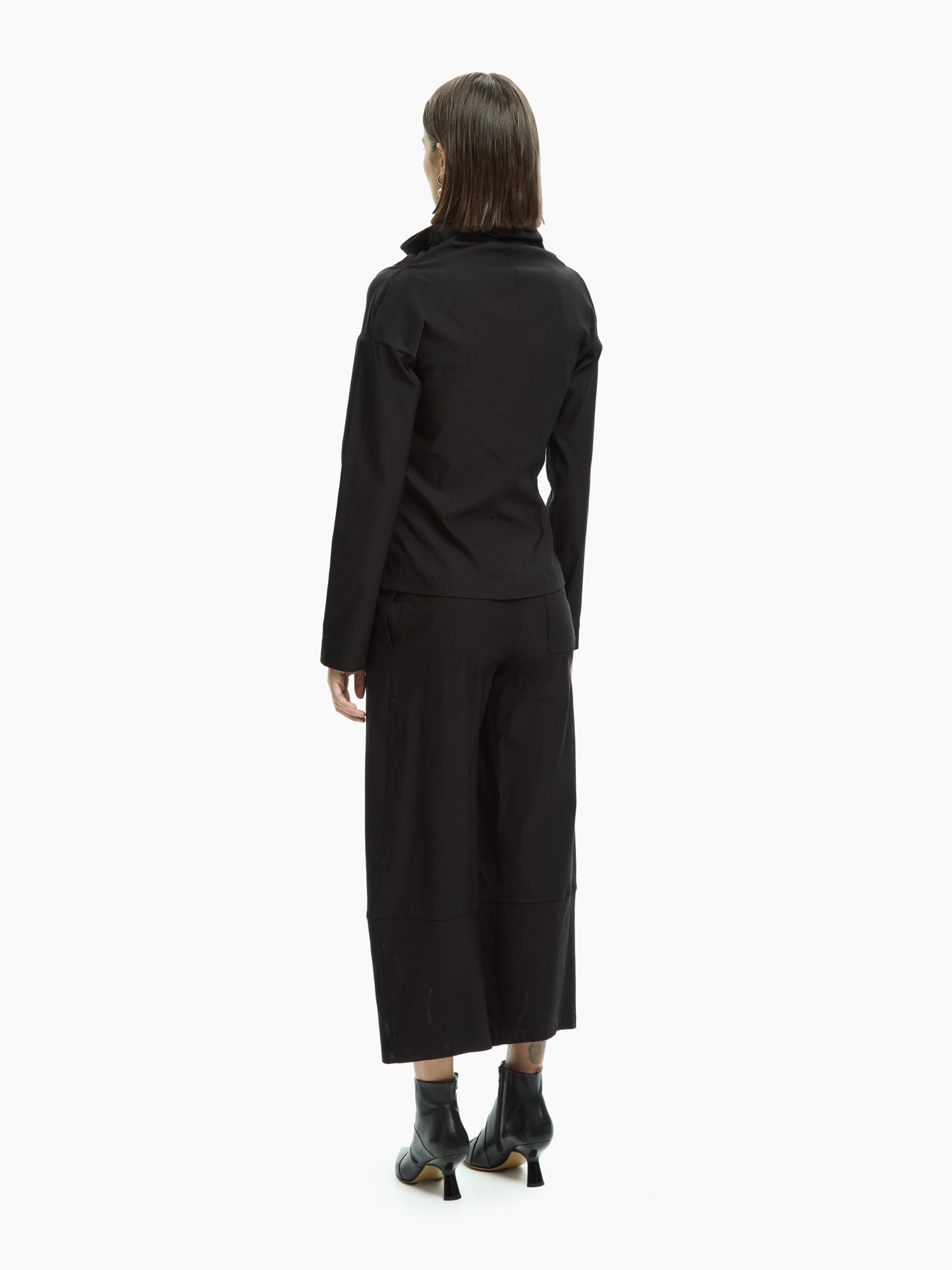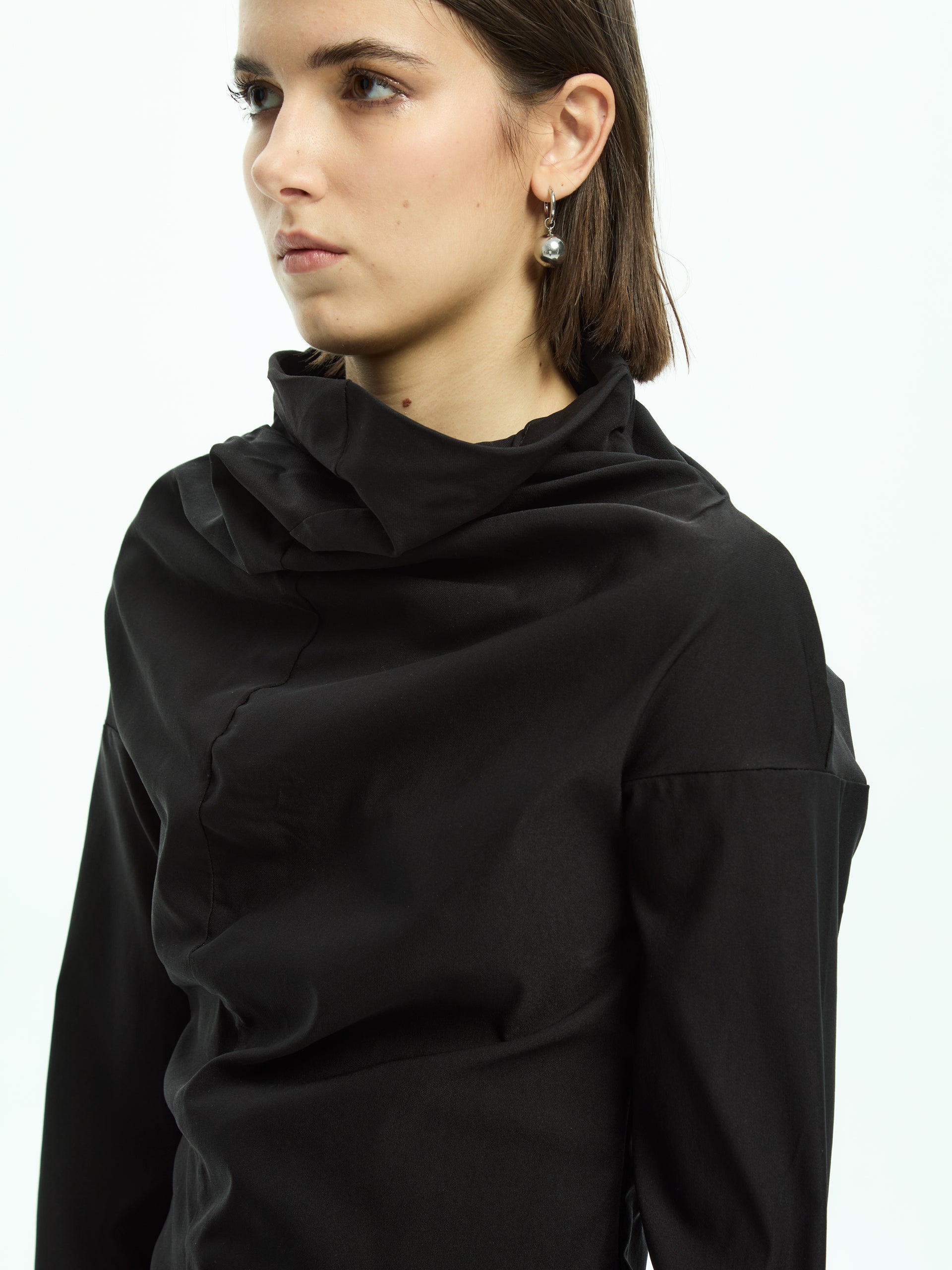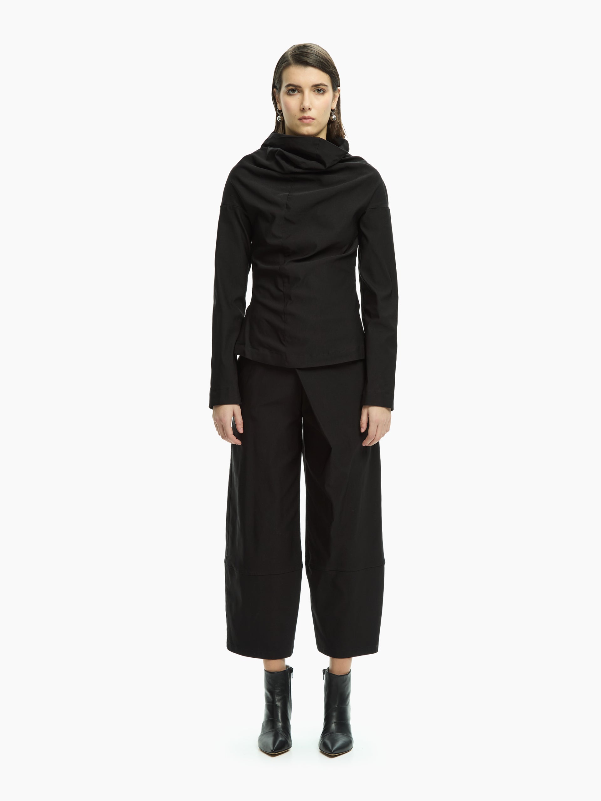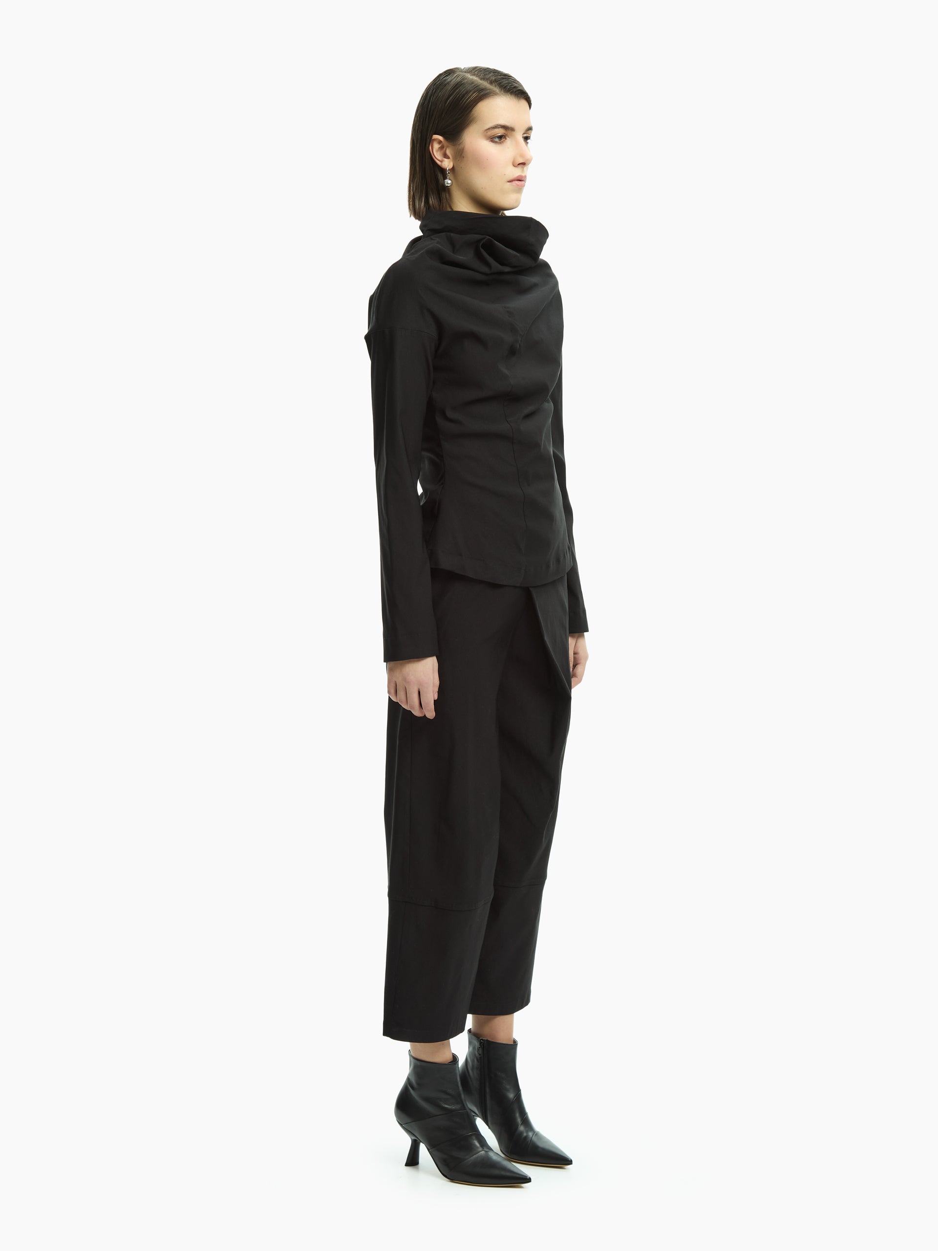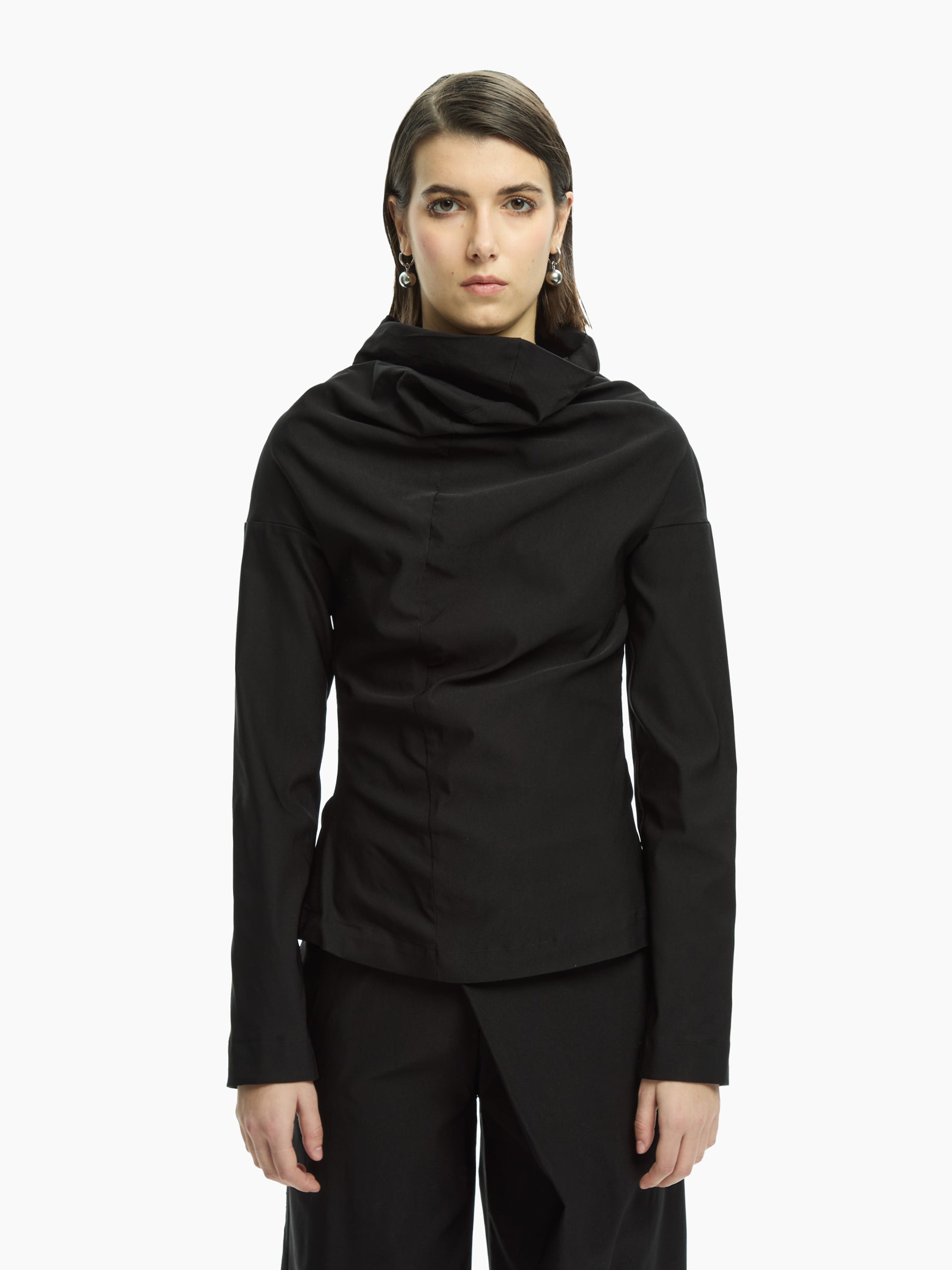 A garment that explores the language of draping in an essential and contemporary key. The wide, enveloping collar creates a fluid movement at the front, defining a soft but controlled silhouette. The light pleats accompany the line of the bust without weighing it down, while the clean construction enhances the texture of the fabric. Ideal for sophisticated monochromatic looks, to be worn as the central element of the silhouette.