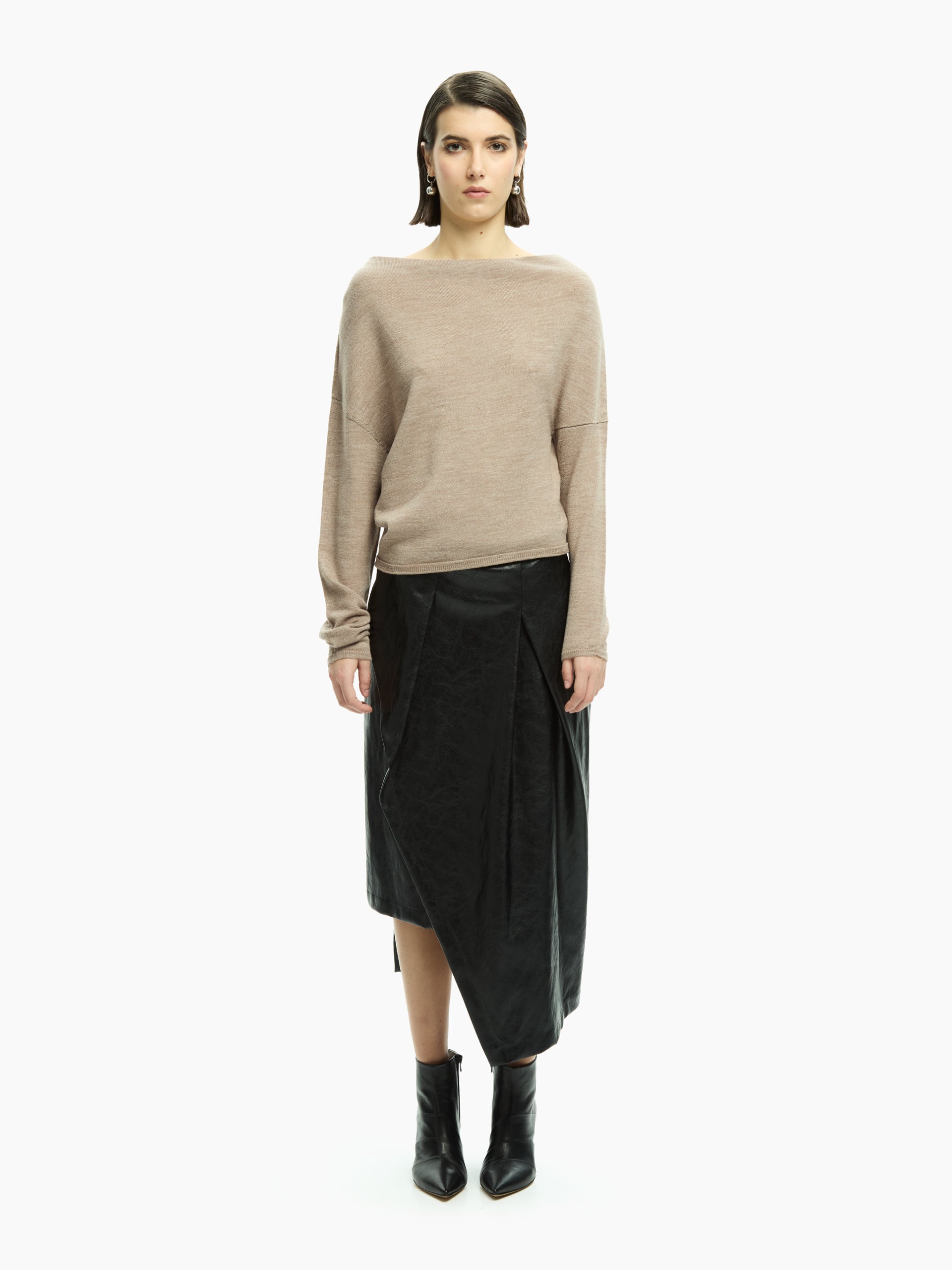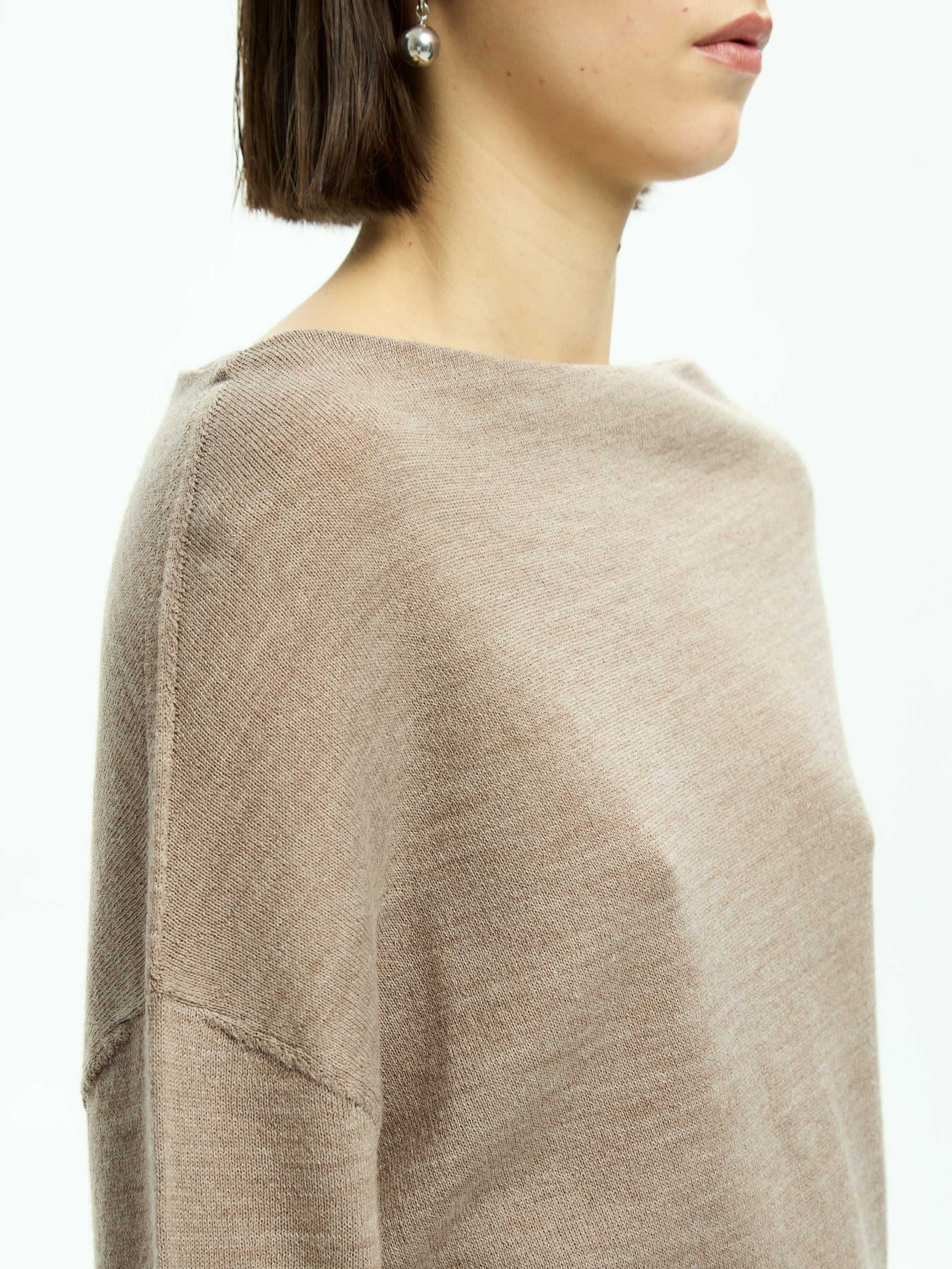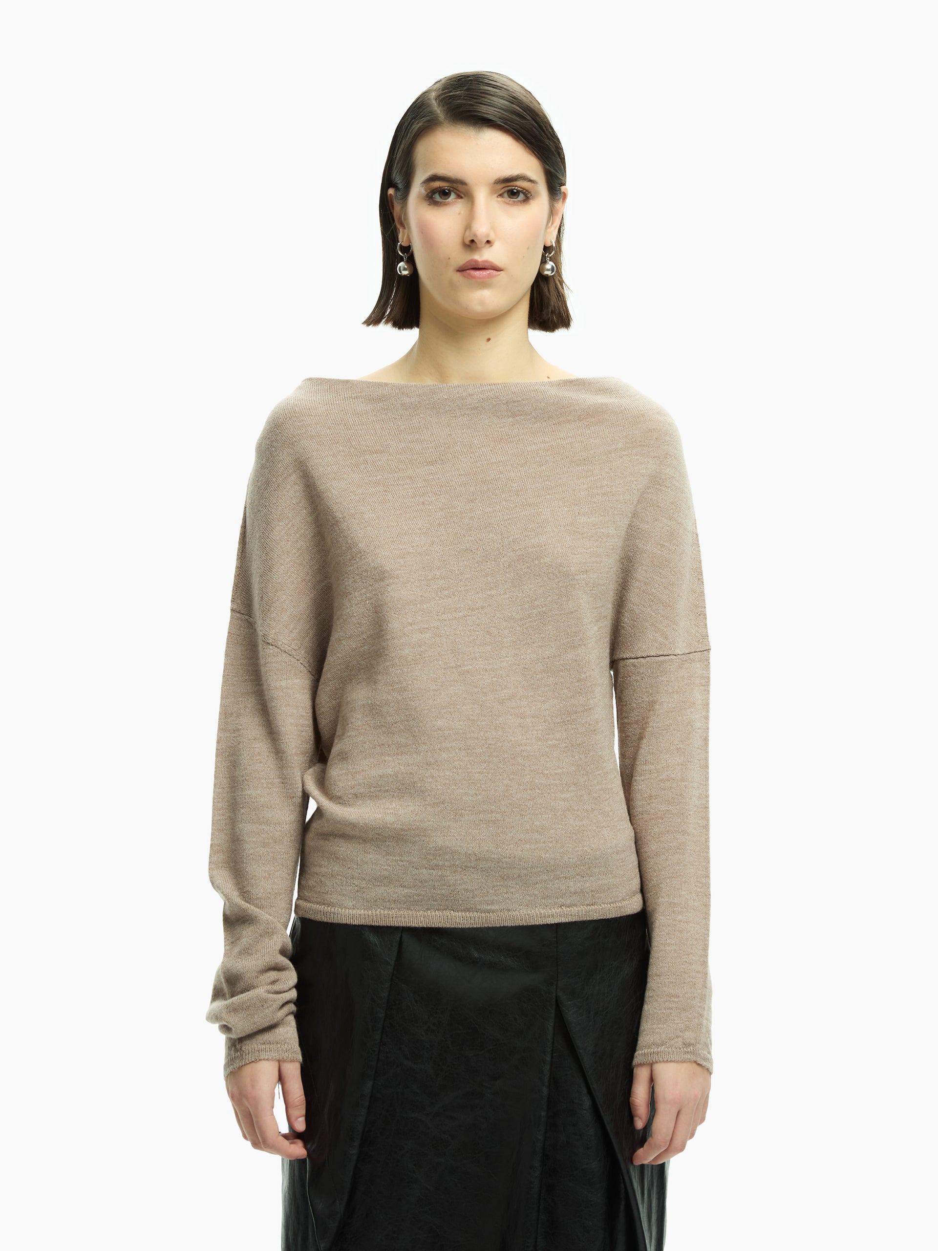 An essential piece that expresses elegance through the purity of its shapes. The wide line and slightly open neck create a soft, contemporary silhouette, designed to accompany the body naturally. The dropped shoulders and long sleeves contribute to a refined balance between comfort and style.