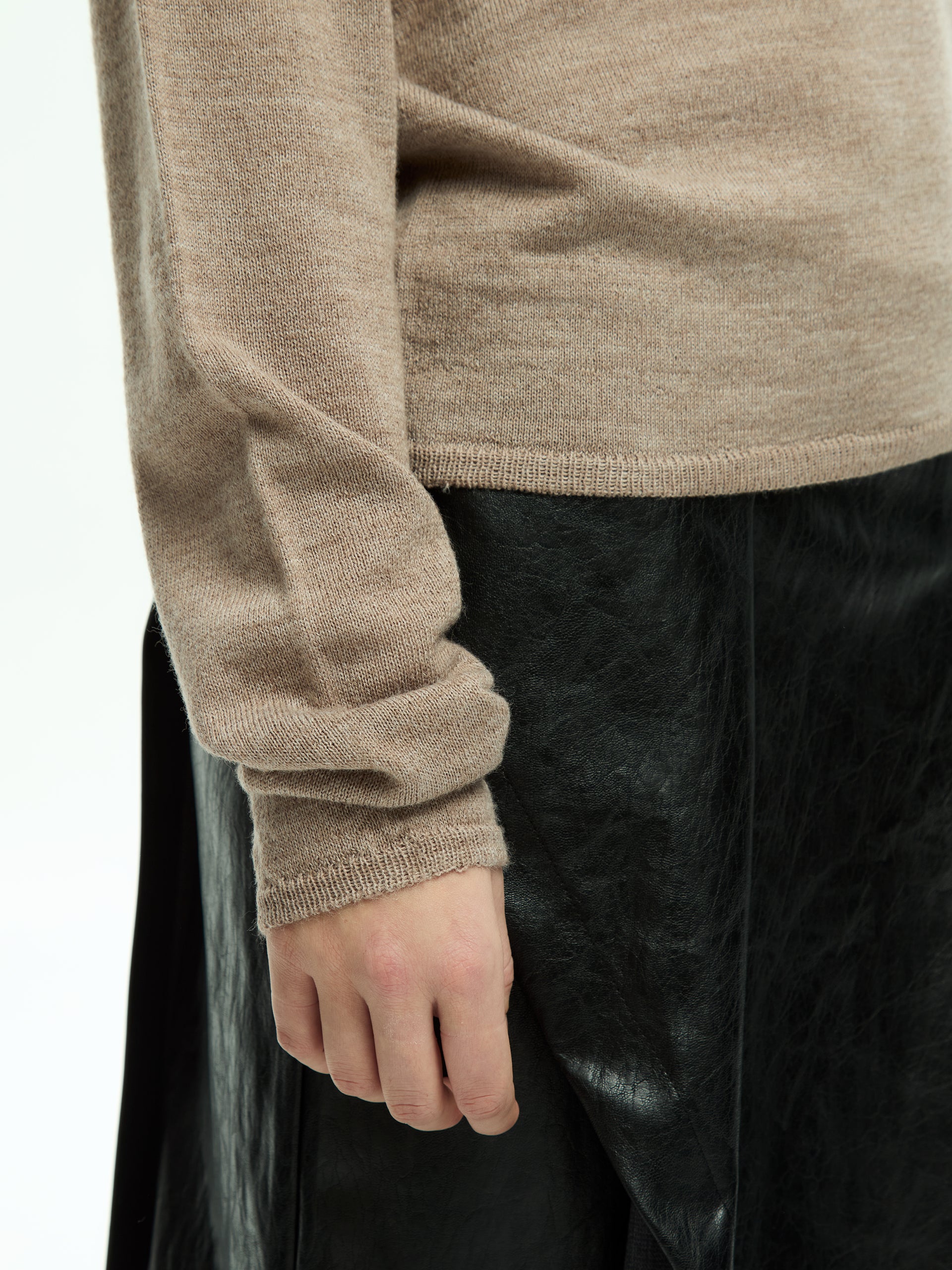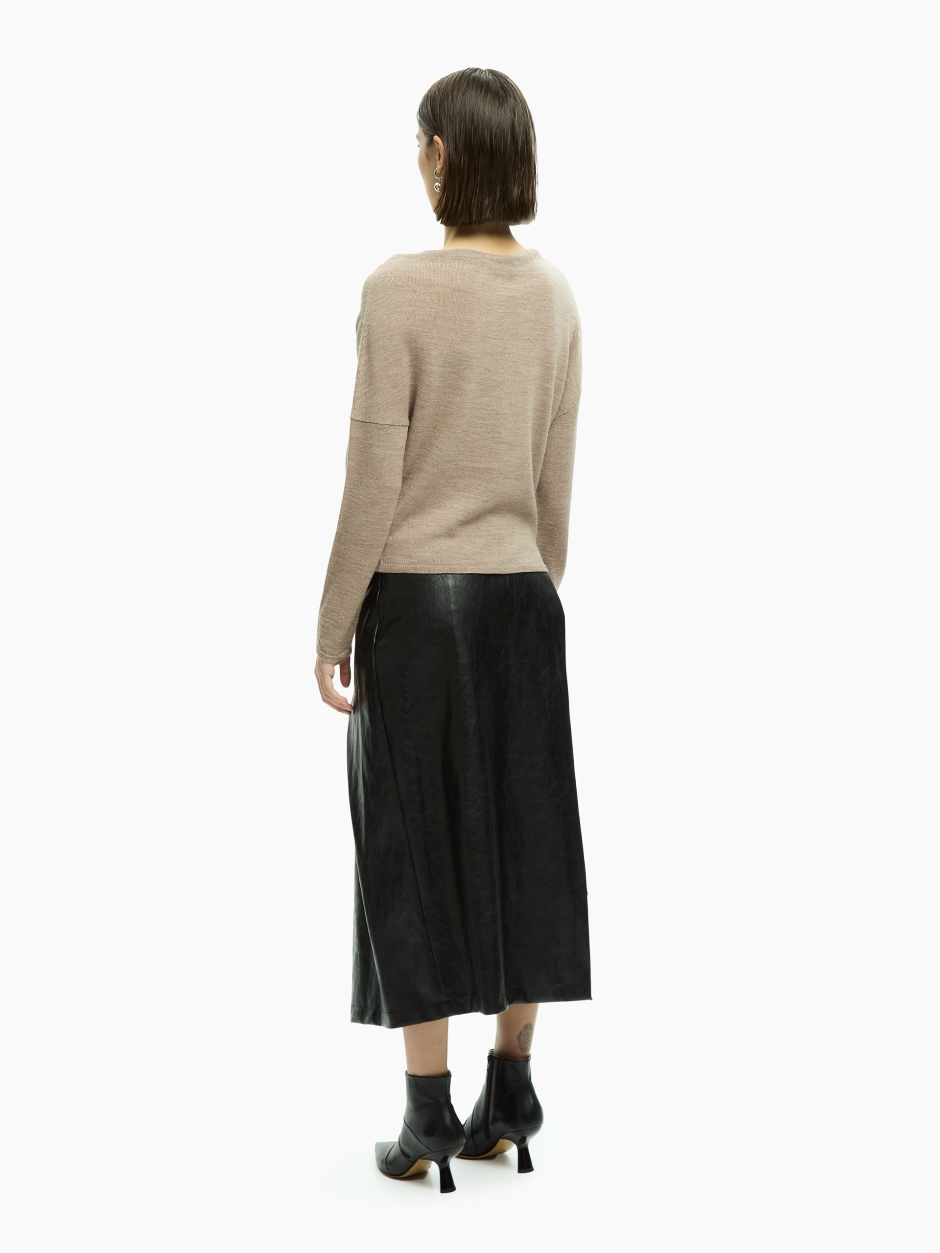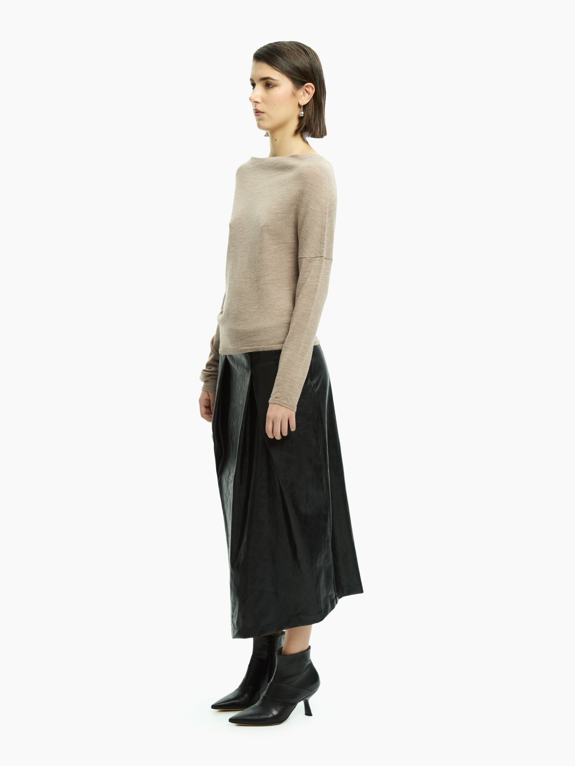 An essential piece that expresses elegance through the purity of its shapes. The wide line and slightly open neck create a soft, contemporary silhouette, designed to accompany the body naturally. The dropped shoulders and long sleeves contribute to a refined balance between comfort and style.