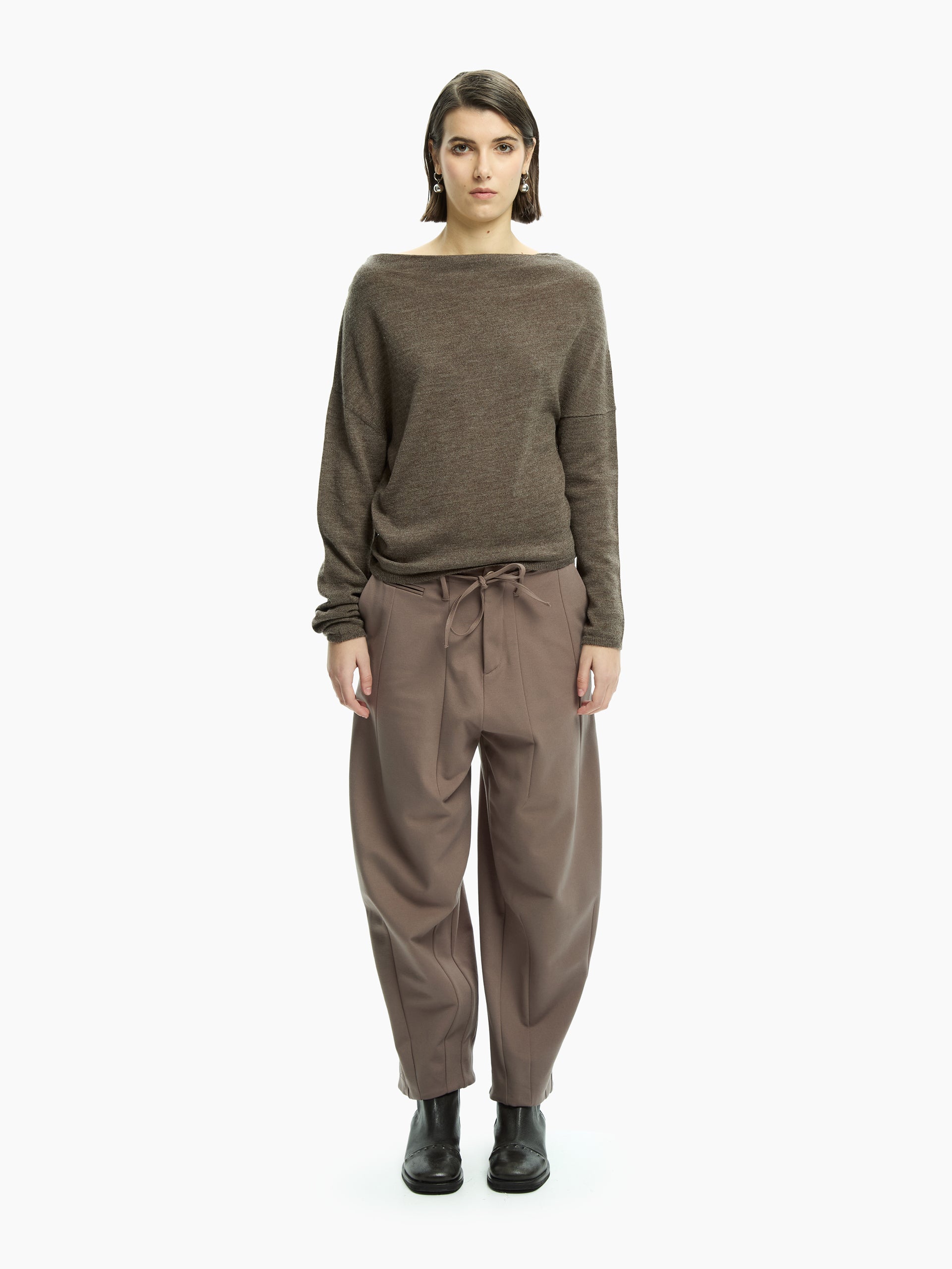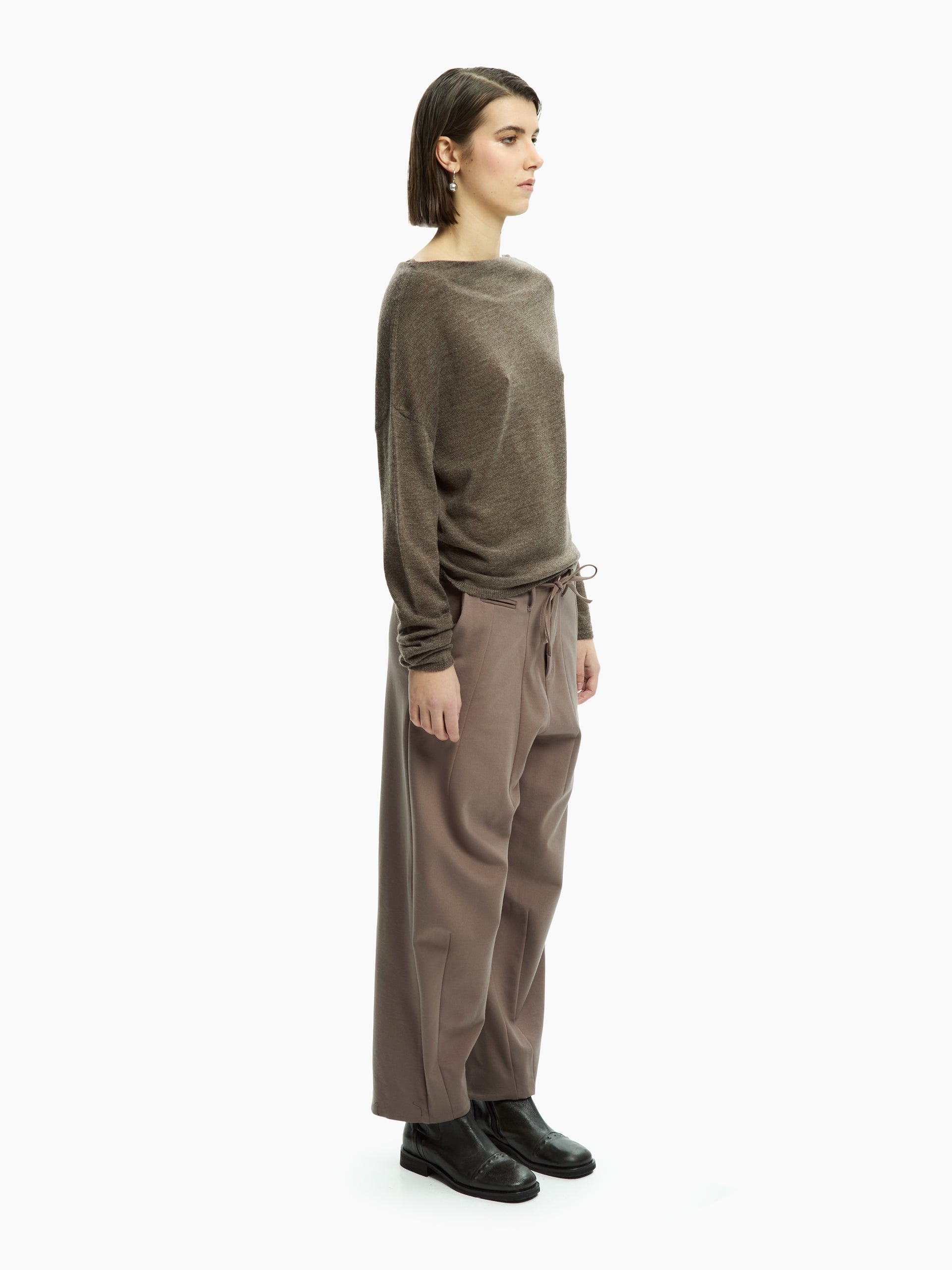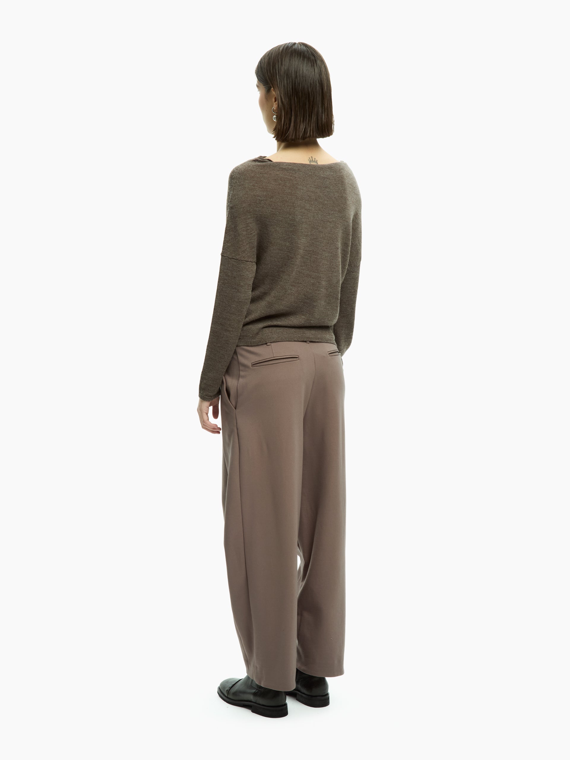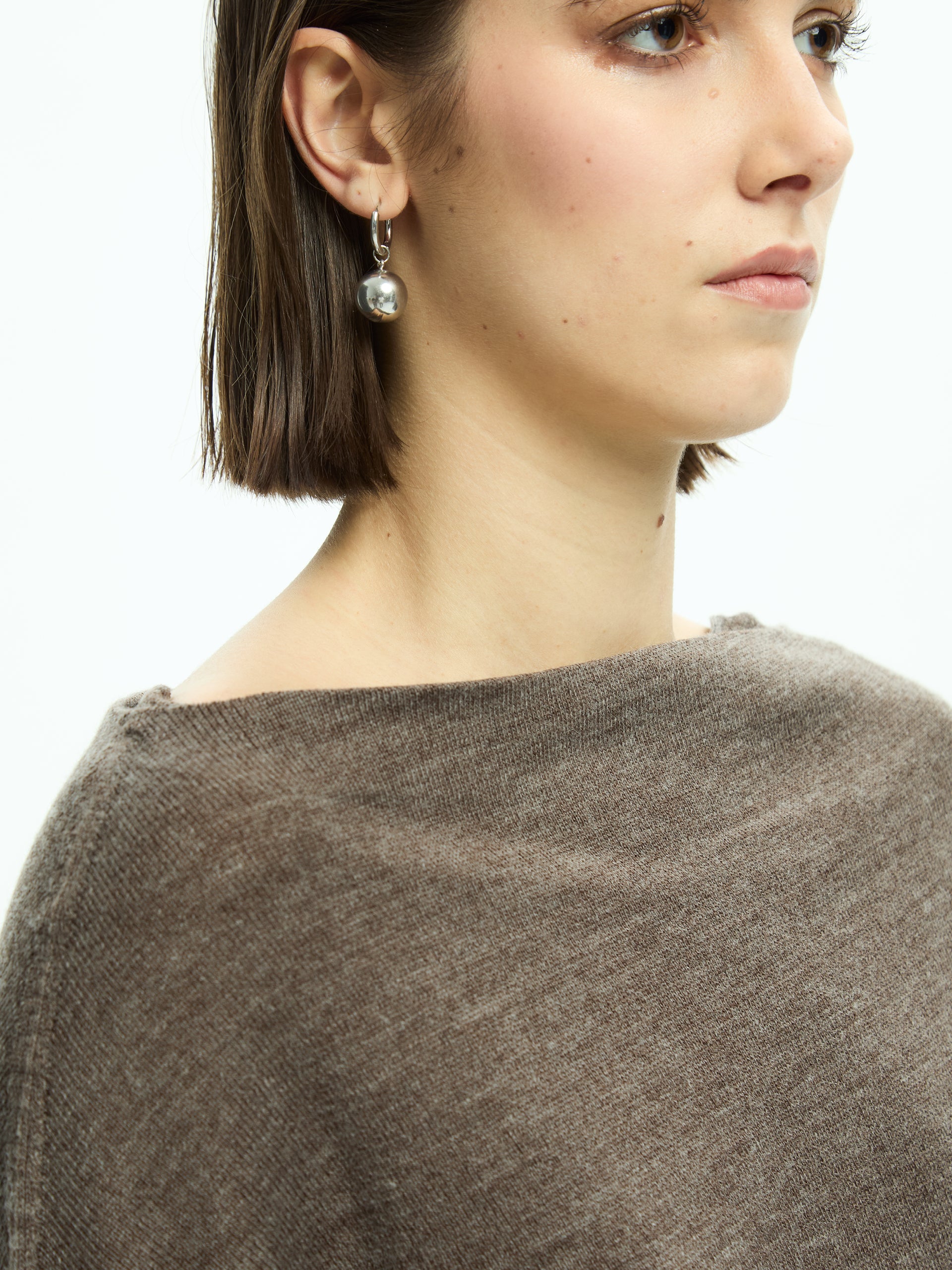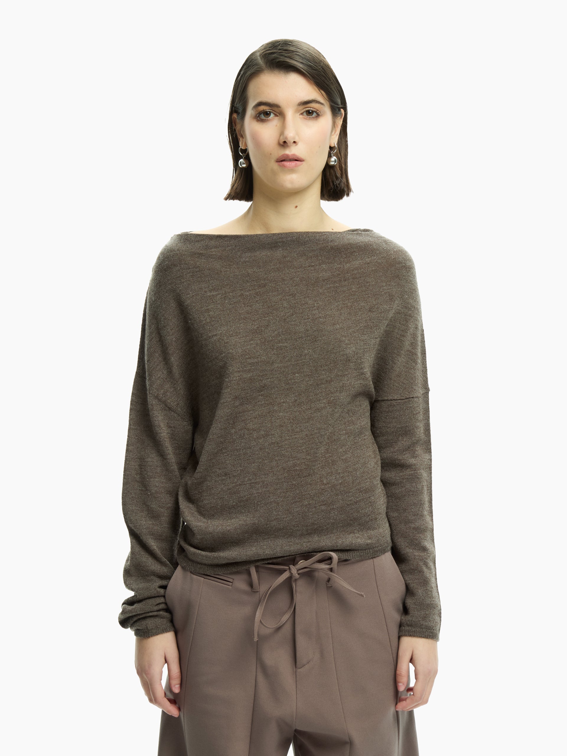 An essential piece that expresses elegance through the purity of its shapes. The wide line and slightly open neck create a soft, contemporary silhouette, designed to accompany the body naturally. The dropped shoulders and long sleeves contribute to a refined balance between comfort and style.
