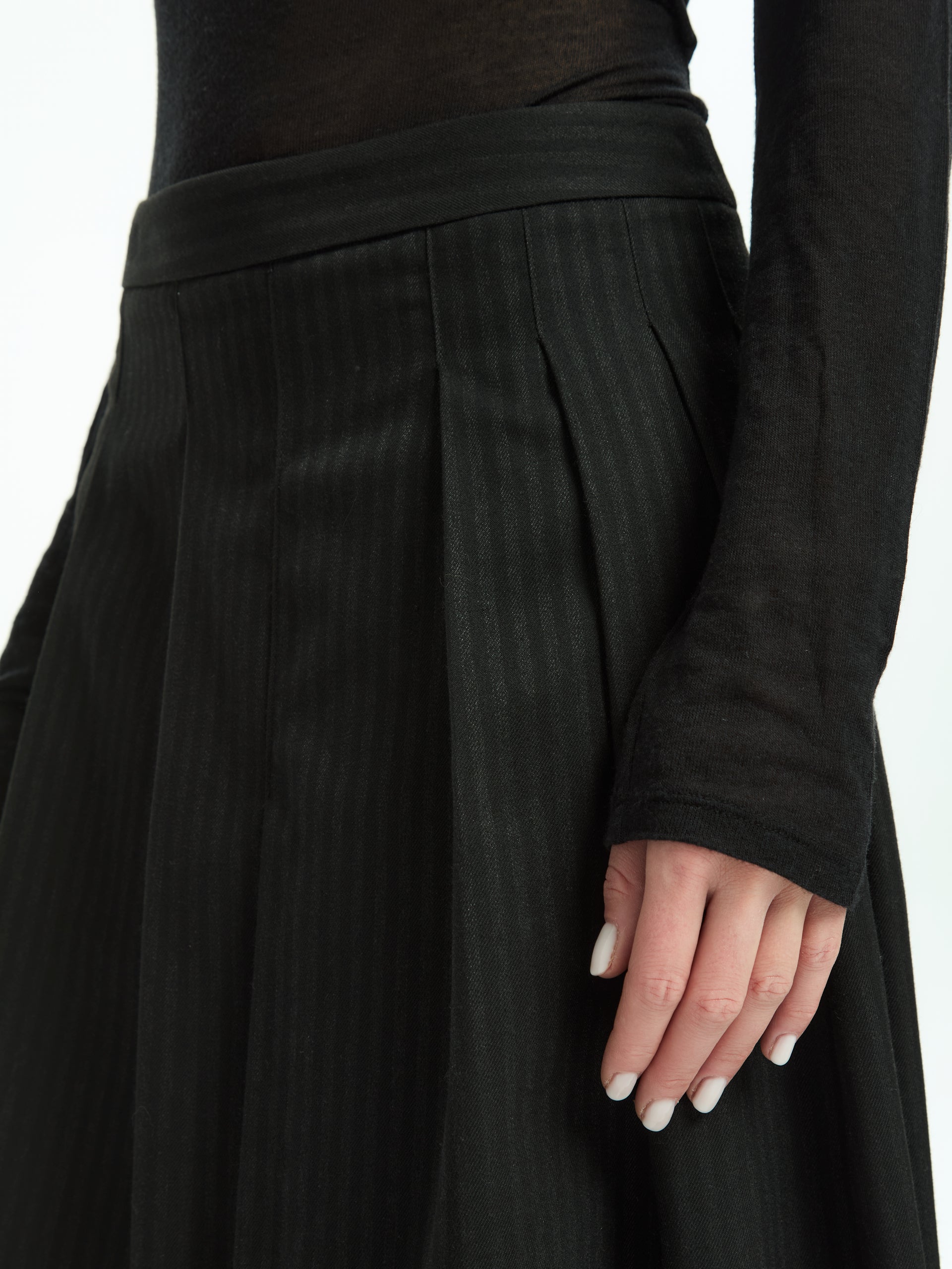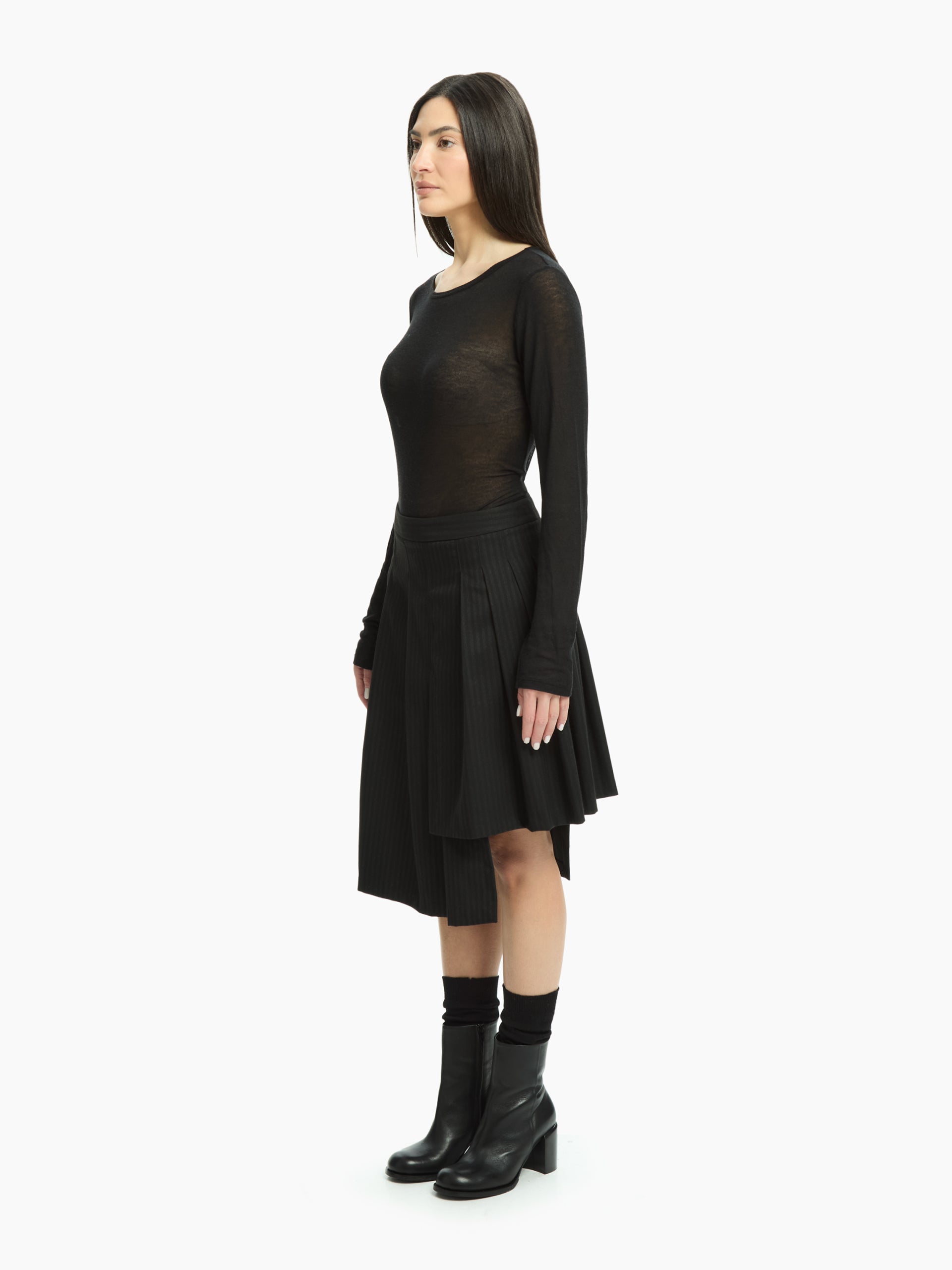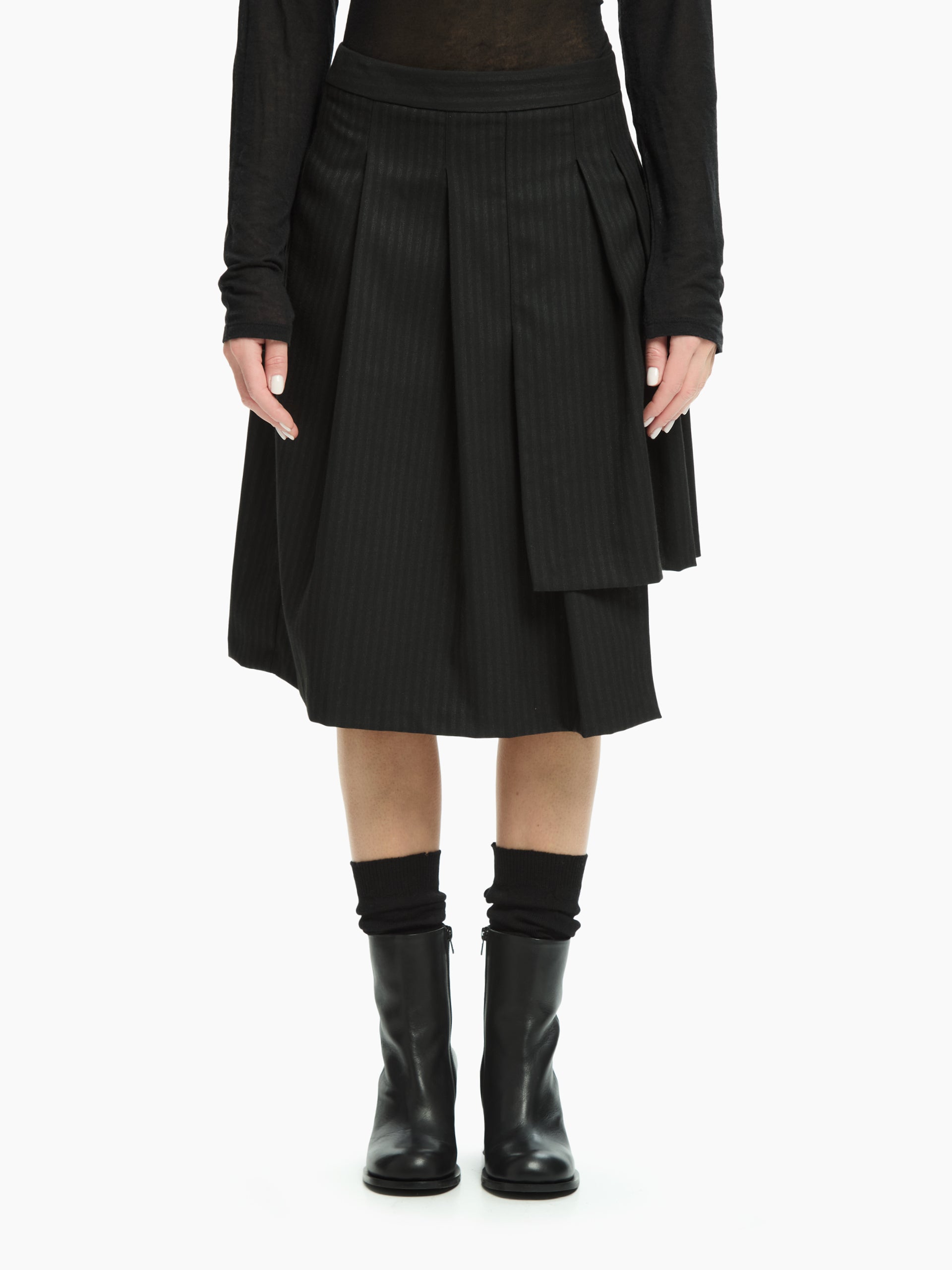 This IXOS skirt reinterprets the classic pinstripe with a contemporary, architectural approach. The pleated structure, combined with the asymmetrical front panel, adds movement and three-dimensionality to a garment with a simple yet sophisticated design.