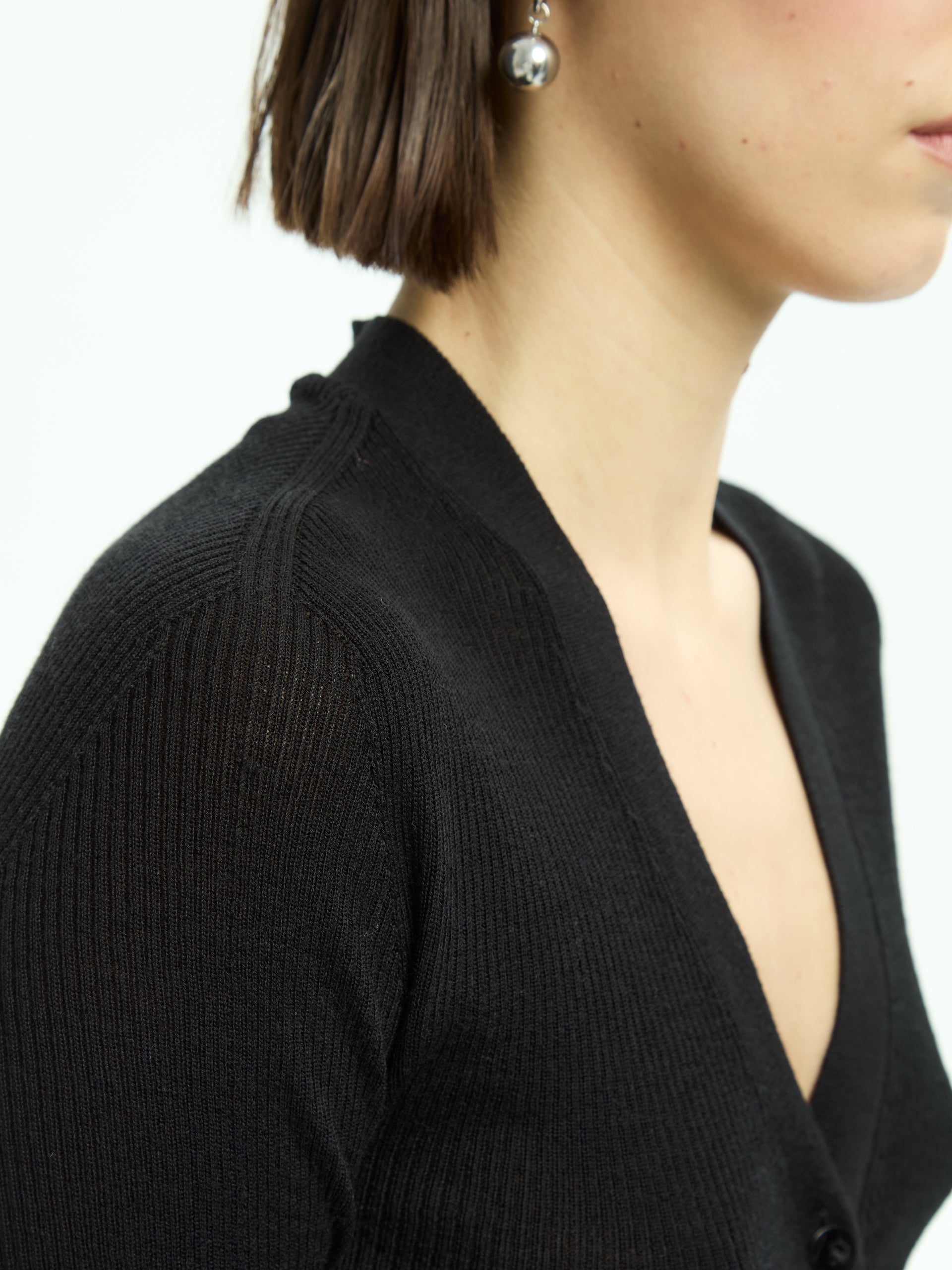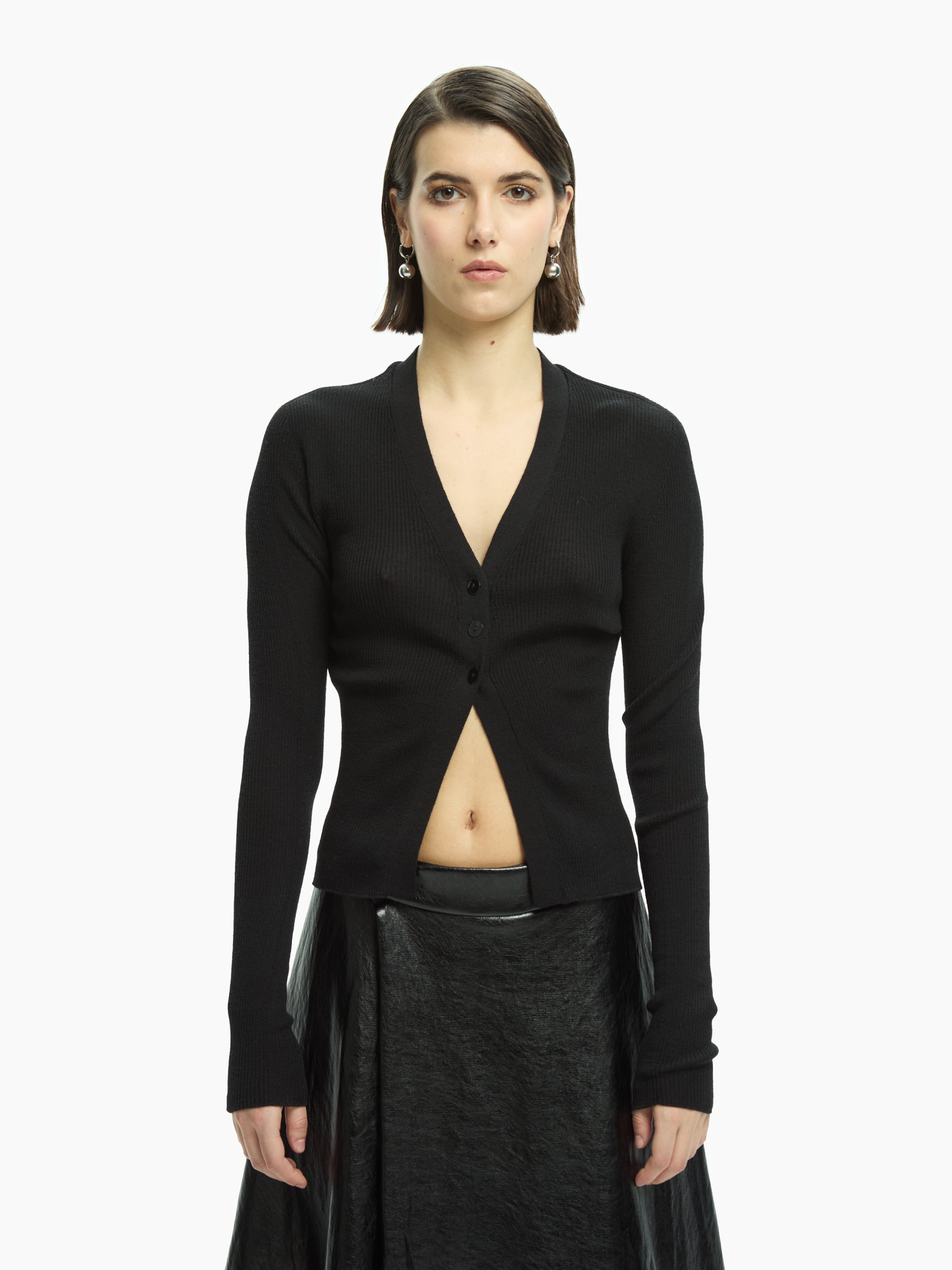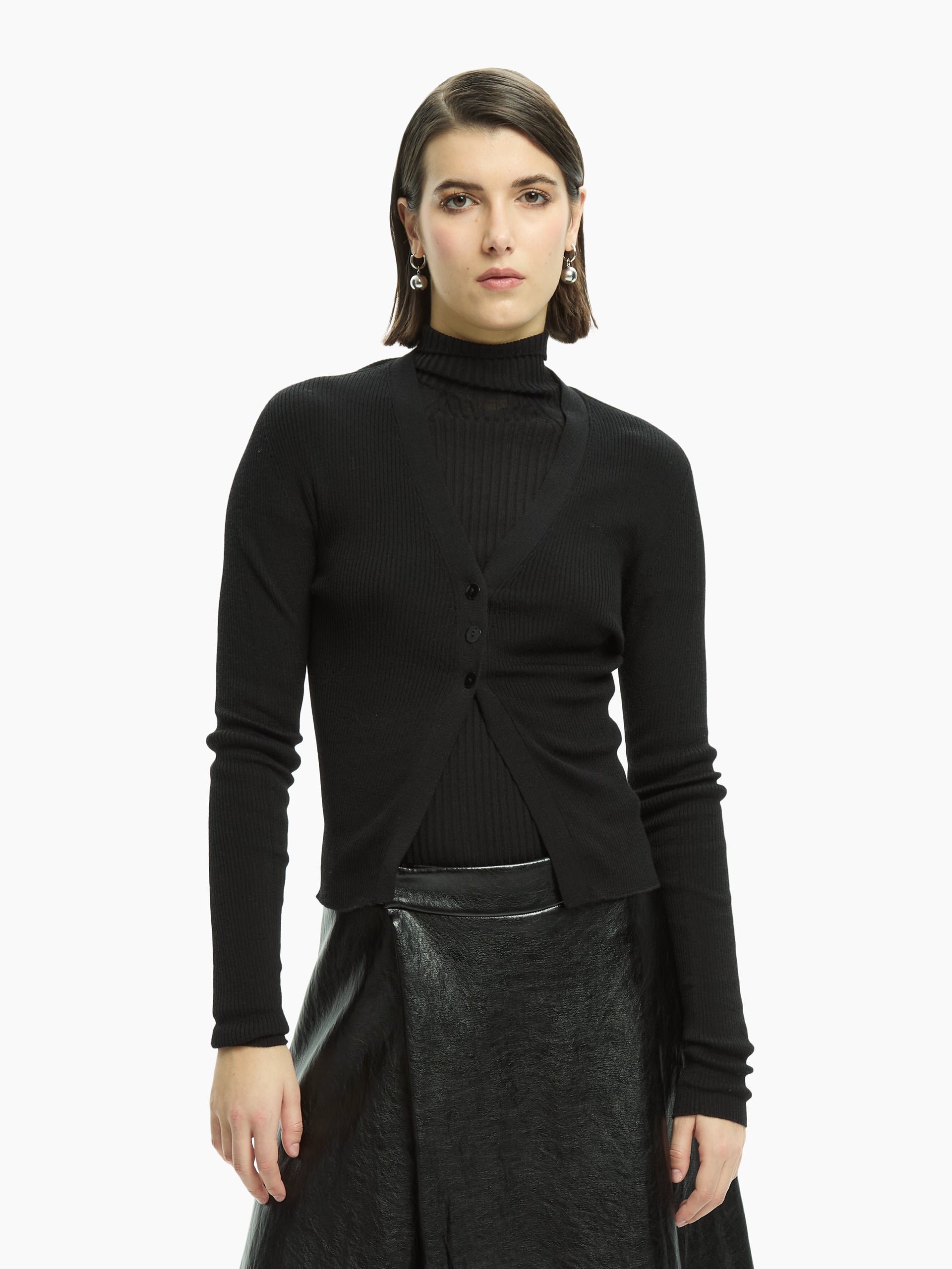 A garment that interprets elegance through layering and detail. The fitted design is enhanced by a minimalist front closure, designed to interact with the garment underneath and create a sophisticated play of depth. The clean lines and ribbed knit provide balance and definition, making it ideal for creating contemporary looks with a bold character.
