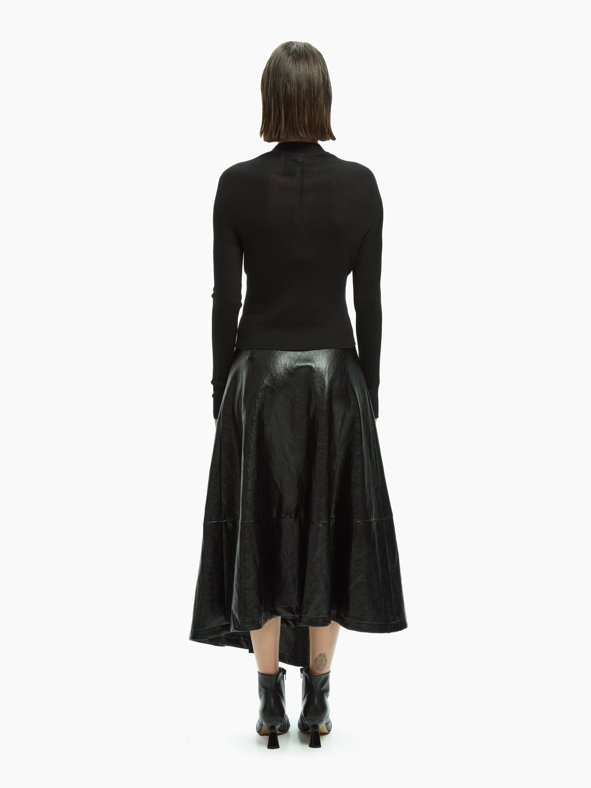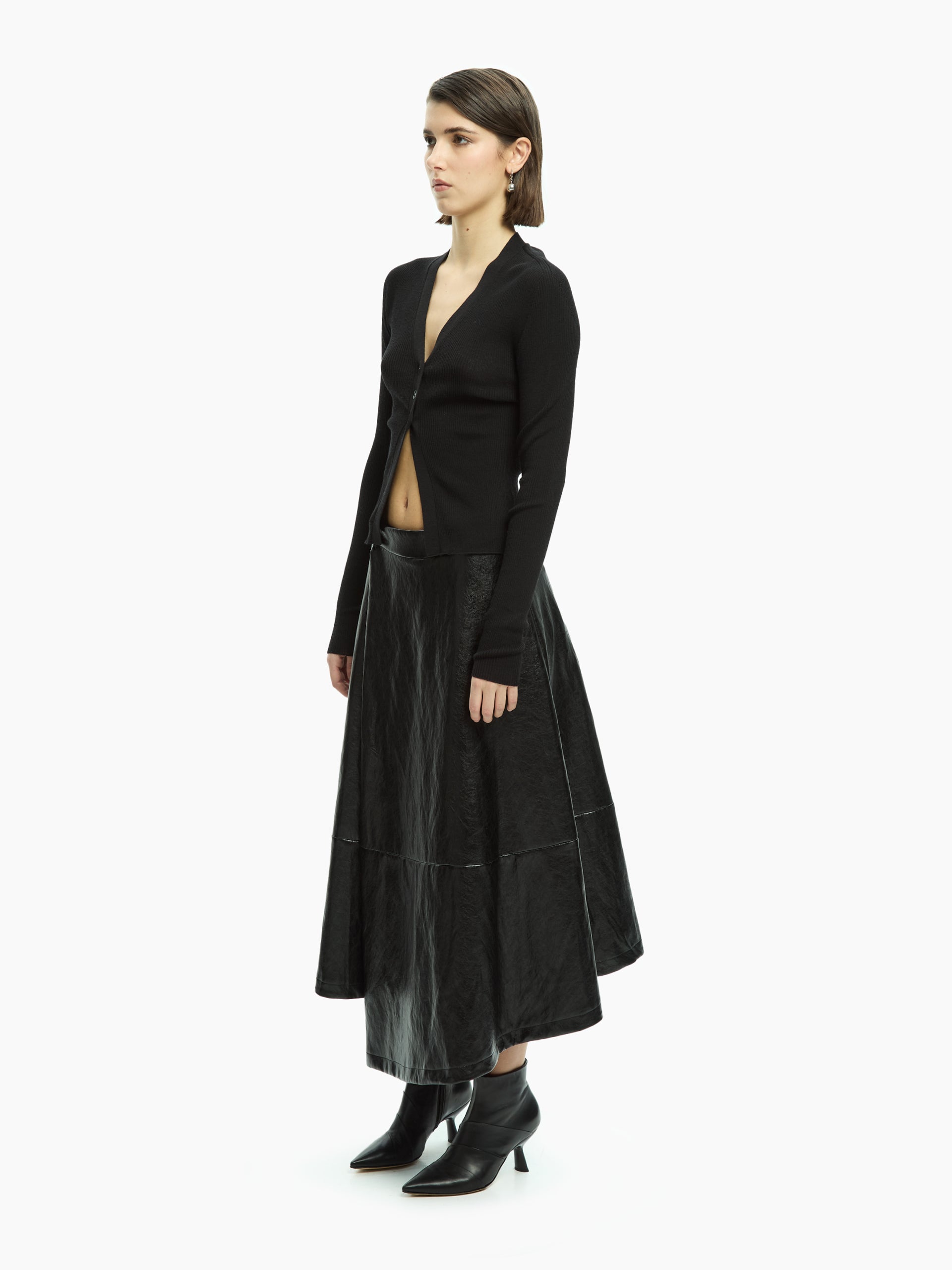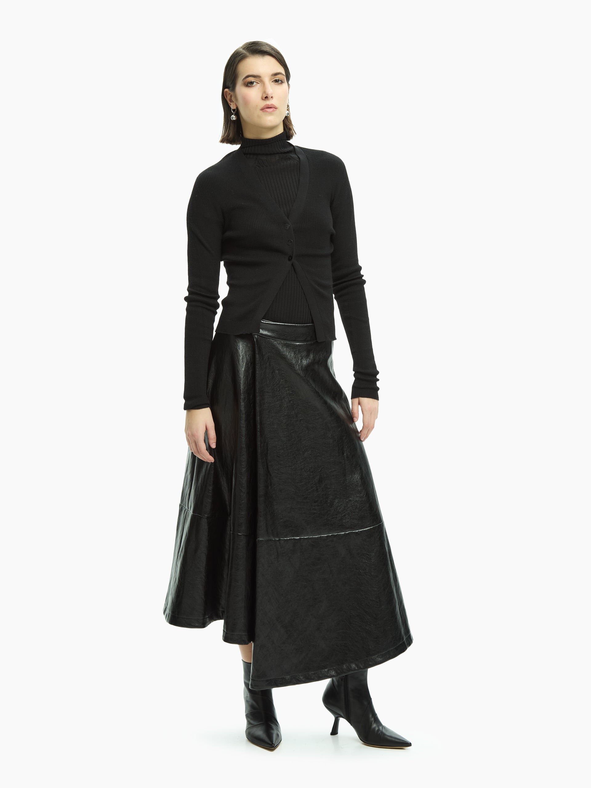 A garment that interprets elegance through layering and detail. The fitted design is enhanced by a minimalist front closure, designed to interact with the garment underneath and create a sophisticated play of depth. The clean lines and ribbed knit provide balance and definition, making it ideal for creating contemporary looks with a bold character.