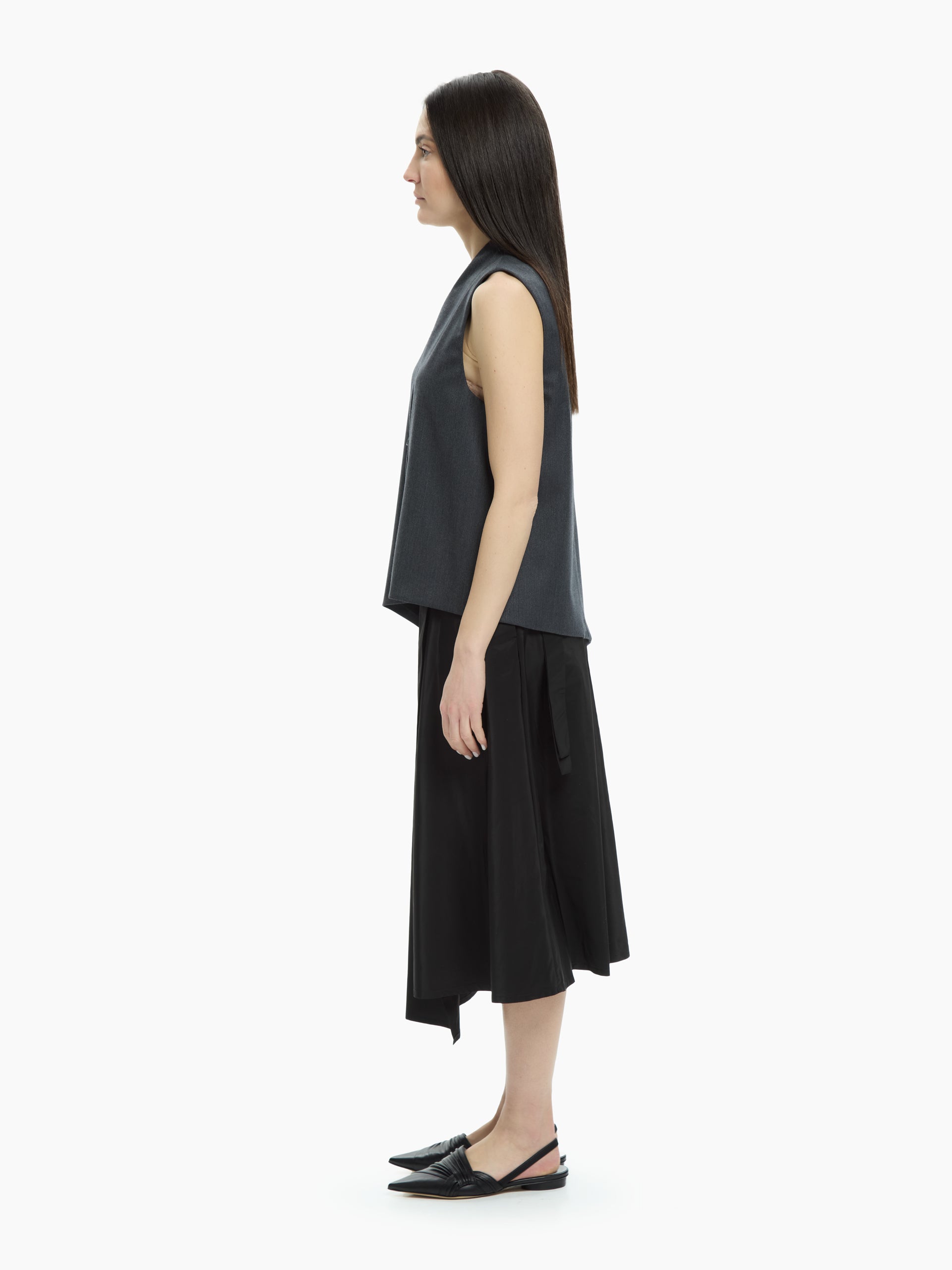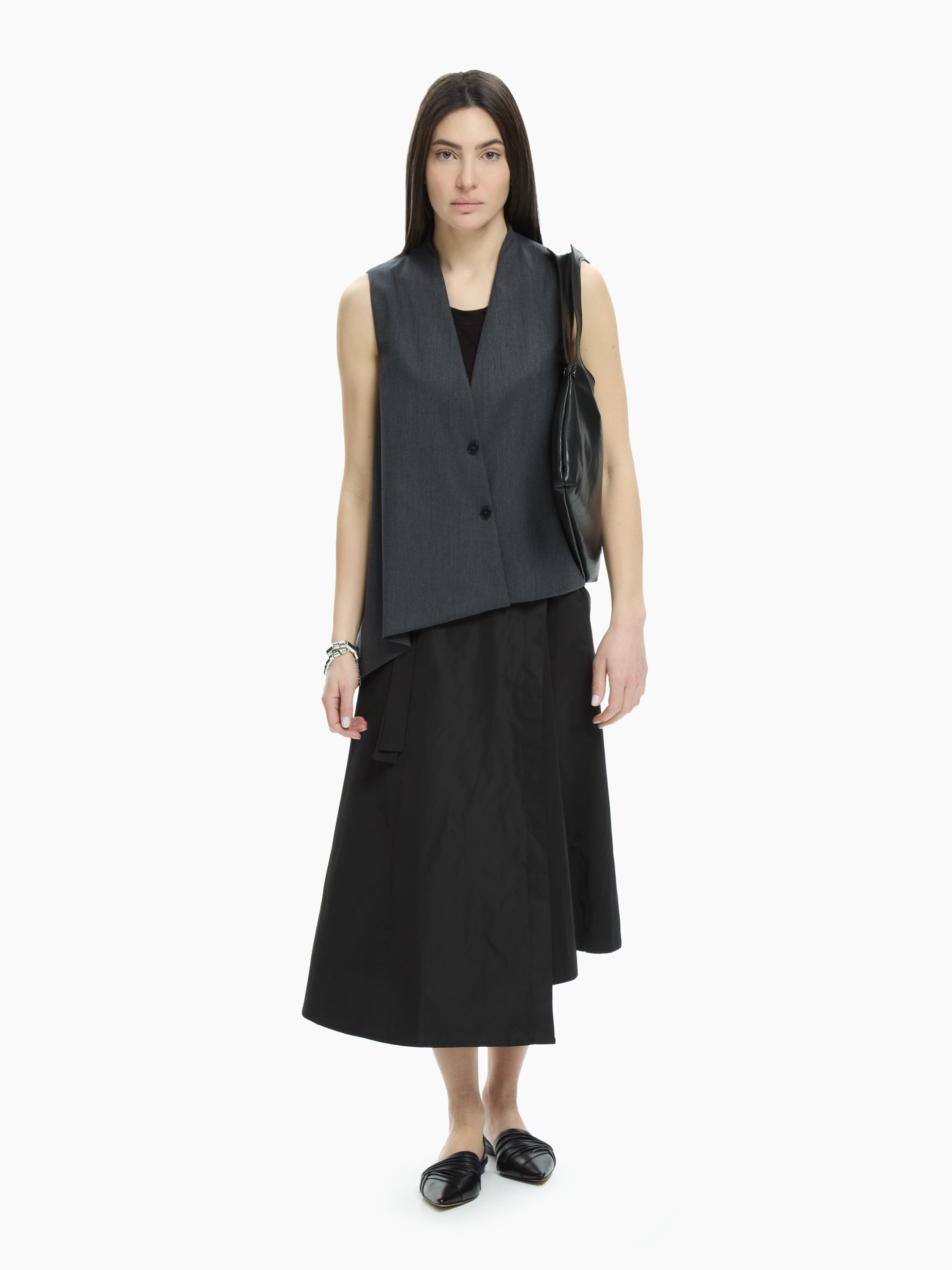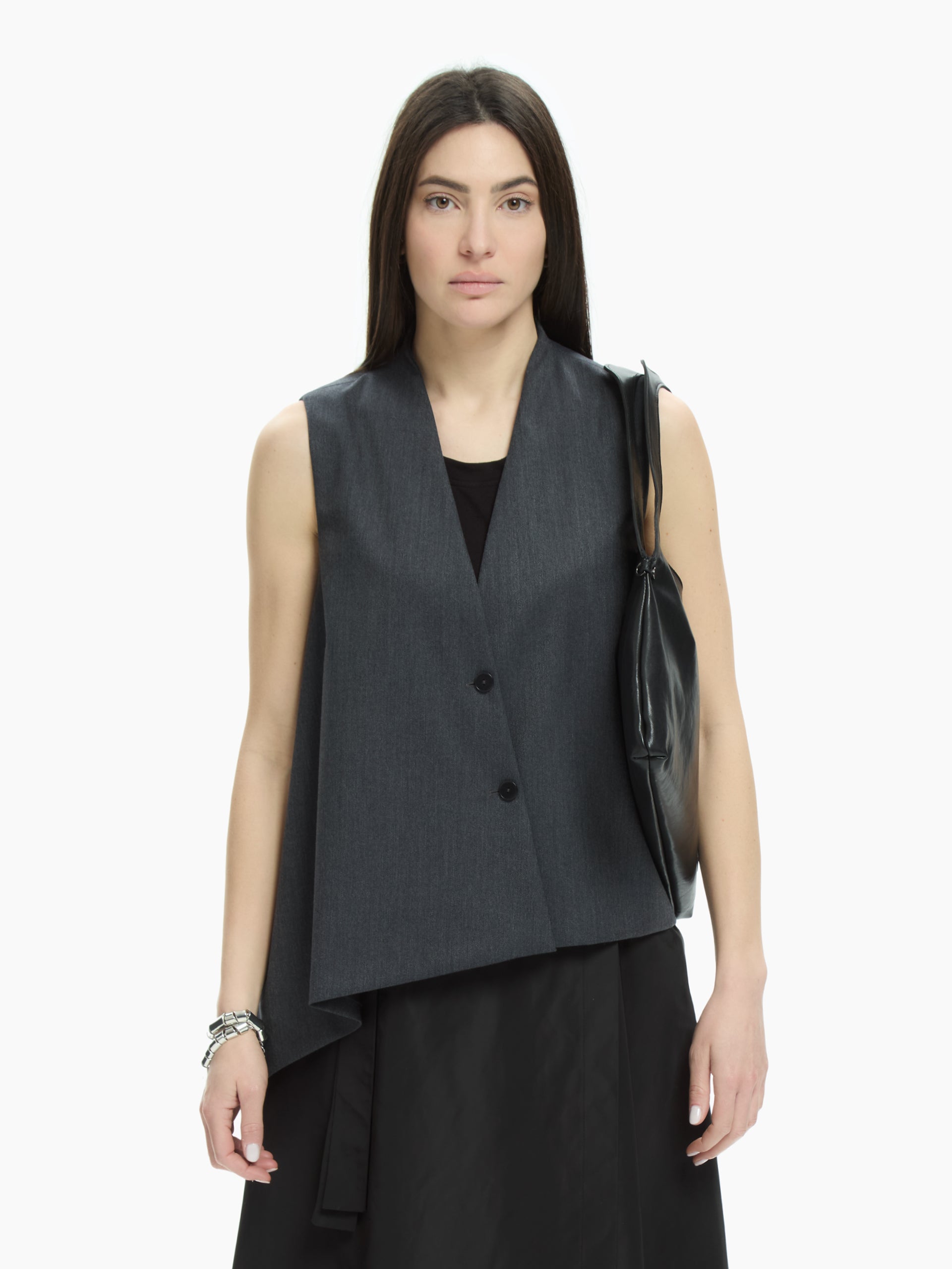 Minimalist and contemporary elegance defines this clean-cut, slightly asymmetrical vest. Its streamlined construction and relaxed fit make it perfect for wearing alone or layered.
