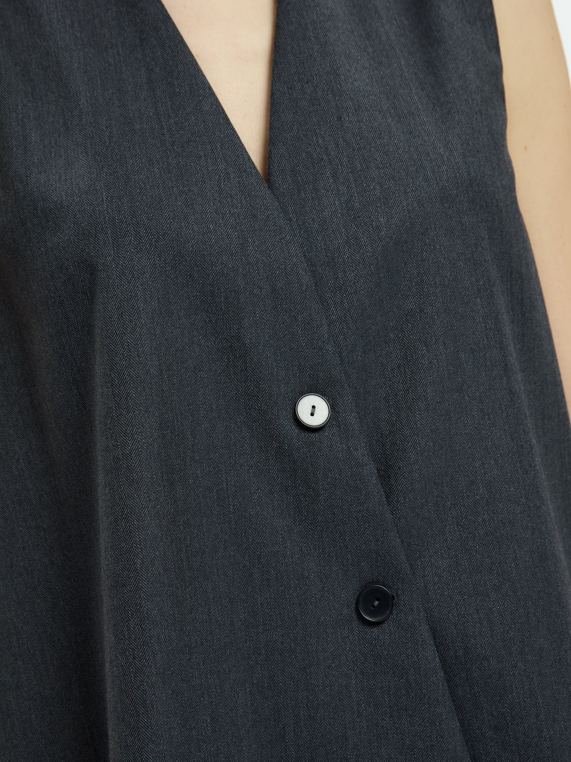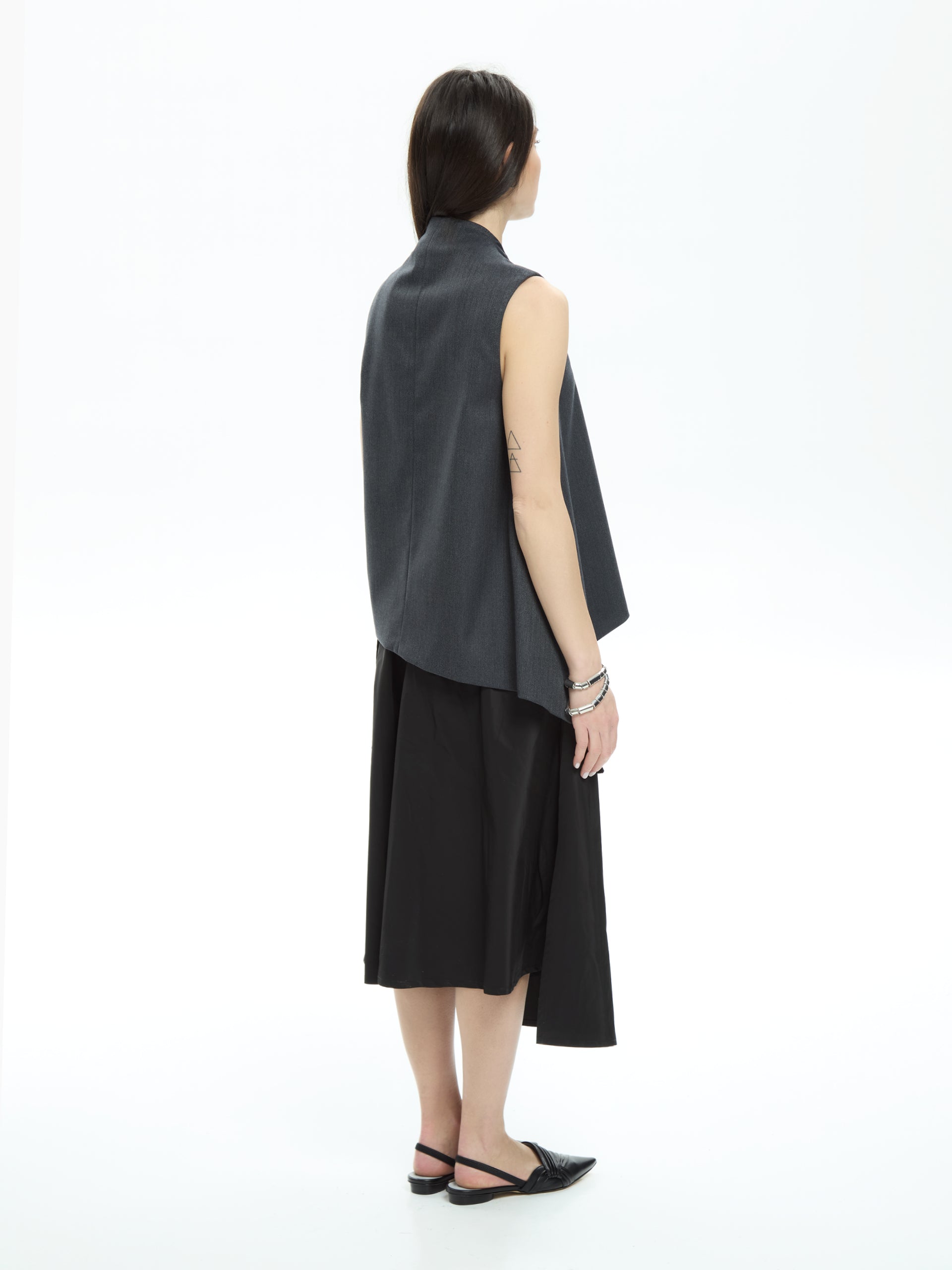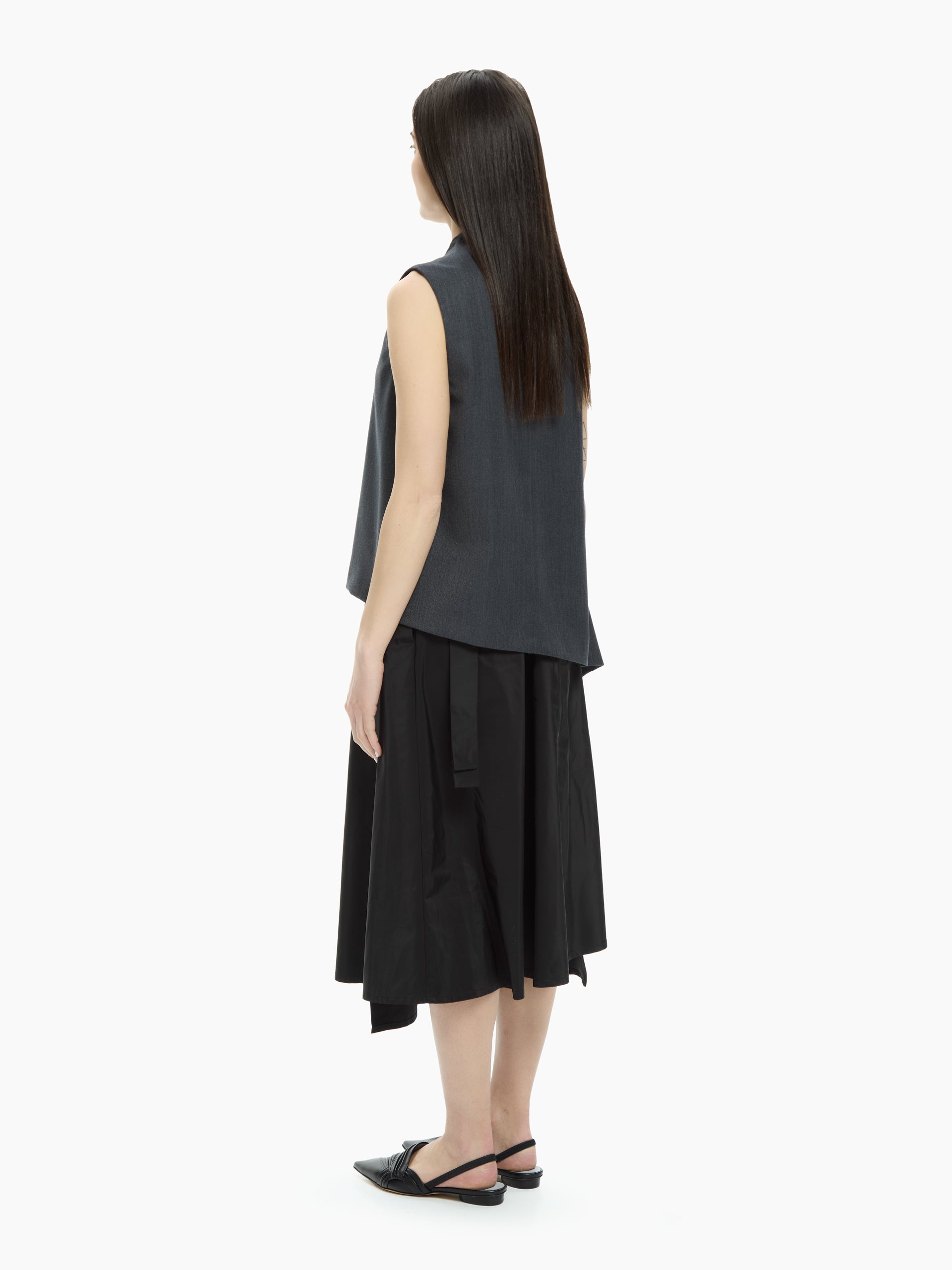 Minimalist and contemporary elegance defines this clean-cut, slightly asymmetrical vest. Its streamlined construction and relaxed fit make it perfect for wearing alone or layered.