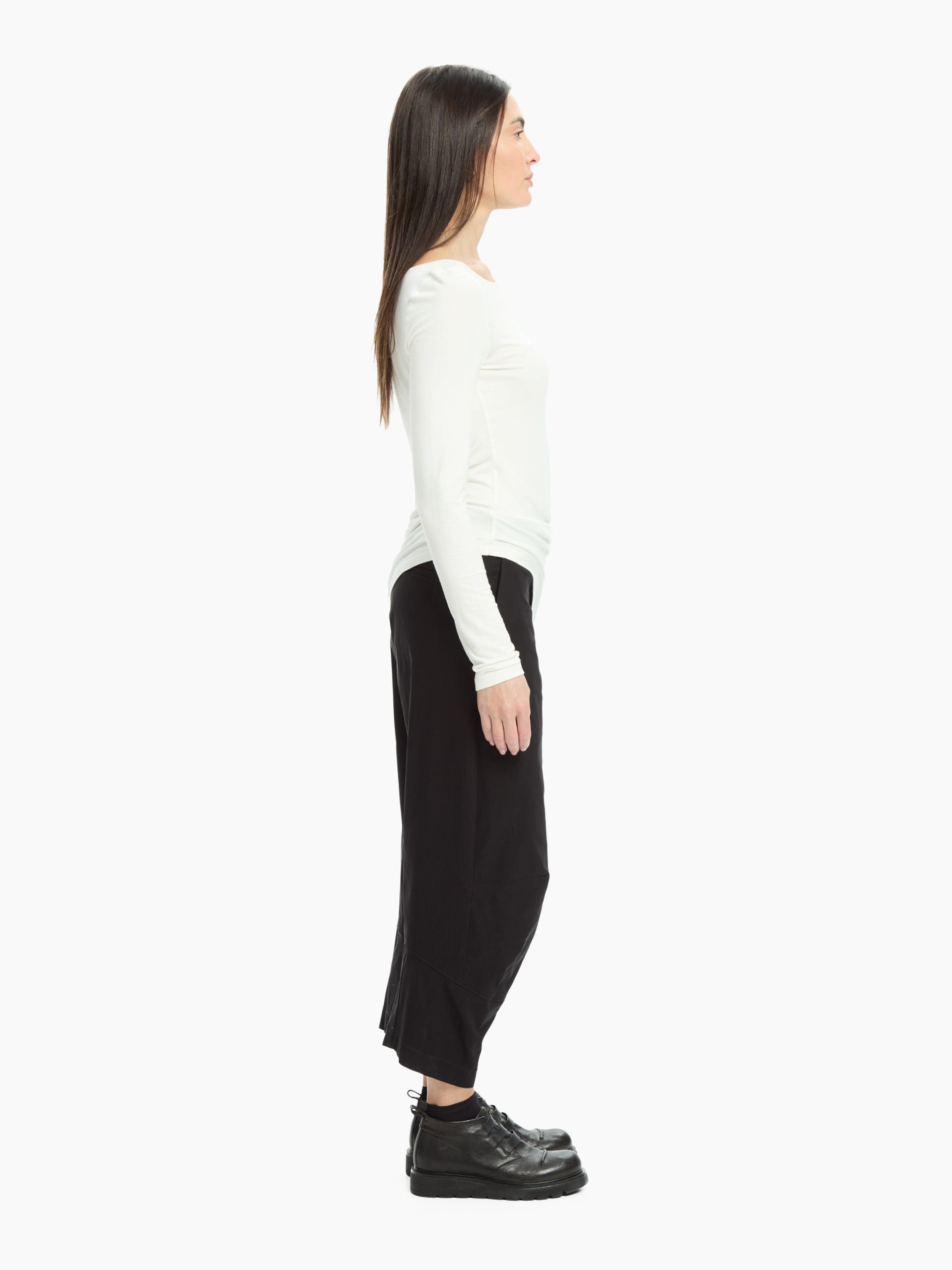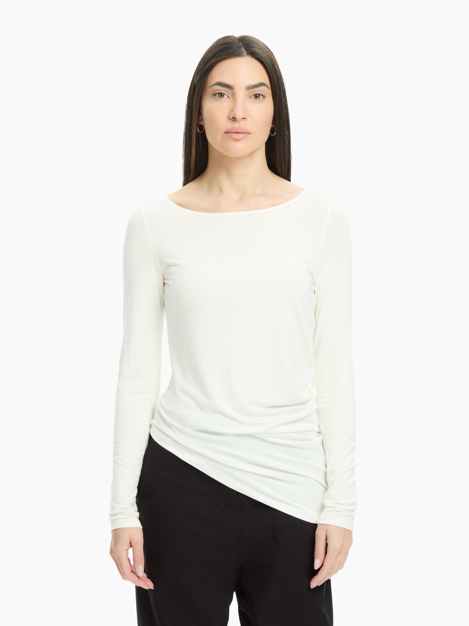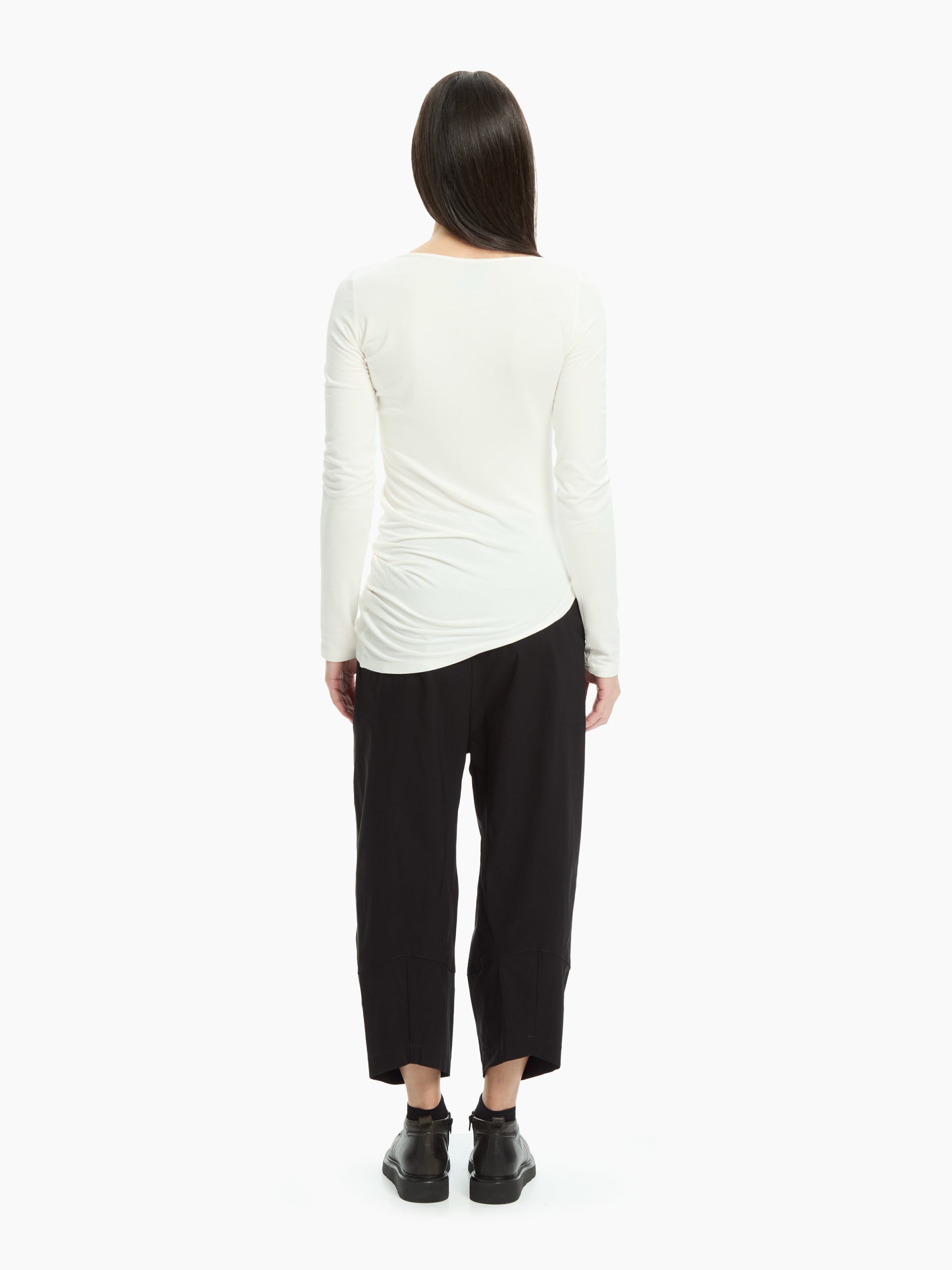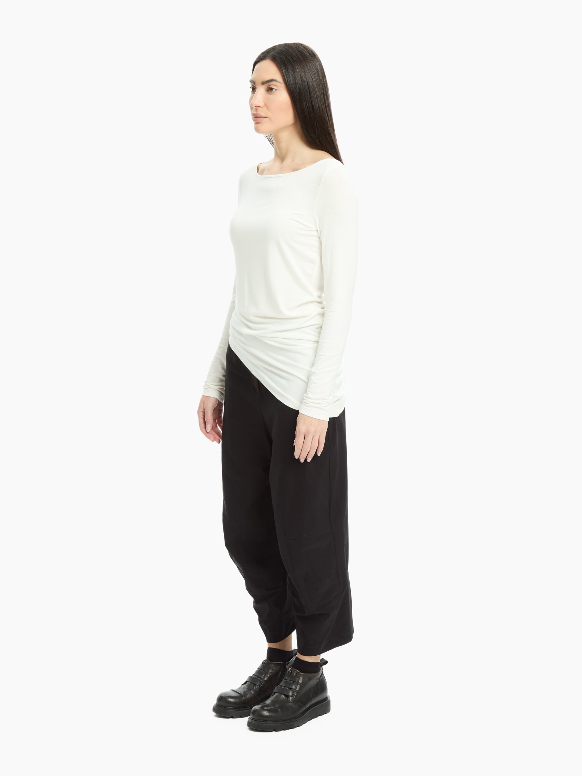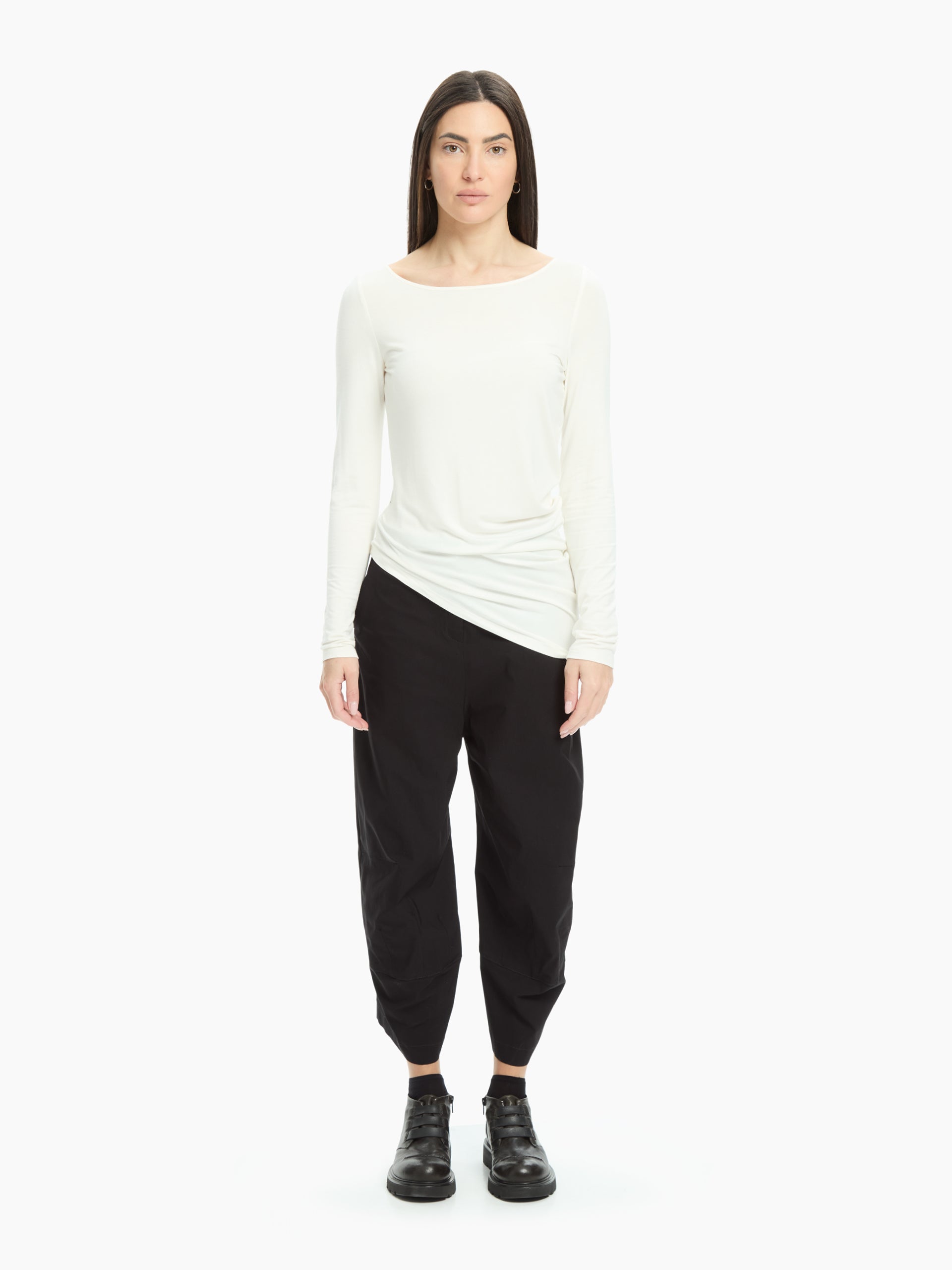 Un capo essenziale e versatile, pensato per un’eleganza quotidiana. Il design minimal e la costruzione pulita valorizzano la silhouette con naturalezza, mentre la linea asimmetrica sul fondo aggiunge un dettaglio discreto ma distintivo.