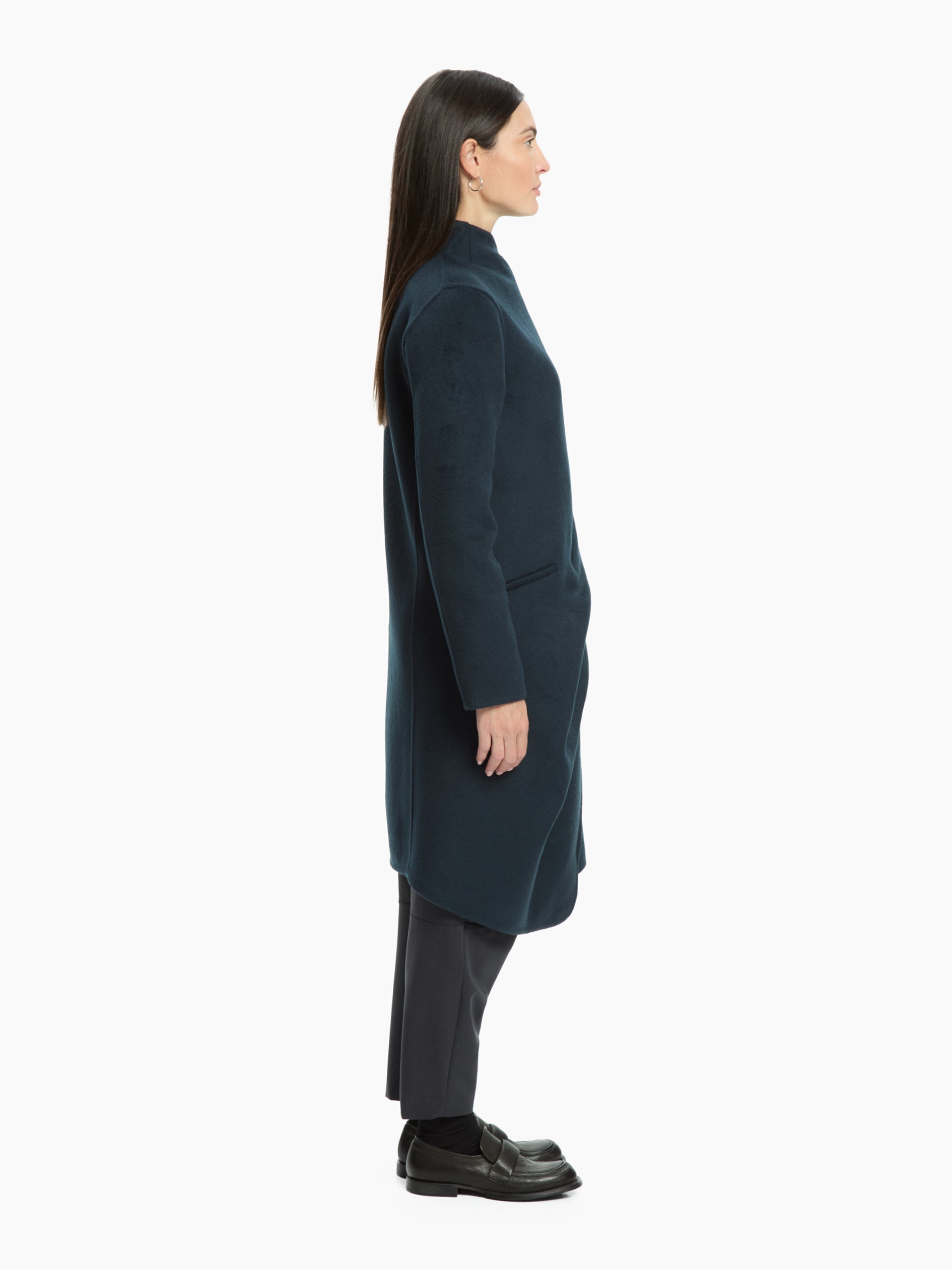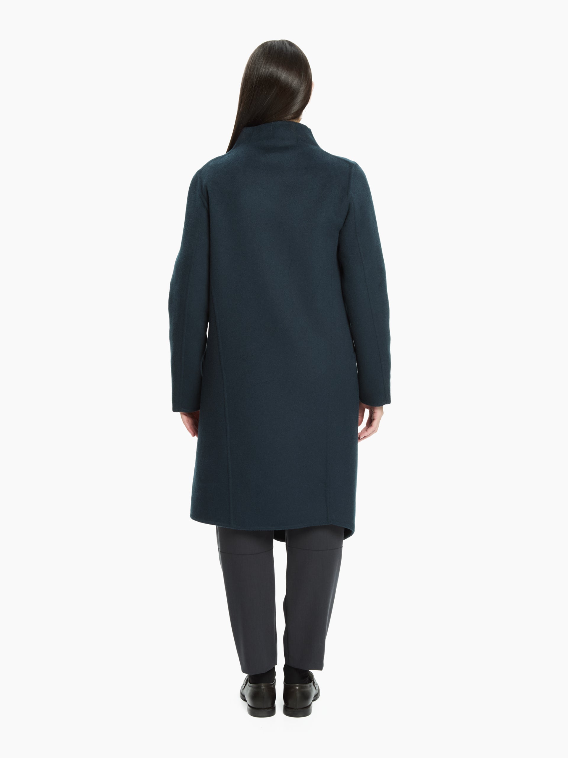 Minimalist elegance and architectural lines define the Talpax coat. Crafted from a refined compact wool fabric, this model stands out for its original asymmetrical closure that creates a sophisticated draped effect at the front.