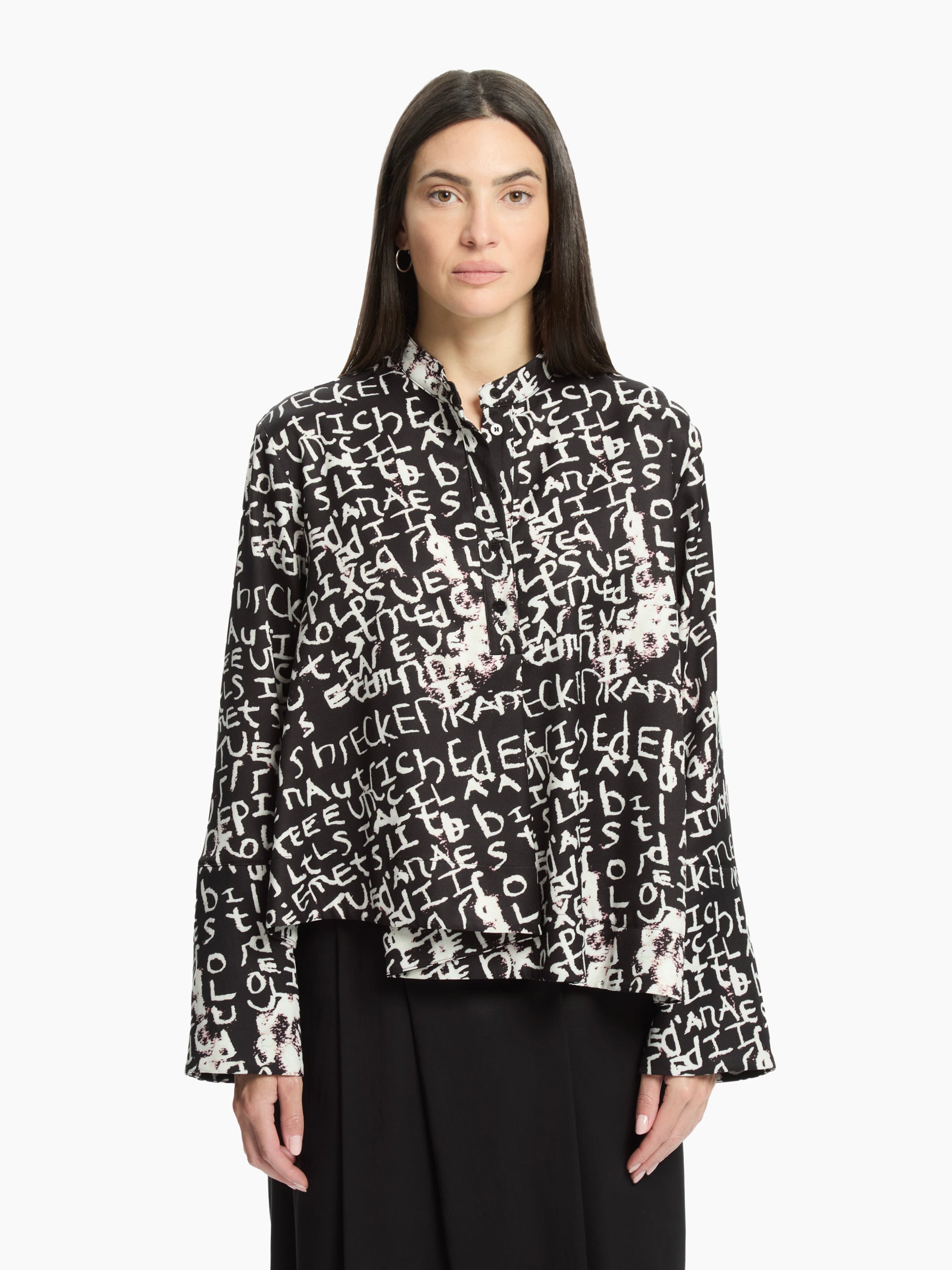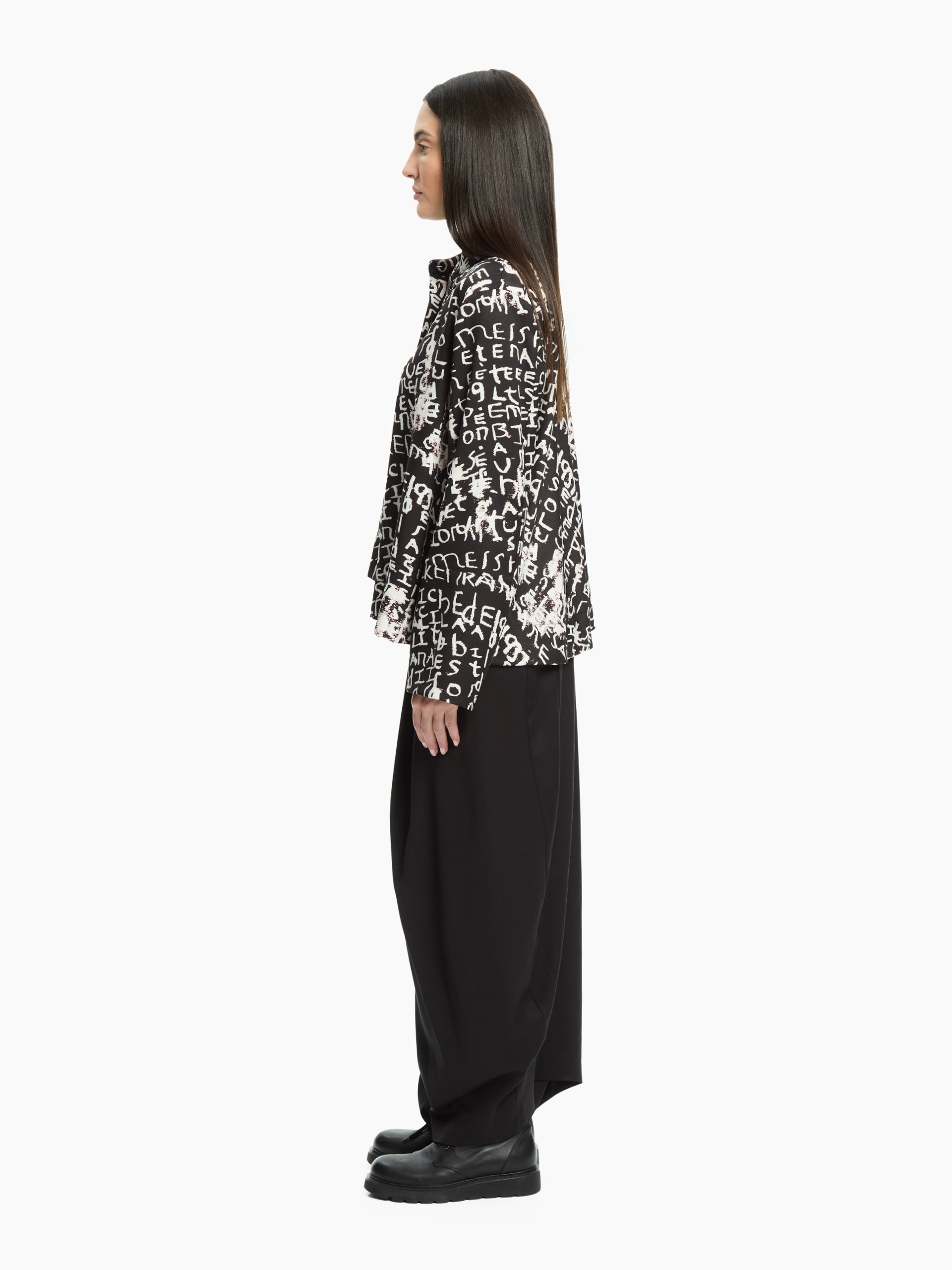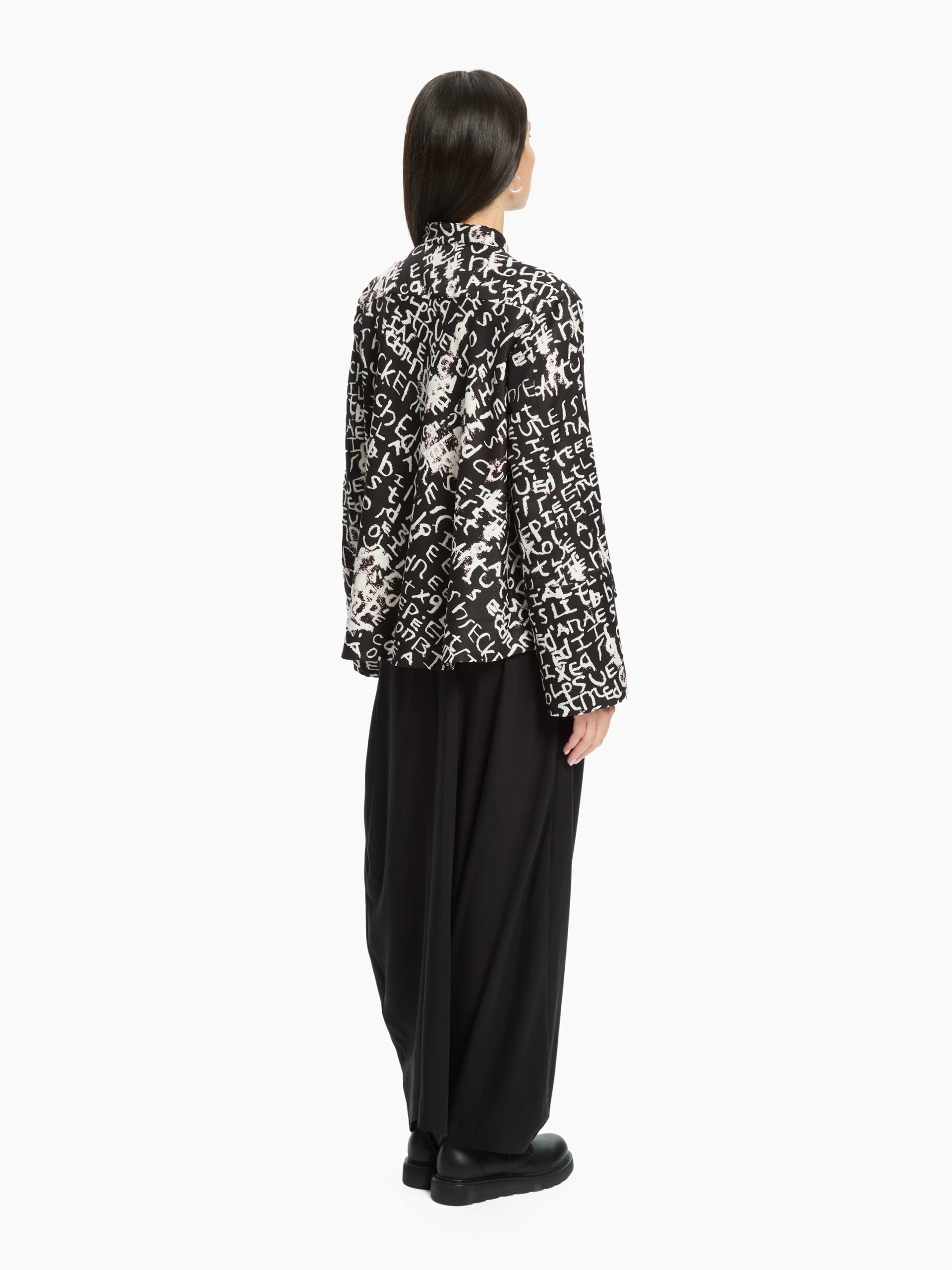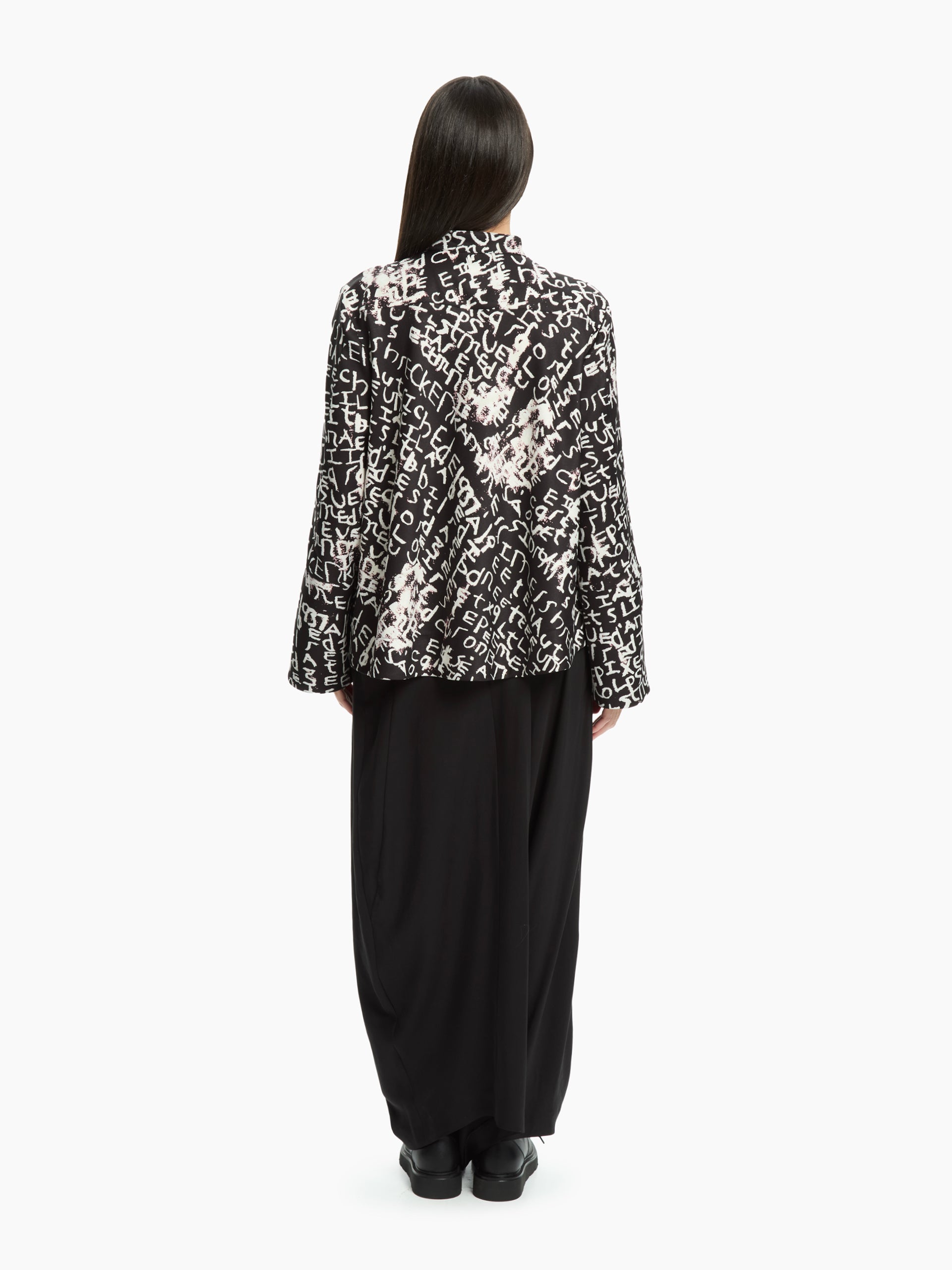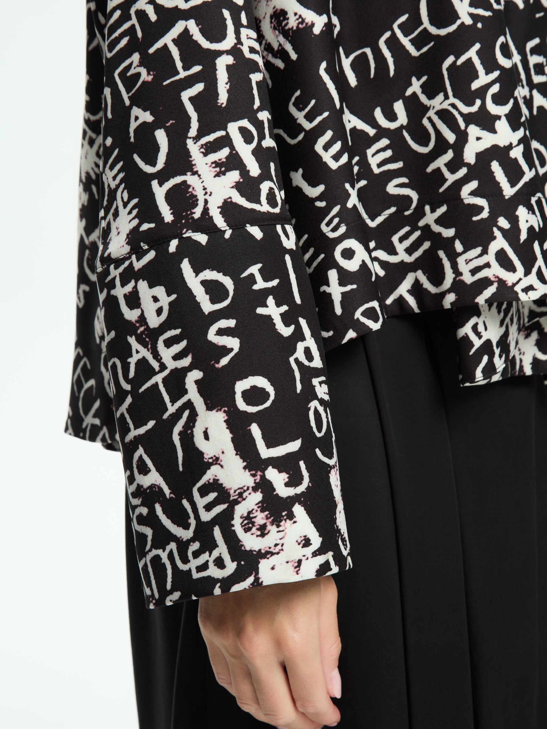 - Contrasting all-over lettering print with an artistic effect.
