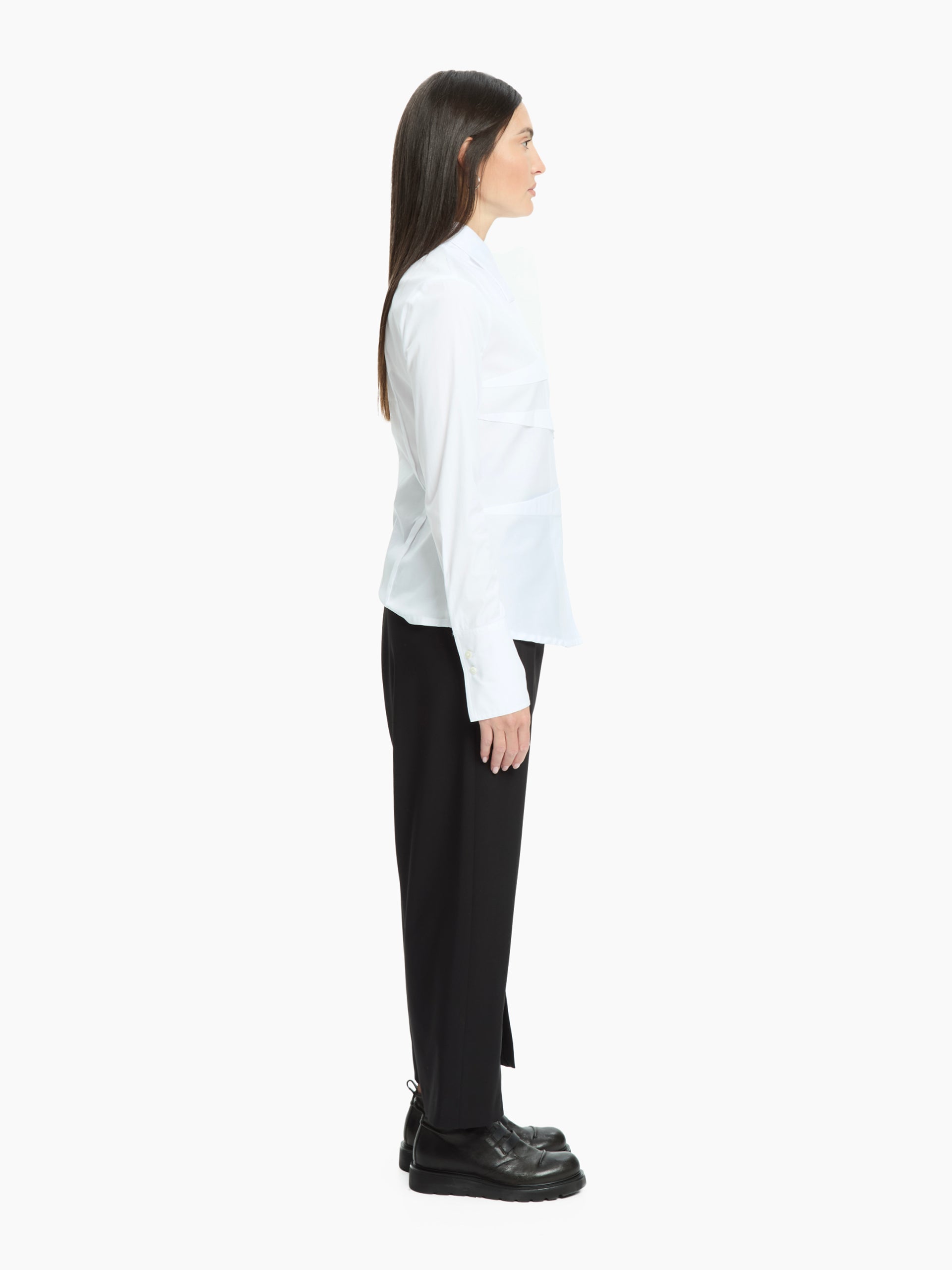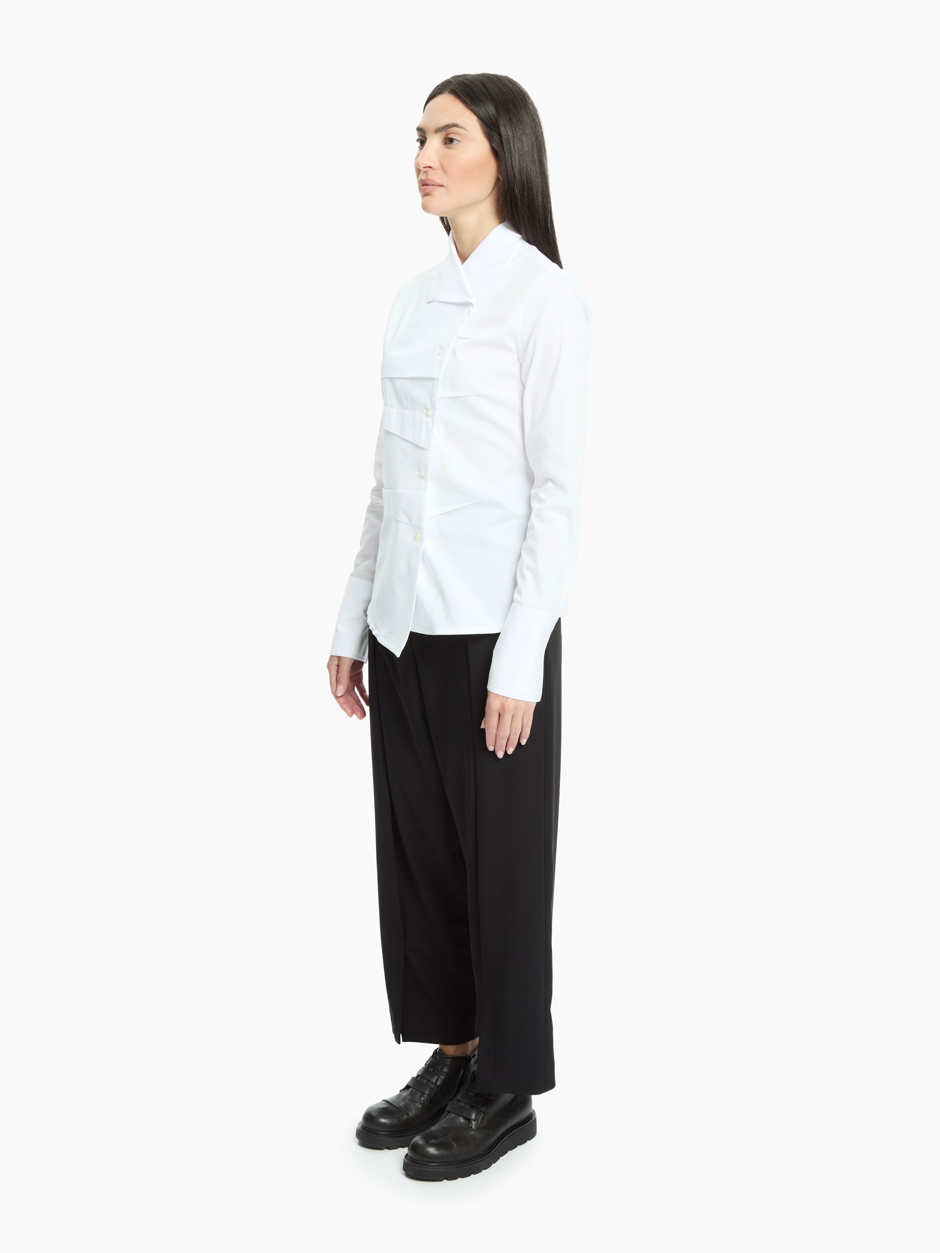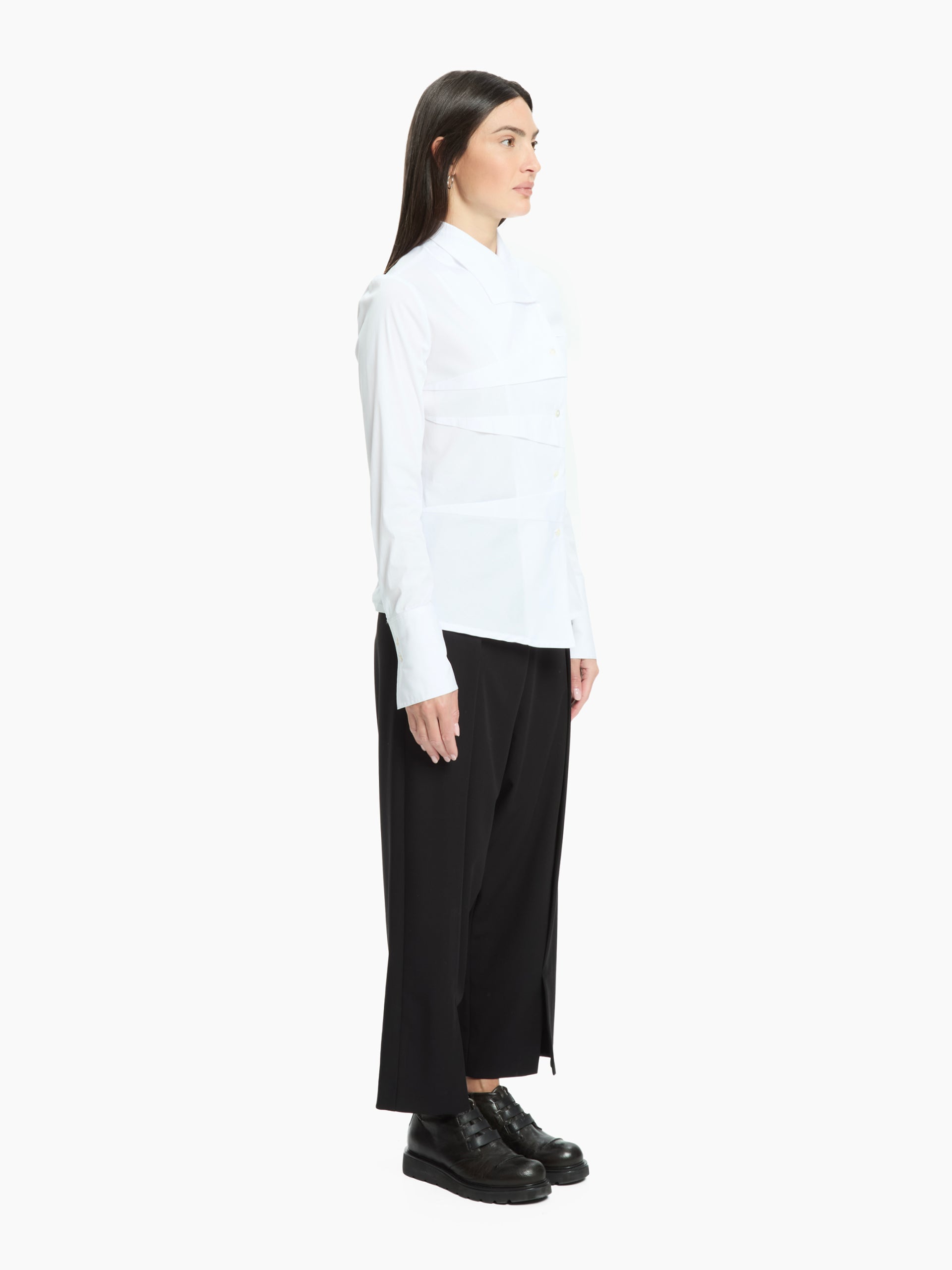 The front overlays create a play of graphic lines and discreet volumes, while the tailored construction enhances the silhouette with natural elegance. A garment that combines rigour and femininity in impeccable balance.