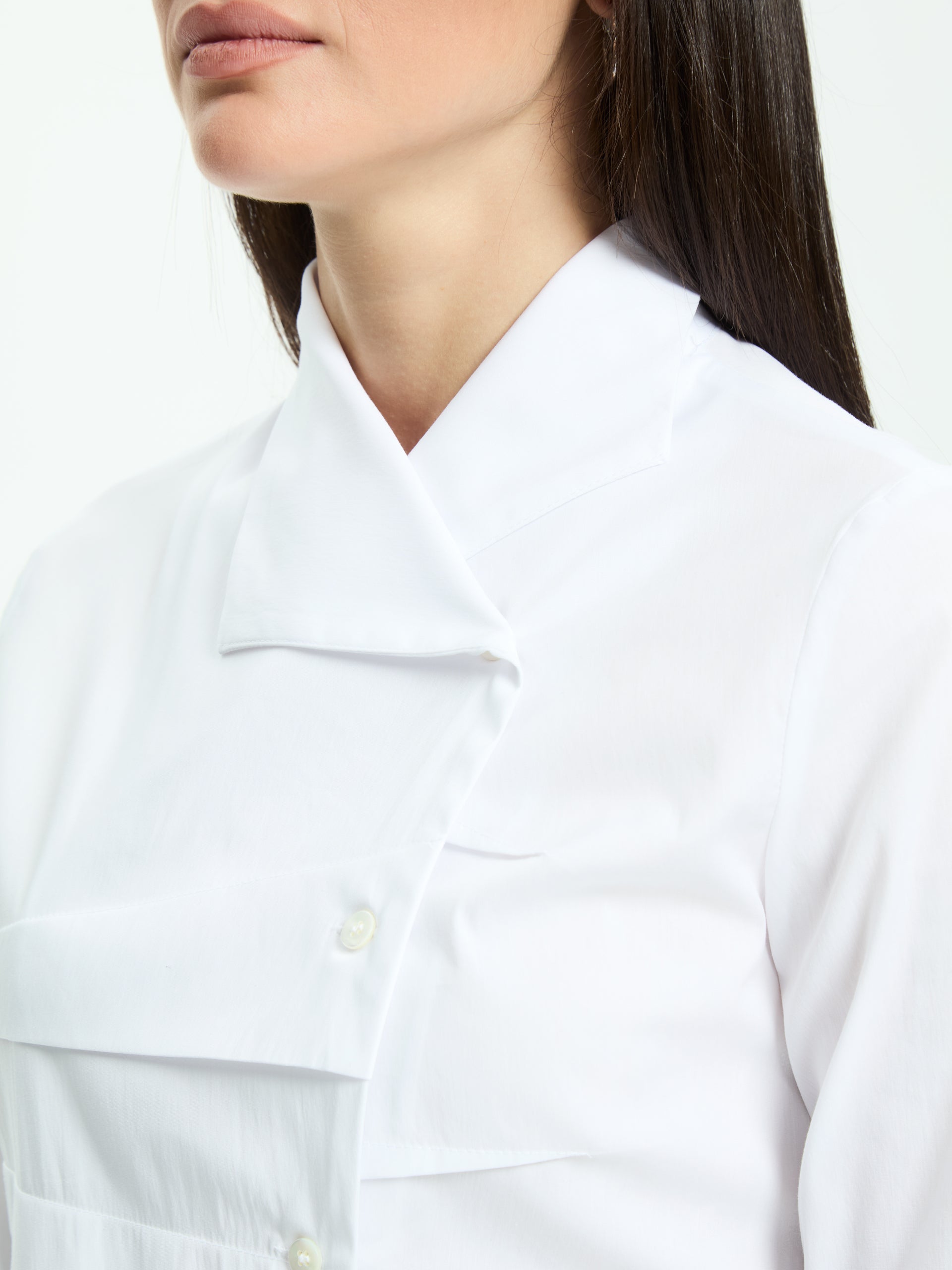 - Soft reverse collar and asymmetrical closure with hidden buttons.
