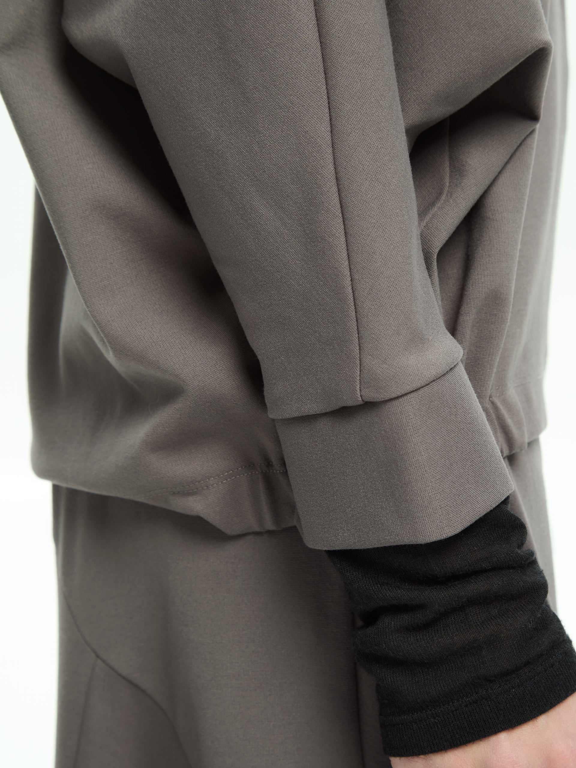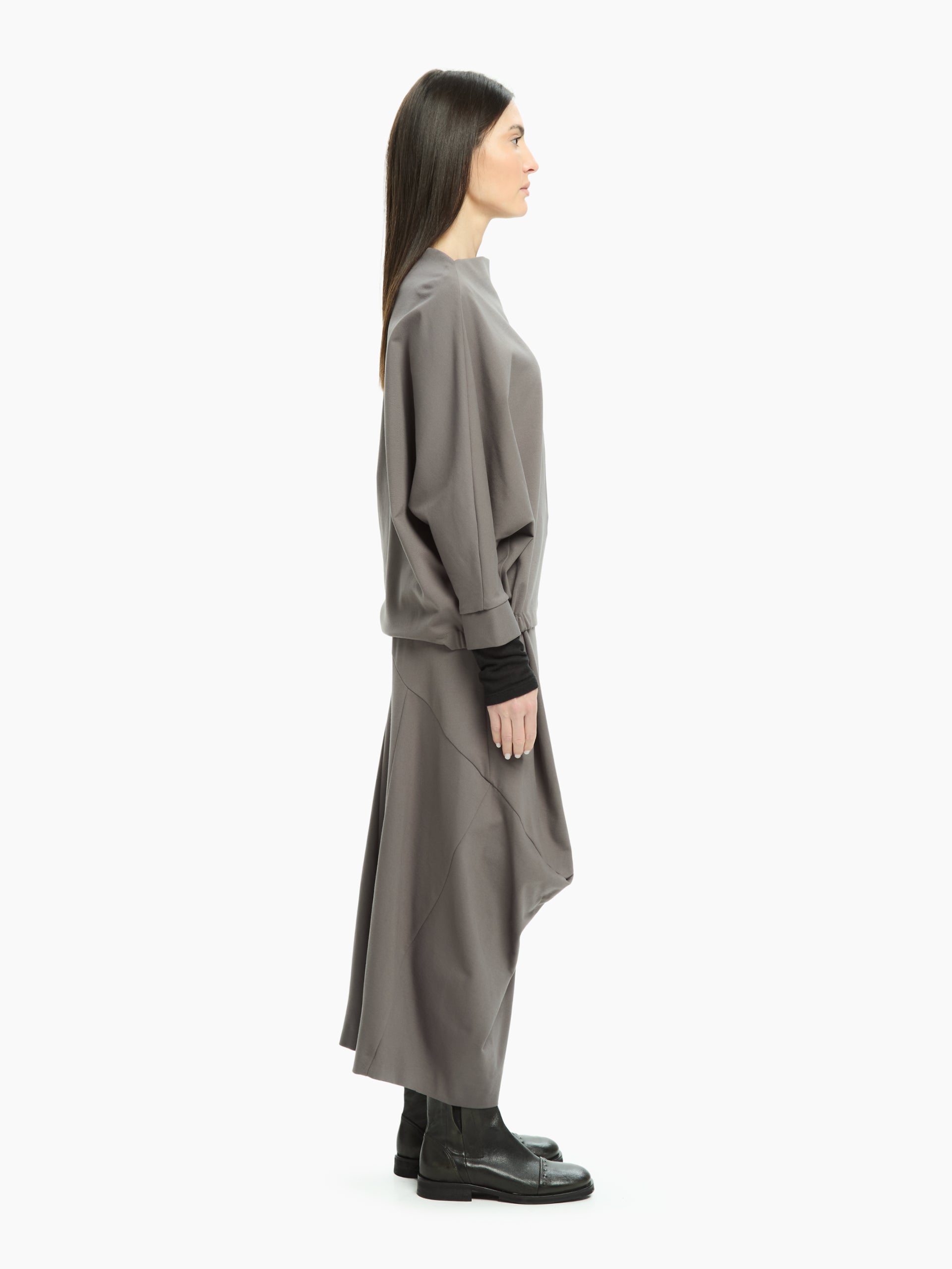 Fluid, clean and naturally sophisticated, this jumper interprets volume with an essential and harmonious aesthetic. The compact fabric maintains a structured shape while remaining soft to the touch, while the wide, slightly open neckline brightens the face and creates a relaxed allure. The wide sleeves with finished cuffs add balance to the design, creating a versatile and contemporary garment that is perfect for wearing on its own or layered.