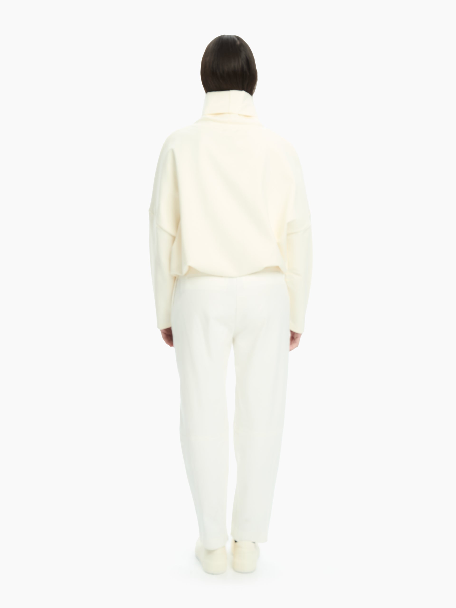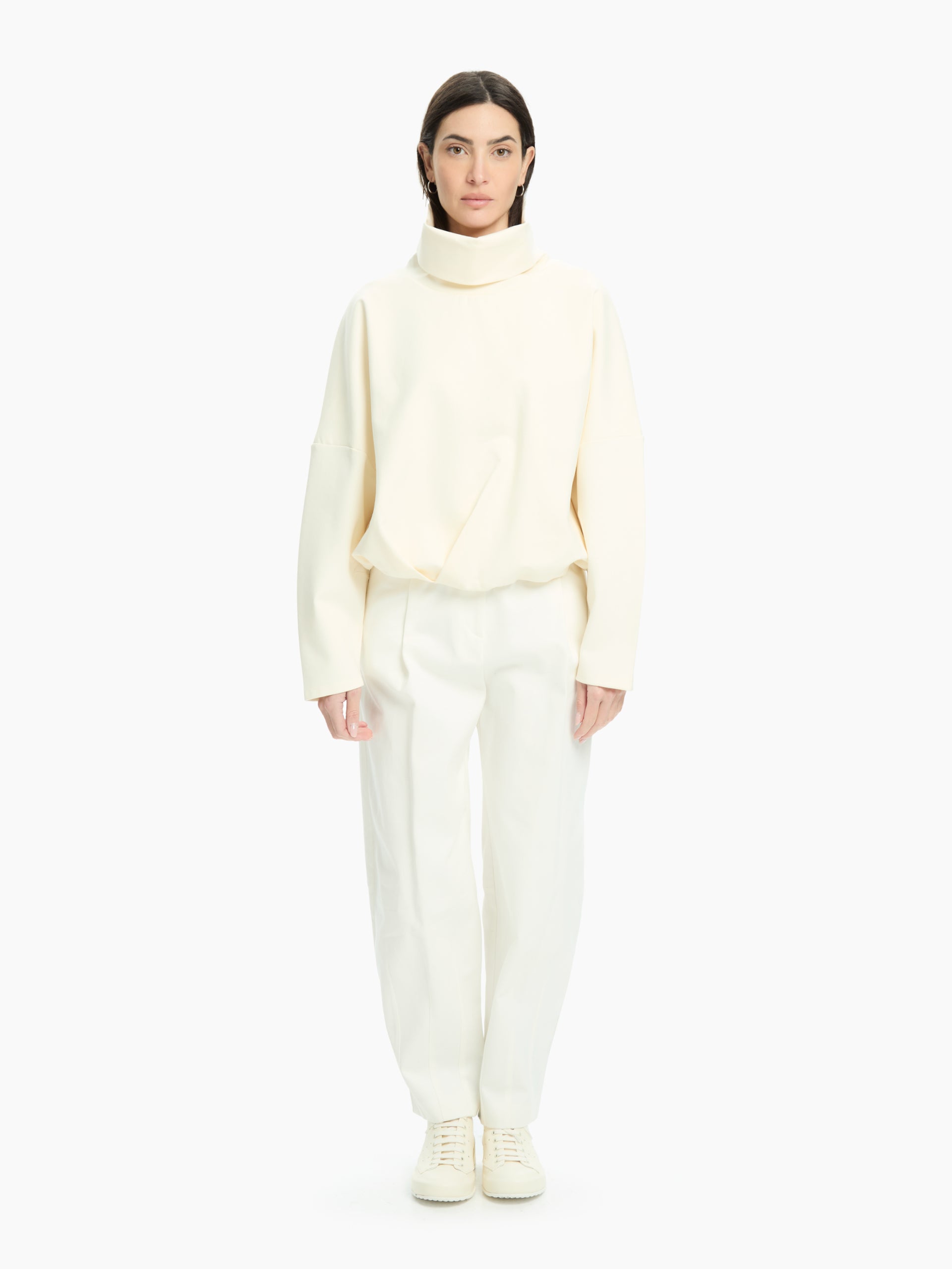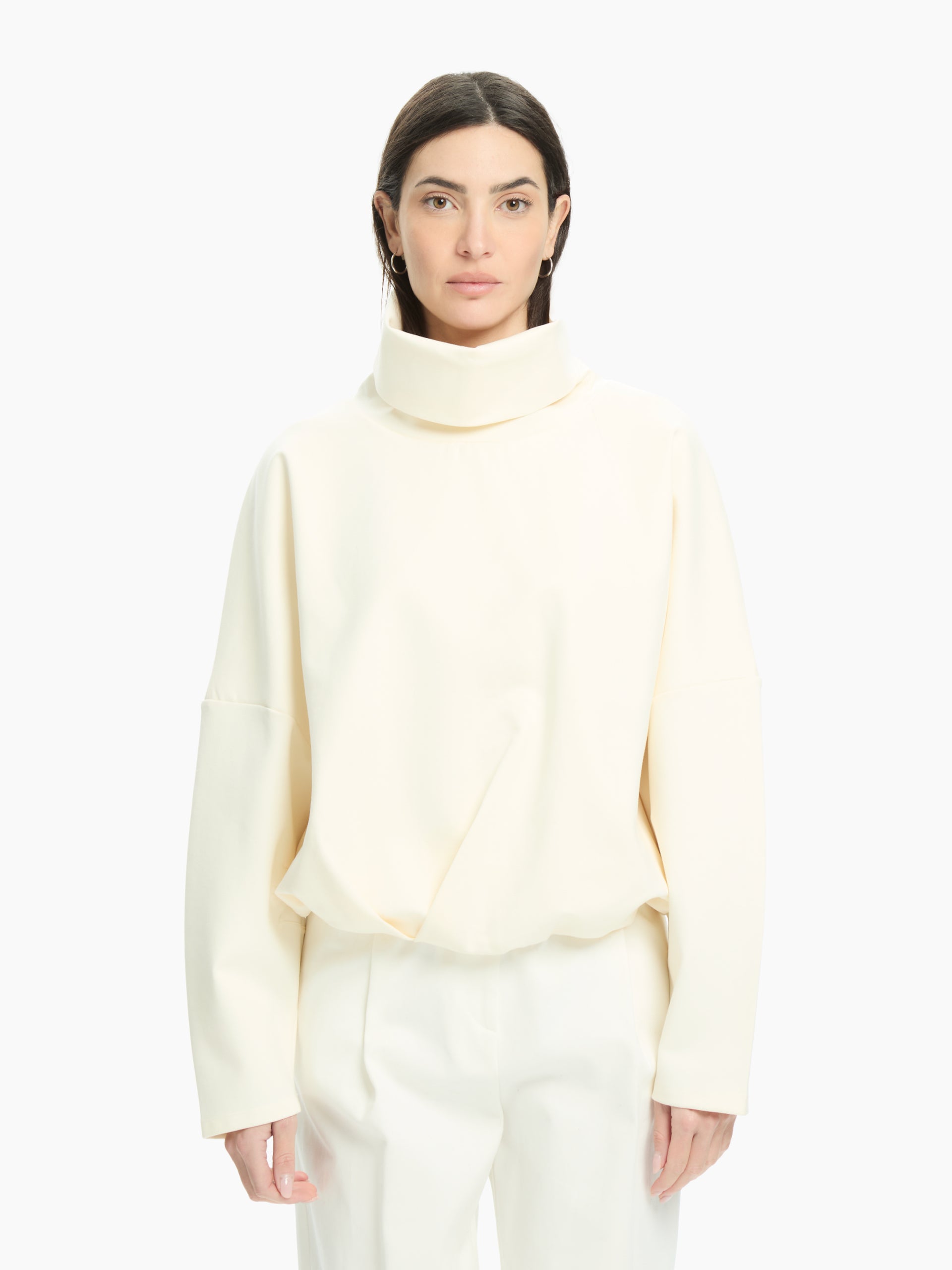 Felpa over con collo alto e linea morbida. Spalla scesa e volume ampio. Vestibilità comoda.