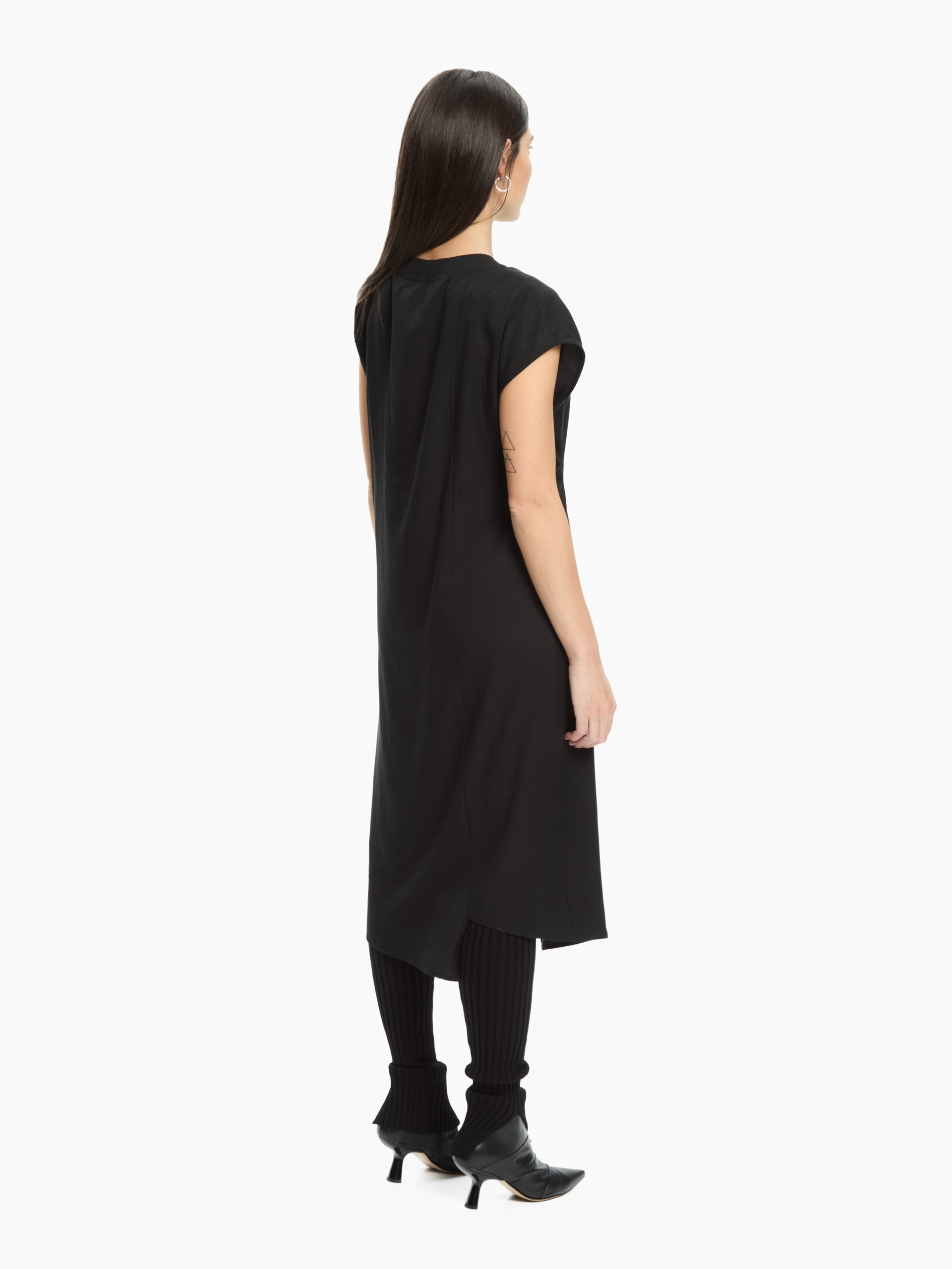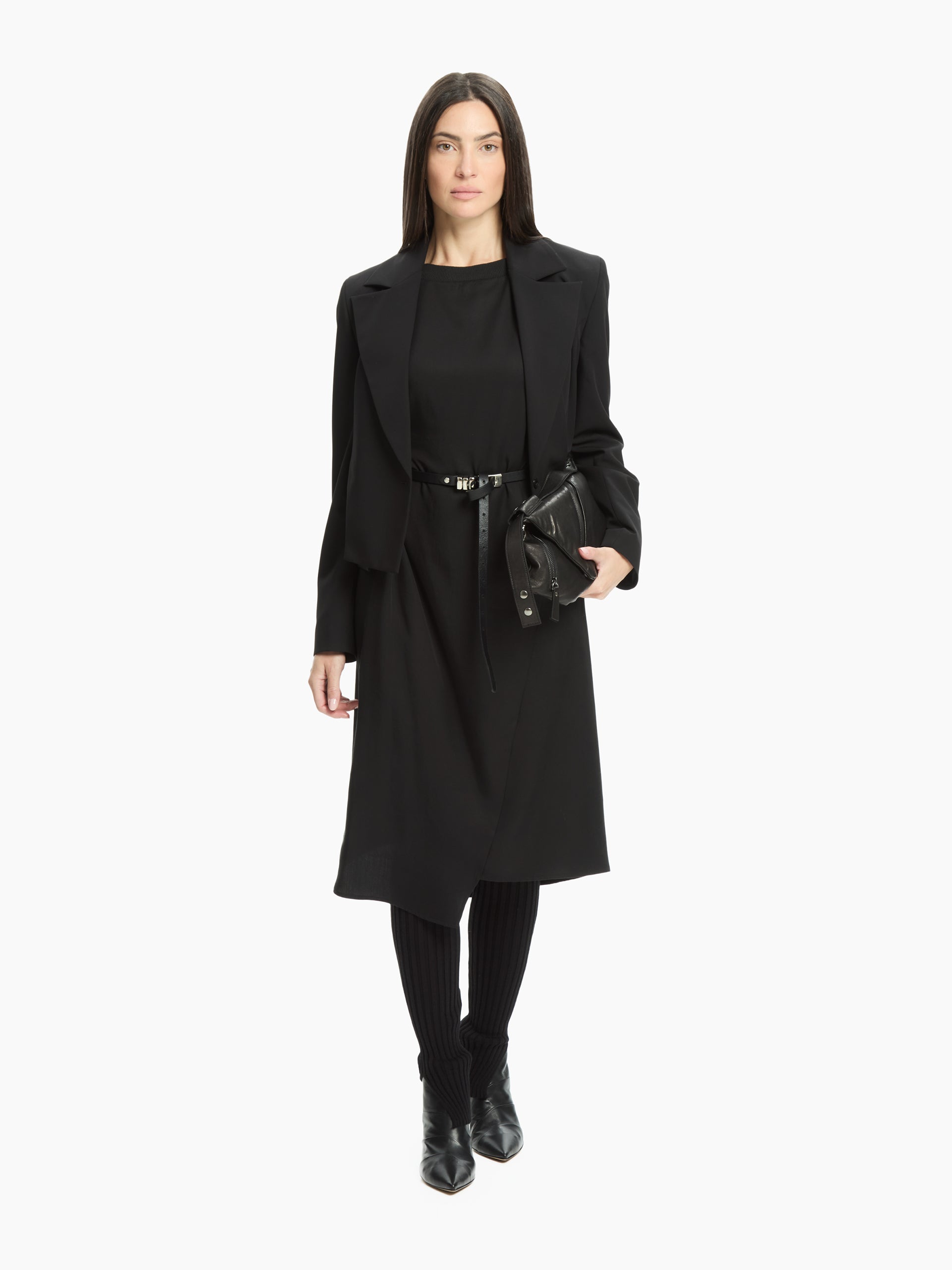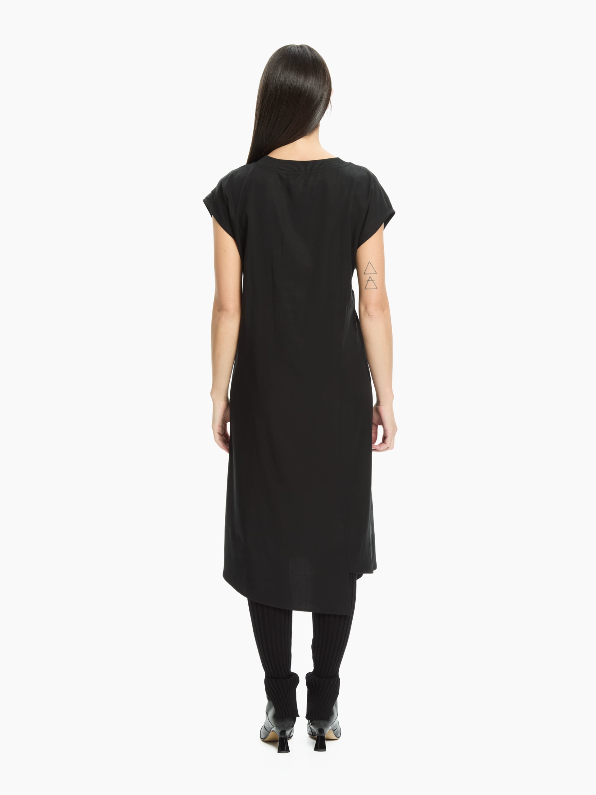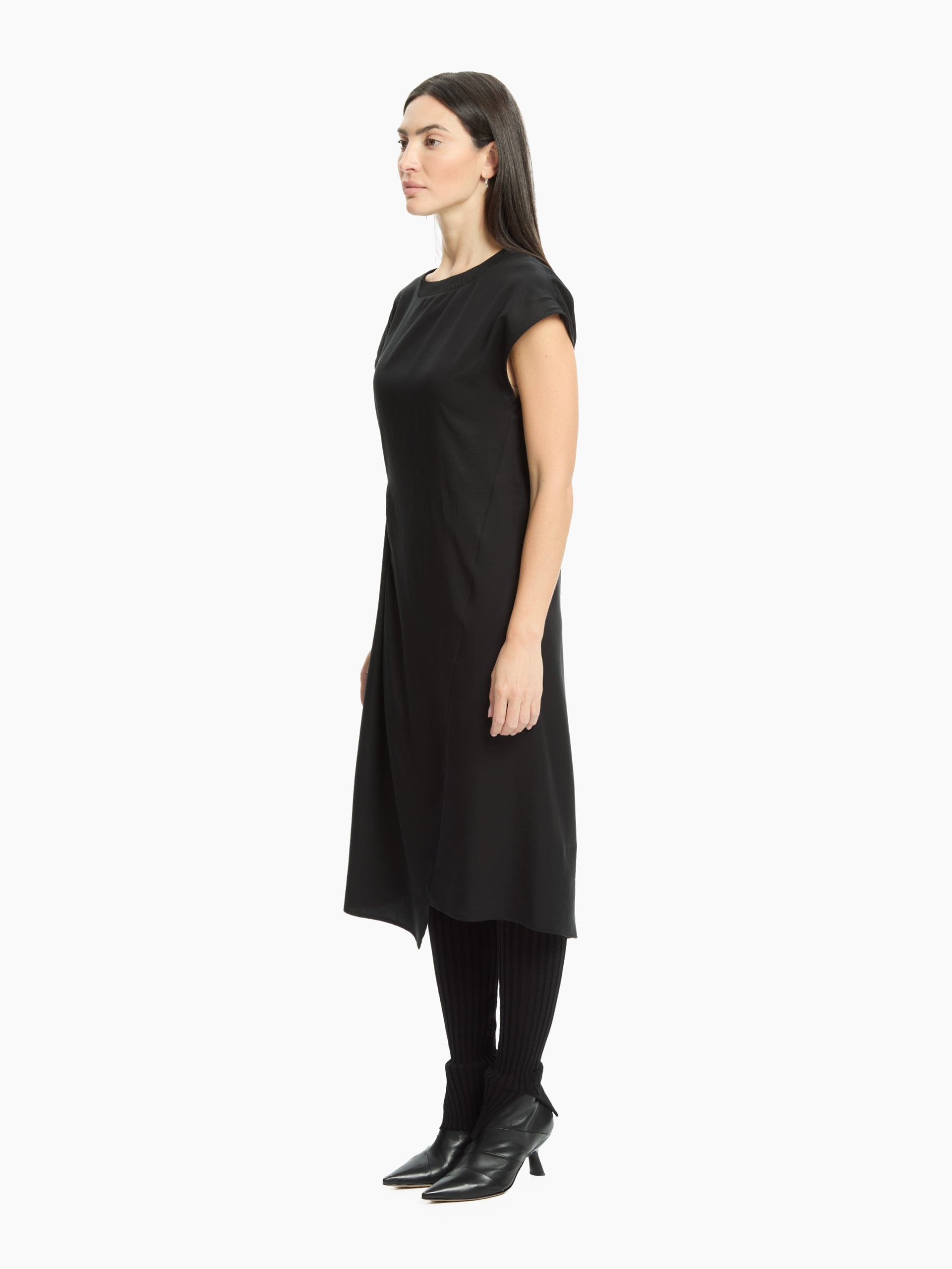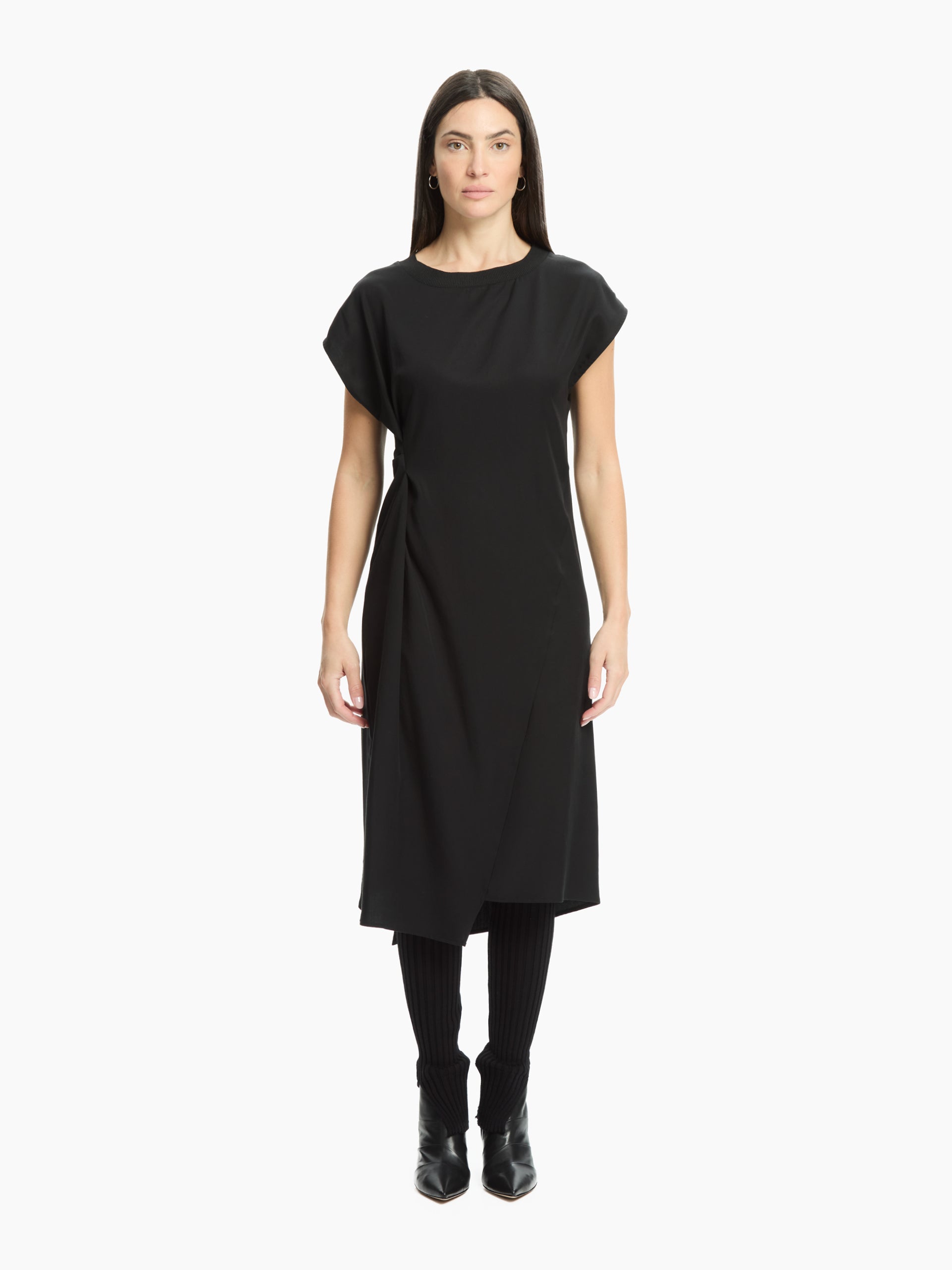 Un abito dallo stile contemporaneo e minimale, caratterizzato da una silhouette asciutta con taglio midi. Realizzato in tessuto compatto, presenta scollo rotondo pulito, maniche corte e una linea leggermente asimmetrica che valorizza la figura. Il dettaglio di arriccio laterale aggiunge movimento e modernità al capo.