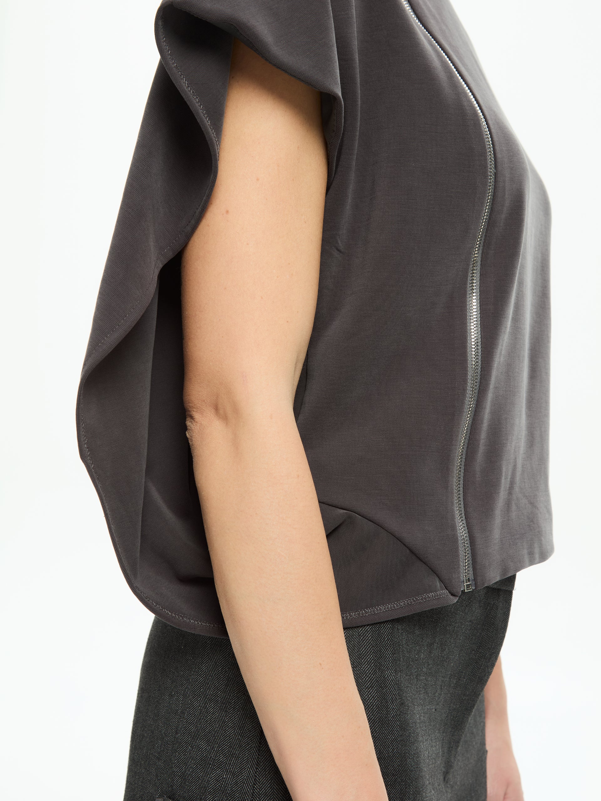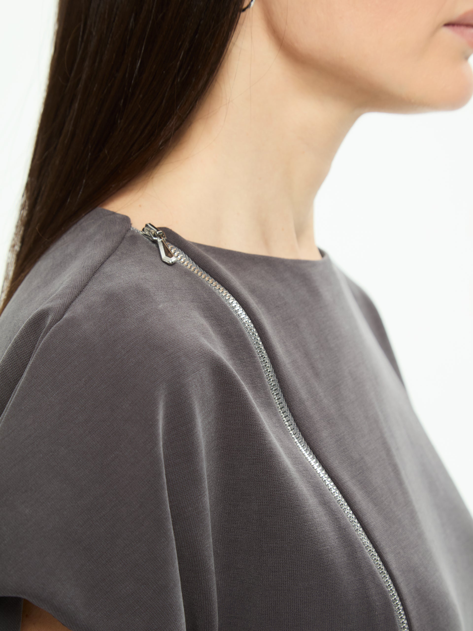 - Dettaglio zip frontale che percorre diagonalmente il capo, elemento distintivo di stile.