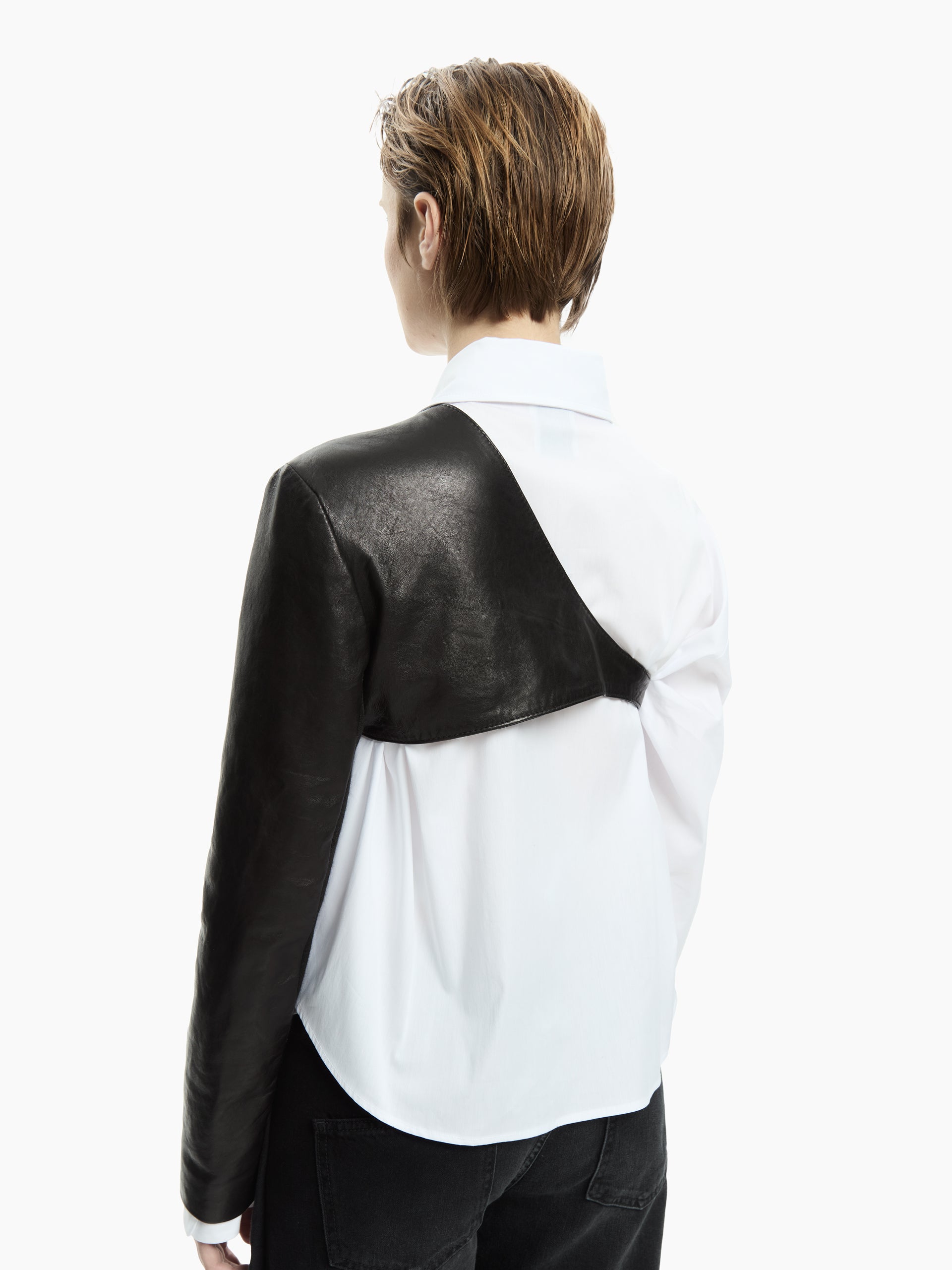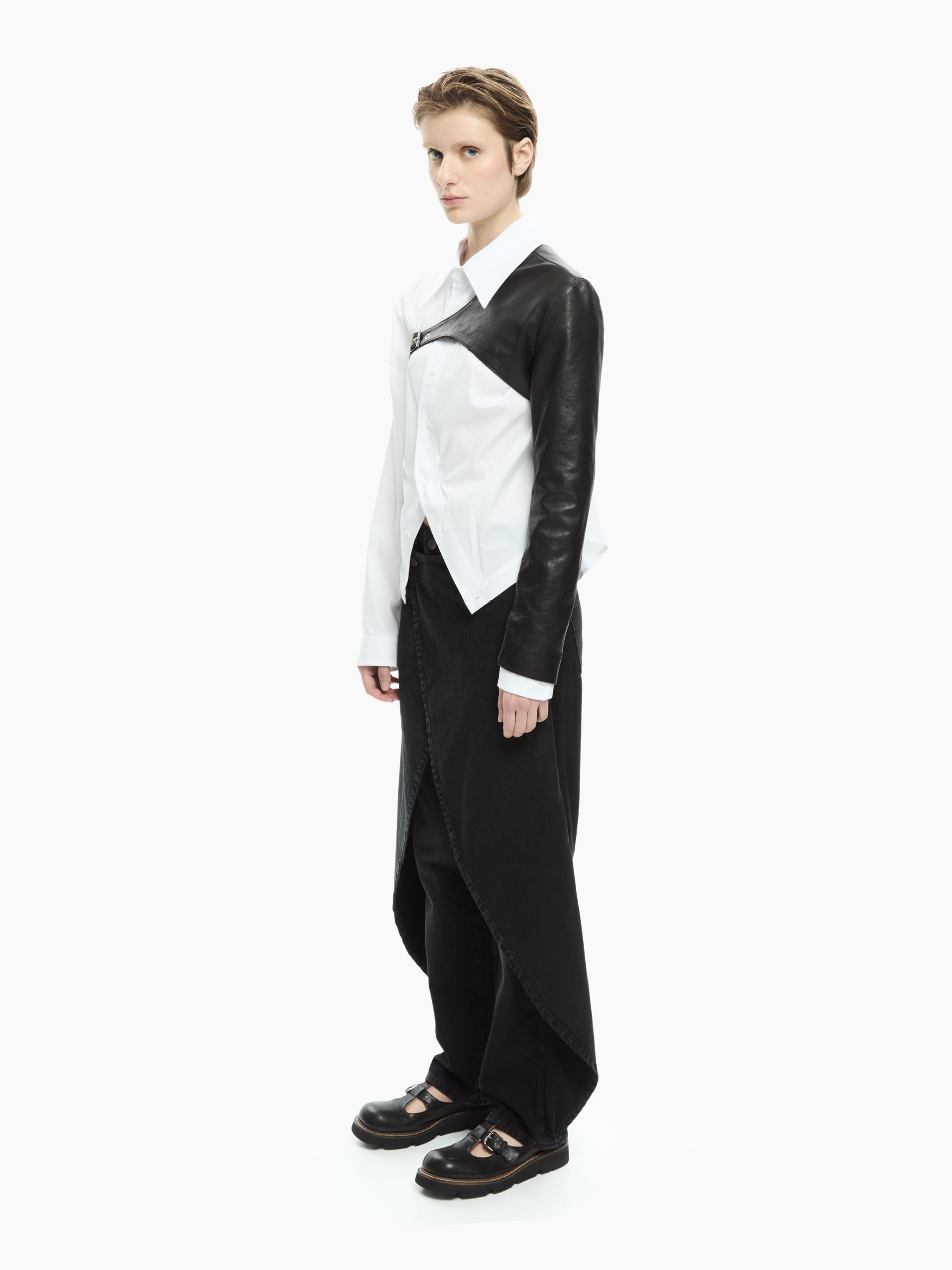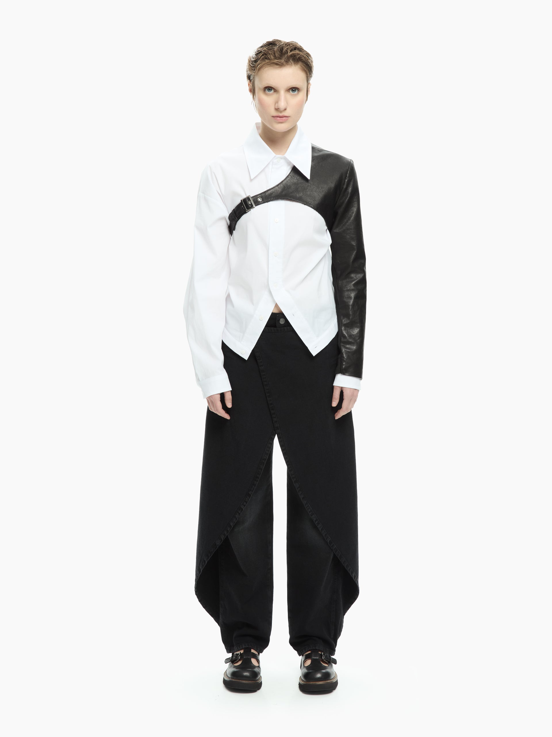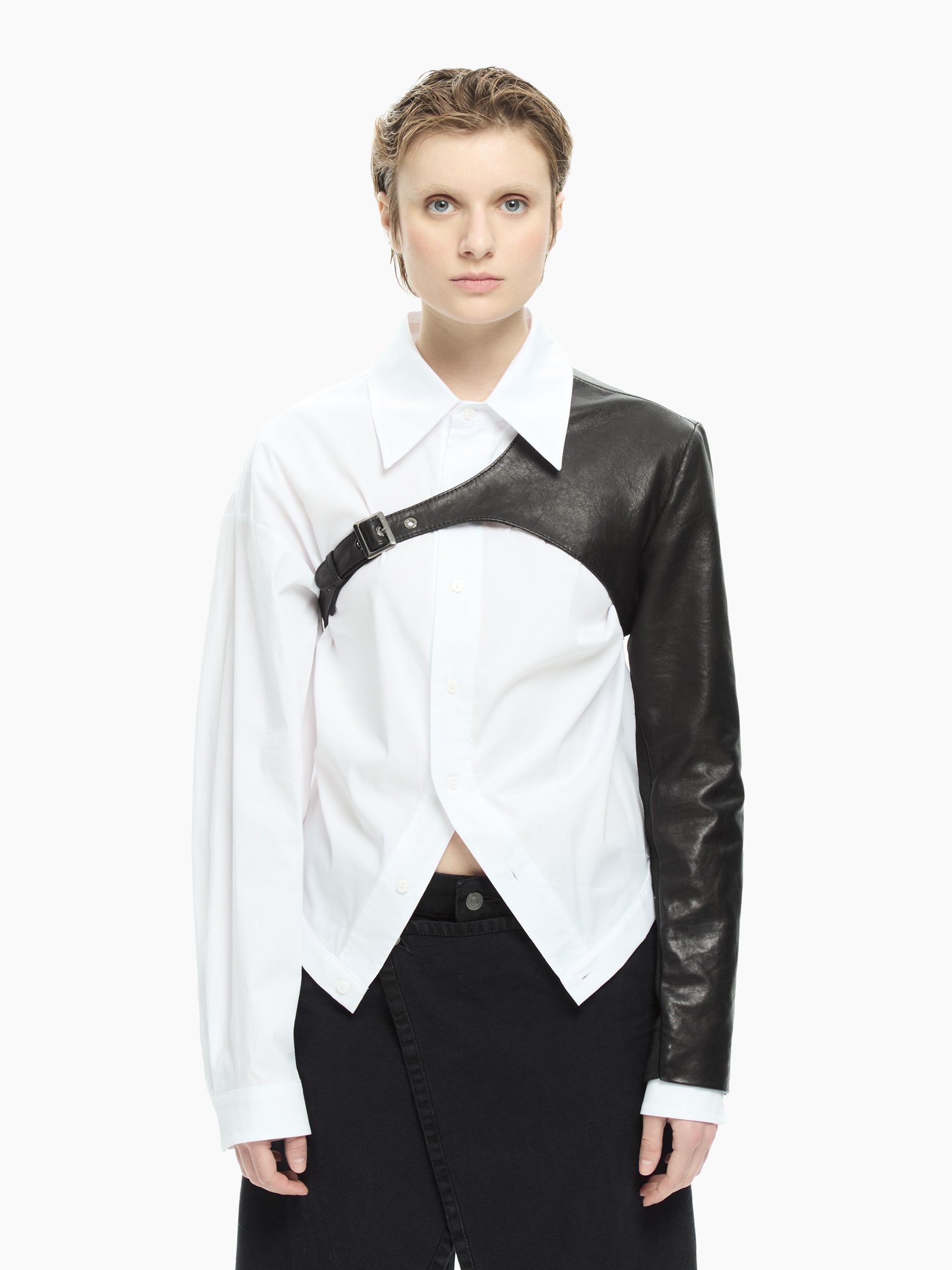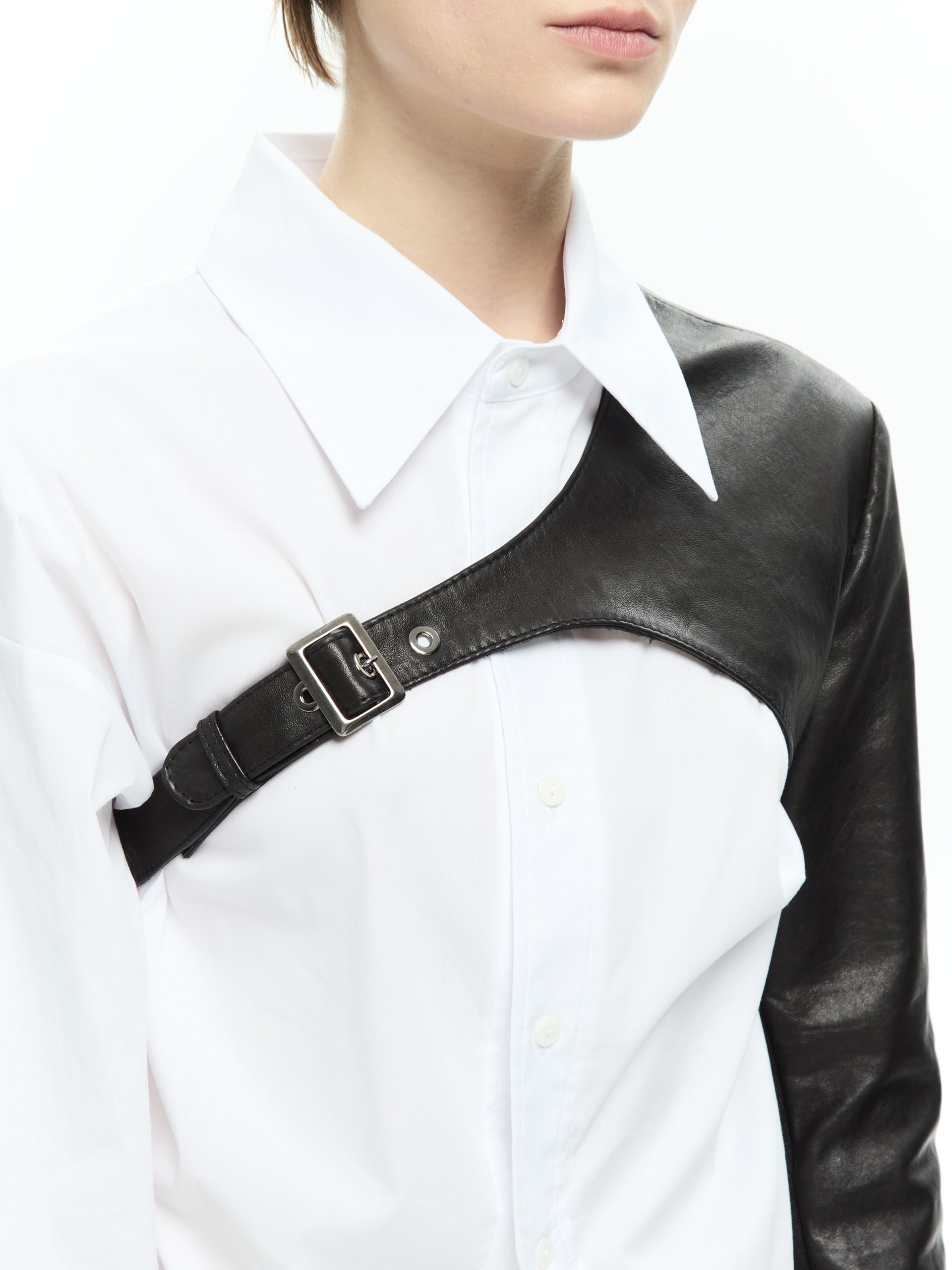 Un accessorio dal carattere deciso che trasforma una camicia classica con un segno grafico contemporaneo. La costruzione asimmetrica avvolge la spalla e attraversa il busto, creando un contrasto materico tra pelle e tessuto.