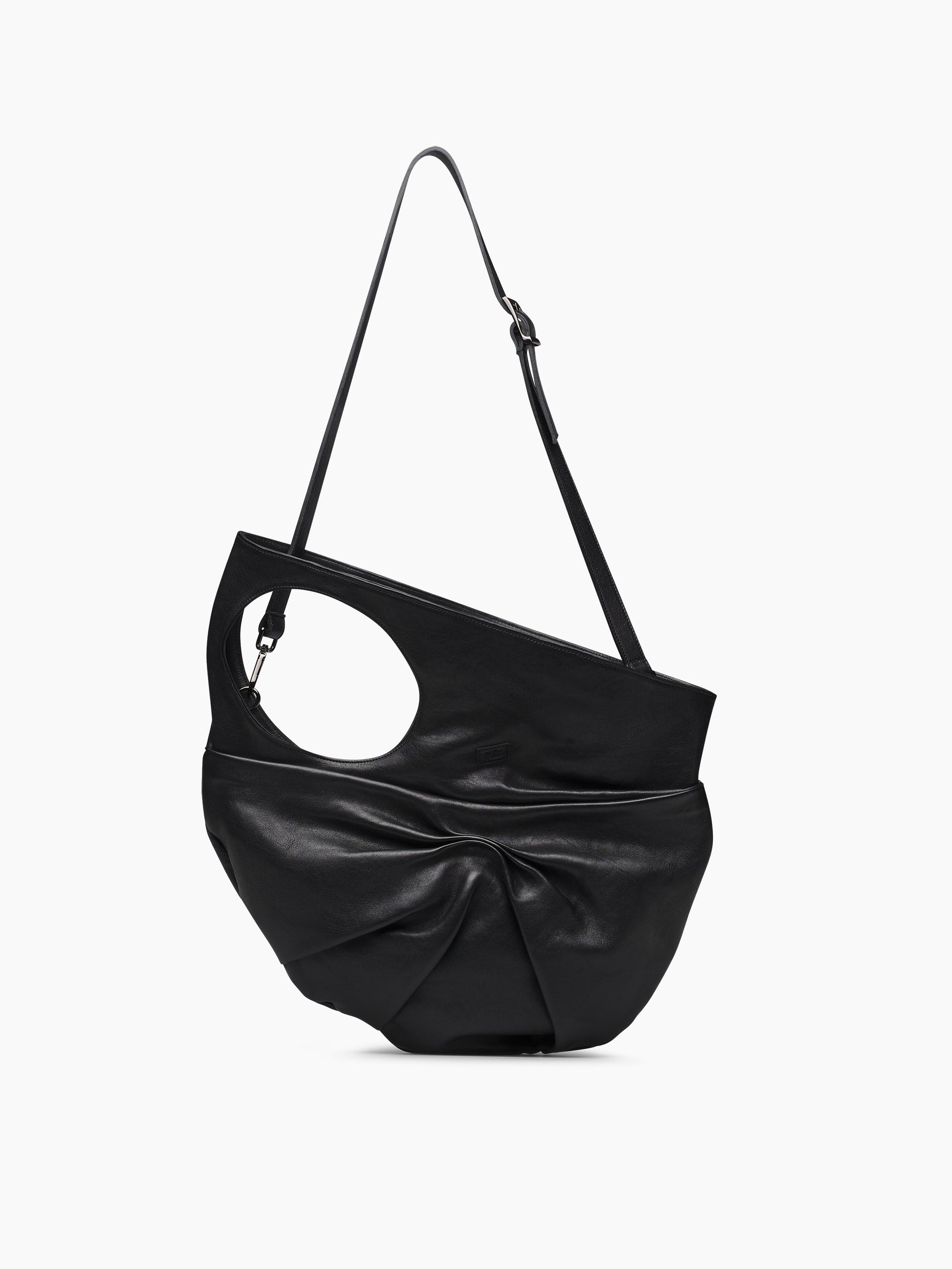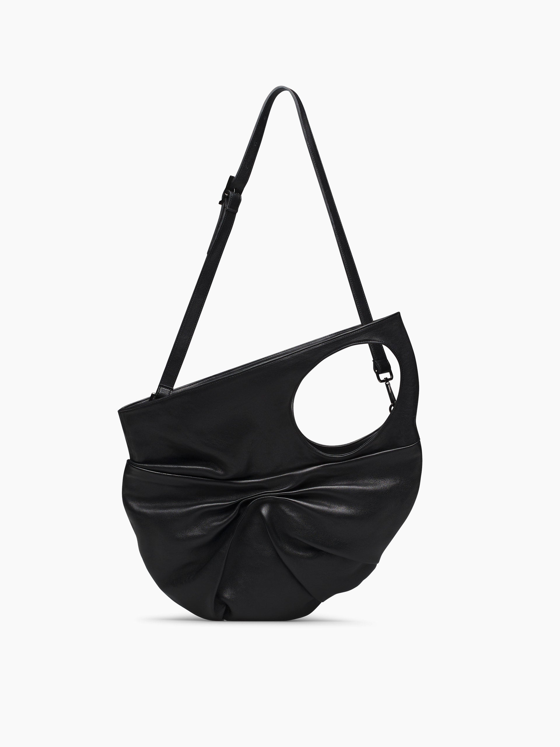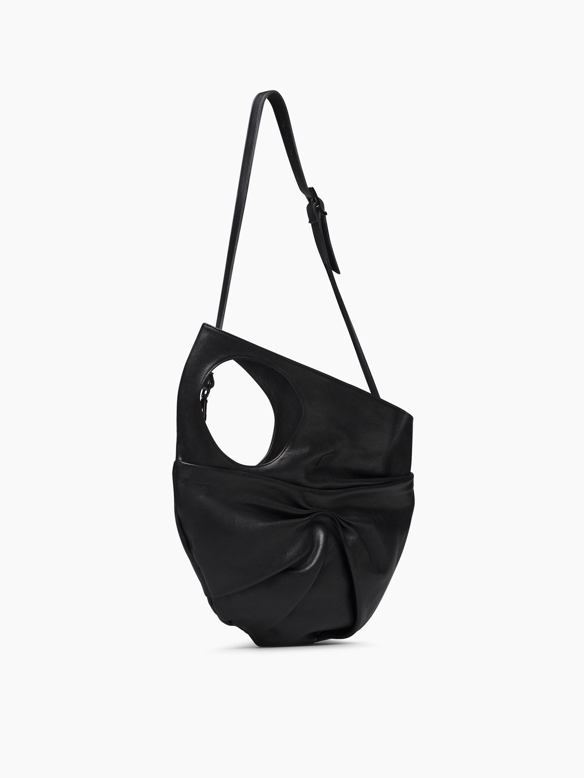 Accessorio dallo stile contemporaneo, questa borsa unisce linee morbide e dettagli ricercati. Il nodo frontale diventa protagonista del design, creando un effetto drappeggiato elegante e moderno. Il dettaglio cut-out laterale aggiunge un elemento distintivo, mentre la tracolla regolabile garantisce versatilità d’uso. L’interno è progettato per offrire spazio e organizzazione, perfetto per l’uso quotidiano.